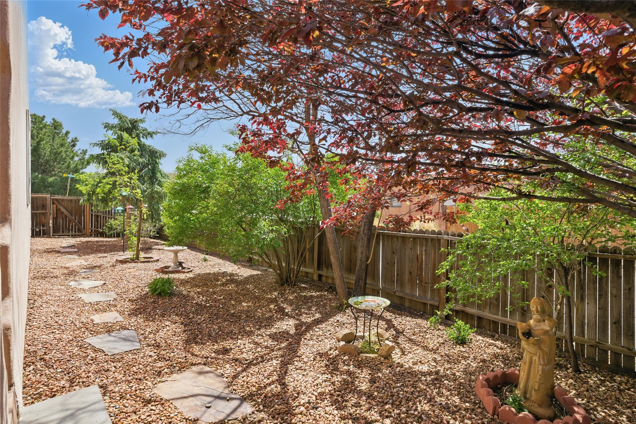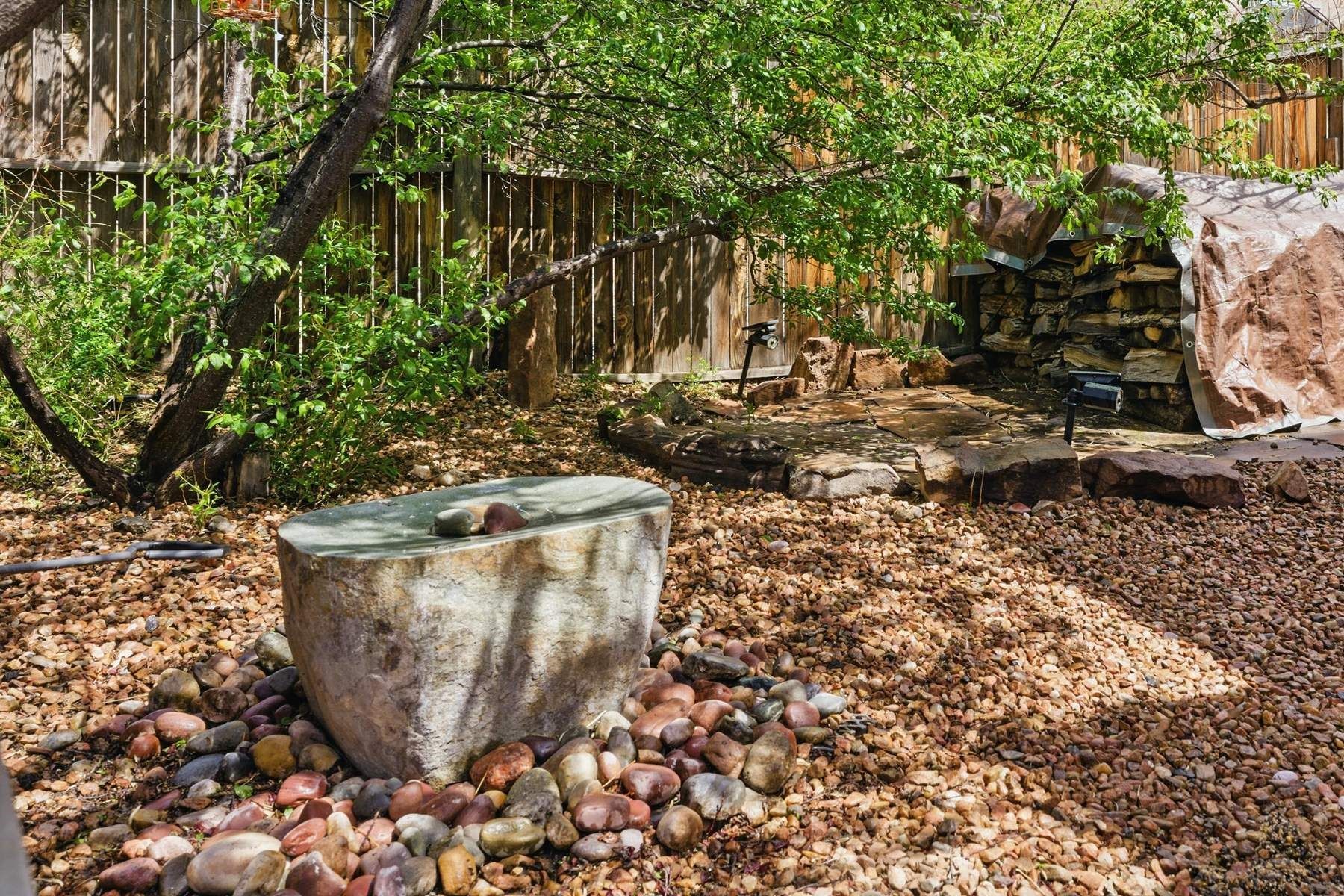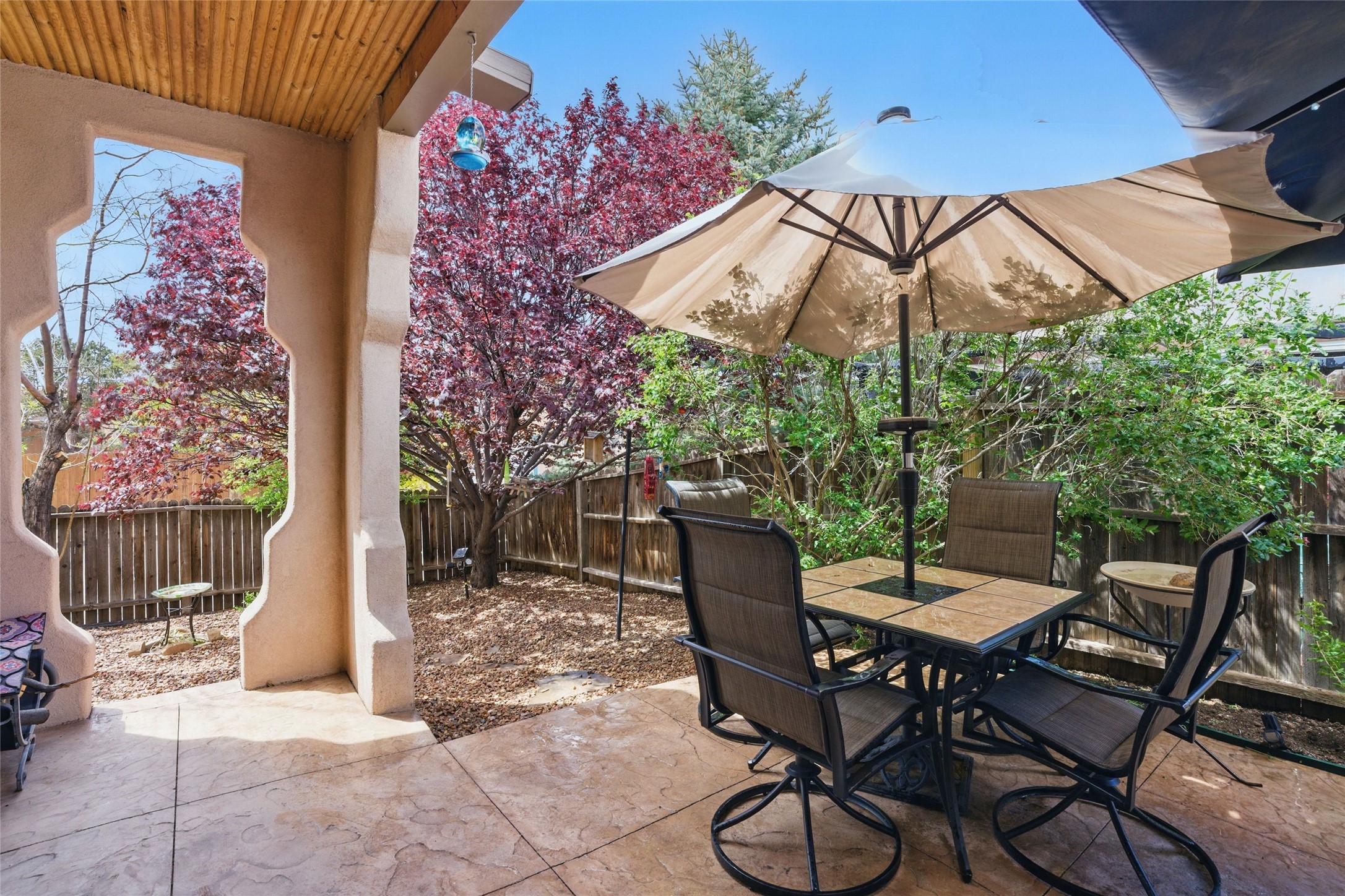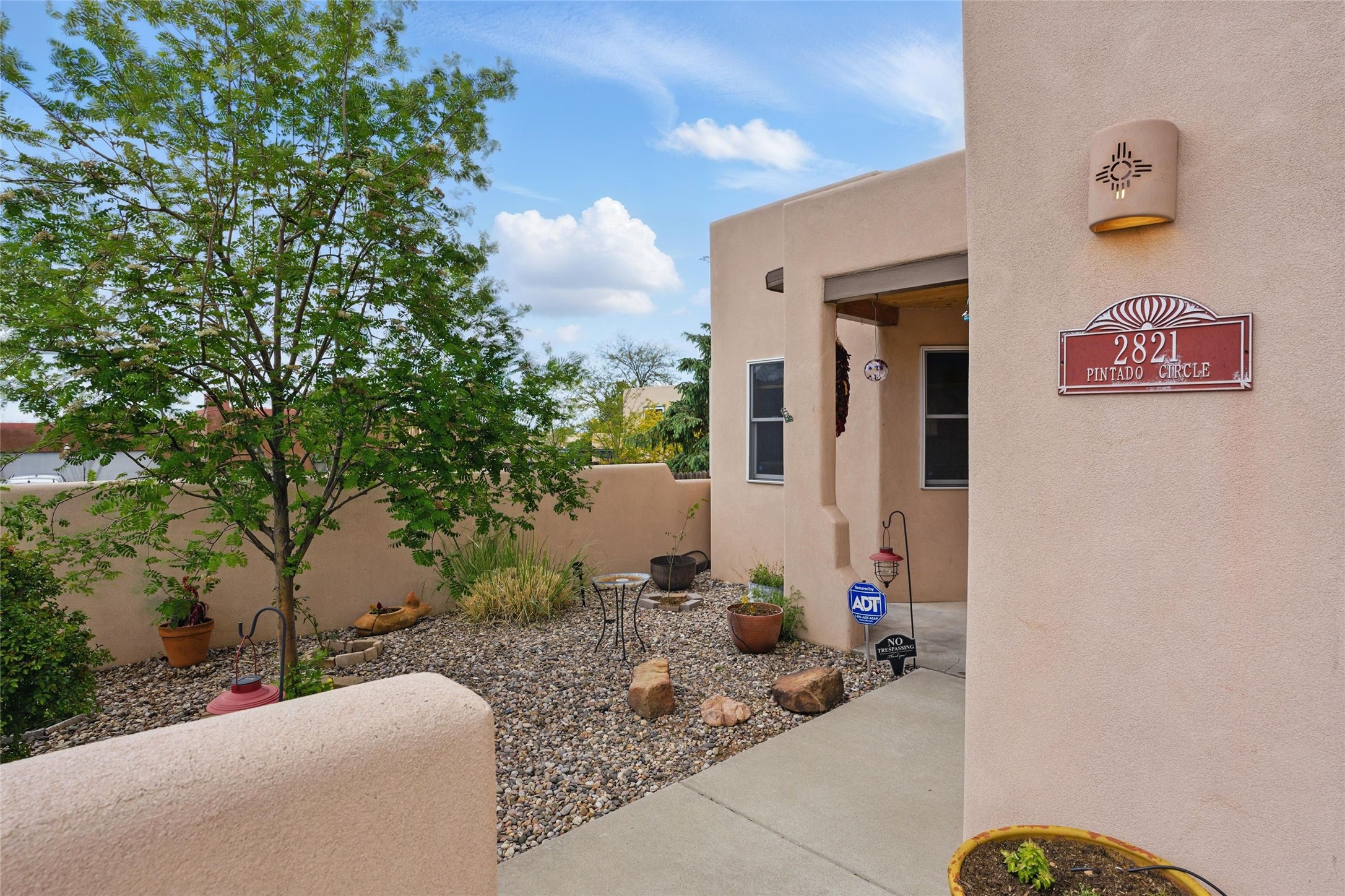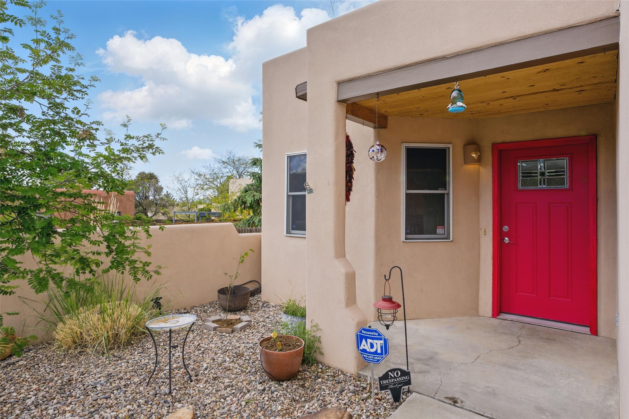 Located in the sought-after Pueblos del Sol community, this light-filled, artfully designed home features high ceilings, radiant heat, granite kitchen countertops, and deep soaking jet tubs in both bathrooms. A vibrant red Art Deco front door welcomes you into a warm, character-rich interior with freshly painted primary spaces and elegant mahogany and tigerwood floors. Set on a corner lot, the home offers a resplendent front courtyard and a backyard oasis reminiscent of a bird sanctuary--lush with mature trees, vibrant blooms, and a low-maintenance drip irrigation system. Enjoy al fresco dining under a cantilever umbrella, stone water fountain, grill with ease, and unwind by the fire pit while watching stunning Santa Fe sunsets. The community features extensive walking trails, a newly constructed playground, and convenient access to shopping, dining, and healthcare. This private retreat perfectly blends comfort, charm, and natural beauty. Foliage includes: cardinal red mountain ash, fruiting currant and gooseberry bushes, cherry and purple plums, Rowan, blue spruce, Austrian pine, flowering desert willow, Morning Cloud chitalpa, Scotch broom, Russian sage, and roses. Seize this rare opportunity to create your best enchanted life in your own Santa Fe sanctuary.