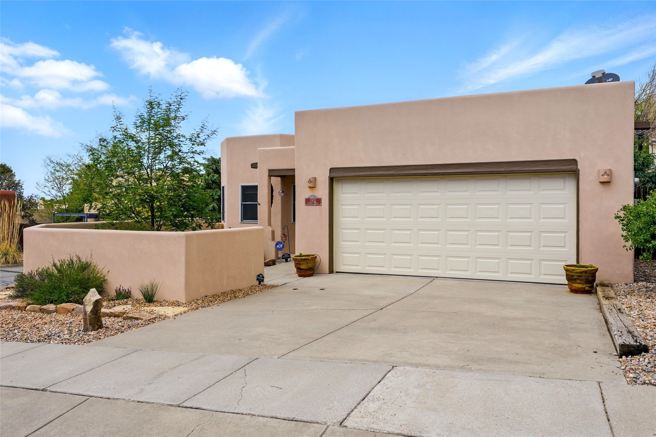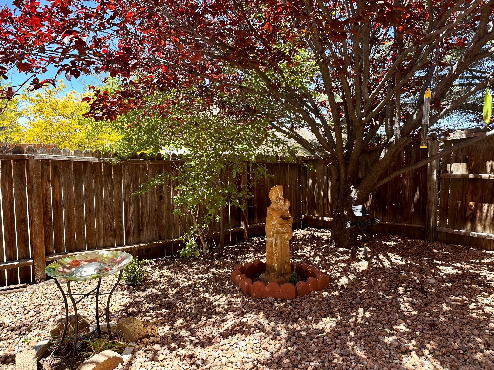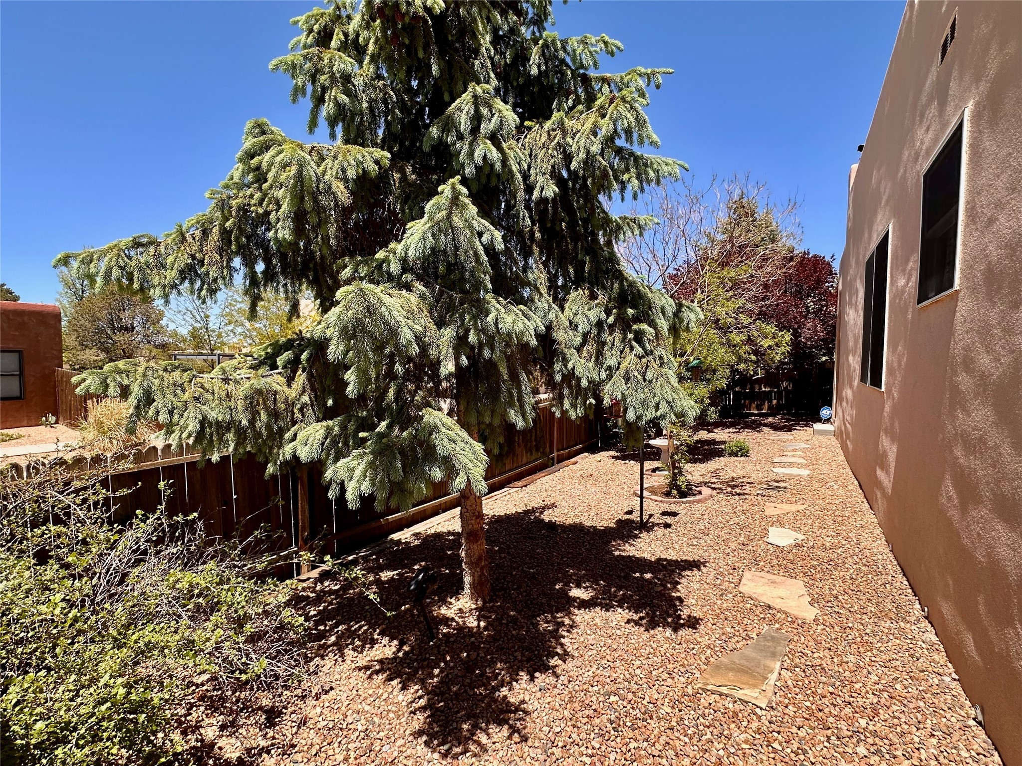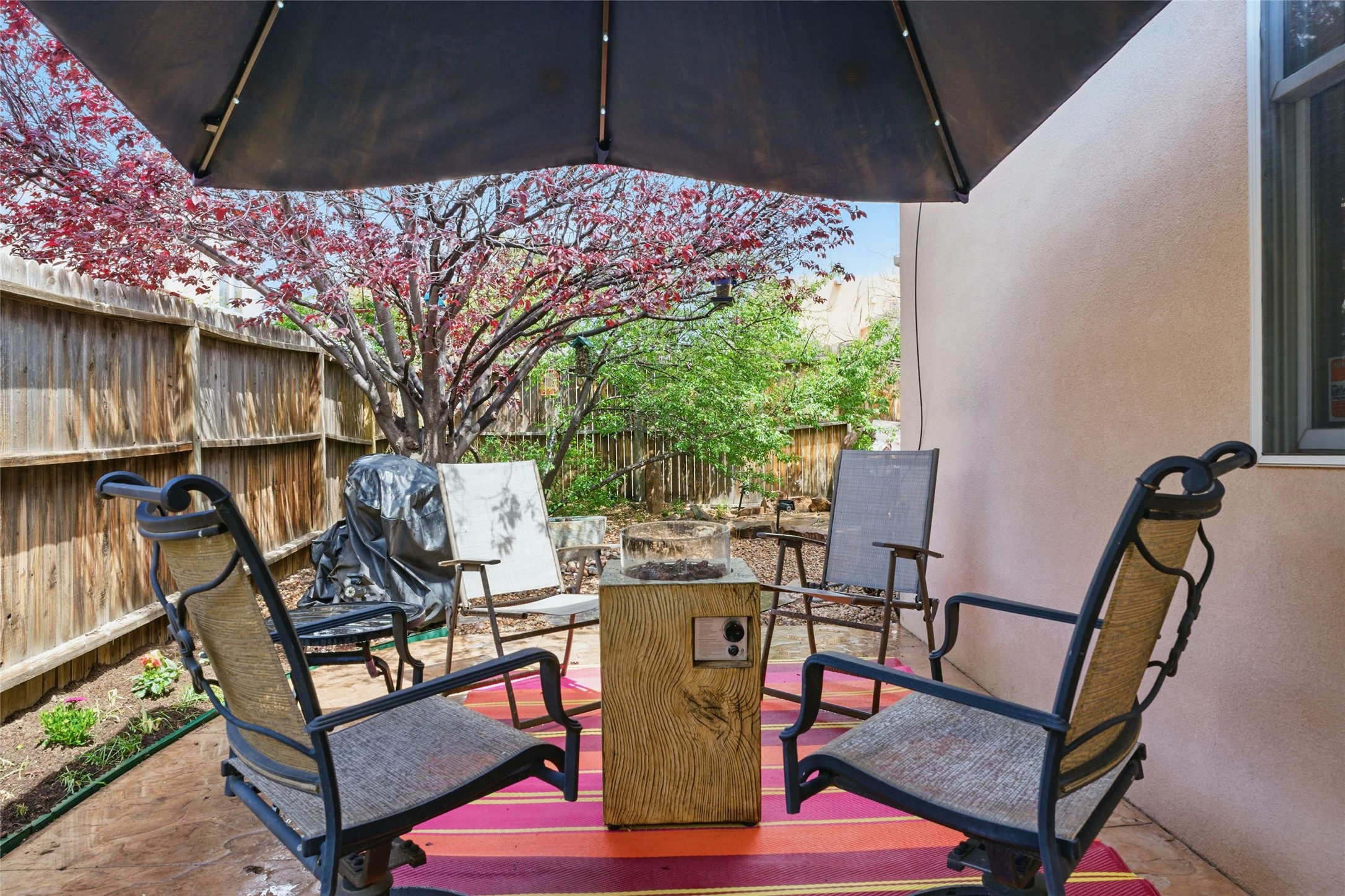 Located in the sought-after Pueblos del Sol community, this light-filled, artfully designed home features high ceilings, radiant heat, granite kitchen countertops, and deep soaking jet tubs in both bathrooms. A vibrant red Art Deco front door welcomes you into a warm, character-rich interior with freshly painted primary spaces and elegant mahogany and tigerwood floors. Set on a corner lot, the home offers a resplendent front courtyard and a backyard oasis reminiscent of a bird sanctuary--lush with mature trees, vibrant blooms, and a low-maintenance drip irrigation system. Enjoy al fresco dining under a cantilever umbrella, stone water fountain, grill with ease, and unwind by the fire pit while watching stunning Santa Fe sunsets. The community features extensive walking trails, a newly constructed playground, and convenient access to shopping, dining, and healthcare. This private retreat perfectly blends comfort, charm, and natural beauty. Foliage includes: cardinal red mountain ash, fruiting currant and gooseberry bushes, cherry and purple plums, Rowan, blue spruce, Austrian pine, flowering desert willow, Morning Cloud chitalpa, Scotch broom, Russian sage, and roses. Seize this rare opportunity to create your best enchanted life in your own Santa Fe sanctuary.