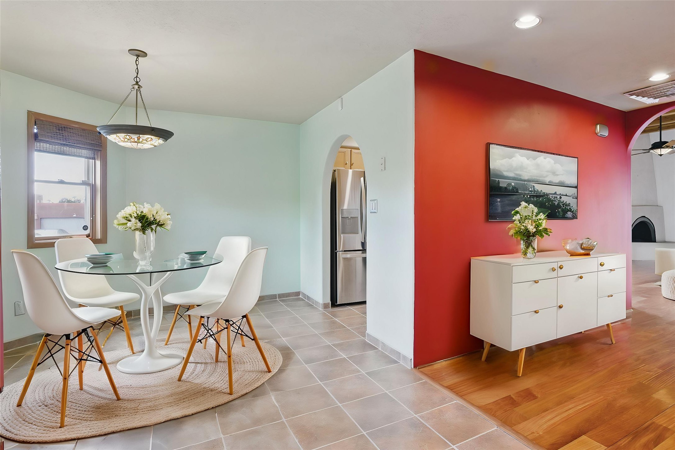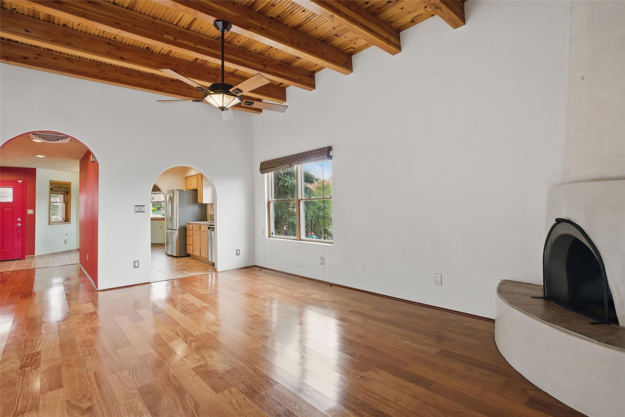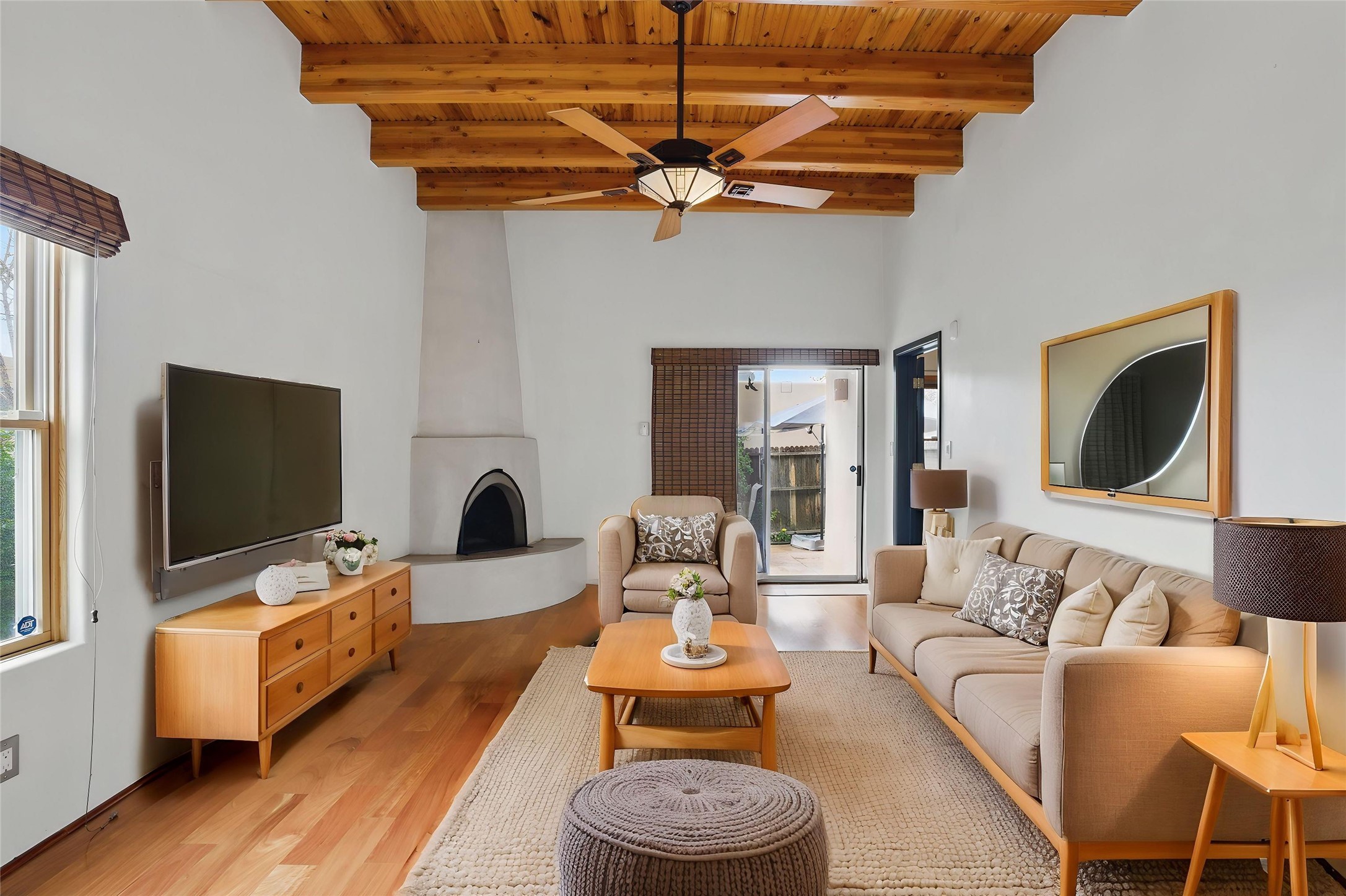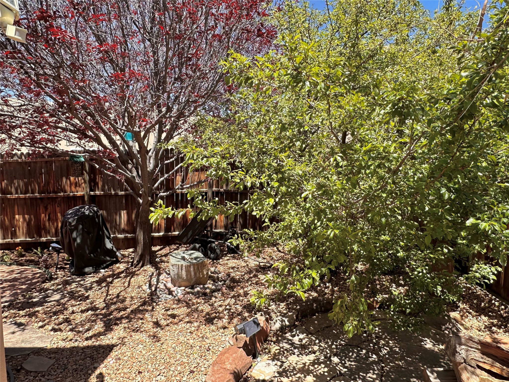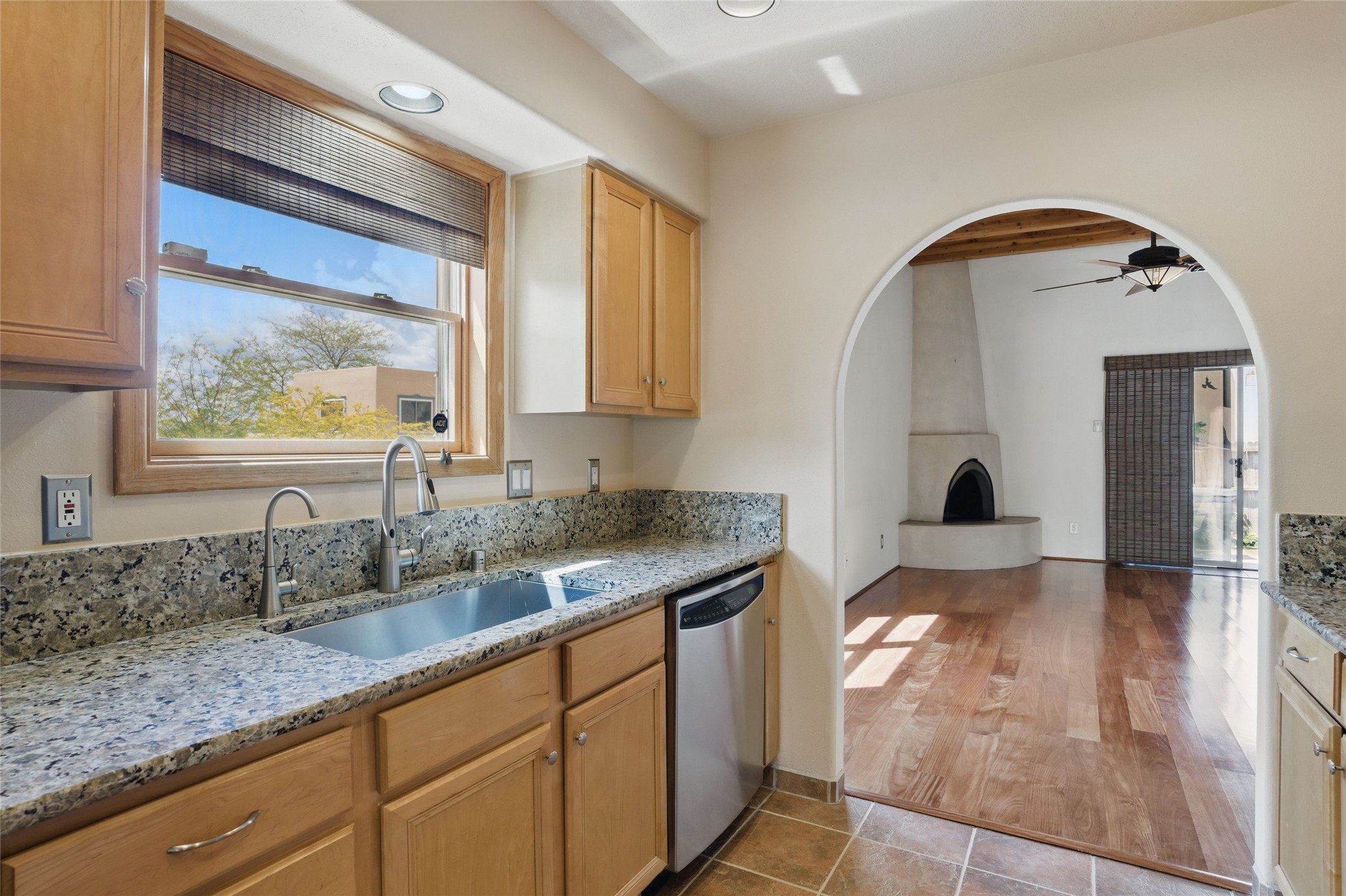 Located in the sought-after Pueblos del Sol community, this light-filled, artfully designed home features high ceilings, radiant heat, granite kitchen countertops, and deep soaking jet tubs in both bathrooms. A vibrant red Art Deco front door welcomes you into a warm, character-rich interior with freshly painted primary spaces and elegant mahogany and tigerwood floors. Set on a corner lot, the home offers a resplendent front courtyard and a backyard oasis reminiscent of a bird sanctuary--lush with mature trees, vibrant blooms, and a low-maintenance drip irrigation system. Enjoy al fresco dining under a cantilever umbrella, stone water fountain, grill with ease, and unwind by the fire pit while watching stunning Santa Fe sunsets. The community features extensive walking trails, a newly constructed playground, and convenient access to shopping, dining, and healthcare. This private retreat perfectly blends comfort, charm, and natural beauty. Foliage includes: cardinal red mountain ash, fruiting currant and gooseberry bushes, cherry and purple plums, Rowan, blue spruce, Austrian pine, flowering desert willow, Morning Cloud chitalpa, Scotch broom, Russian sage, and roses. Seize this rare opportunity to create your best enchanted life in your own Santa Fe sanctuary.