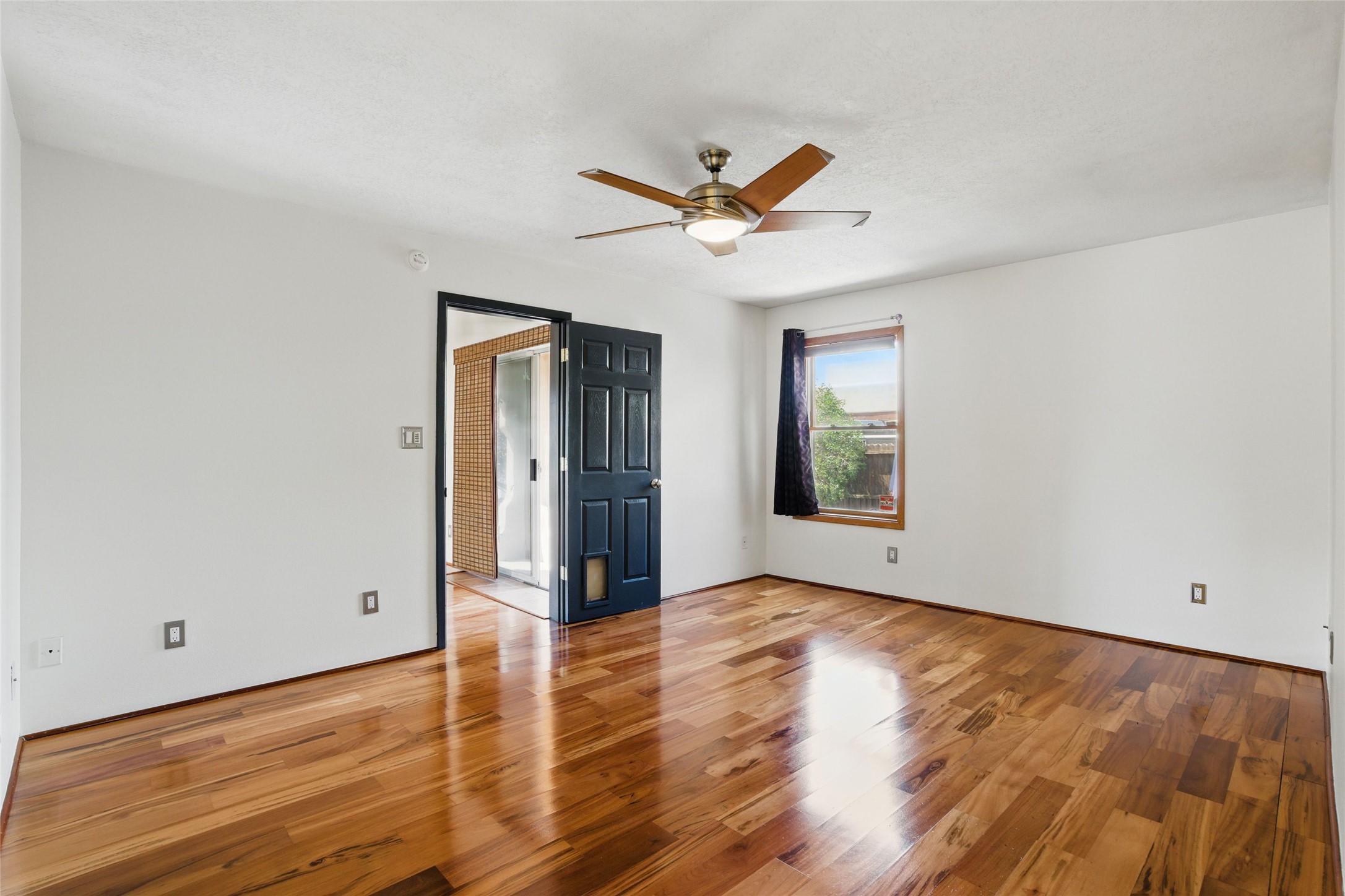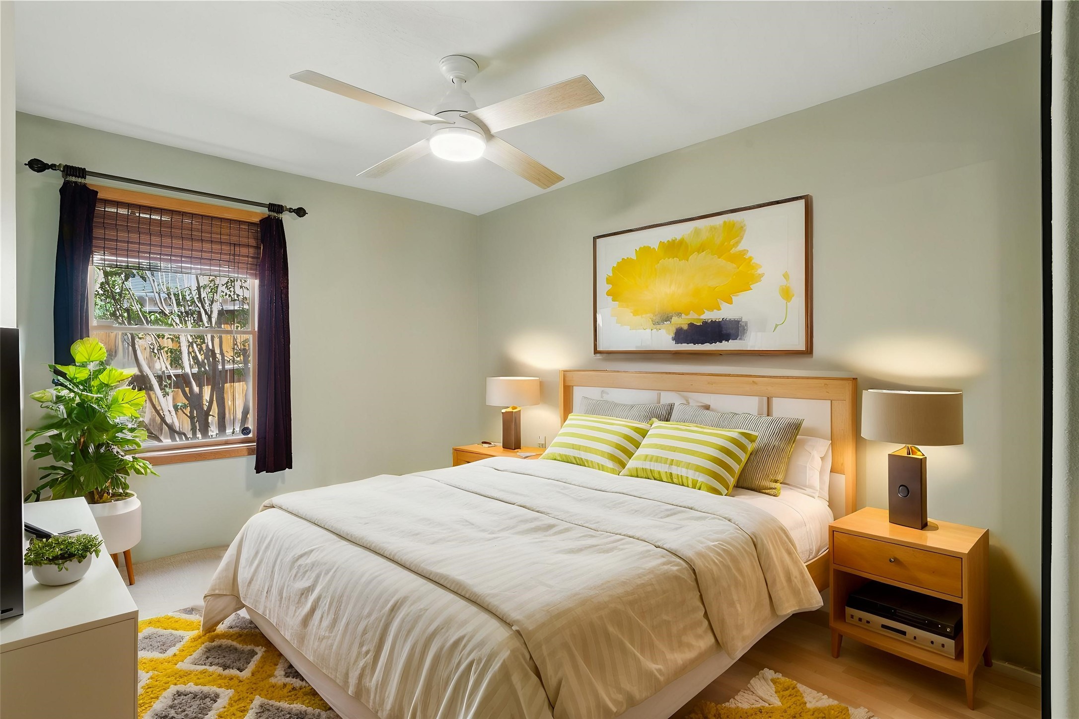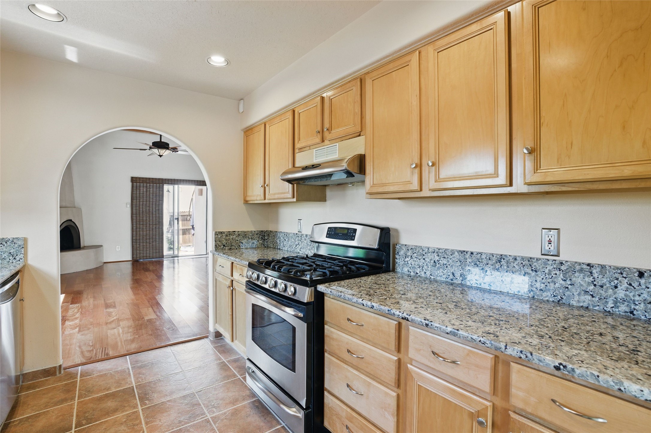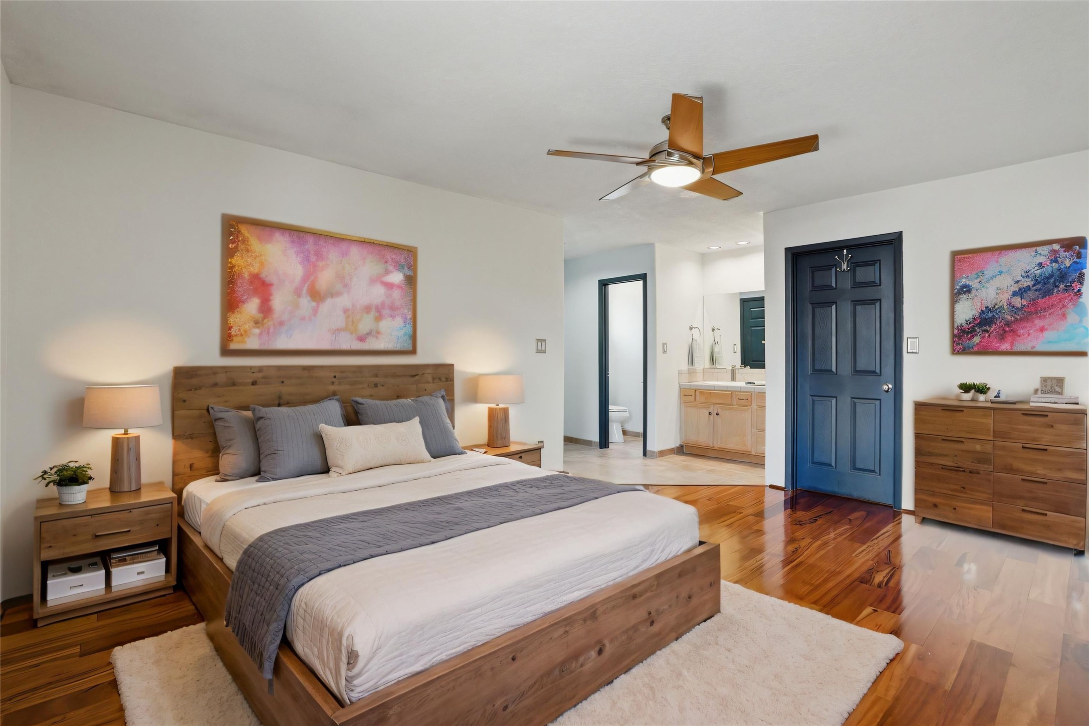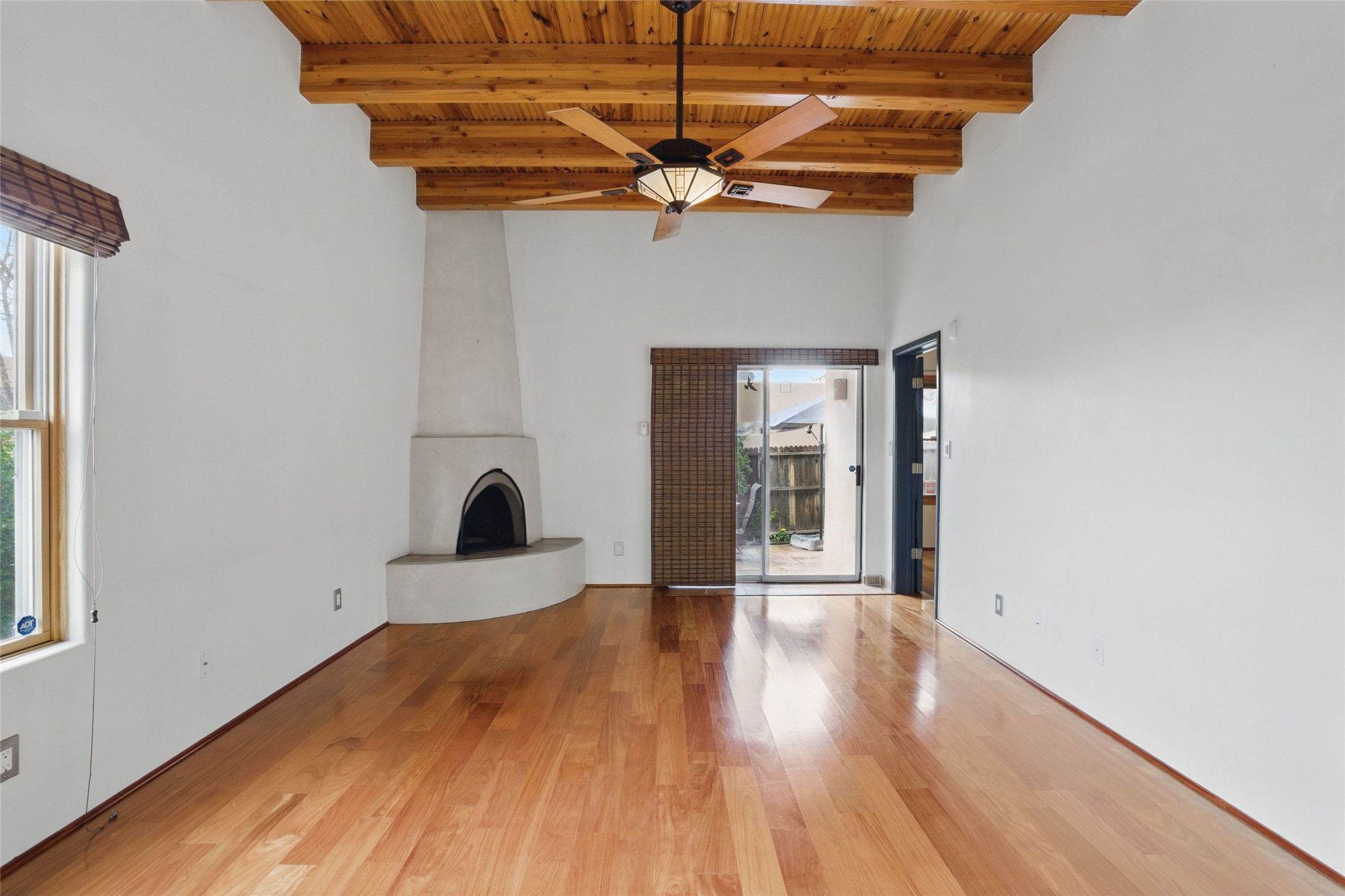 Located in the sought-after Pueblos del Sol community, this light-filled, artfully designed home features high ceilings, radiant heat, granite kitchen countertops, and deep soaking jet tubs in both bathrooms. A vibrant red Art Deco front door welcomes you into a warm, character-rich interior with freshly painted primary spaces and elegant mahogany and tigerwood floors. Set on a corner lot, the home offers a resplendent front courtyard and a backyard oasis reminiscent of a bird sanctuary--lush with mature trees, vibrant blooms, and a low-maintenance drip irrigation system. Enjoy al fresco dining under a cantilever umbrella, stone water fountain, grill with ease, and unwind by the fire pit while watching stunning Santa Fe sunsets. The community features extensive walking trails, a newly constructed playground, and convenient access to shopping, dining, and healthcare. This private retreat perfectly blends comfort, charm, and natural beauty. Foliage includes: cardinal red mountain ash, fruiting currant and gooseberry bushes, cherry and purple plums, Rowan, blue spruce, Austrian pine, flowering desert willow, Morning Cloud chitalpa, Scotch broom, Russian sage, and roses. Seize this rare opportunity to create your best enchanted life in your own Santa Fe sanctuary.