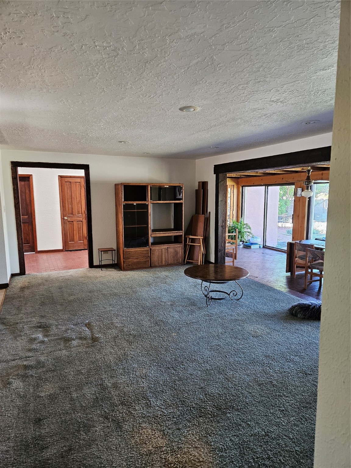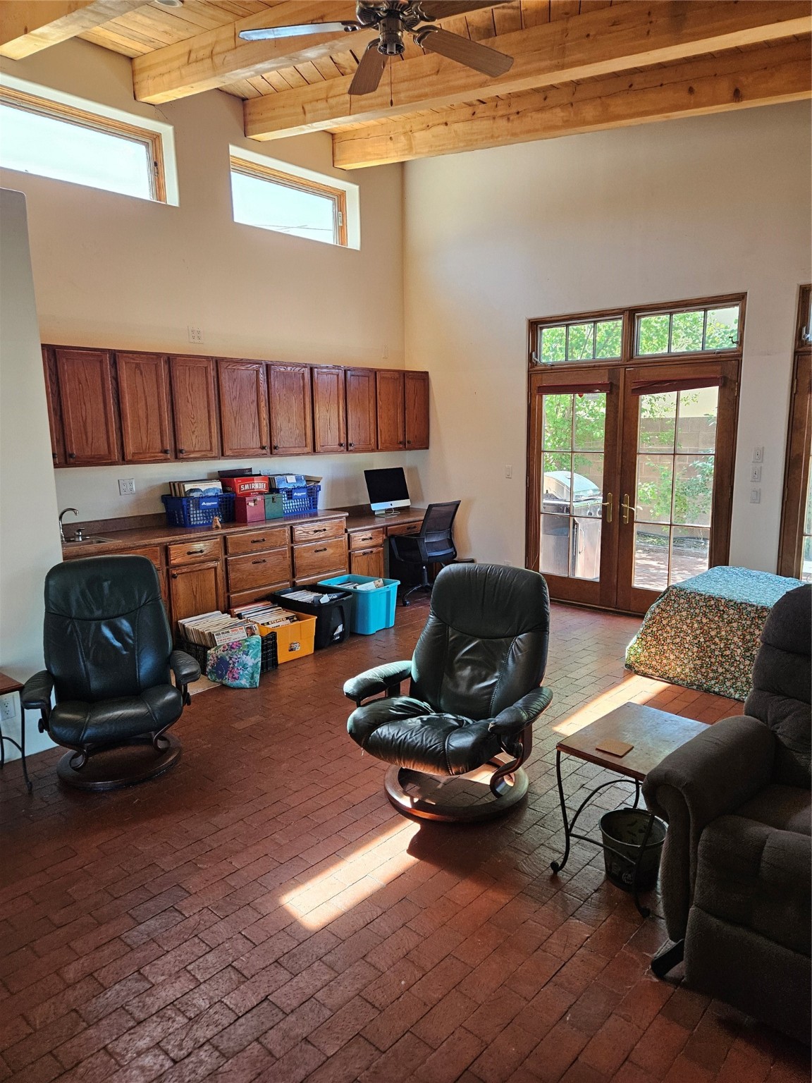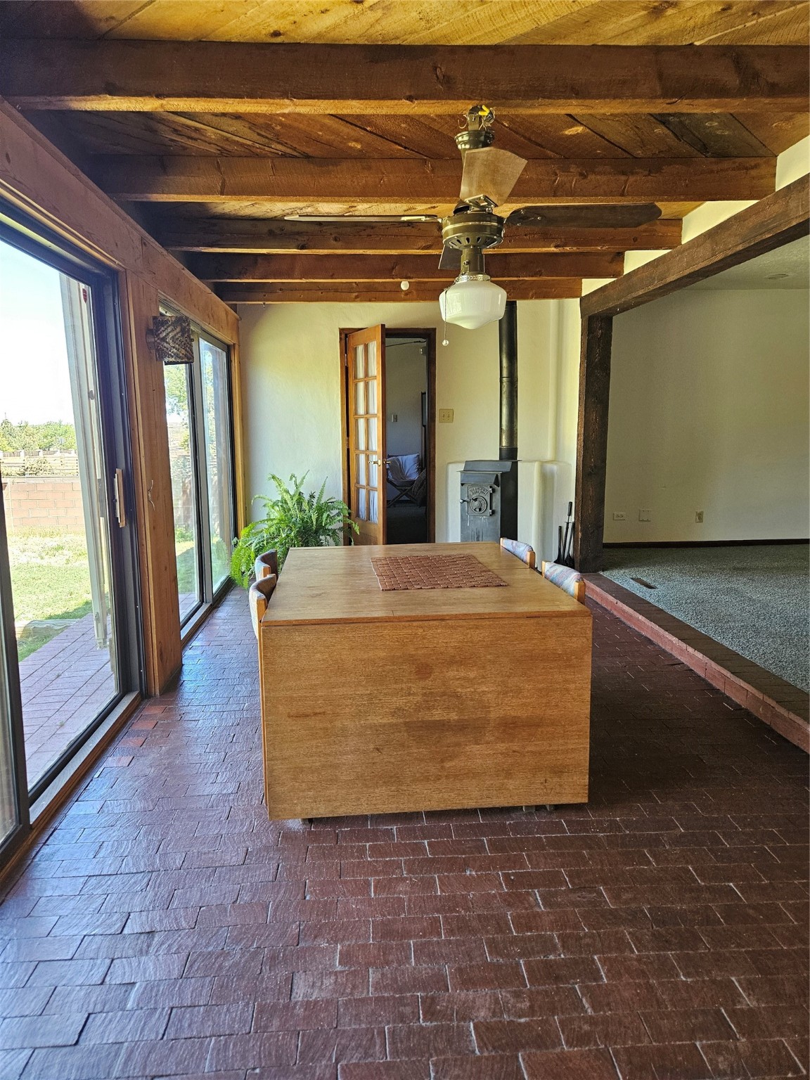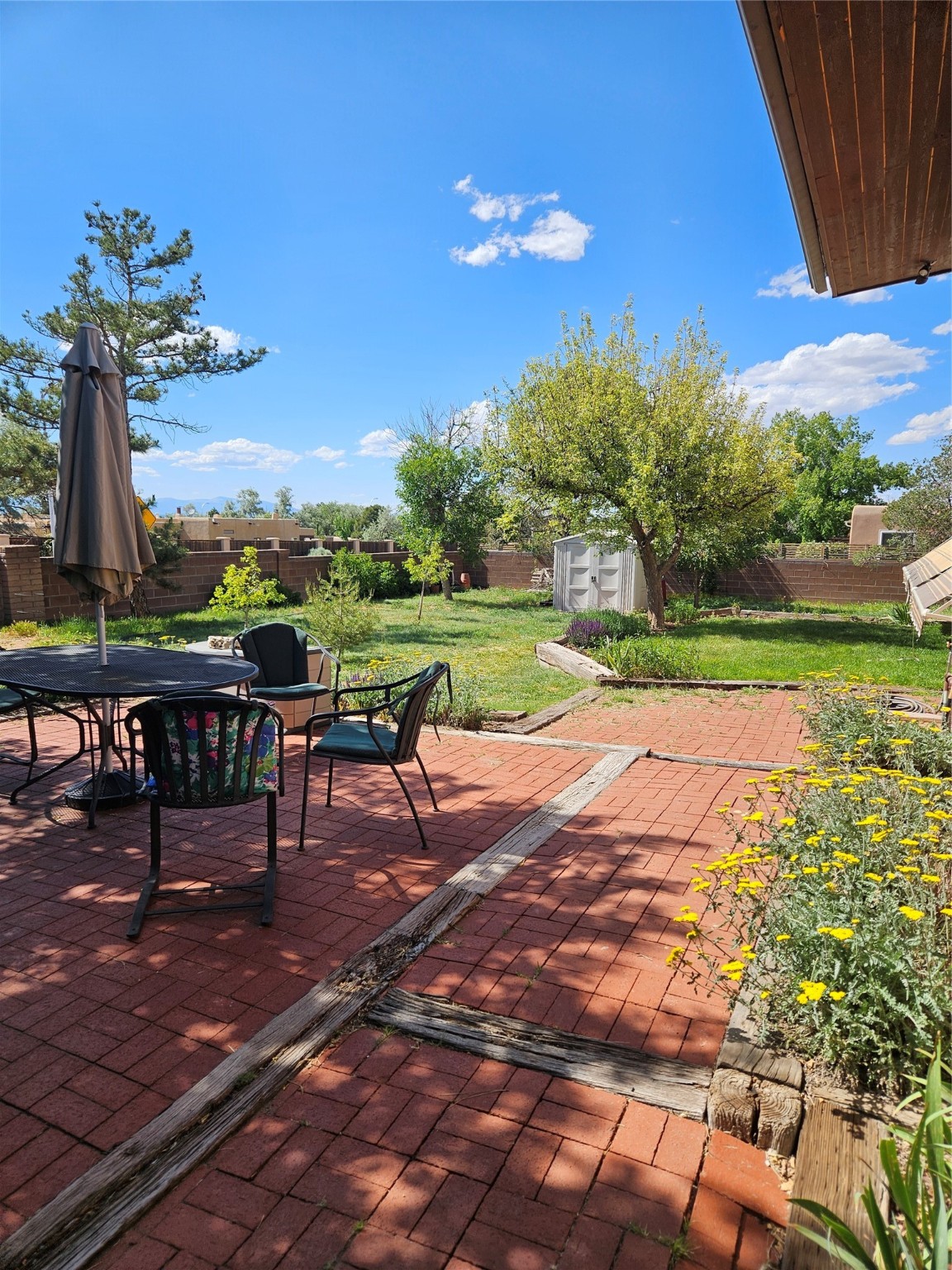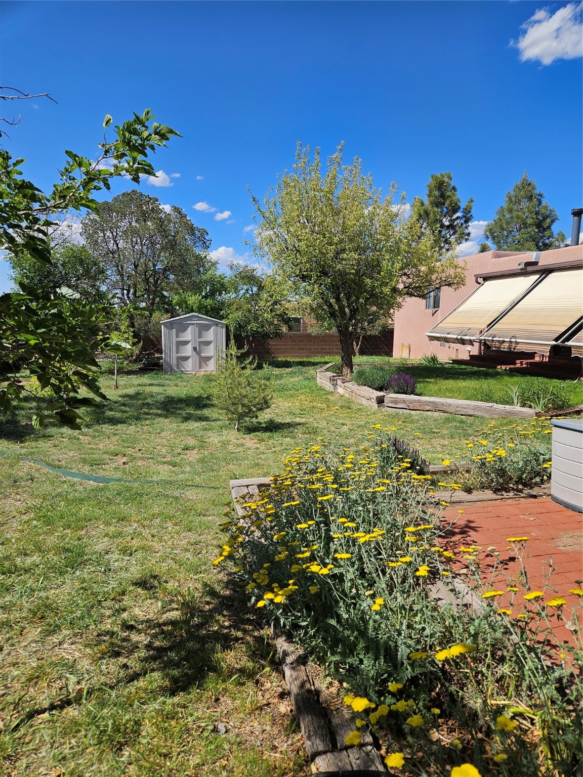 Calling All Investors! Great Location with a great price! Located in Via Caballero on a large, walled lot. Walk through the front door into a great entryway with a tall vigas ceiling, which is great for displaying artwork. This versatile single-level home features 3 bedrooms/2 1/2 baths, a living room, a den/studio/office with a tall beamed ceiling, lots of cabinets and storage with an exterior entrance, a dining room with a wood stove, and a bright eat-in kitchen. The main house has a flat roof over the main house, and a metal pitch roof on the mother-in-law quarters. Additionally, a laundry room with a new washer. The 2-car garage offers direct entry to the large entryway. Solar Panels (leased) keep the electric bill reasonable. Mature trees and a metal shed are a bonus! Enjoy the 2 apricot and 1 apple tree on .287 acres!