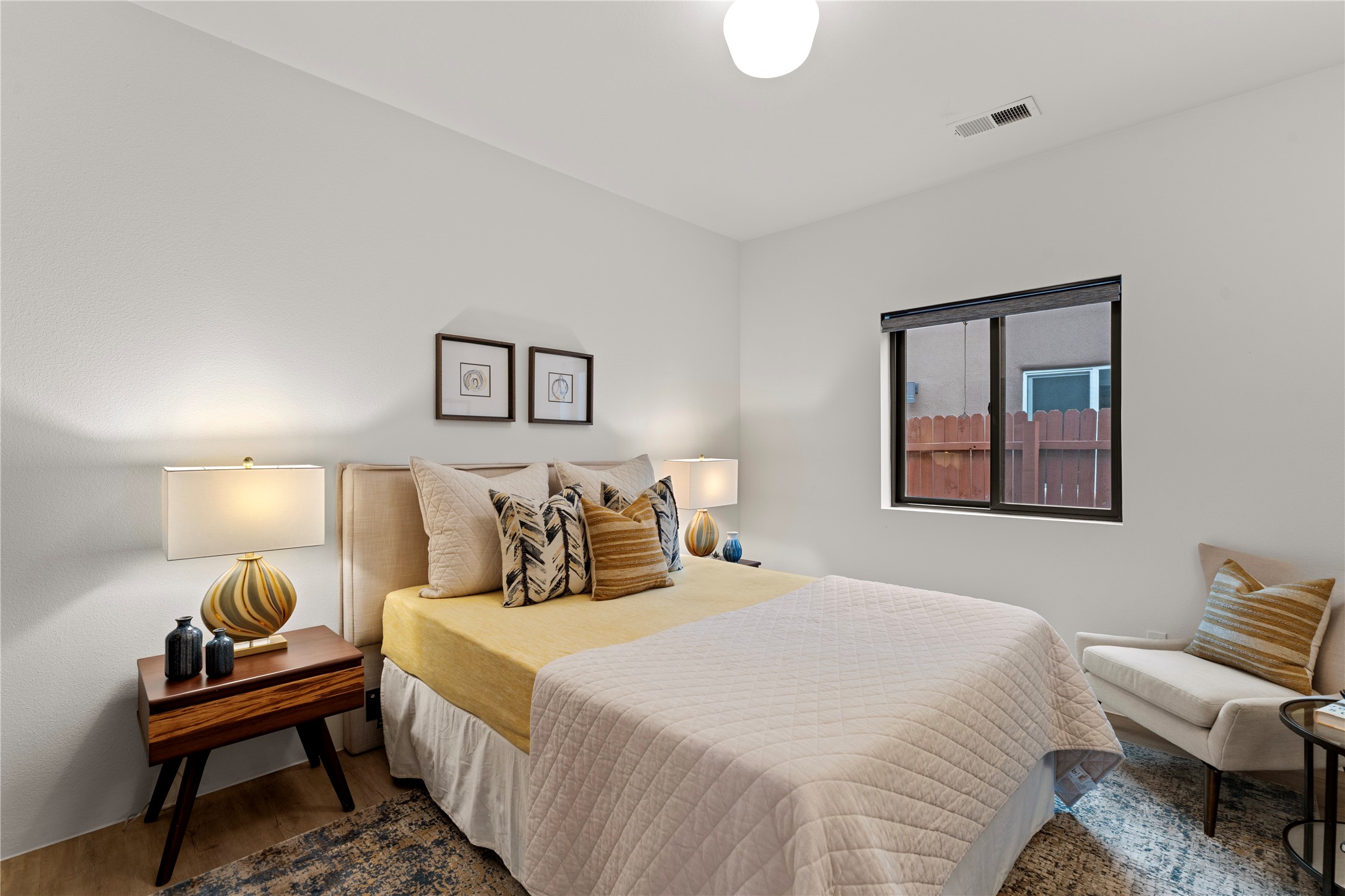 This beautifully crafted single family one story home, built by renowned Master Builder Arch Sproul, combines modern comfort with exceptional energy efficiency. Located in a quiet all custom-built subdivision in central Santa Fe, this home features super-insulated walls and ceilings, on-demand hot water, ultra efficient HVAC systems, skylights, and energy star appliances, making it ideal for sustainable living. With three well-separated bedrooms and two full bathrooms, the layout provides a perfect balance of privacy and functionality. The spacious living room with soaring ceilings, mountain views, and a cozy gas fireplace flows seamlessly to the covered patio and fenced backyard. The custom-designed kitchen boasts solid-surface countertops, custom cabinetry, luxury plank vinyl flooring, designer lighting, and stylish plumbing fixtures. Situated at the end of a peaceful tree-lined street with ample parking, it is a short walk from this home to local shops, schools, and the Genoveva Chavez sport facility. Offering price is lower than the sold price of 2023! This is the deal you won't want to miss! As a perk, it is currently covered with a Home Owners Warranty!