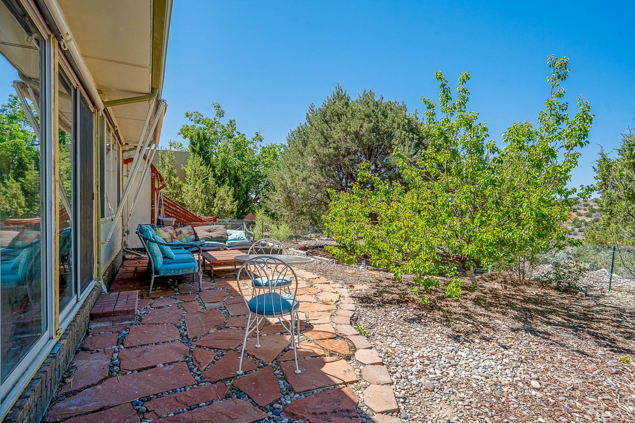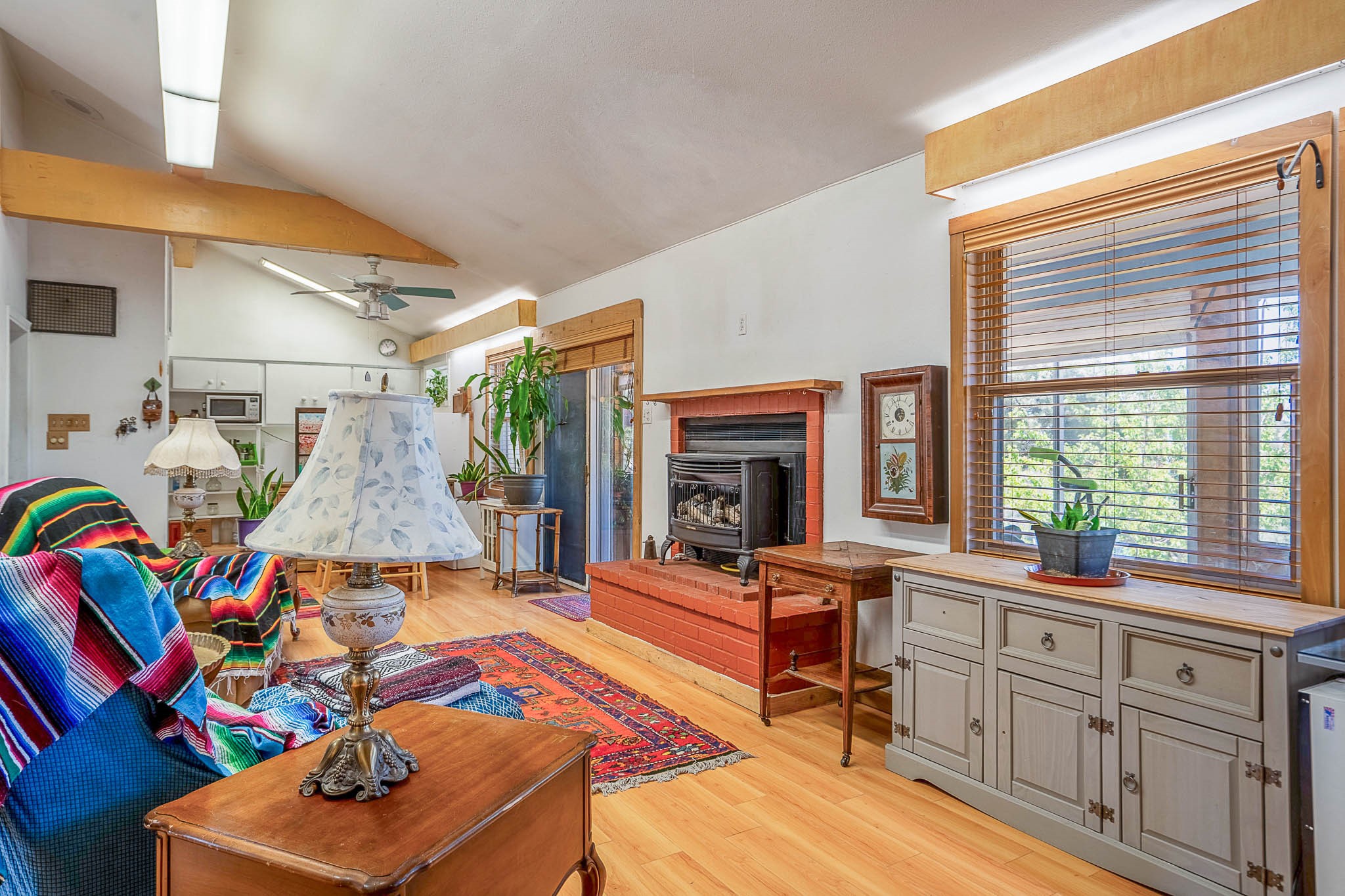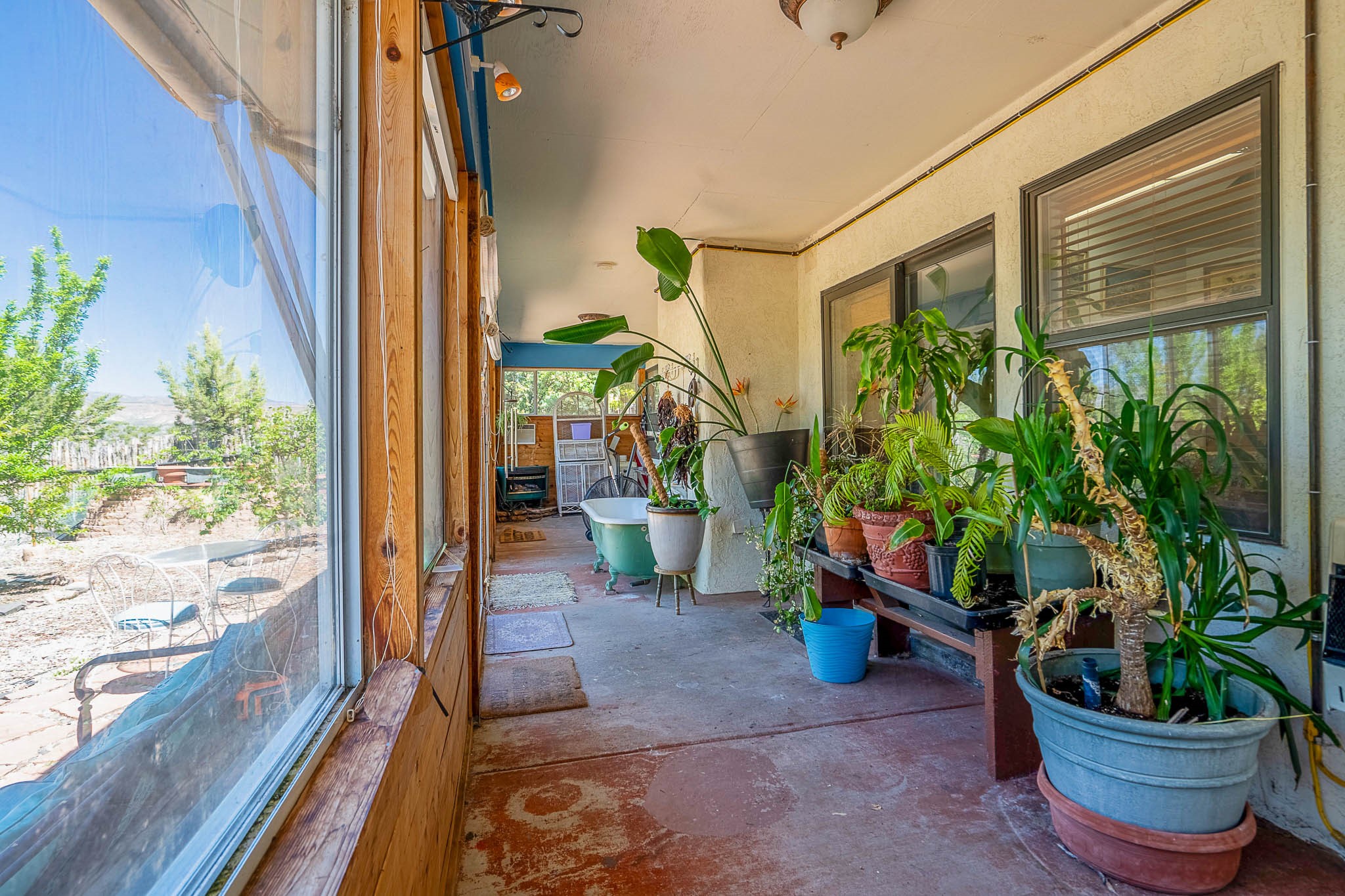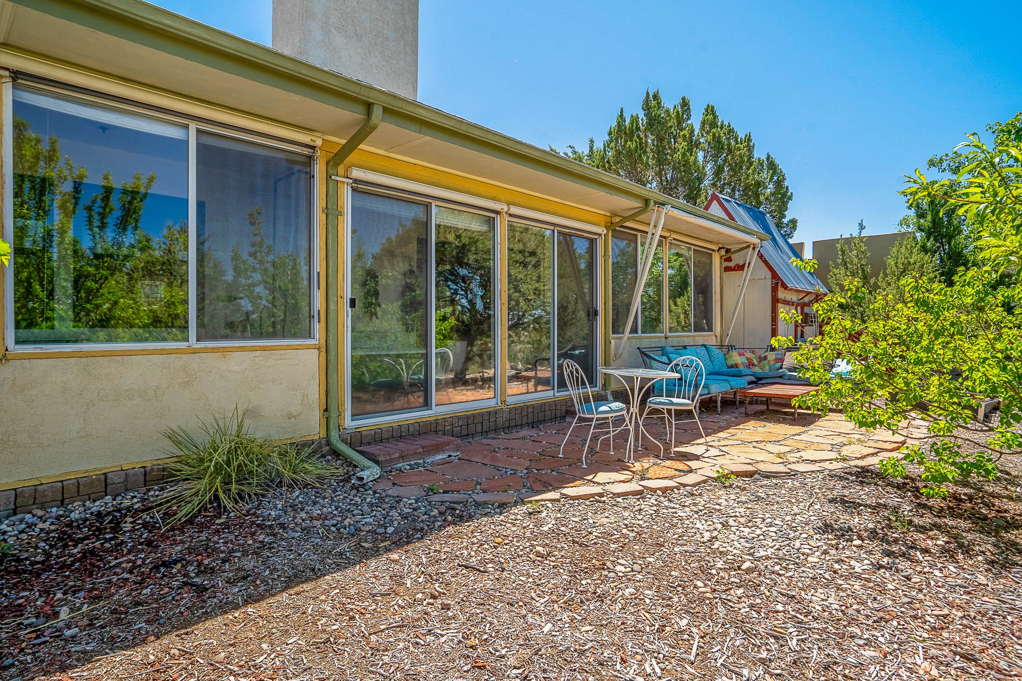 Discover this unique Cochiti Lake home, extensively remodeled in the early 90s to create an expansive, open great room with a soaring vaulted ceiling. The removal of the attic and most interior walls bathes the space in abundant natural light. This inviting home features two bedrooms, including a charming upper-floor loft, and two convenient ground-floor bathrooms. The modest kitchen has open shelving and an attached greenhouse offers year-round gardening potential. Outside, a lush, green backyard with fruit trees offers breathtaking views overlooking the Rio Grande Valley, Sandia Peak, and the Jemez Mountains. Enjoy the convenience of a 1-car garage, large storage shed, and proximity to golf and the serene no-wake lake.