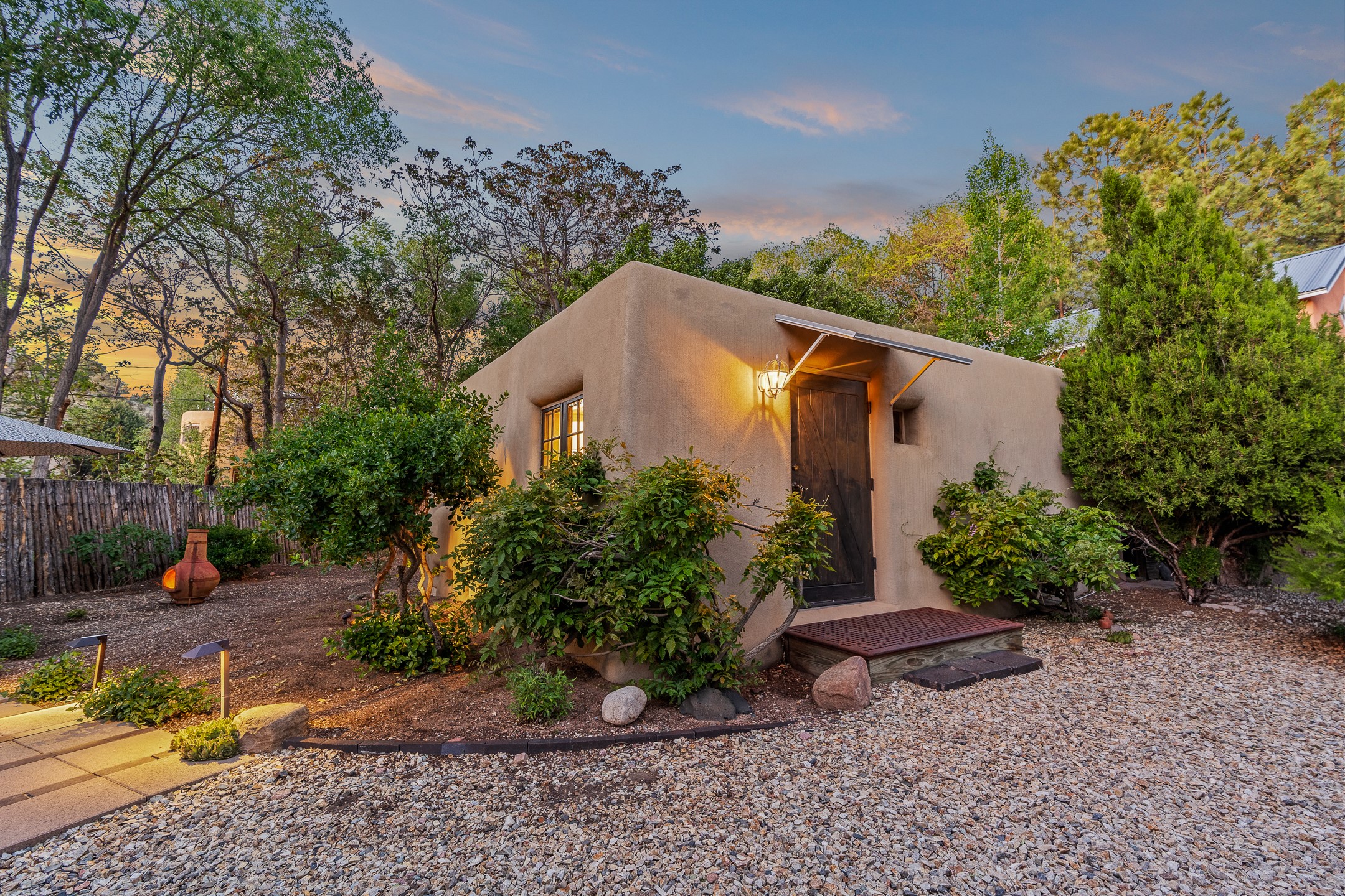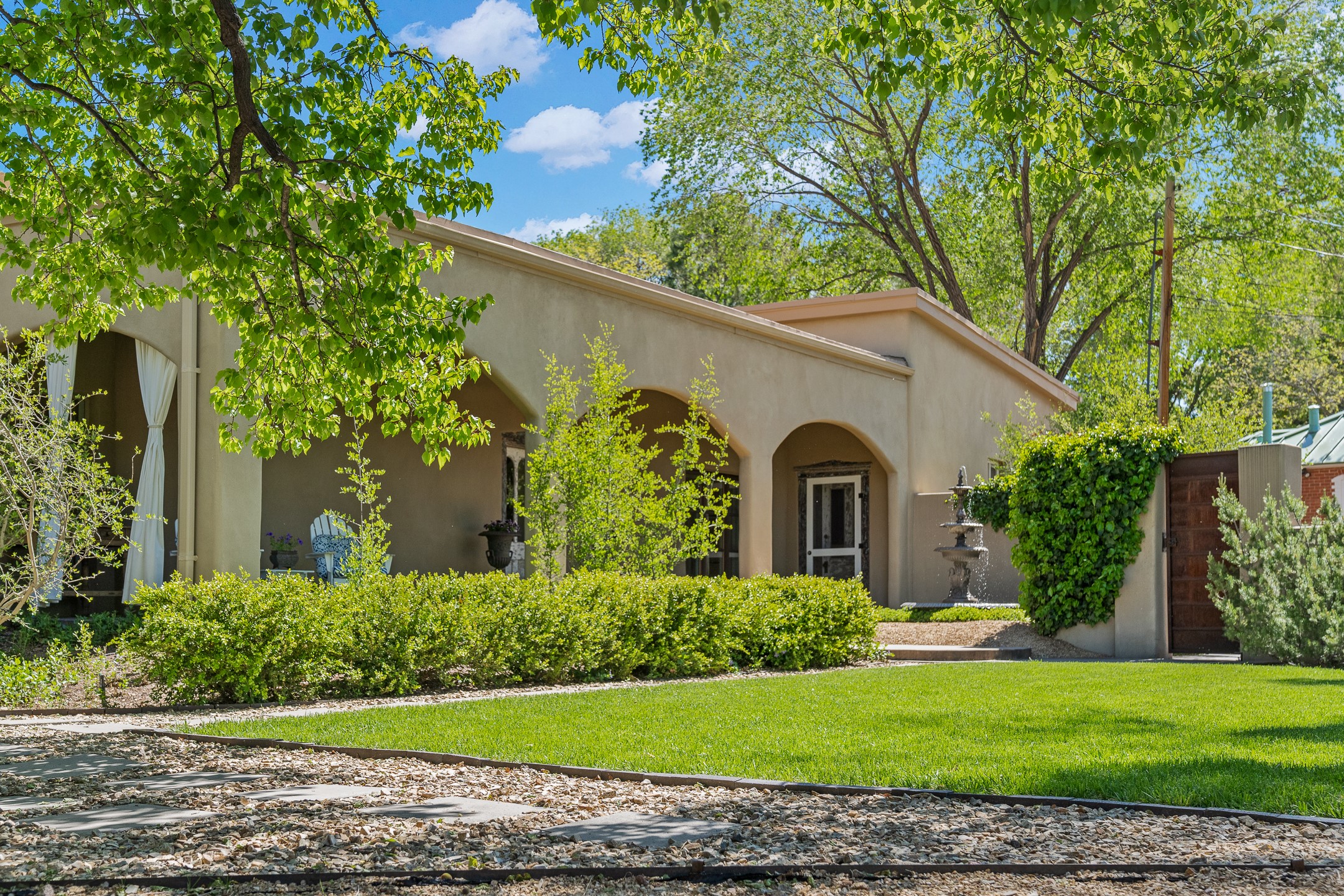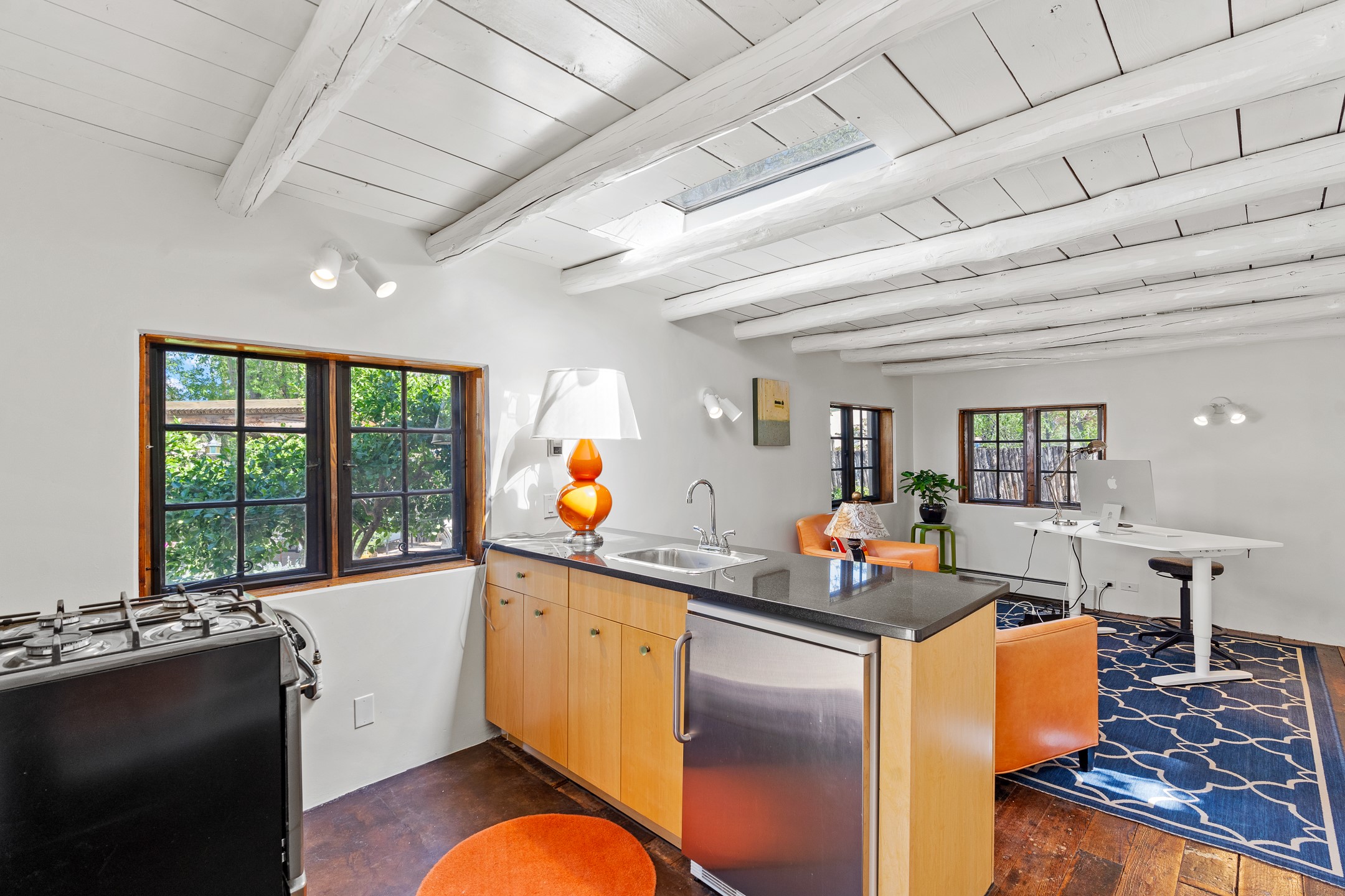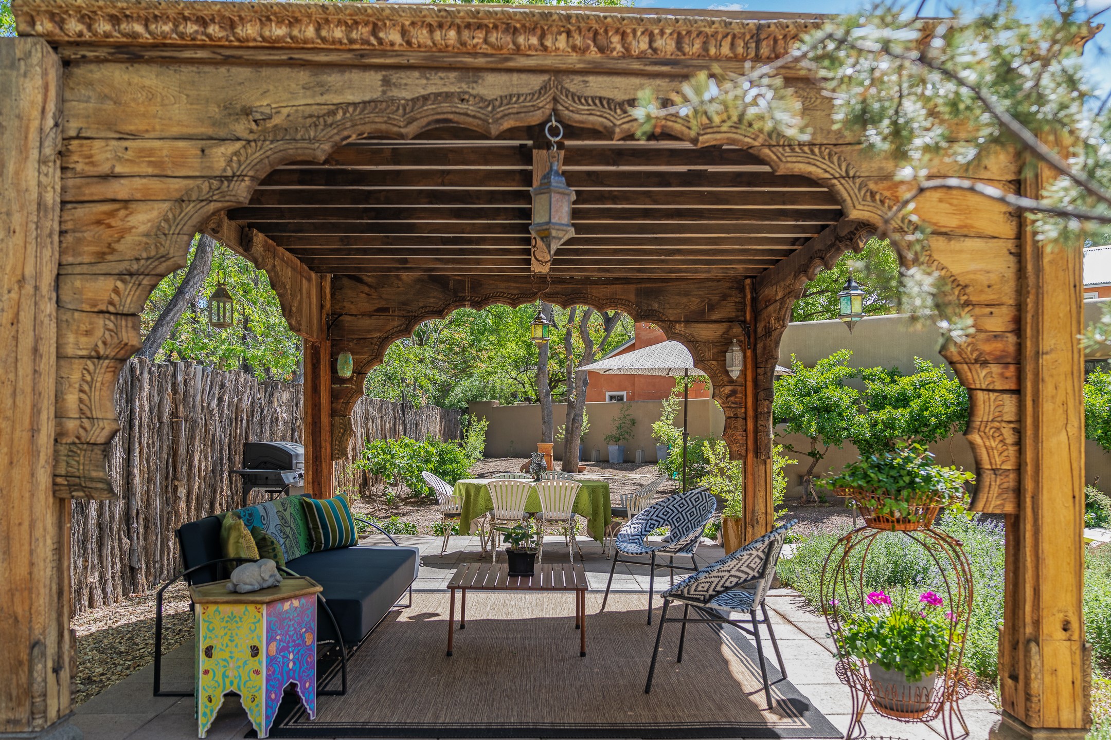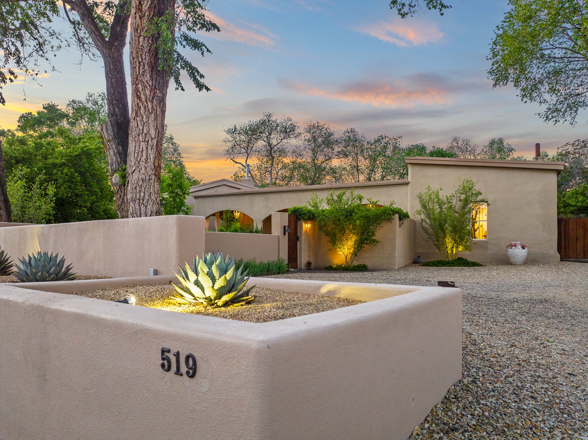 An Icon on East Palace Avenue - 519 East Palace. This historic estate blends the romance of Spanish Revival architecture with modern sophistication. Set on a beautifully landscaped third of an acre--with a lilac grove and mature trees--the property is recorded on the King's Official Map of Santa Fe and located just a short stroll to the Plaza, Canyon Road, galleries, and restaurants. A rare amenity in this location, the adobe estate offers parking for 8+ vehicles, ideal for hosting. The 2,500 sq. ft. main residence and 526 sq. ft. guest house form a serene, private compound. Inside, 15-foot exposed wood ceilings, polished brick floors, and massive adobe walls with diamond plaster create sculptural doorways and dramatic room volumes. The living room, with its soaring ceilings and wood-burning fireplace, balances architectural drama with quiet elegance. The kitchen is a striking surprise--modern KraftMaid Lustra Tygris Gloss cabinets with black granite counters bring sleek contrast to the adobe aesthetic. The primary suite, a seamless 2010 addition, offers views of the front courtyard, a contemporary fireplace, and open shed ceilings that fill the space with natural light. The one-bedroom guest house--thought to be the original pony barn--has been transformed into a charming retreat with a full bath and kitchenette. The enclosed backyard features a spacious 2-car carport, storage unit, and a hand-carved antique East Indian gazebo from Seret & Sons--a dramatic setting for evening gatherings. 519 East Palace is a true New Mexico treasure, where rich history, adobe elegance, and Santa Fe's timeless magic meet in perfect harmony.