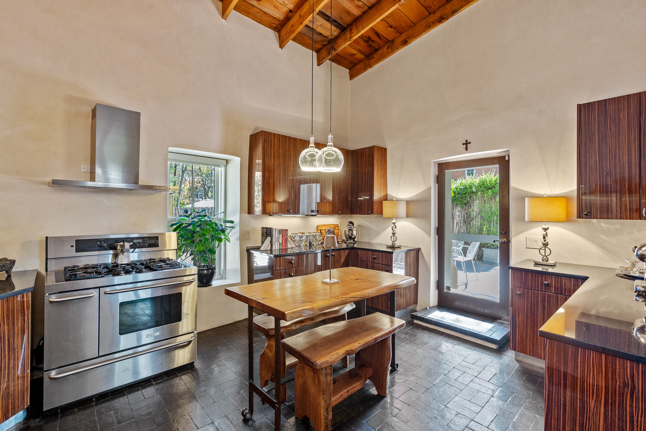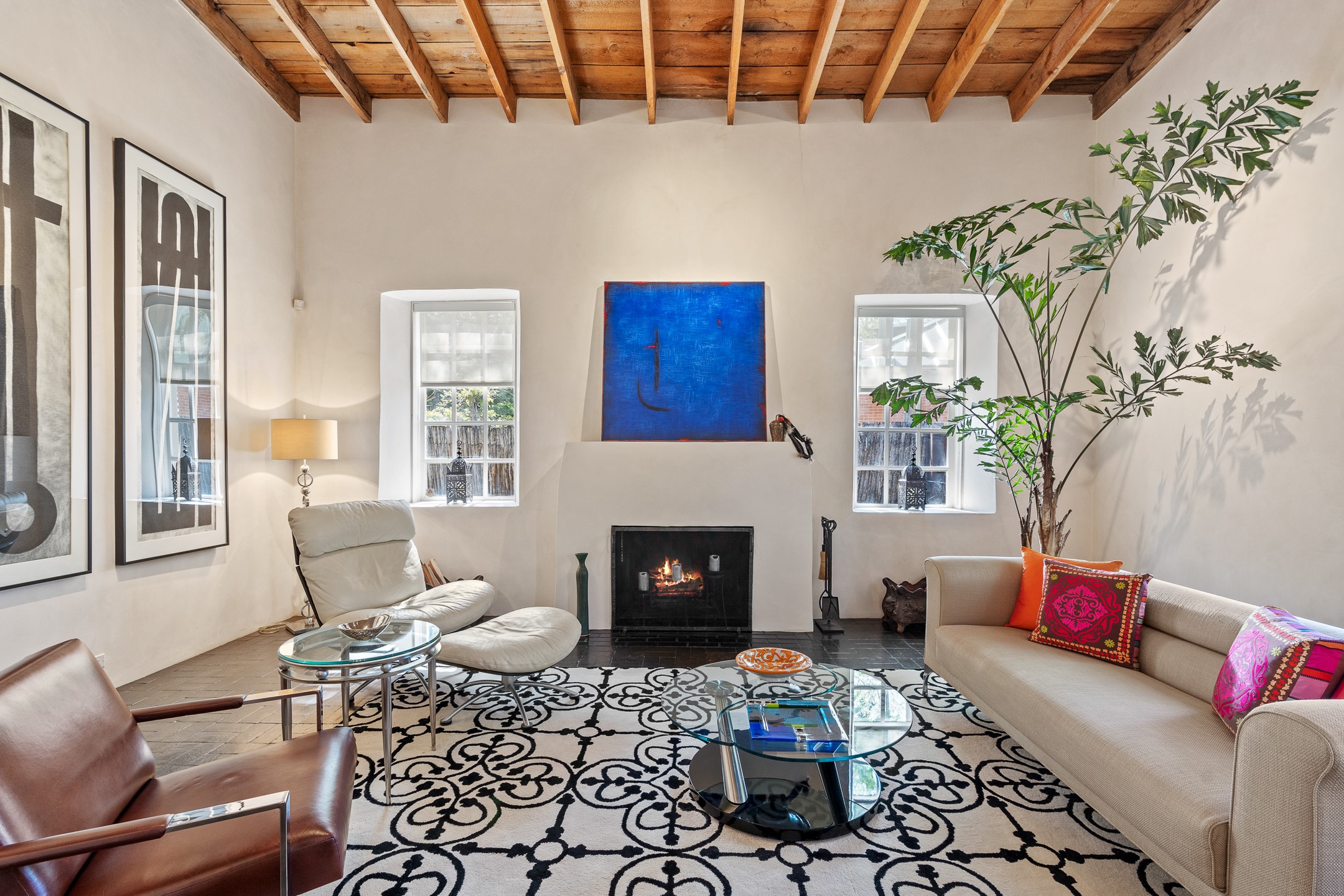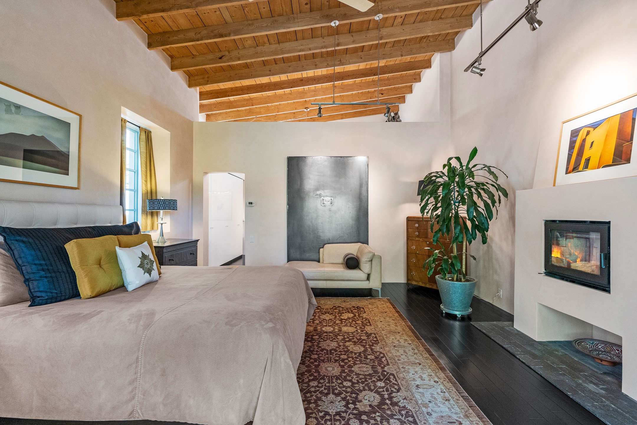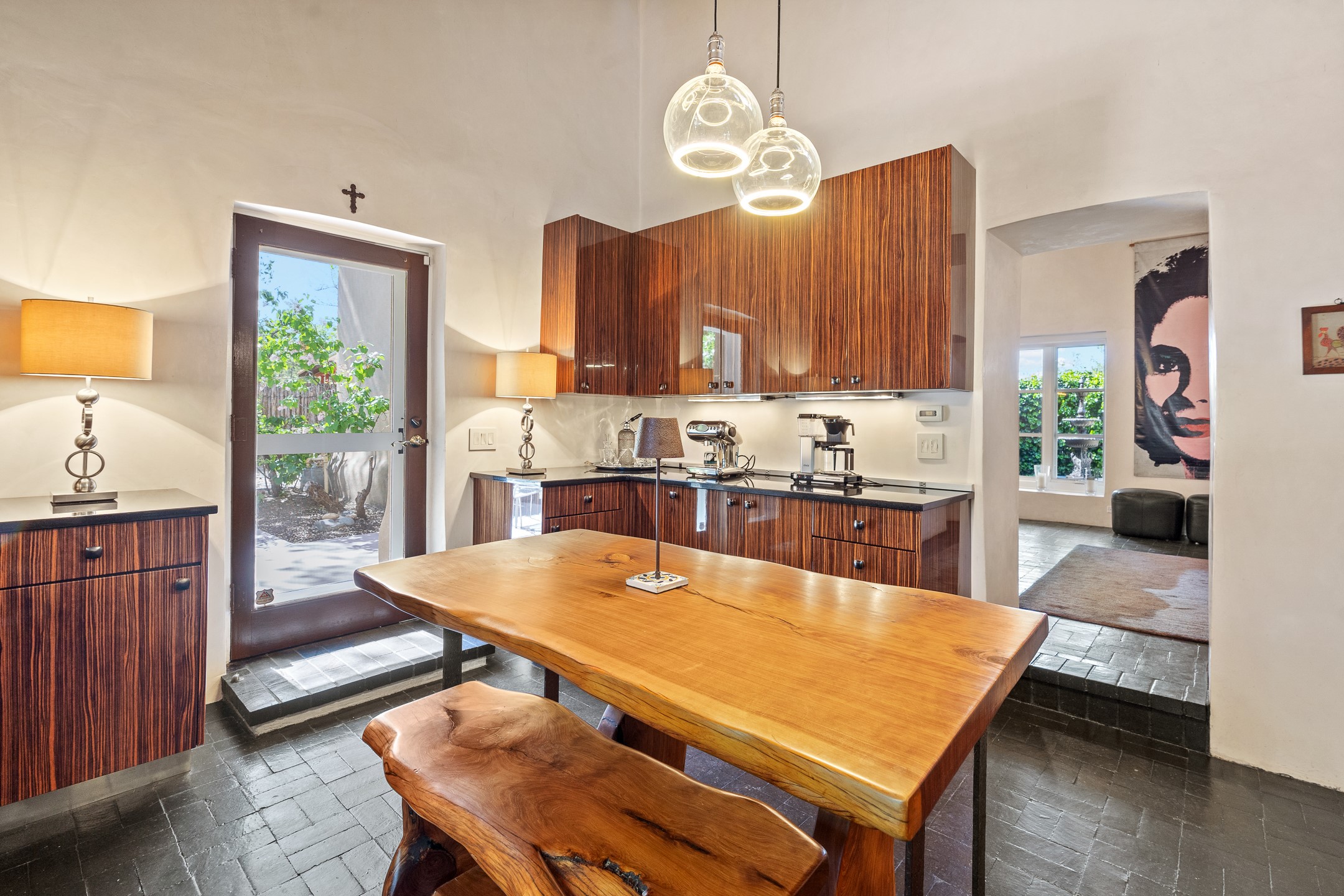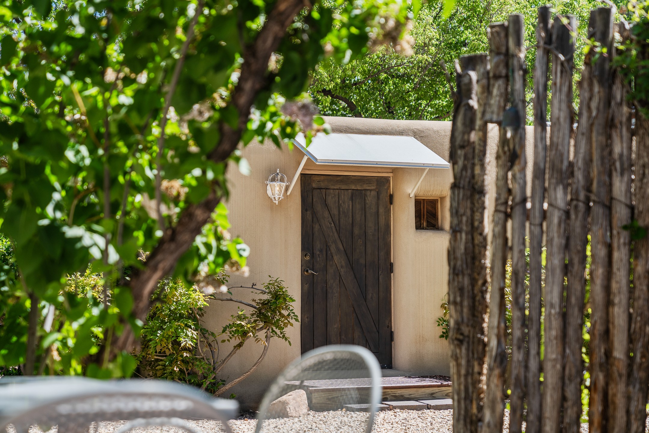 An Icon on East Palace Avenue - 519 East Palace. This historic estate blends the romance of Spanish Revival architecture with modern sophistication. Set on a beautifully landscaped third of an acre--with a lilac grove and mature trees--the property is recorded on the King's Official Map of Santa Fe and located just a short stroll to the Plaza, Canyon Road, galleries, and restaurants. A rare amenity in this location, the adobe estate offers parking for 8+ vehicles, ideal for hosting. The 2,500 sq. ft. main residence and 526 sq. ft. guest house form a serene, private compound. Inside, 15-foot exposed wood ceilings, polished brick floors, and massive adobe walls with diamond plaster create sculptural doorways and dramatic room volumes. The living room, with its soaring ceilings and wood-burning fireplace, balances architectural drama with quiet elegance. The kitchen is a striking surprise--modern KraftMaid Lustra Tygris Gloss cabinets with black granite counters bring sleek contrast to the adobe aesthetic. The primary suite, a seamless 2010 addition, offers views of the front courtyard, a contemporary fireplace, and open shed ceilings that fill the space with natural light. The one-bedroom guest house--thought to be the original pony barn--has been transformed into a charming retreat with a full bath and kitchenette. The enclosed backyard features a spacious 2-car carport, storage unit, and a hand-carved antique East Indian gazebo from Seret & Sons--a dramatic setting for evening gatherings. 519 East Palace is a true New Mexico treasure, where rich history, adobe elegance, and Santa Fe's timeless magic meet in perfect harmony.