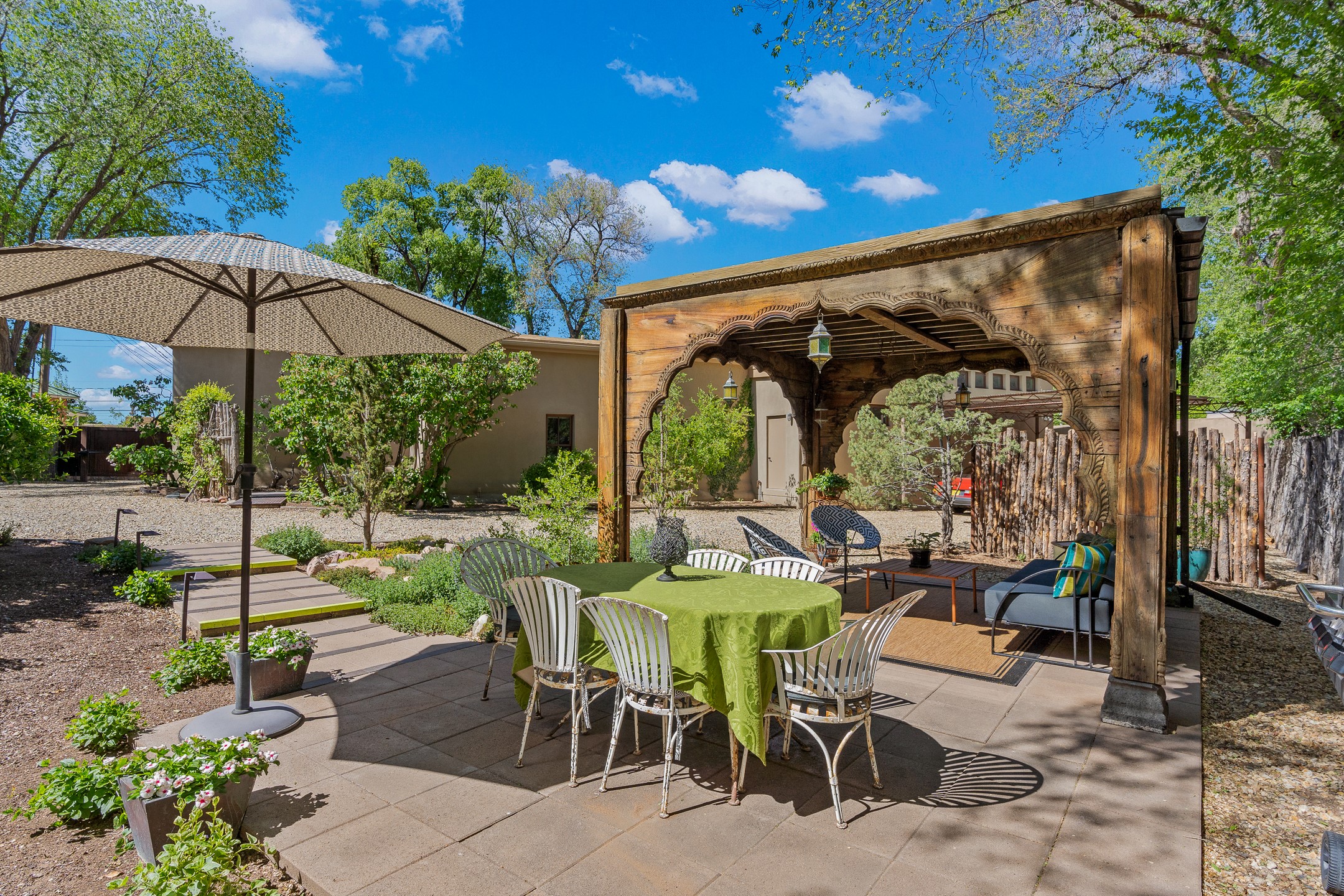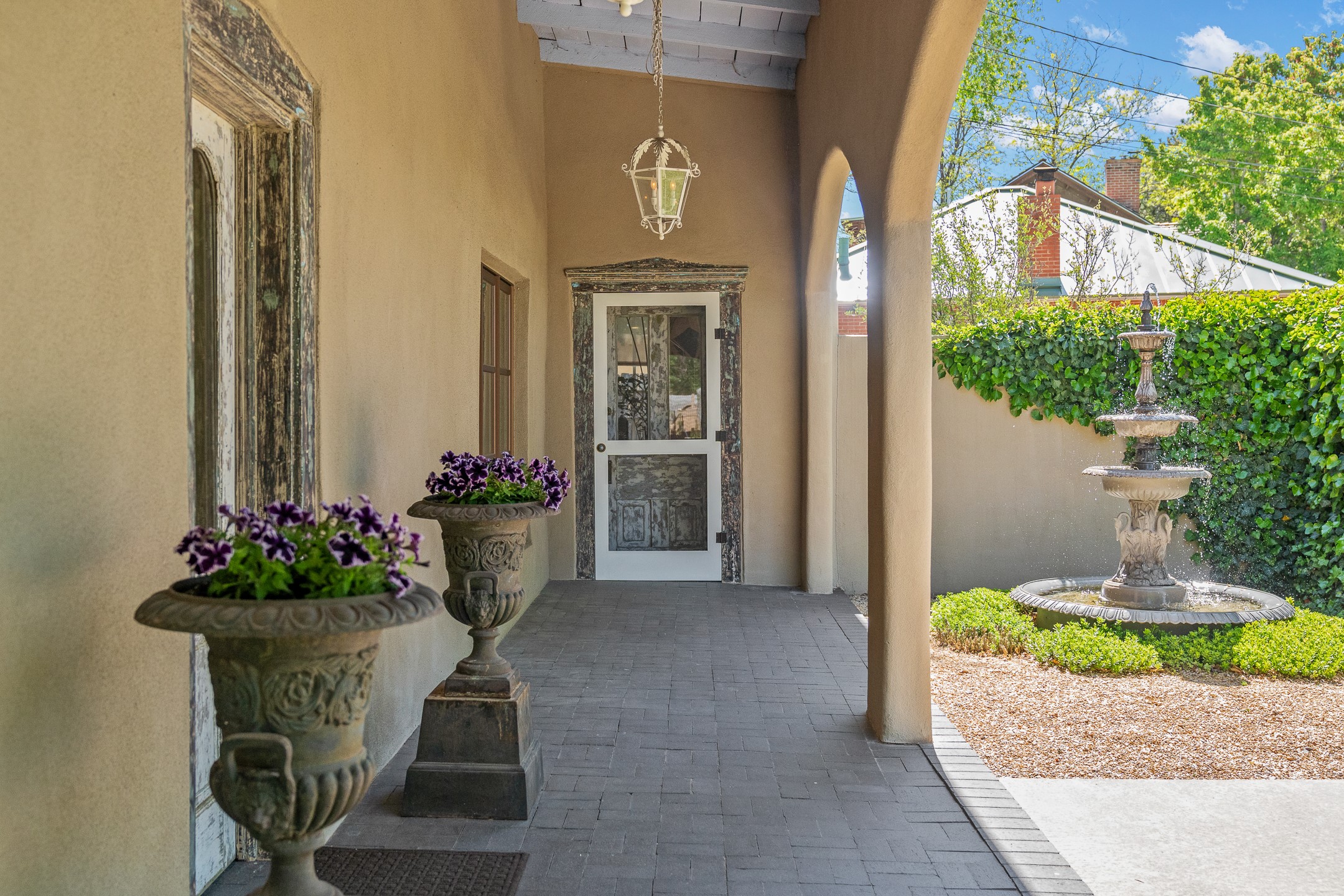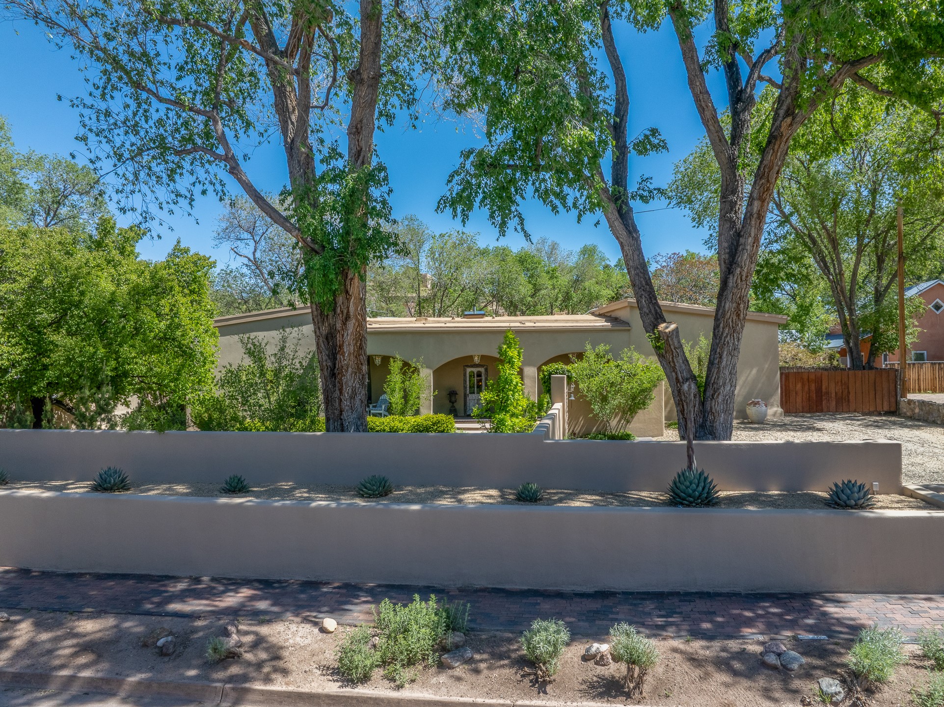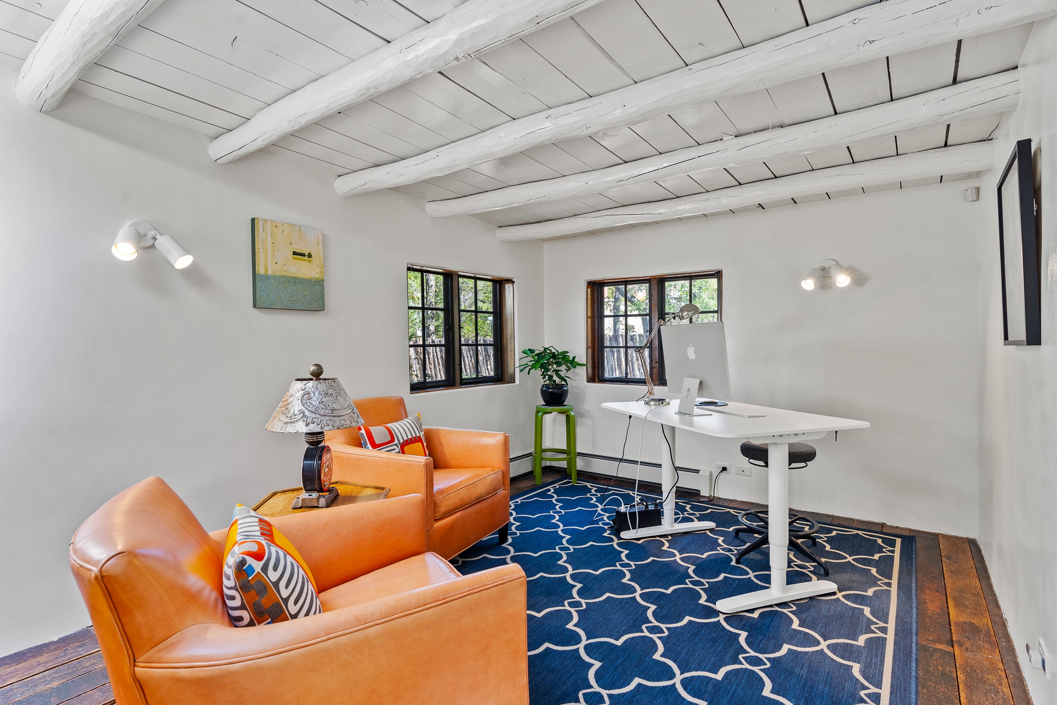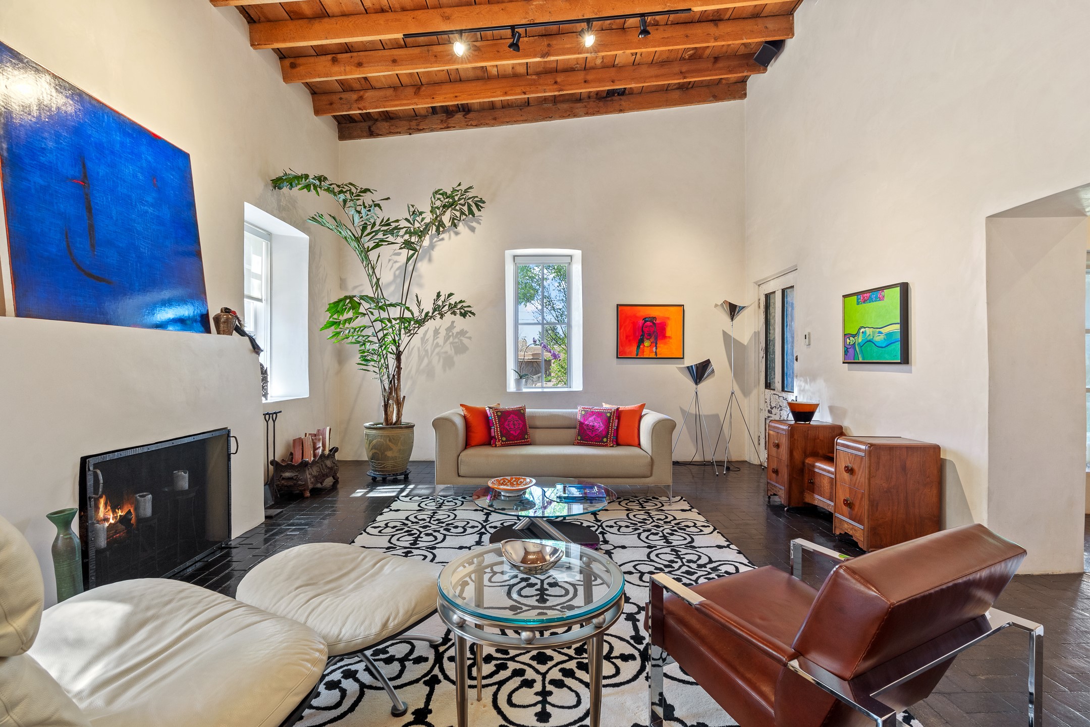 An Icon on East Palace Avenue - 519 East Palace. This historic estate blends the romance of Spanish Revival architecture with modern sophistication. Set on a beautifully landscaped third of an acre--with a lilac grove and mature trees--the property is recorded on the King's Official Map of Santa Fe and located just a short stroll to the Plaza, Canyon Road, galleries, and restaurants. A rare amenity in this location, the adobe estate offers parking for 8+ vehicles, ideal for hosting. The 2,500 sq. ft. main residence and 526 sq. ft. guest house form a serene, private compound. Inside, 15-foot exposed wood ceilings, polished brick floors, and massive adobe walls with diamond plaster create sculptural doorways and dramatic room volumes. The living room, with its soaring ceilings and wood-burning fireplace, balances architectural drama with quiet elegance. The kitchen is a striking surprise--modern KraftMaid Lustra Tygris Gloss cabinets with black granite counters bring sleek contrast to the adobe aesthetic. The primary suite, a seamless 2010 addition, offers views of the front courtyard, a contemporary fireplace, and open shed ceilings that fill the space with natural light. The one-bedroom guest house--thought to be the original pony barn--has been transformed into a charming retreat with a full bath and kitchenette. The enclosed backyard features a spacious 2-car carport, storage unit, and a hand-carved antique East Indian gazebo from Seret & Sons--a dramatic setting for evening gatherings. 519 East Palace is a true New Mexico treasure, where rich history, adobe elegance, and Santa Fe's timeless magic meet in perfect harmony.