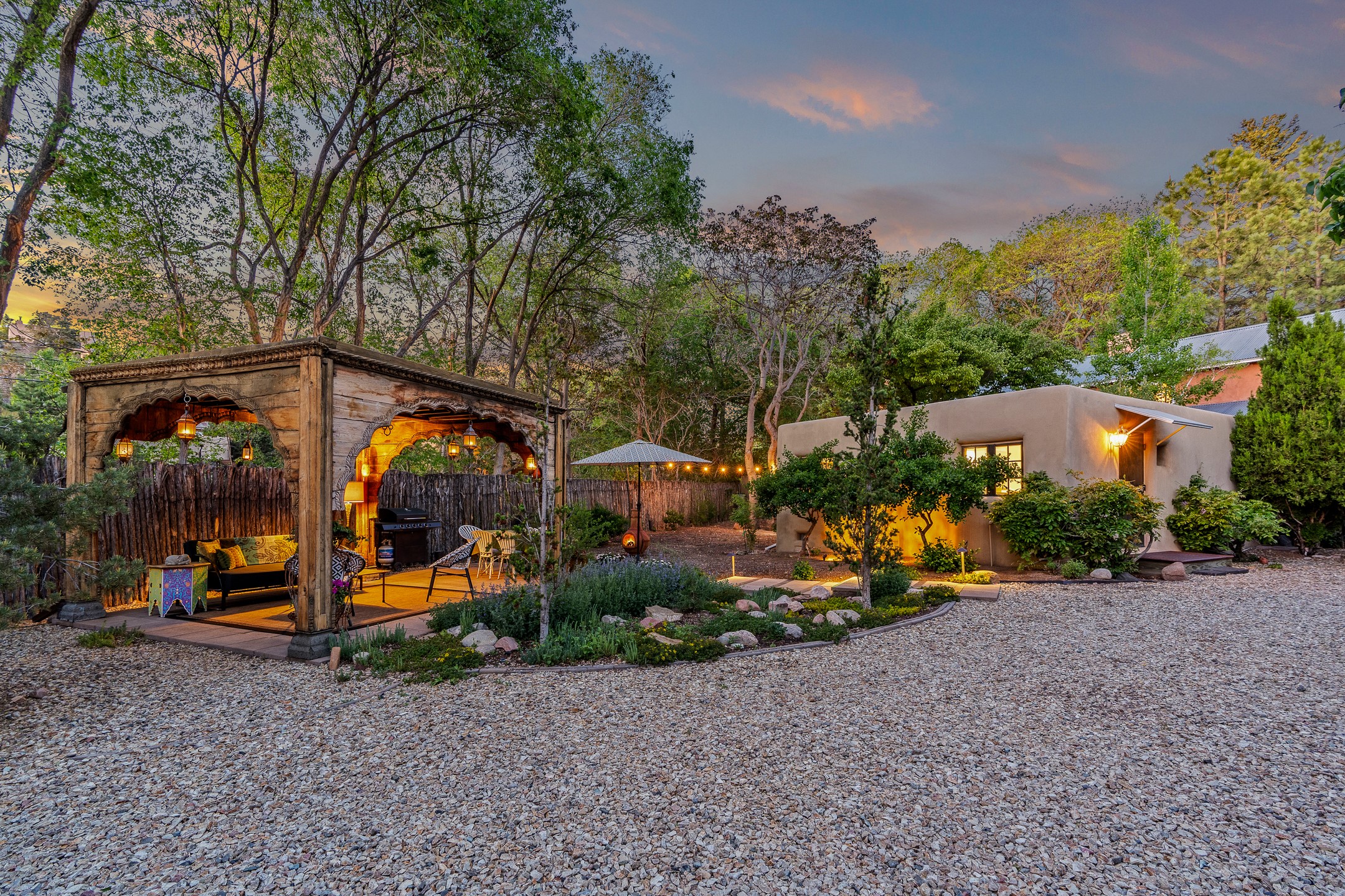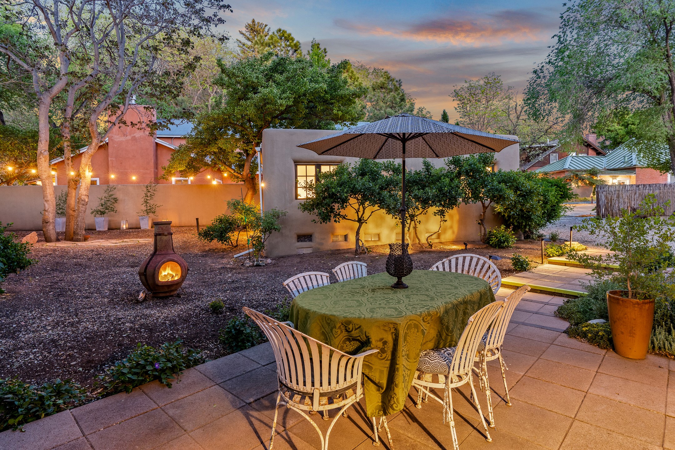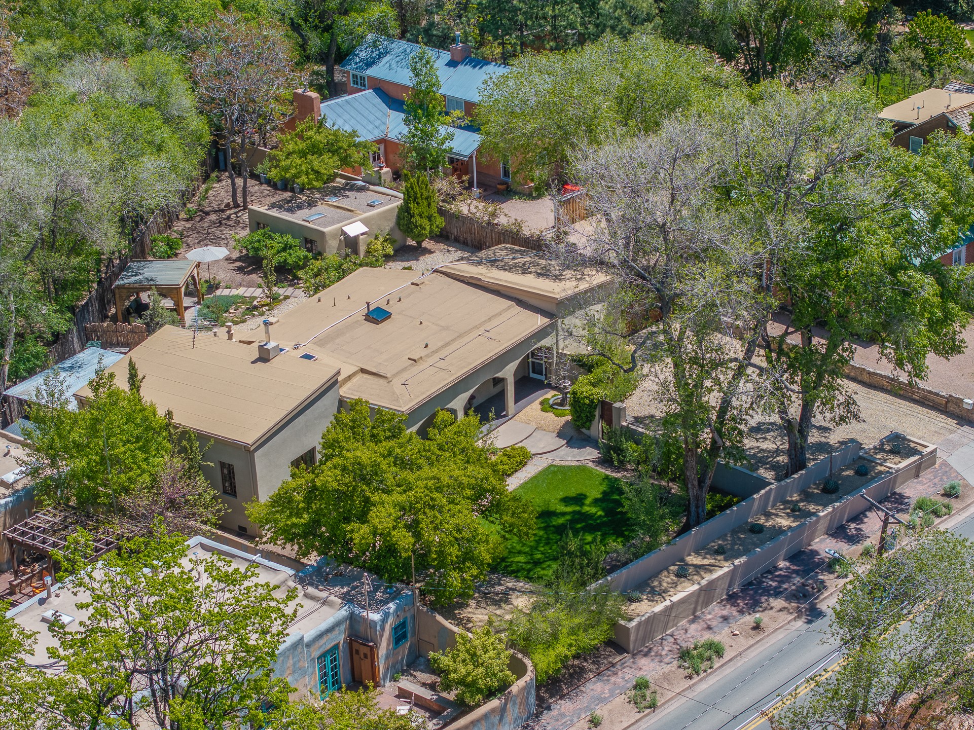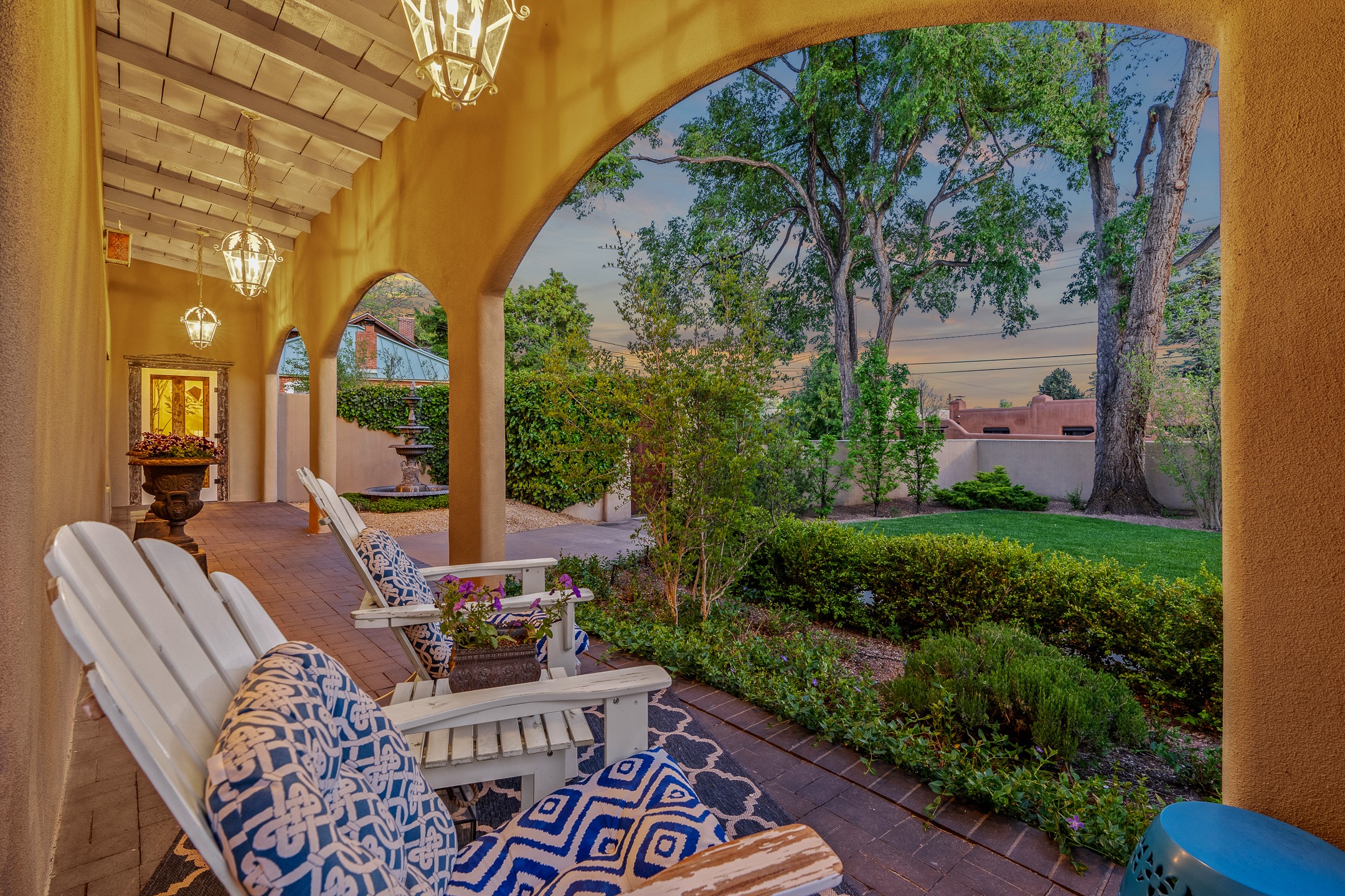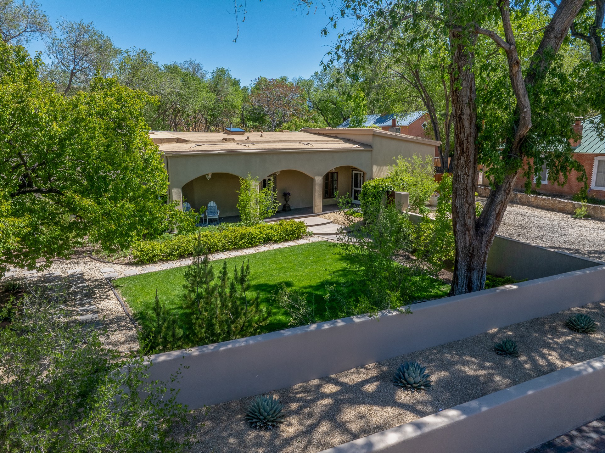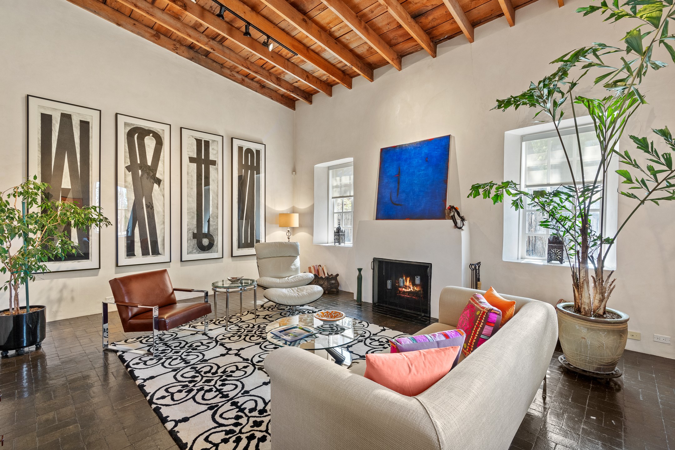 An Icon on East Palace Avenue - 519 East Palace. This historic estate blends the romance of Spanish Revival architecture with modern sophistication. Set on a beautifully landscaped third of an acre--with a lilac grove and mature trees--the property is recorded on the King's Official Map of Santa Fe and located just a short stroll to the Plaza, Canyon Road, galleries, and restaurants. A rare amenity in this location, the adobe estate offers parking for 8+ vehicles, ideal for hosting. The 2,500 sq. ft. main residence and 526 sq. ft. guest house form a serene, private compound. Inside, 15-foot exposed wood ceilings, polished brick floors, and massive adobe walls with diamond plaster create sculptural doorways and dramatic room volumes. The living room, with its soaring ceilings and wood-burning fireplace, balances architectural drama with quiet elegance. The kitchen is a striking surprise--modern KraftMaid Lustra Tygris Gloss cabinets with black granite counters bring sleek contrast to the adobe aesthetic. The primary suite, a seamless 2010 addition, offers views of the front courtyard, a contemporary fireplace, and open shed ceilings that fill the space with natural light. The one-bedroom guest house--thought to be the original pony barn--has been transformed into a charming retreat with a full bath and kitchenette. The enclosed backyard features a spacious 2-car carport, storage unit, and a hand-carved antique East Indian gazebo from Seret & Sons--a dramatic setting for evening gatherings. 519 East Palace is a true New Mexico treasure, where rich history, adobe elegance, and Santa Fe's timeless magic meet in perfect harmony.