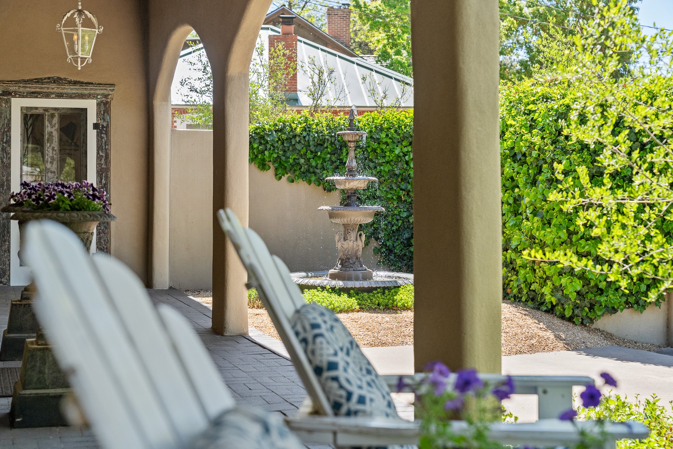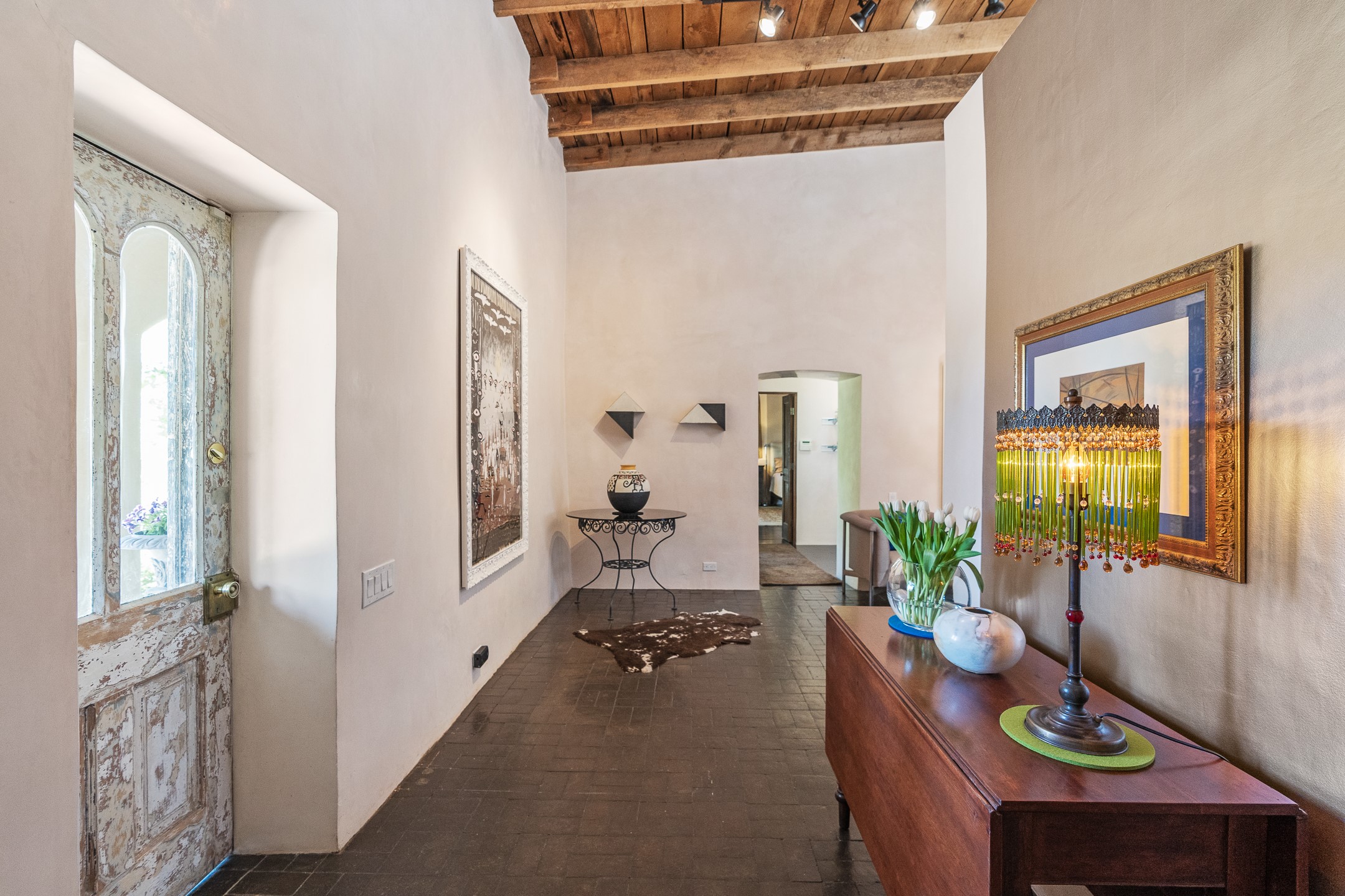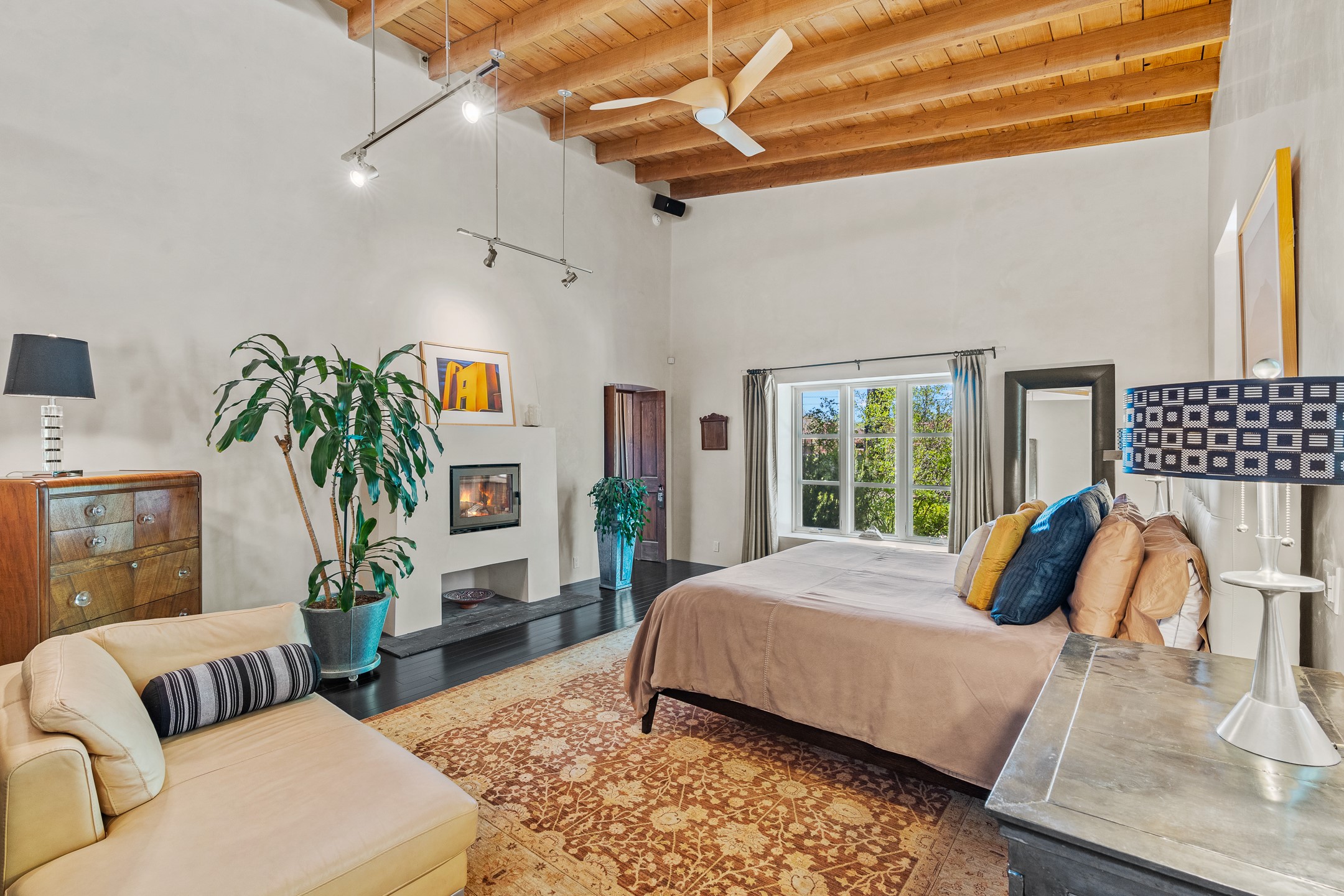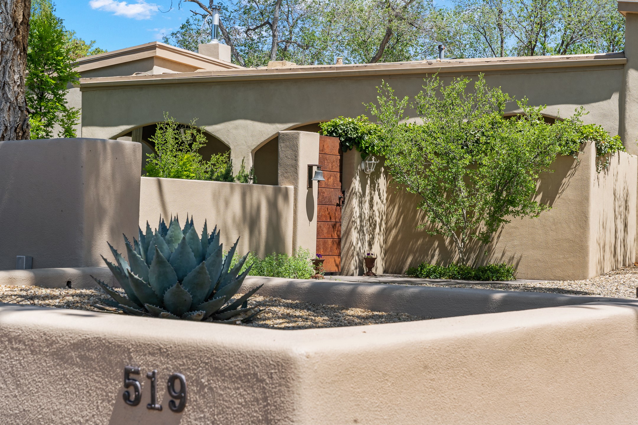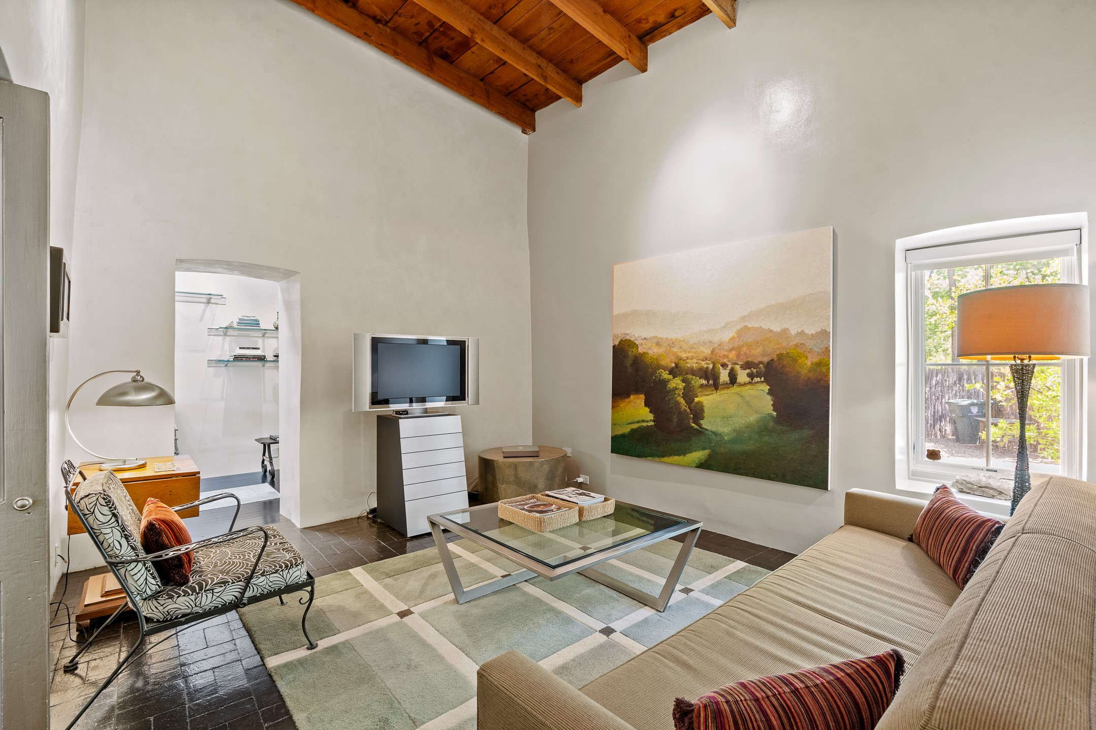 An Icon on East Palace Avenue - 519 East Palace. This historic estate blends the romance of Spanish Revival architecture with modern sophistication. Set on a beautifully landscaped third of an acre--with a lilac grove and mature trees--the property is recorded on the King's Official Map of Santa Fe and located just a short stroll to the Plaza, Canyon Road, galleries, and restaurants. A rare amenity in this location, the adobe estate offers parking for 8+ vehicles, ideal for hosting. The 2,500 sq. ft. main residence and 526 sq. ft. guest house form a serene, private compound. Inside, 15-foot exposed wood ceilings, polished brick floors, and massive adobe walls with diamond plaster create sculptural doorways and dramatic room volumes. The living room, with its soaring ceilings and wood-burning fireplace, balances architectural drama with quiet elegance. The kitchen is a striking surprise--modern KraftMaid Lustra Tygris Gloss cabinets with black granite counters bring sleek contrast to the adobe aesthetic. The primary suite, a seamless 2010 addition, offers views of the front courtyard, a contemporary fireplace, and open shed ceilings that fill the space with natural light. The one-bedroom guest house--thought to be the original pony barn--has been transformed into a charming retreat with a full bath and kitchenette. The enclosed backyard features a spacious 2-car carport, storage unit, and a hand-carved antique East Indian gazebo from Seret & Sons--a dramatic setting for evening gatherings. 519 East Palace is a true New Mexico treasure, where rich history, adobe elegance, and Santa Fe's timeless magic meet in perfect harmony.