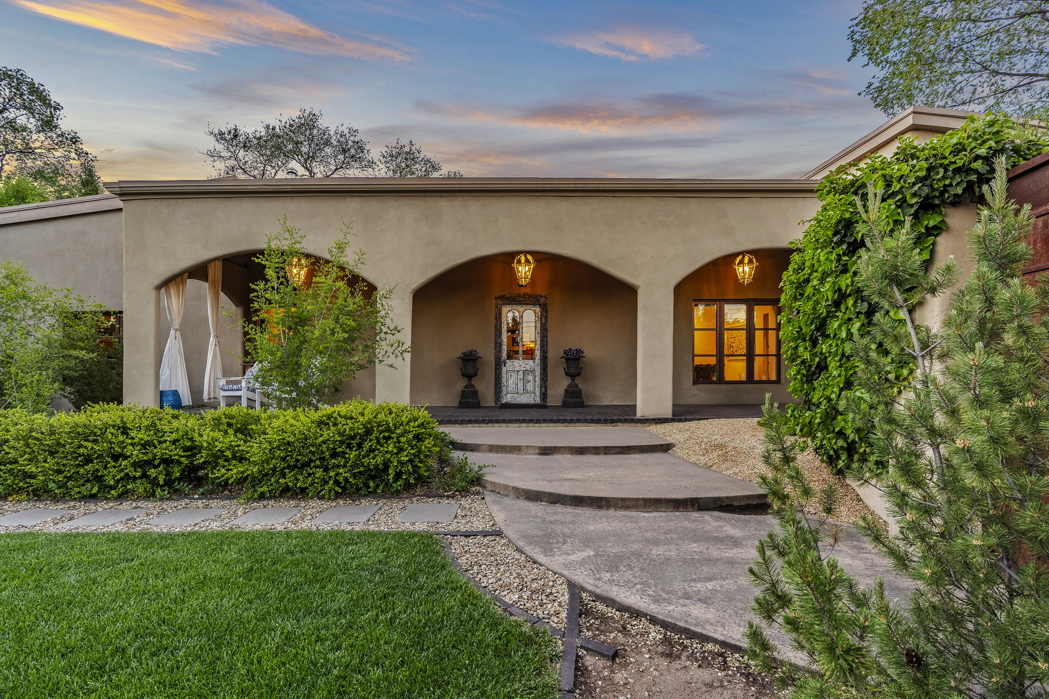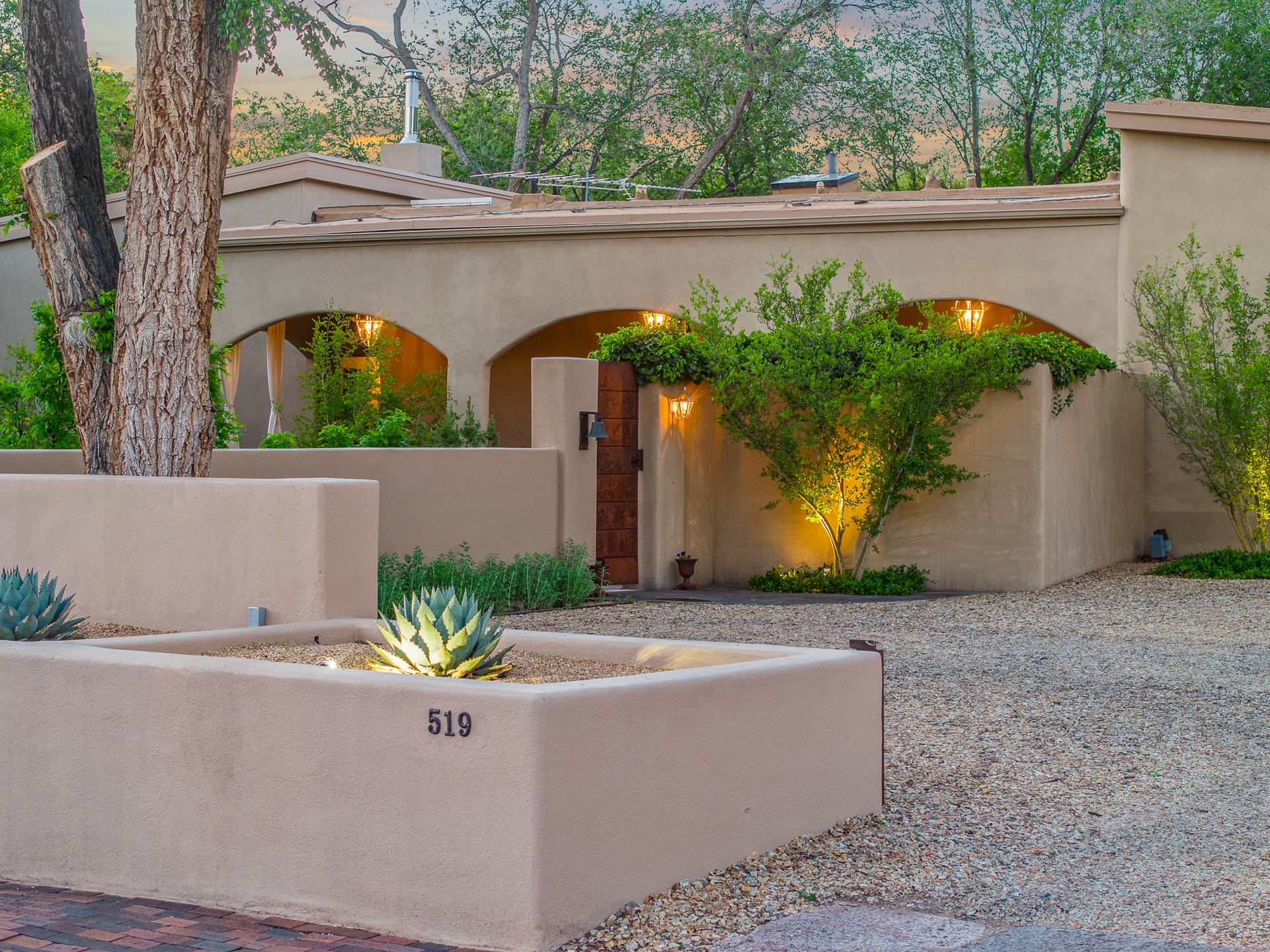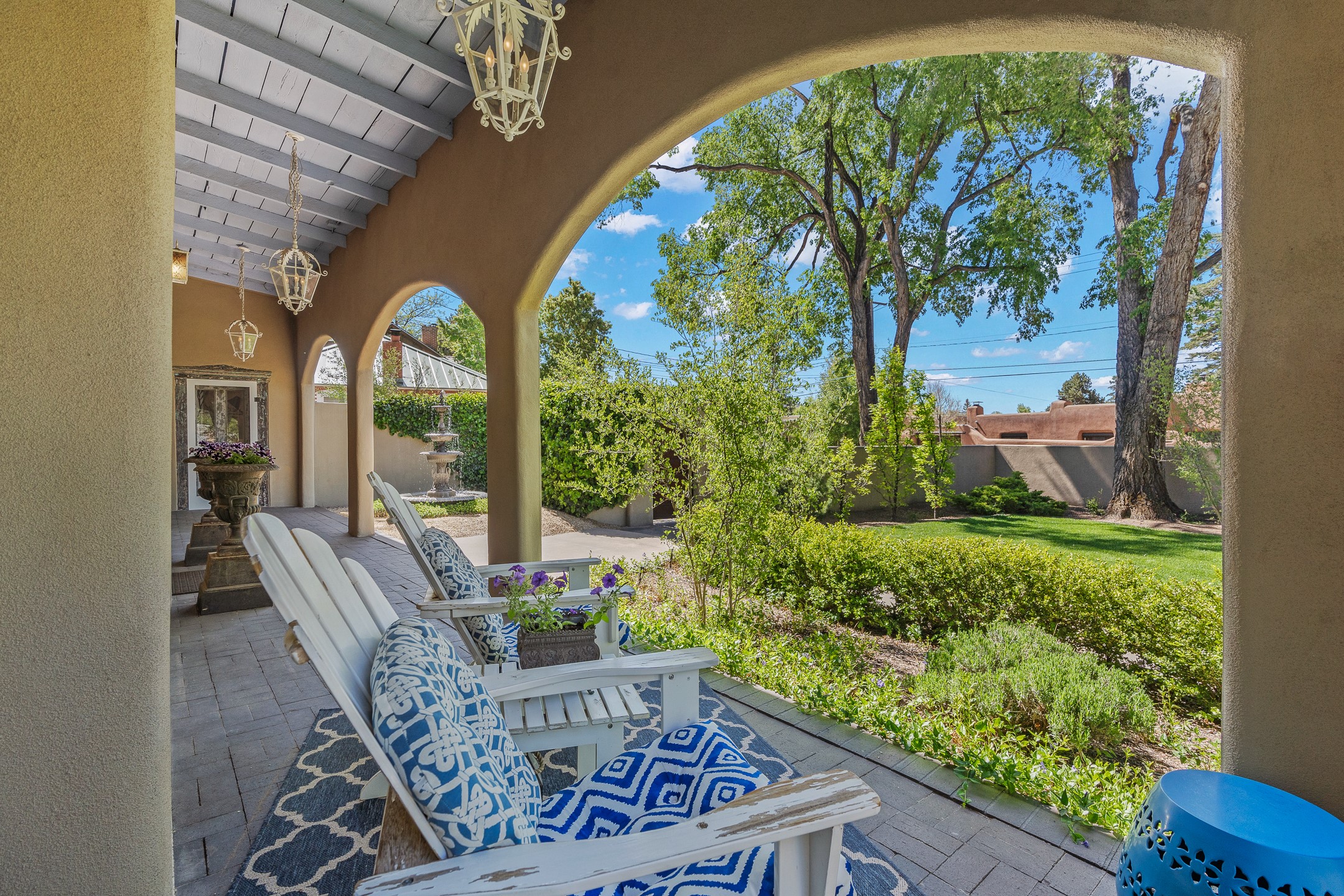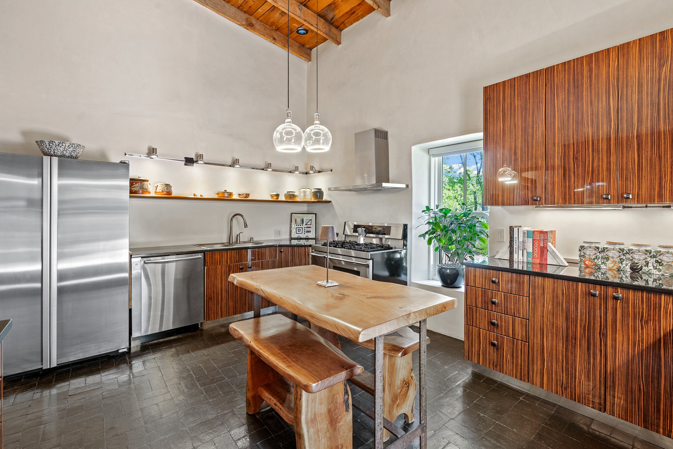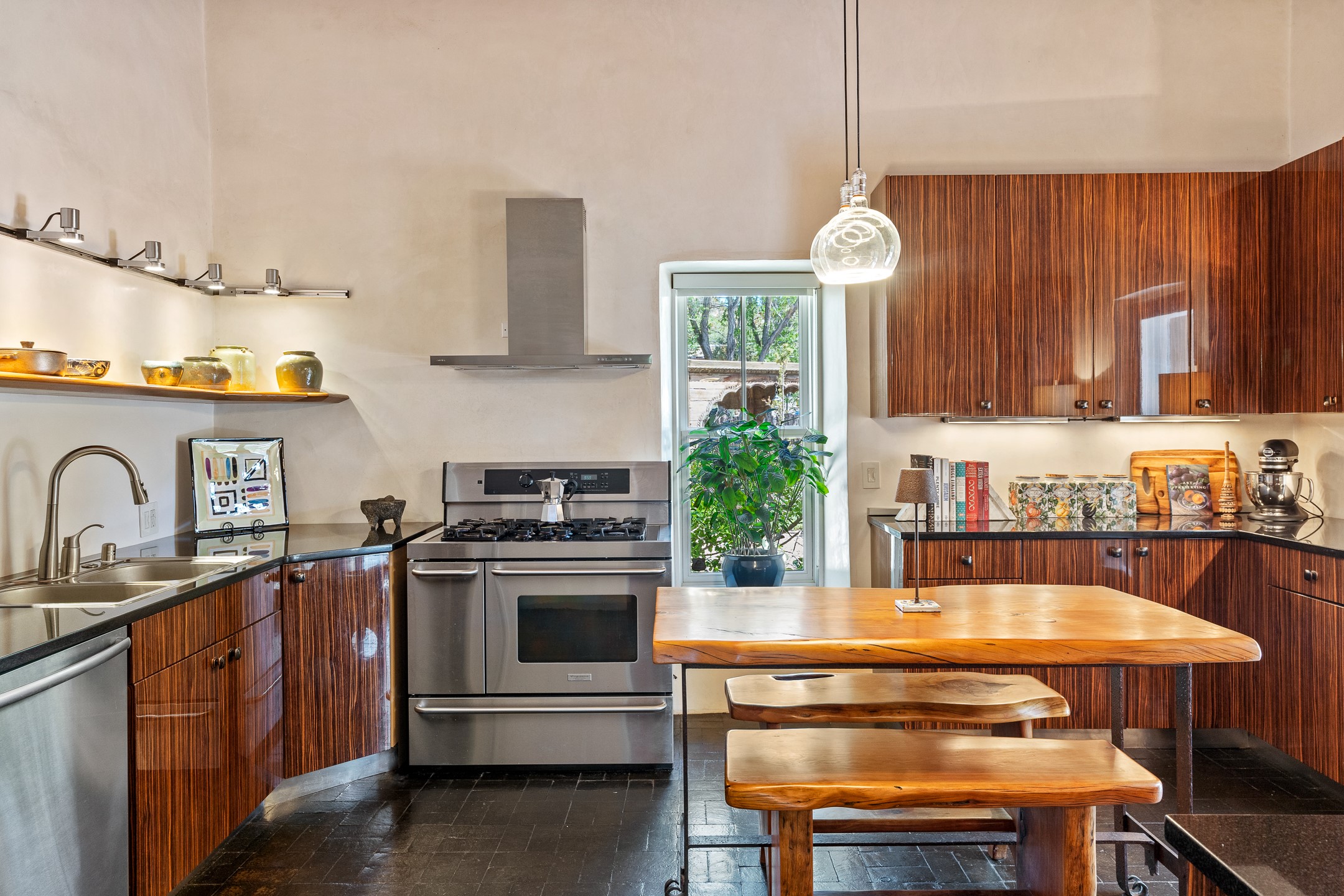 An Icon on East Palace Avenue - 519 East Palace. This historic estate blends the romance of Spanish Revival architecture with modern sophistication. Set on a beautifully landscaped third of an acre--with a lilac grove and mature trees--the property is recorded on the King's Official Map of Santa Fe and located just a short stroll to the Plaza, Canyon Road, galleries, and restaurants. A rare amenity in this location, the adobe estate offers parking for 8+ vehicles, ideal for hosting. The 2,500 sq. ft. main residence and 526 sq. ft. guest house form a serene, private compound. Inside, 15-foot exposed wood ceilings, polished brick floors, and massive adobe walls with diamond plaster create sculptural doorways and dramatic room volumes. The living room, with its soaring ceilings and wood-burning fireplace, balances architectural drama with quiet elegance. The kitchen is a striking surprise--modern KraftMaid Lustra Tygris Gloss cabinets with black granite counters bring sleek contrast to the adobe aesthetic. The primary suite, a seamless 2010 addition, offers views of the front courtyard, a contemporary fireplace, and open shed ceilings that fill the space with natural light. The one-bedroom guest house--thought to be the original pony barn--has been transformed into a charming retreat with a full bath and kitchenette. The enclosed backyard features a spacious 2-car carport, storage unit, and a hand-carved antique East Indian gazebo from Seret & Sons--a dramatic setting for evening gatherings. 519 East Palace is a true New Mexico treasure, where rich history, adobe elegance, and Santa Fe's timeless magic meet in perfect harmony.