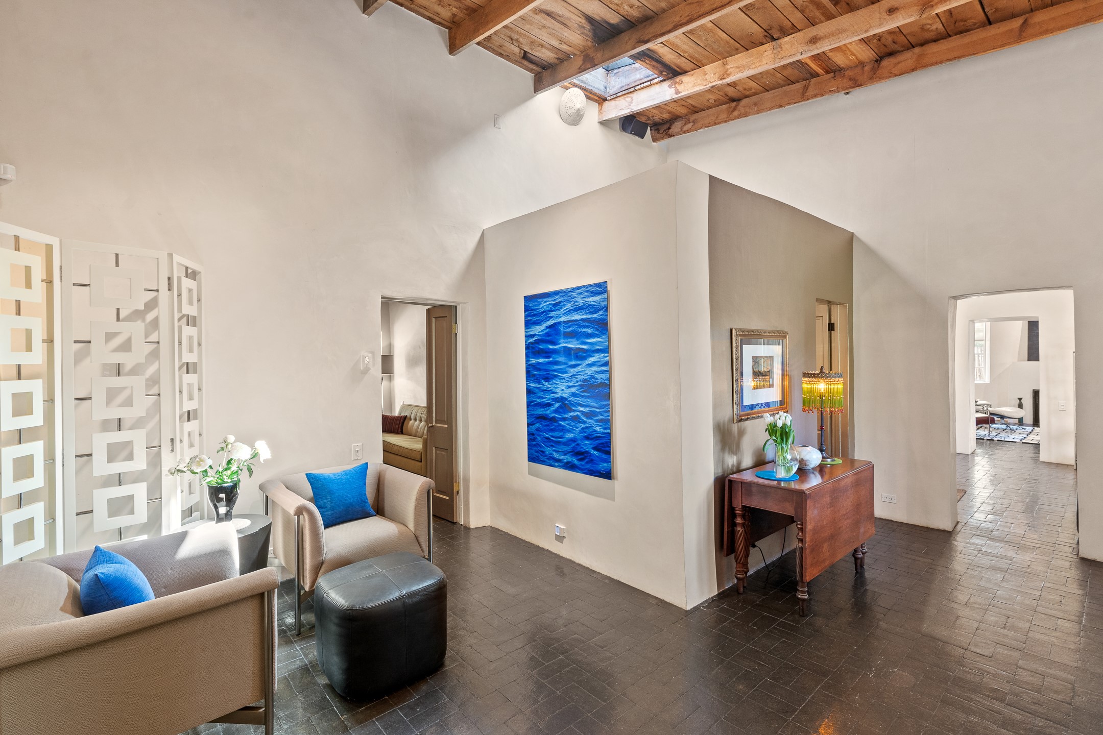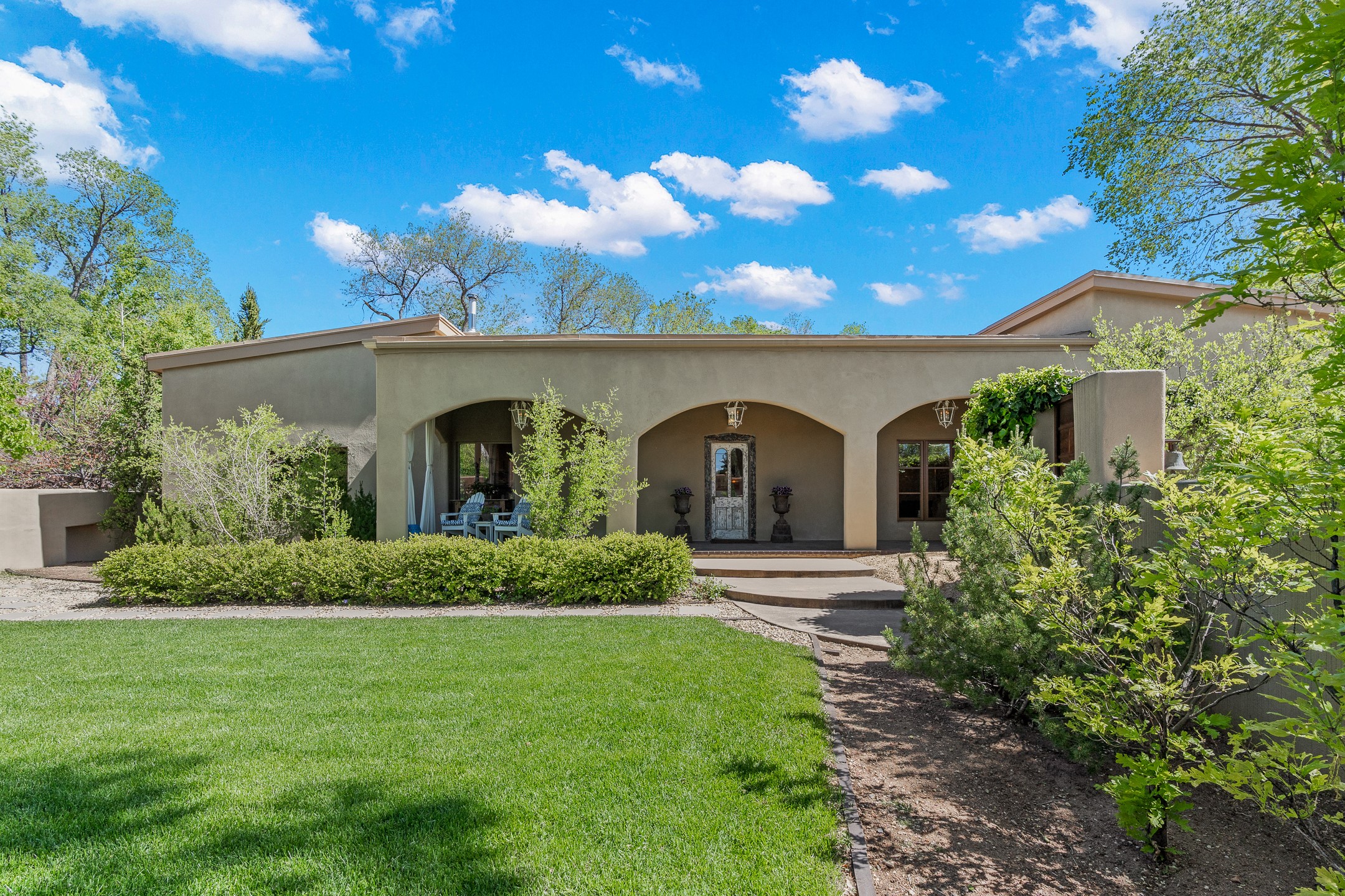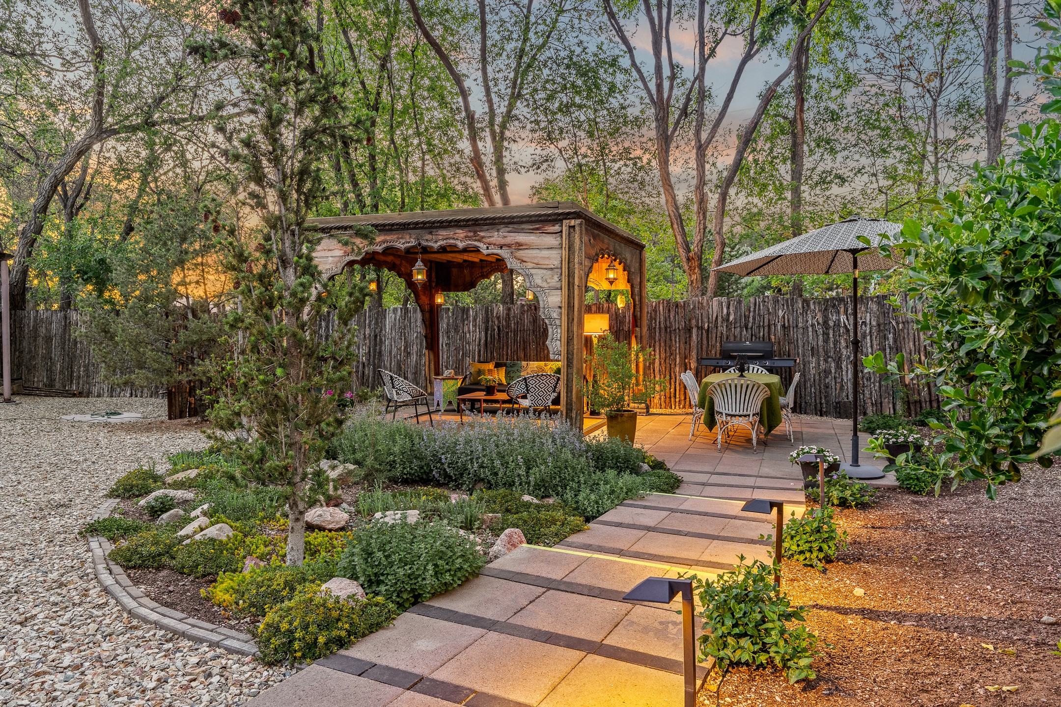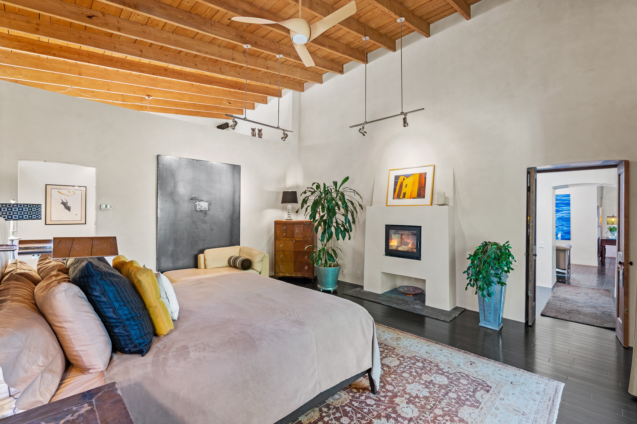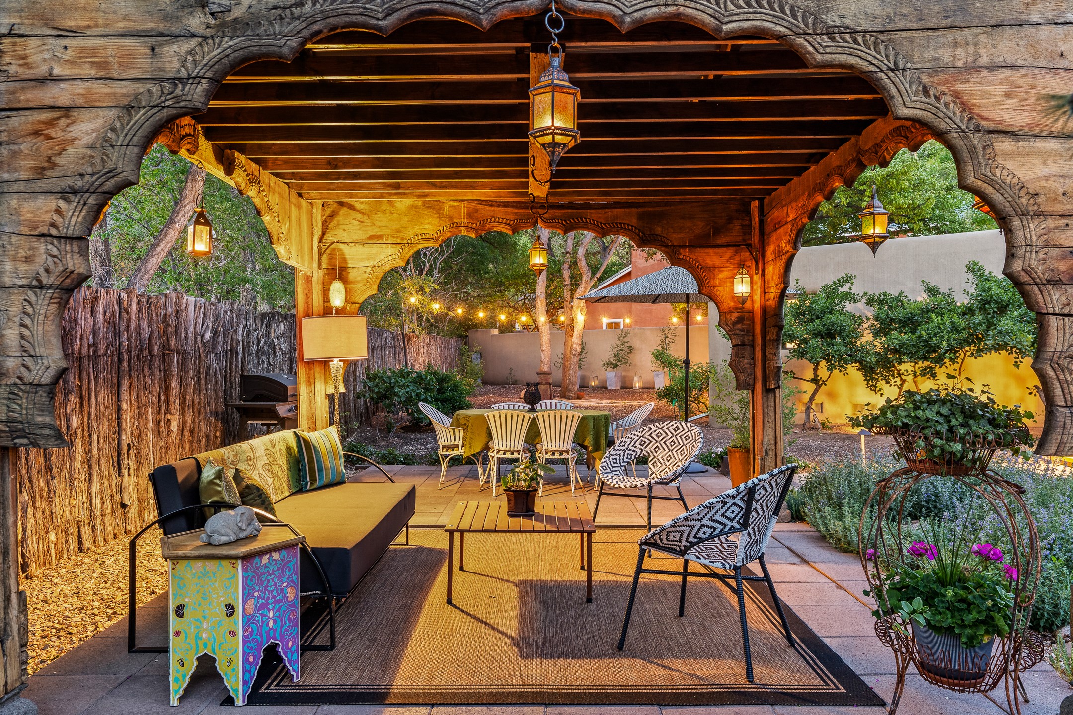An Icon on East Palace Avenue - 519 East Palace. This historic estate blends the romance of Spanish Revival architecture with modern sophistication. Set on a beautifully landscaped third of an acre--with a lilac grove and mature trees--the property is recorded on the King's Official Map of Santa Fe and located just a short stroll to the Plaza, Canyon Road, galleries, and restaurants. A rare amenity in this location, the adobe estate offers parking for 8+ vehicles, ideal for hosting. The 2,500 sq. ft. main residence and 526 sq. ft. guest house form a serene, private compound. Inside, 15-foot exposed wood ceilings, polished brick floors, and massive adobe walls with diamond plaster create sculptural doorways and dramatic room volumes. The living room, with its soaring ceilings and wood-burning fireplace, balances architectural drama with quiet elegance. The kitchen is a striking surprise--modern KraftMaid Lustra Tygris Gloss cabinets with black granite counters bring sleek contrast to the adobe aesthetic. The primary suite, a seamless 2010 addition, offers views of the front courtyard, a contemporary fireplace, and open shed ceilings that fill the space with natural light. The one-bedroom guest house--thought to be the original pony barn--has been transformed into a charming retreat with a full bath and kitchenette. The enclosed backyard features a spacious 2-car carport, storage unit, and a hand-carved antique East Indian gazebo from Seret & Sons--a dramatic setting for evening gatherings. 519 East Palace is a true New Mexico treasure, where rich history, adobe elegance, and Santa Fe's timeless magic meet in perfect harmony.