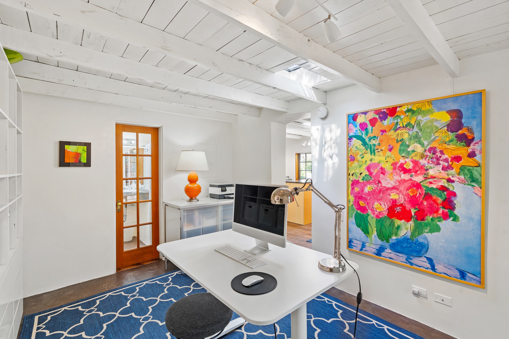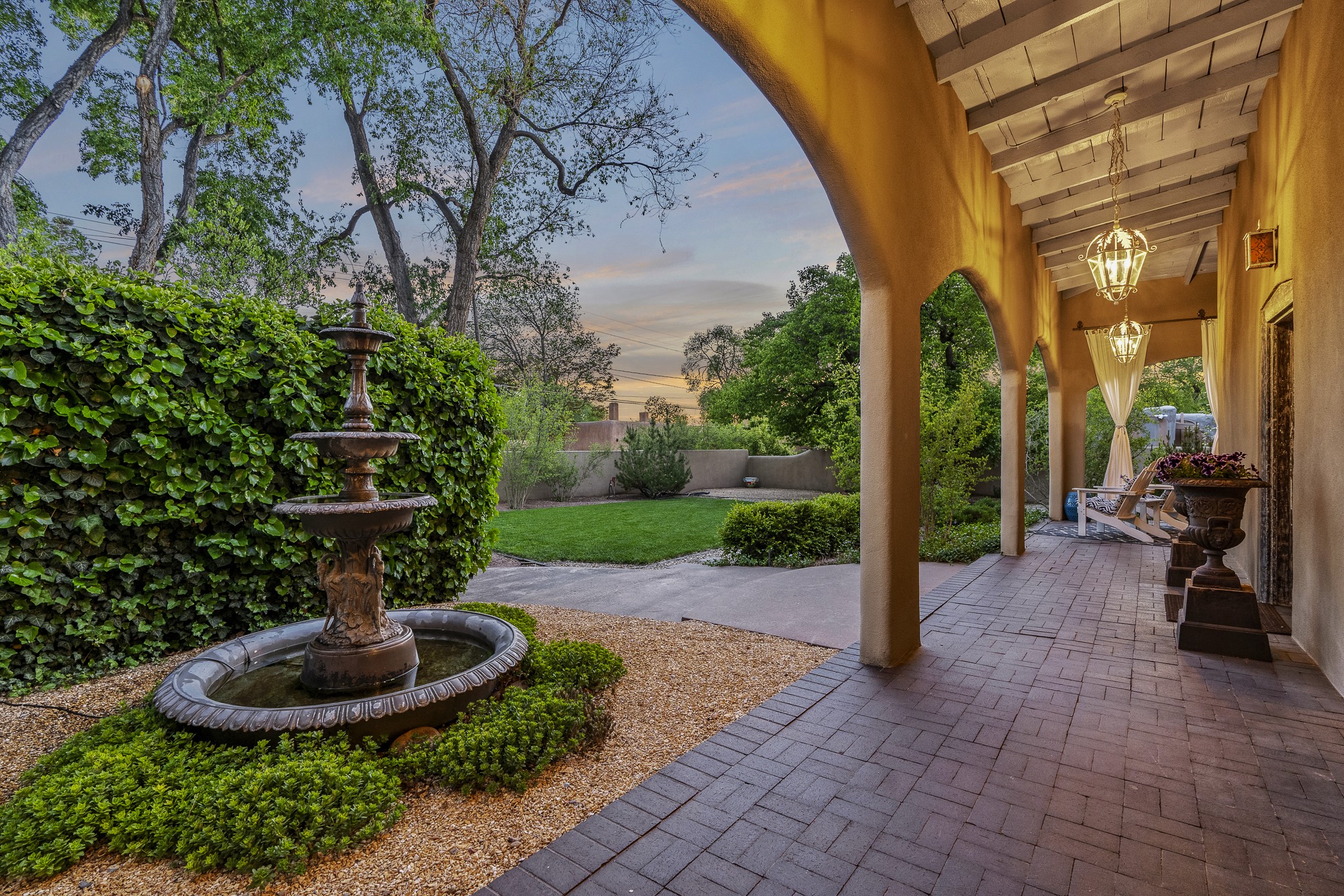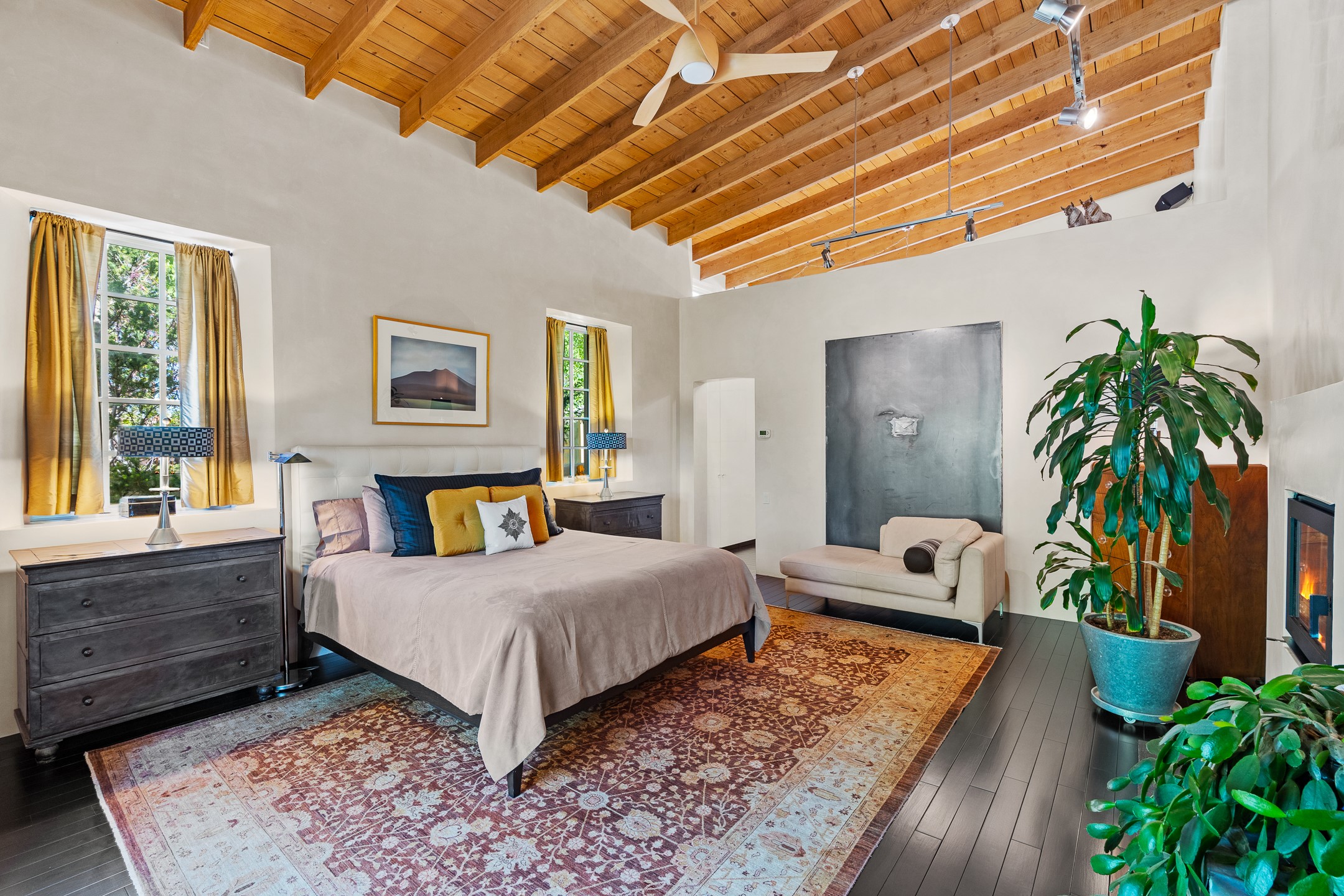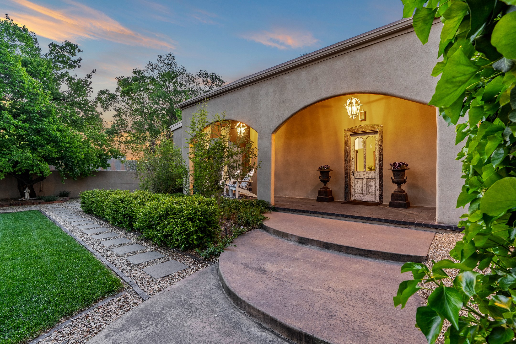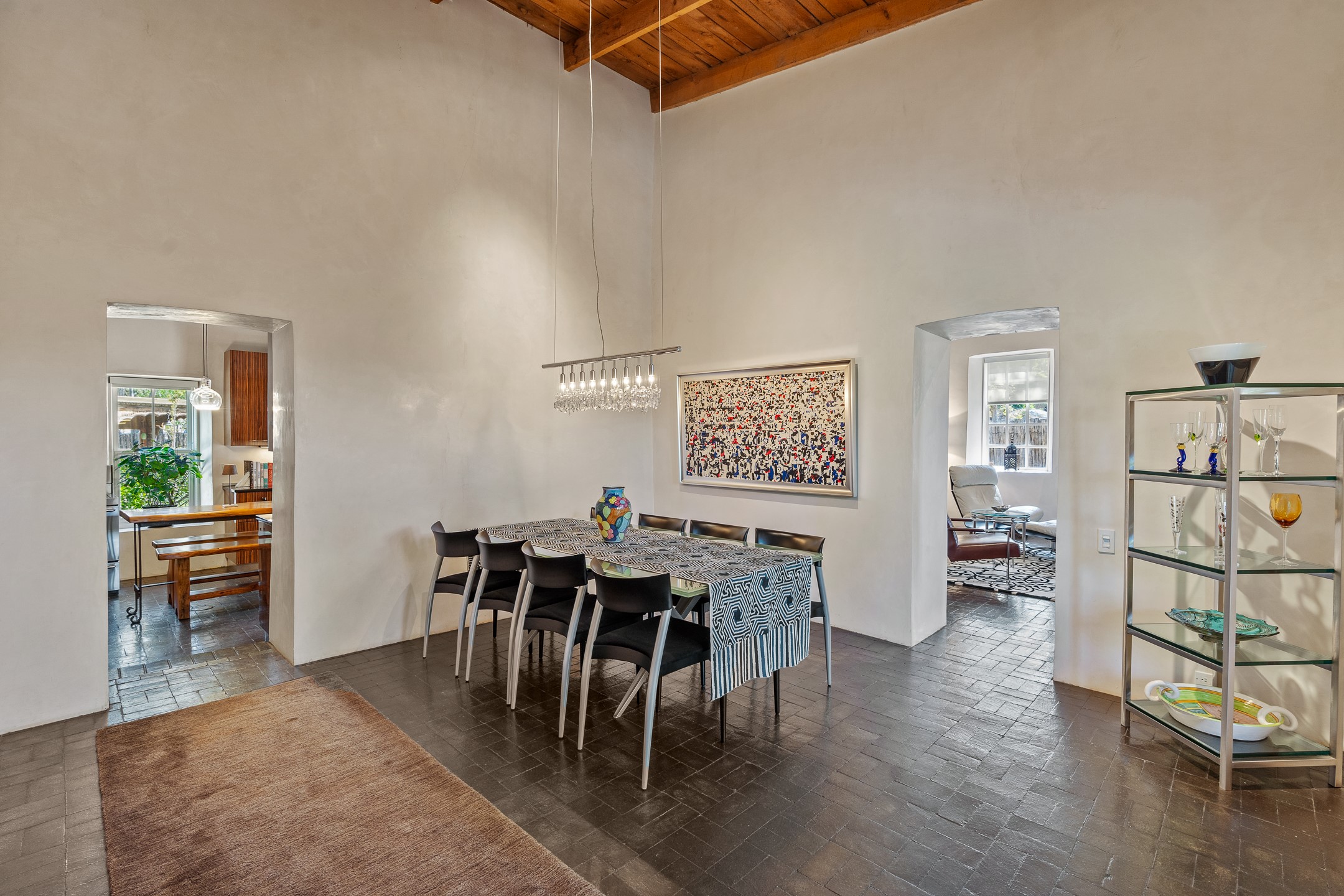 An Icon on East Palace Avenue - 519 East Palace. This historic estate blends the romance of Spanish Revival architecture with modern sophistication. Set on a beautifully landscaped third of an acre--with a lilac grove and mature trees--the property is recorded on the King's Official Map of Santa Fe and located just a short stroll to the Plaza, Canyon Road, galleries, and restaurants. A rare amenity in this location, the adobe estate offers parking for 8+ vehicles, ideal for hosting. The 2,500 sq. ft. main residence and 526 sq. ft. guest house form a serene, private compound. Inside, 15-foot exposed wood ceilings, polished brick floors, and massive adobe walls with diamond plaster create sculptural doorways and dramatic room volumes. The living room, with its soaring ceilings and wood-burning fireplace, balances architectural drama with quiet elegance. The kitchen is a striking surprise--modern KraftMaid Lustra Tygris Gloss cabinets with black granite counters bring sleek contrast to the adobe aesthetic. The primary suite, a seamless 2010 addition, offers views of the front courtyard, a contemporary fireplace, and open shed ceilings that fill the space with natural light. The one-bedroom guest house--thought to be the original pony barn--has been transformed into a charming retreat with a full bath and kitchenette. The enclosed backyard features a spacious 2-car carport, storage unit, and a hand-carved antique East Indian gazebo from Seret & Sons--a dramatic setting for evening gatherings. 519 East Palace is a true New Mexico treasure, where rich history, adobe elegance, and Santa Fe's timeless magic meet in perfect harmony.