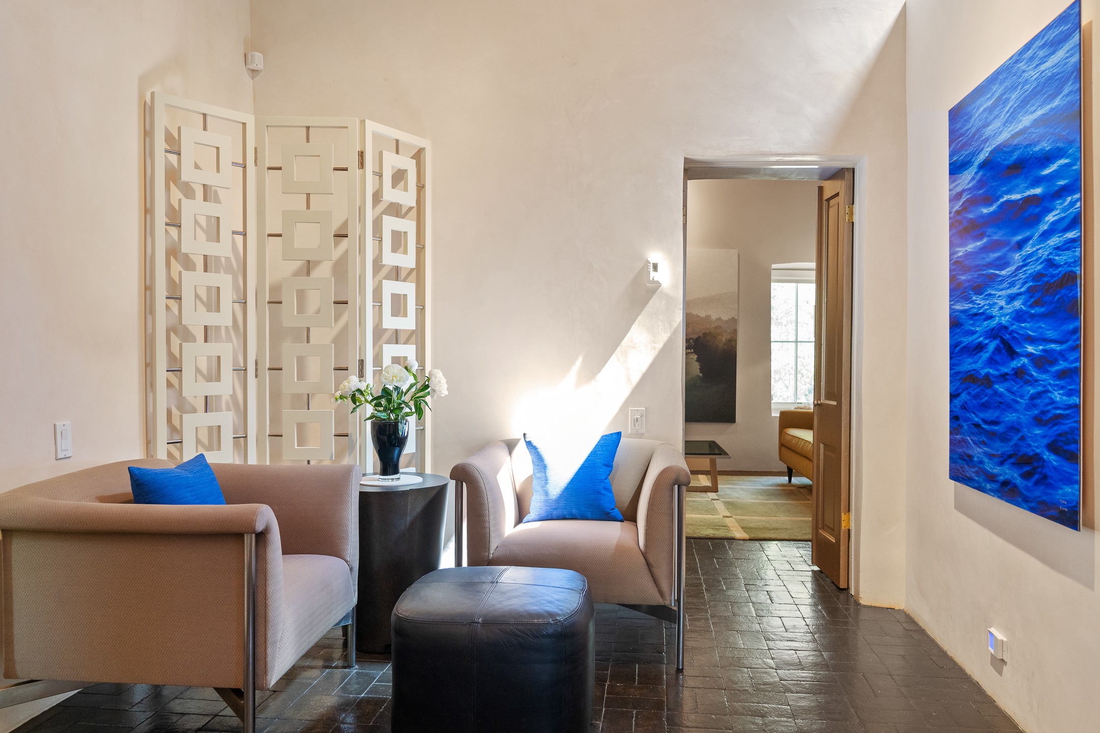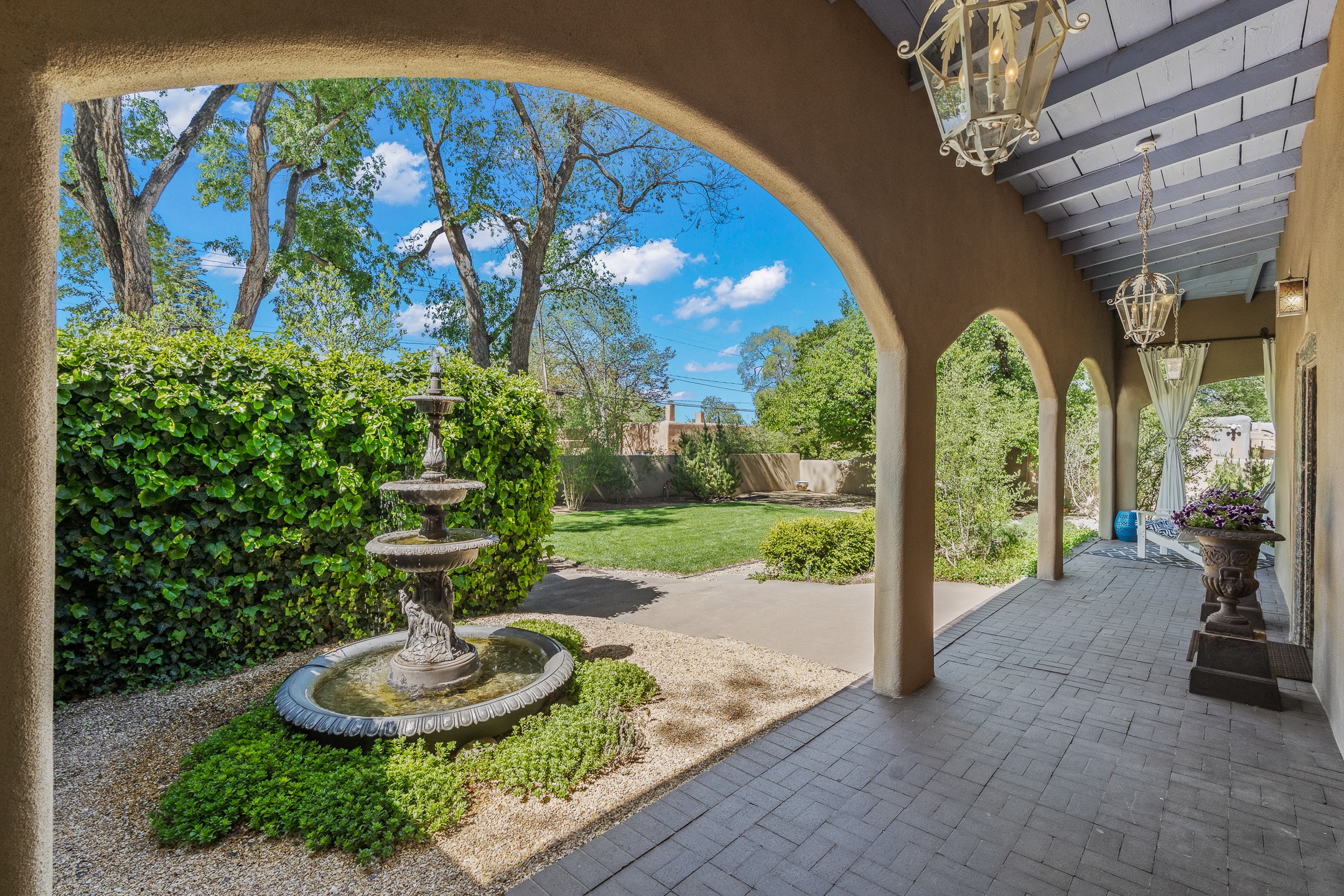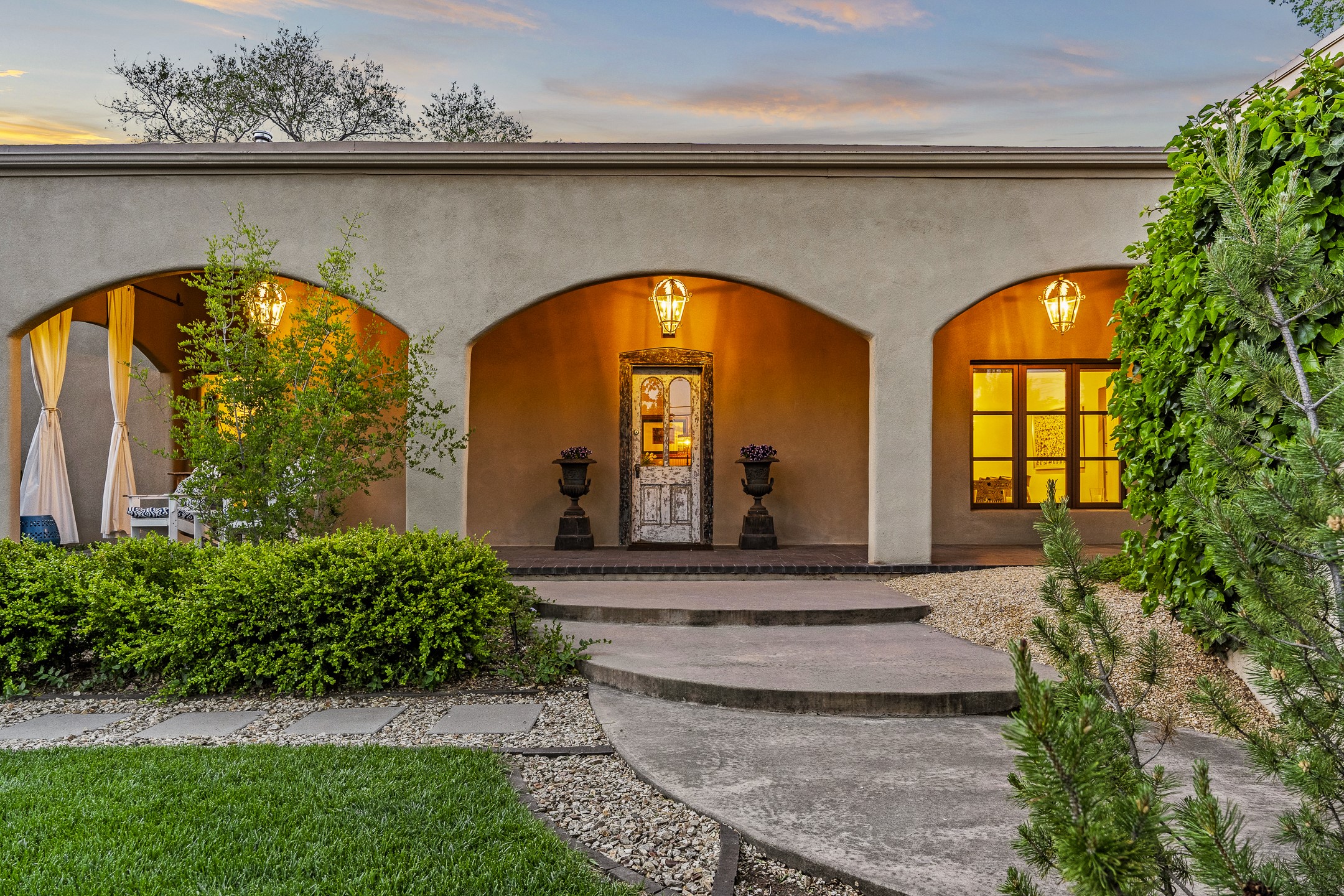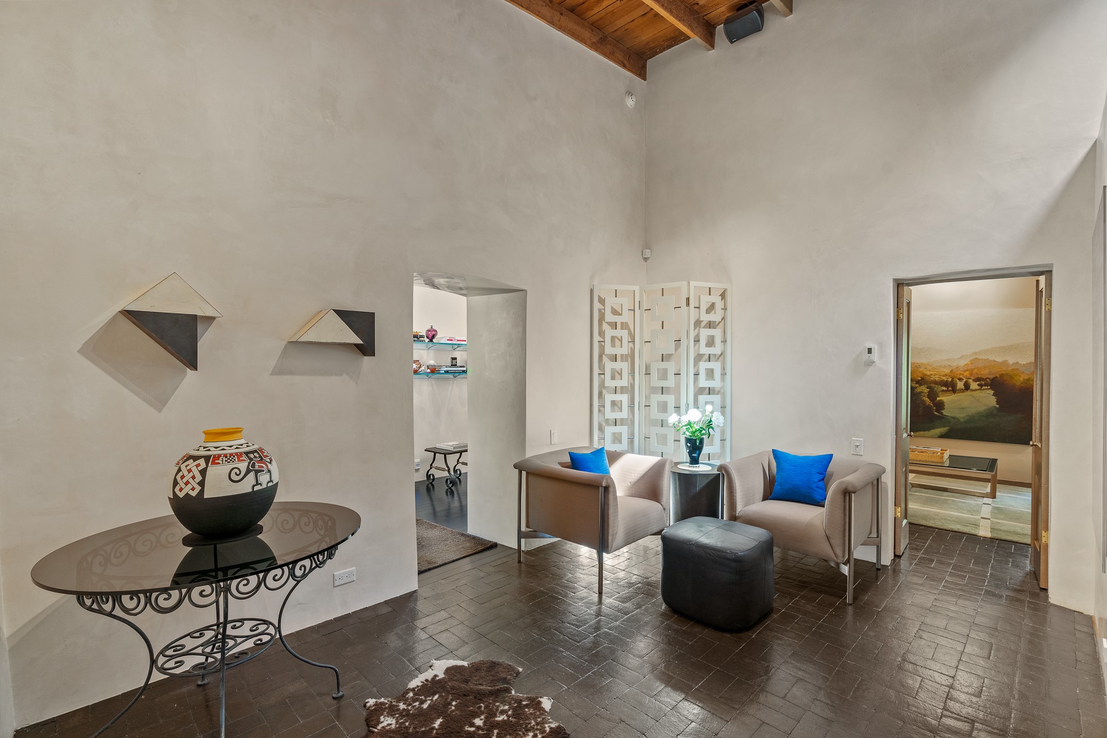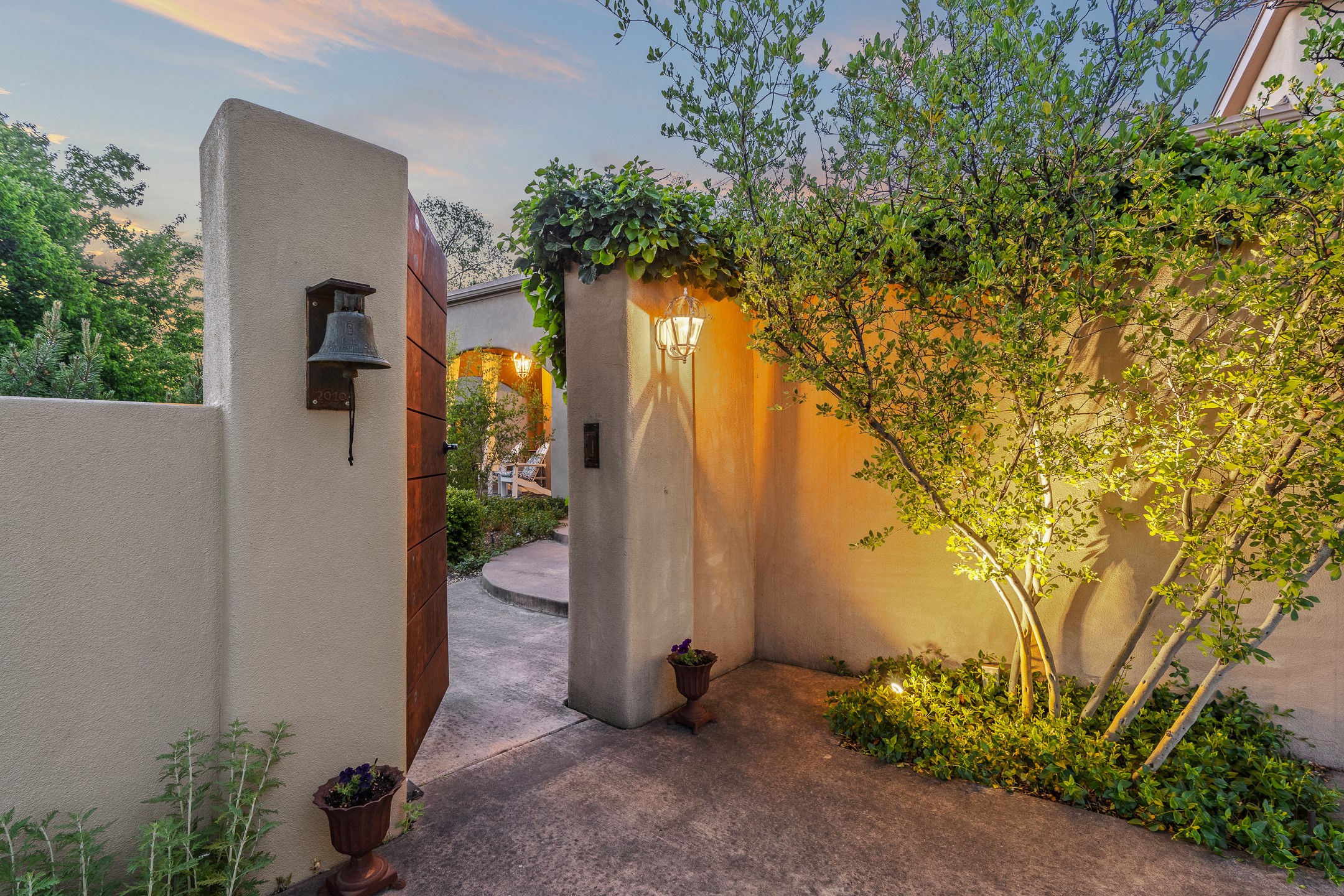 An Icon on East Palace Avenue - 519 East Palace. This historic estate blends the romance of Spanish Revival architecture with modern sophistication. Set on a beautifully landscaped third of an acre--with a lilac grove and mature trees--the property is recorded on the King's Official Map of Santa Fe and located just a short stroll to the Plaza, Canyon Road, galleries, and restaurants. A rare amenity in this location, the adobe estate offers parking for 8+ vehicles, ideal for hosting. The 2,500 sq. ft. main residence and 526 sq. ft. guest house form a serene, private compound. Inside, 15-foot exposed wood ceilings, polished brick floors, and massive adobe walls with diamond plaster create sculptural doorways and dramatic room volumes. The living room, with its soaring ceilings and wood-burning fireplace, balances architectural drama with quiet elegance. The kitchen is a striking surprise--modern KraftMaid Lustra Tygris Gloss cabinets with black granite counters bring sleek contrast to the adobe aesthetic. The primary suite, a seamless 2010 addition, offers views of the front courtyard, a contemporary fireplace, and open shed ceilings that fill the space with natural light. The one-bedroom guest house--thought to be the original pony barn--has been transformed into a charming retreat with a full bath and kitchenette. The enclosed backyard features a spacious 2-car carport, storage unit, and a hand-carved antique East Indian gazebo from Seret & Sons--a dramatic setting for evening gatherings. 519 East Palace is a true New Mexico treasure, where rich history, adobe elegance, and Santa Fe's timeless magic meet in perfect harmony.