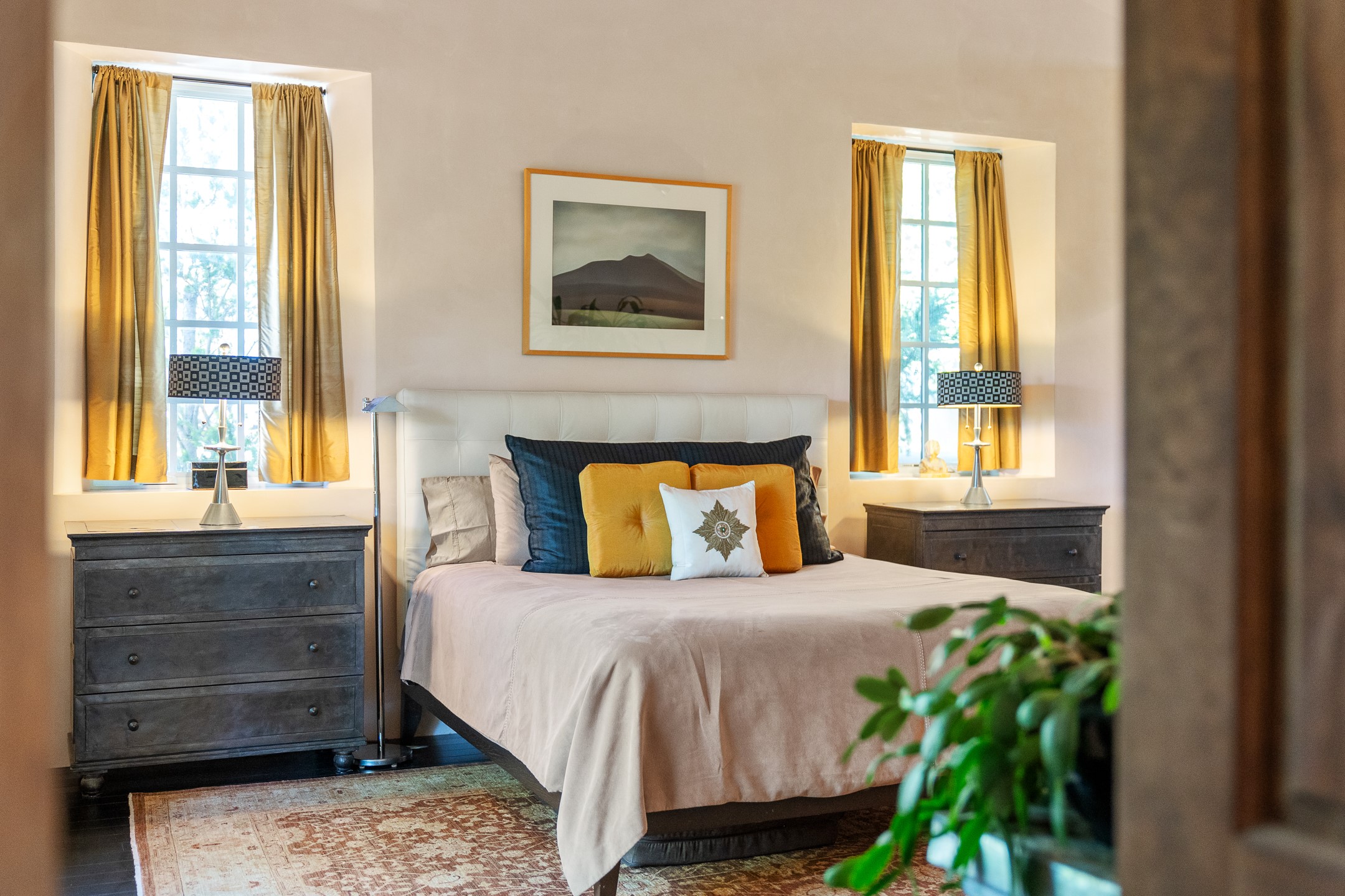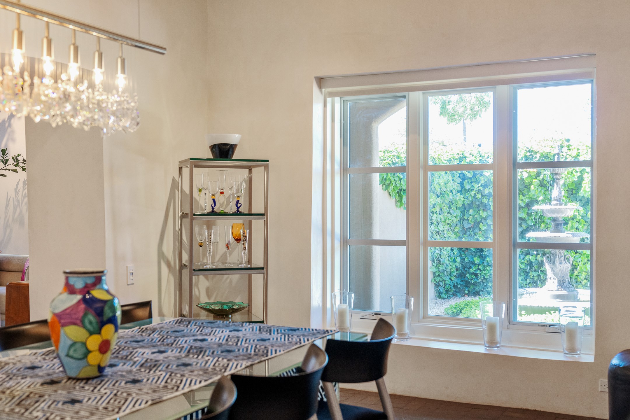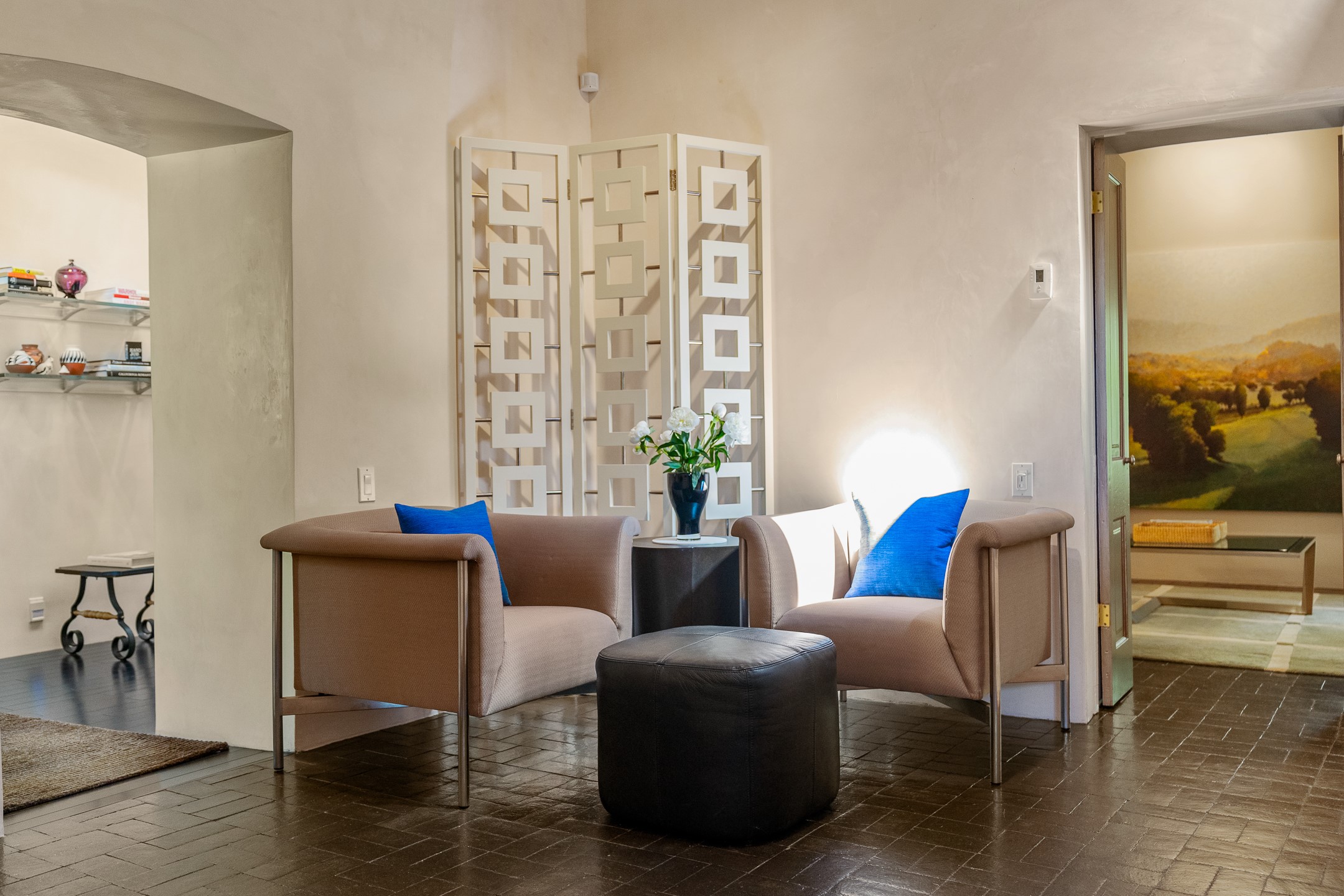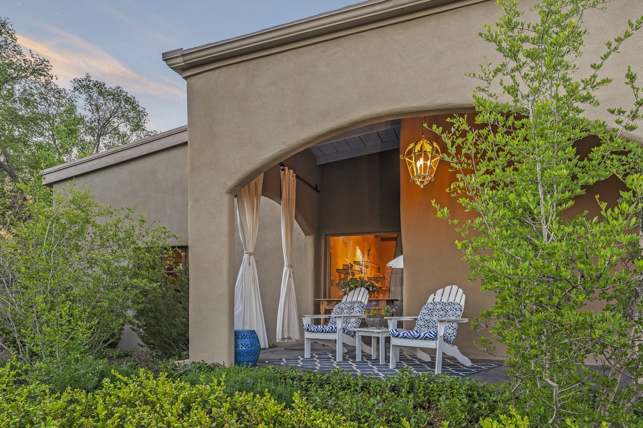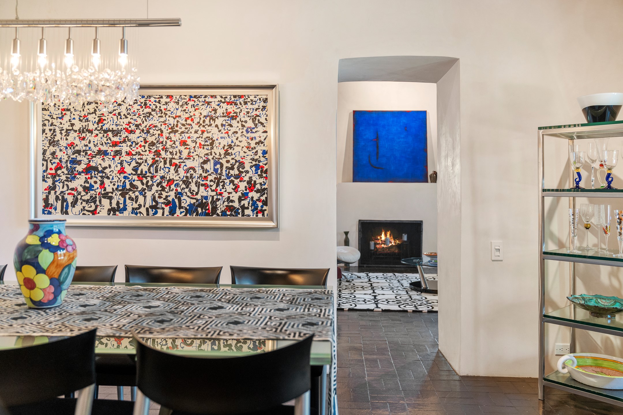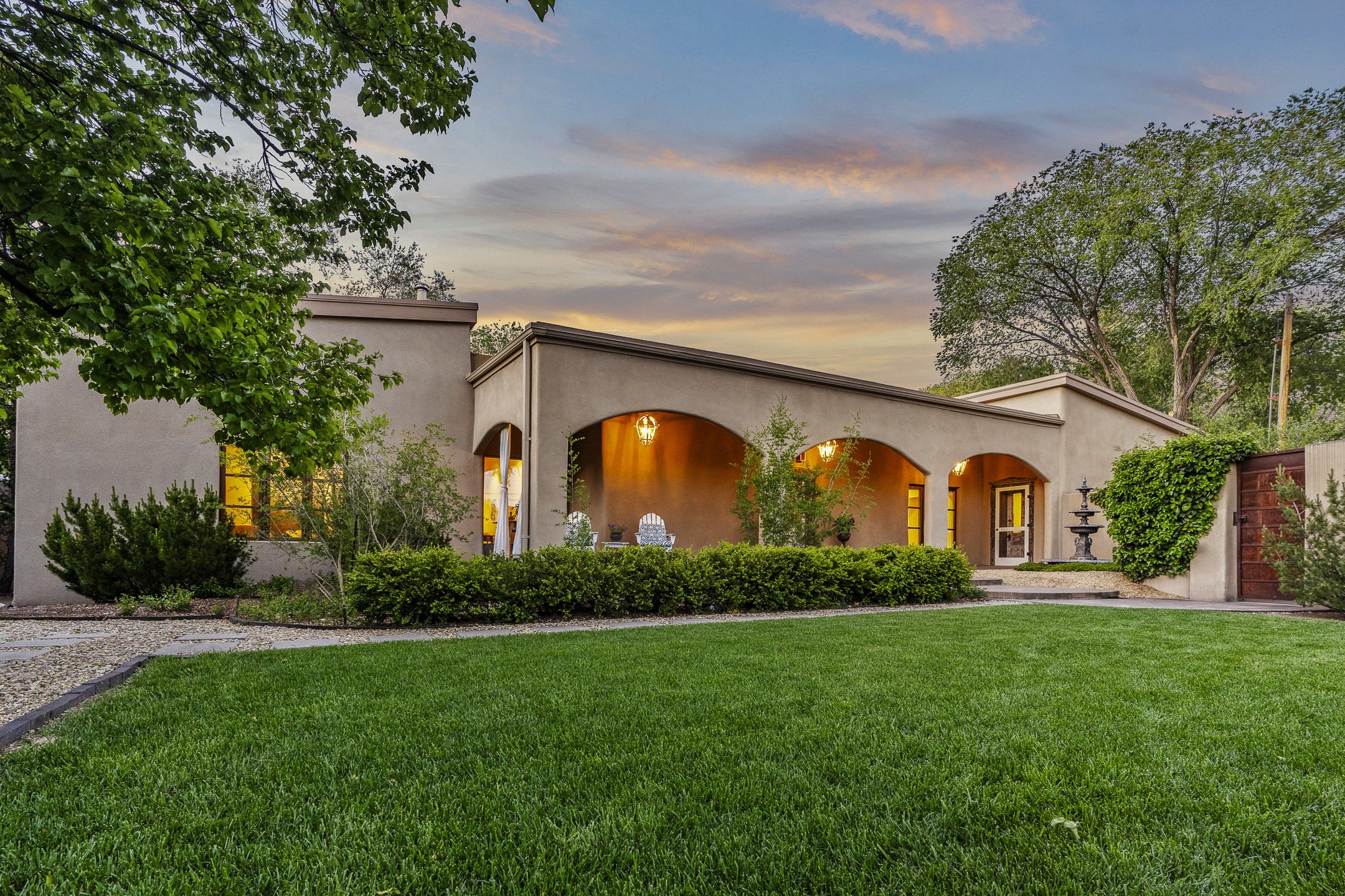 An Icon on East Palace Avenue - 519 East Palace. This historic estate blends the romance of Spanish Revival architecture with modern sophistication. Set on a beautifully landscaped third of an acre--with a lilac grove and mature trees--the property is recorded on the King's Official Map of Santa Fe and located just a short stroll to the Plaza, Canyon Road, galleries, and restaurants. A rare amenity in this location, the adobe estate offers parking for 8+ vehicles, ideal for hosting. The 2,500 sq. ft. main residence and 526 sq. ft. guest house form a serene, private compound. Inside, 15-foot exposed wood ceilings, polished brick floors, and massive adobe walls with diamond plaster create sculptural doorways and dramatic room volumes. The living room, with its soaring ceilings and wood-burning fireplace, balances architectural drama with quiet elegance. The kitchen is a striking surprise--modern KraftMaid Lustra Tygris Gloss cabinets with black granite counters bring sleek contrast to the adobe aesthetic. The primary suite, a seamless 2010 addition, offers views of the front courtyard, a contemporary fireplace, and open shed ceilings that fill the space with natural light. The one-bedroom guest house--thought to be the original pony barn--has been transformed into a charming retreat with a full bath and kitchenette. The enclosed backyard features a spacious 2-car carport, storage unit, and a hand-carved antique East Indian gazebo from Seret & Sons--a dramatic setting for evening gatherings. 519 East Palace is a true New Mexico treasure, where rich history, adobe elegance, and Santa Fe's timeless magic meet in perfect harmony.