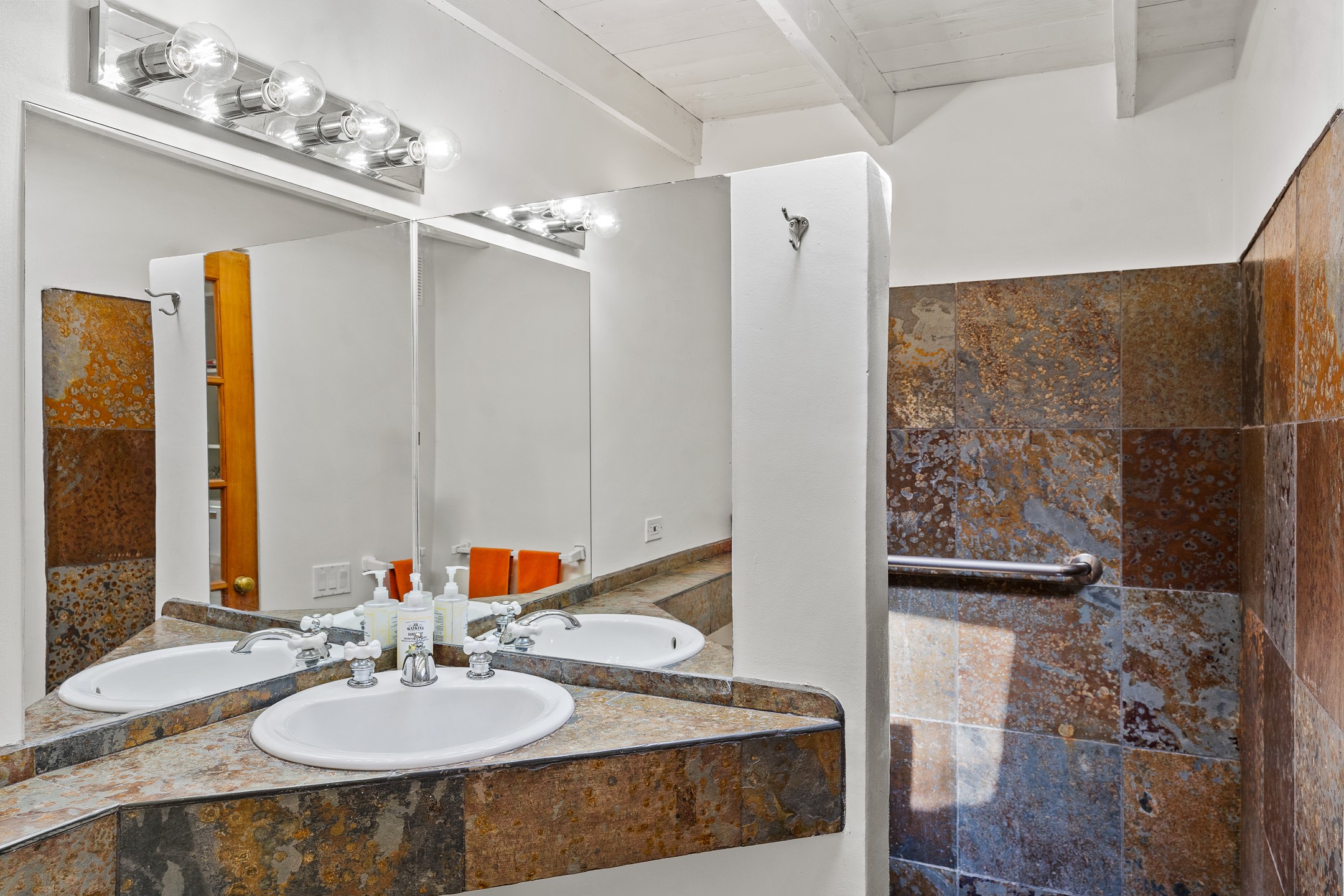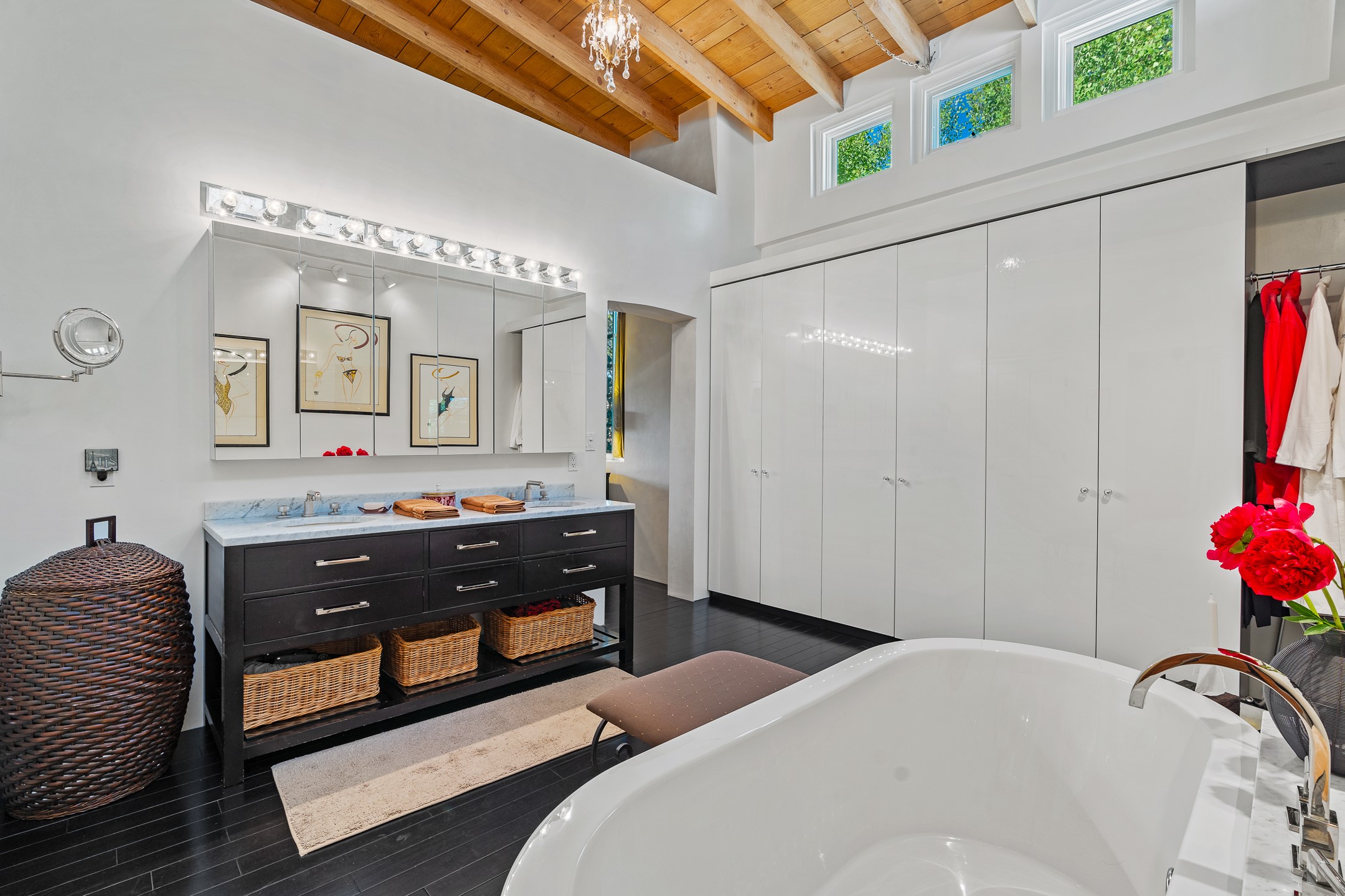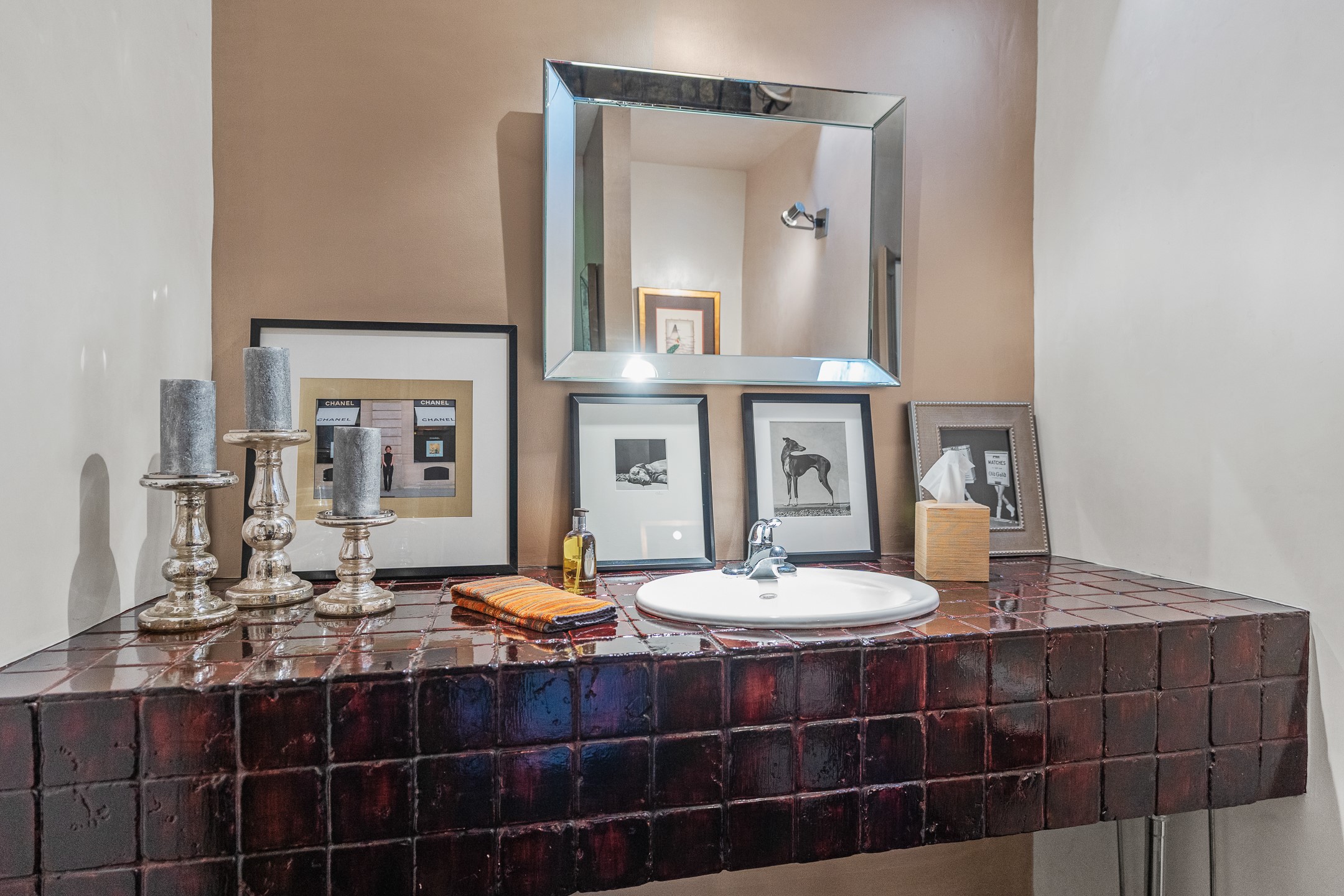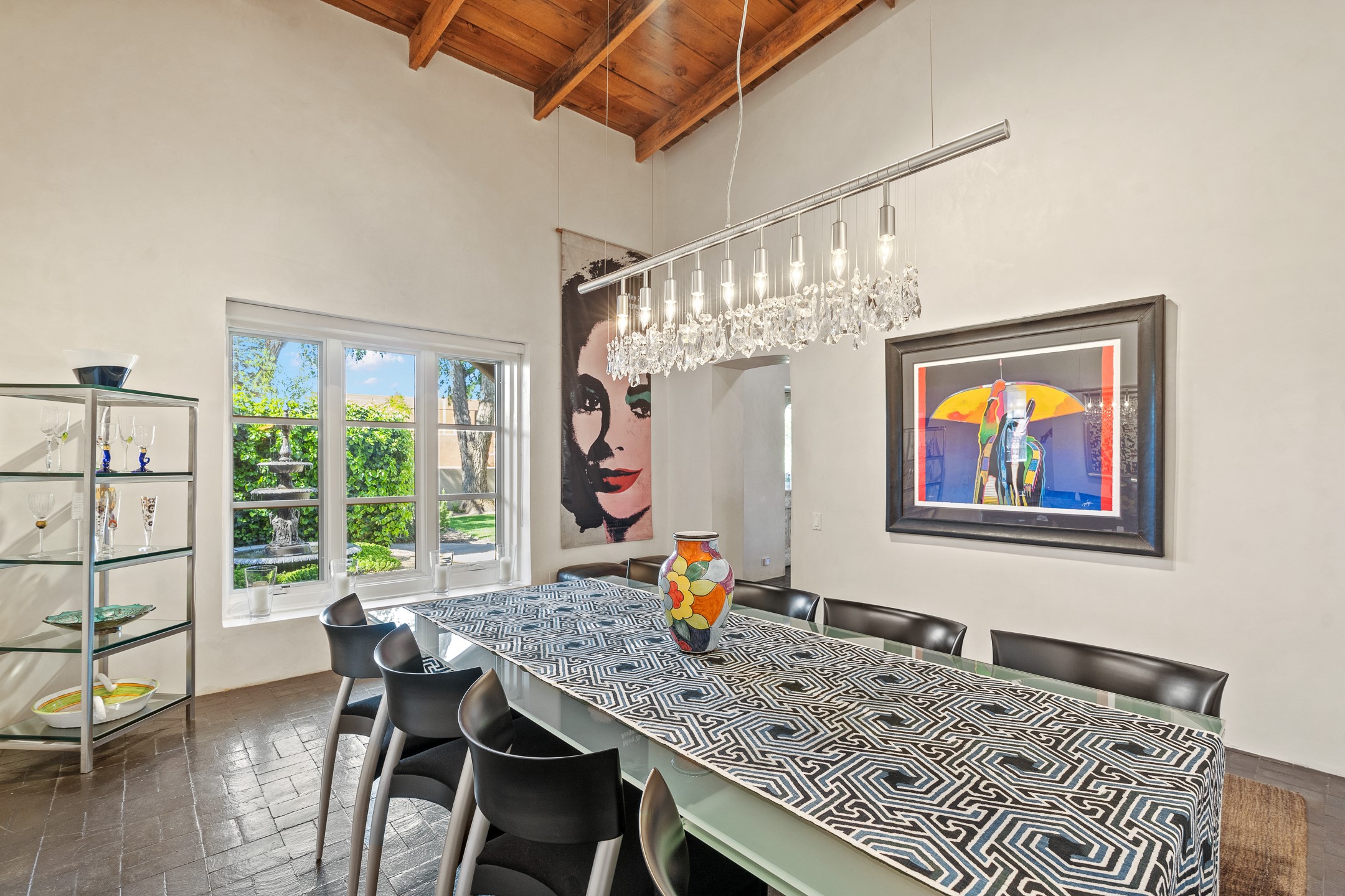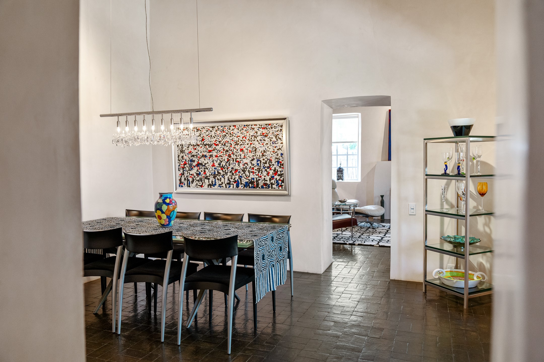 An Icon on East Palace Avenue - 519 East Palace. This historic estate blends the romance of Spanish Revival architecture with modern sophistication. Set on a beautifully landscaped third of an acre--with a lilac grove and mature trees--the property is recorded on the King's Official Map of Santa Fe and located just a short stroll to the Plaza, Canyon Road, galleries, and restaurants. A rare amenity in this location, the adobe estate offers parking for 8+ vehicles, ideal for hosting. The 2,500 sq. ft. main residence and 526 sq. ft. guest house form a serene, private compound. Inside, 15-foot exposed wood ceilings, polished brick floors, and massive adobe walls with diamond plaster create sculptural doorways and dramatic room volumes. The living room, with its soaring ceilings and wood-burning fireplace, balances architectural drama with quiet elegance. The kitchen is a striking surprise--modern KraftMaid Lustra Tygris Gloss cabinets with black granite counters bring sleek contrast to the adobe aesthetic. The primary suite, a seamless 2010 addition, offers views of the front courtyard, a contemporary fireplace, and open shed ceilings that fill the space with natural light. The one-bedroom guest house--thought to be the original pony barn--has been transformed into a charming retreat with a full bath and kitchenette. The enclosed backyard features a spacious 2-car carport, storage unit, and a hand-carved antique East Indian gazebo from Seret & Sons--a dramatic setting for evening gatherings. 519 East Palace is a true New Mexico treasure, where rich history, adobe elegance, and Santa Fe's timeless magic meet in perfect harmony.