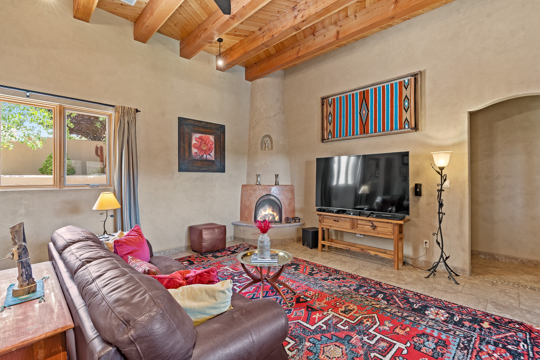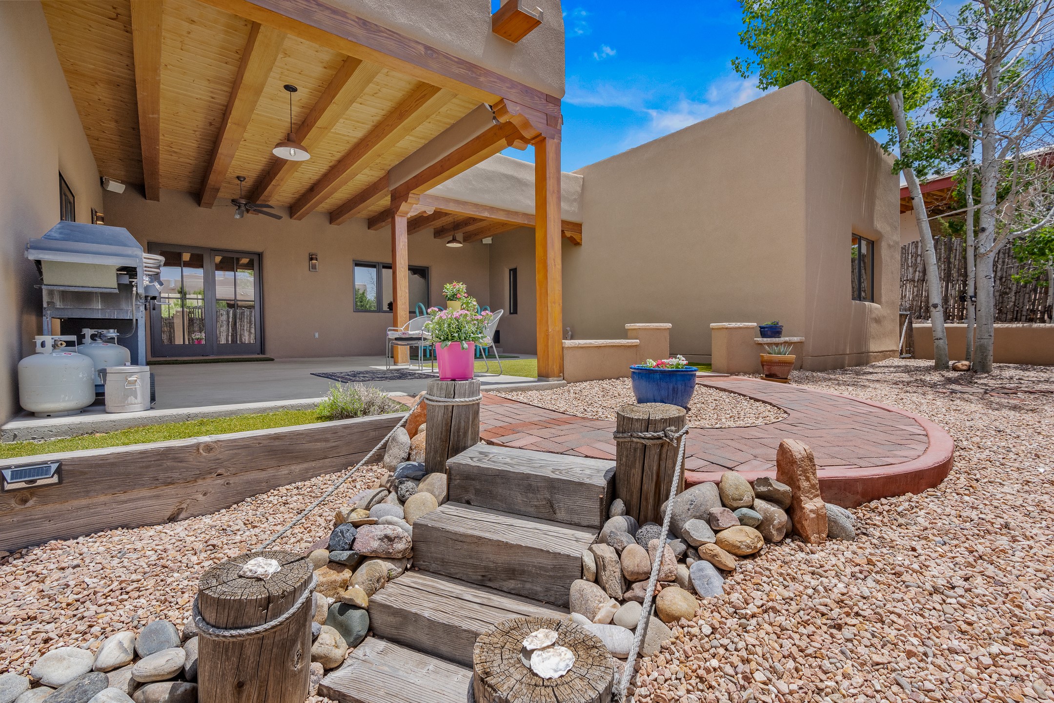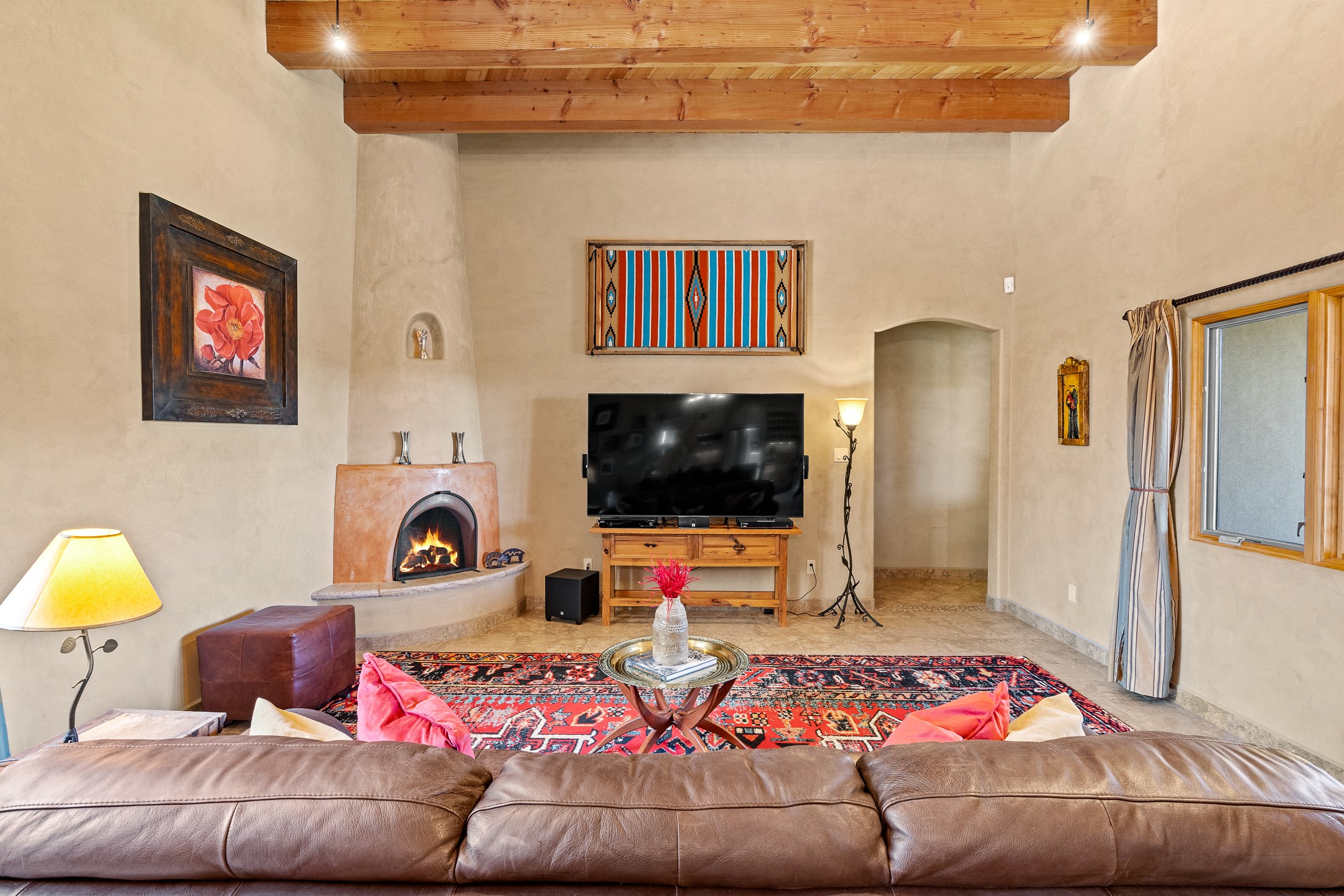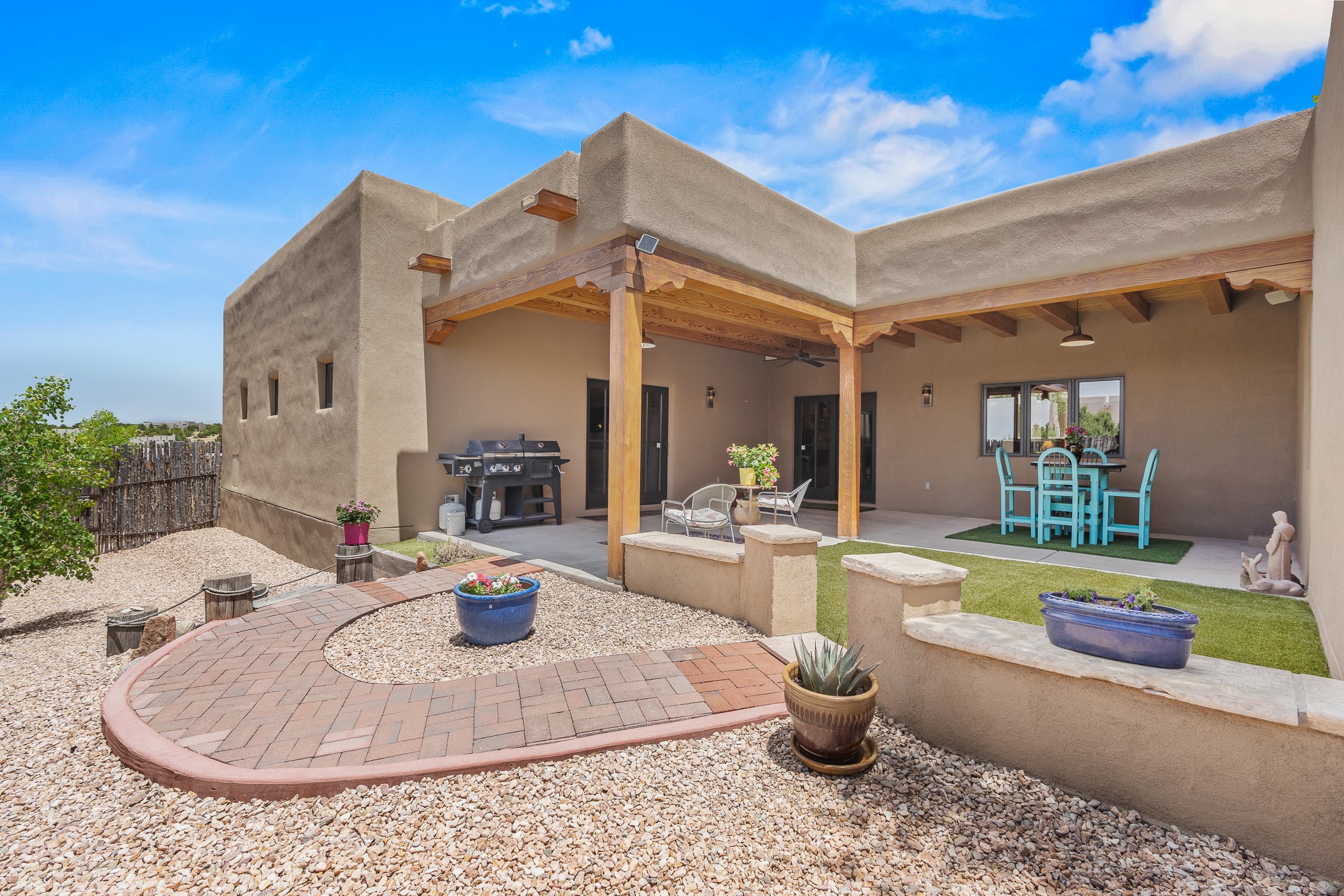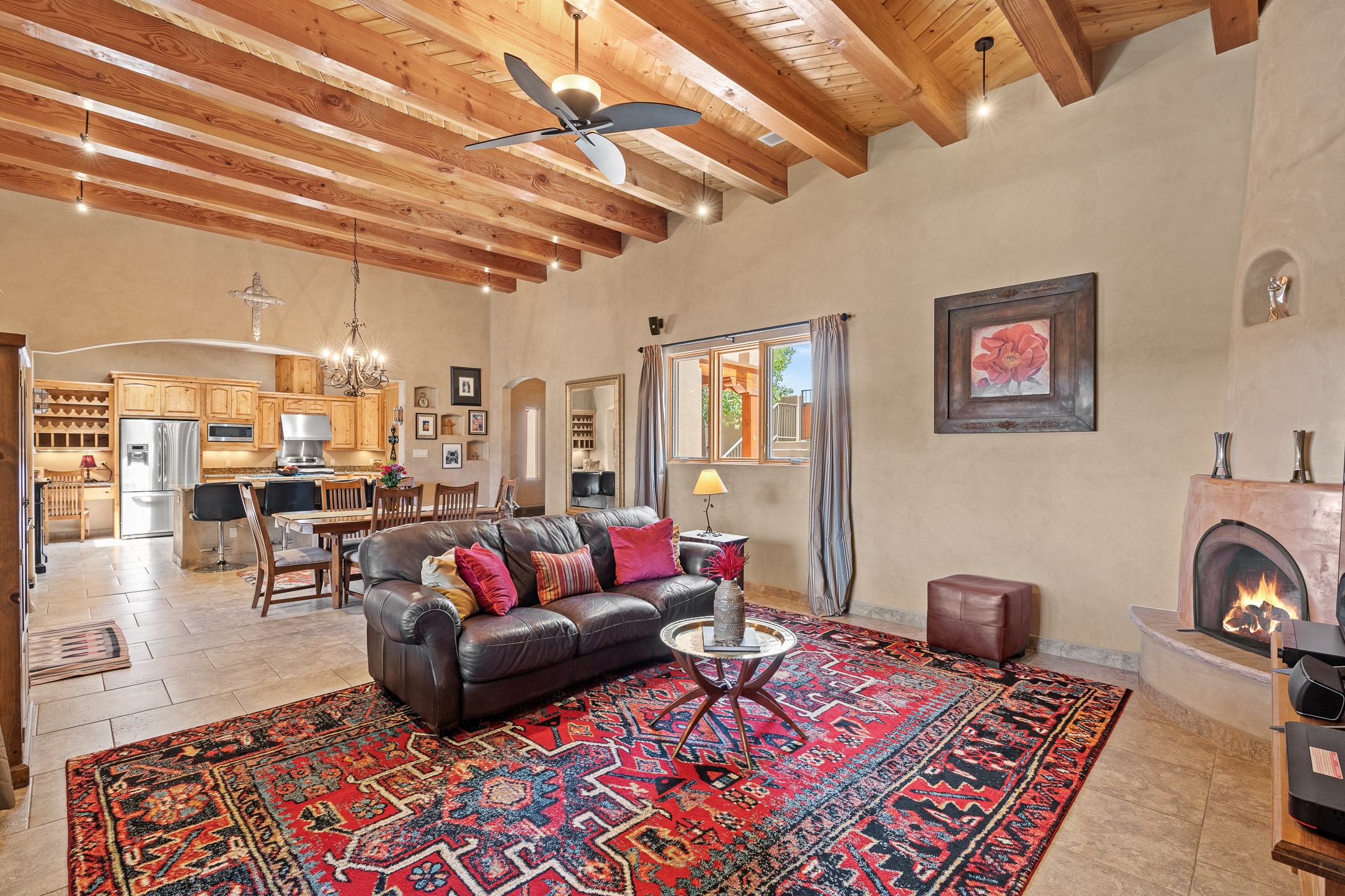 Southwest Elegance at 21 Camino BarrancaDiscover timeless Santa Fe style in this custom-built 3-bedroom, 2-bath 2 car garage, home located in the highly sought-after Aldea de Santa Fe community. Impeccably maintained and offering 2,129 square feet of thoughtfully designed living space, this home seamlessly blends authentic Southwestern charm with modern comfort.Inside, you'll find exposed wood beams, hand-troweled plaster walls, and a mix of rich wood and tile flooring, creating a warm, inviting atmosphere. A traditional kiva fireplace anchors the living room, perfect for cozy evenings, while large windows bathe the home in natural light and frame views of the lush, landscaped surroundings.The open-concept kitchen and living areas are ideal for both everyday living and entertaining. Outdoors, enjoy the tranquility of mature landscaping, raised garden beds, and peaceful patio areas--perfect for al fresco dining or quiet reflection. The yard is completely fenced or walled for your furry friends. New stucco in 2023, water heater replaced in 2018, microwave in 2021. New Gaco roof with 10-yr warranty. There is radiant in floor heat (No Kitec :)forced air and AC. the driveway is finished nicely with pavers. Set in a quiet, well-established neighborhood with access to walking trails and community amenities. Aldea is an active new-urbanist community that offers 13 miles of walking trails, Numerous parks and shared open spaces, basketball, tennis and pickleball courts and a playground and community center for special events.This home offers the best of Santa Fe living--comfort, character, and connection to nature. A truly special home, ready to welcome you.