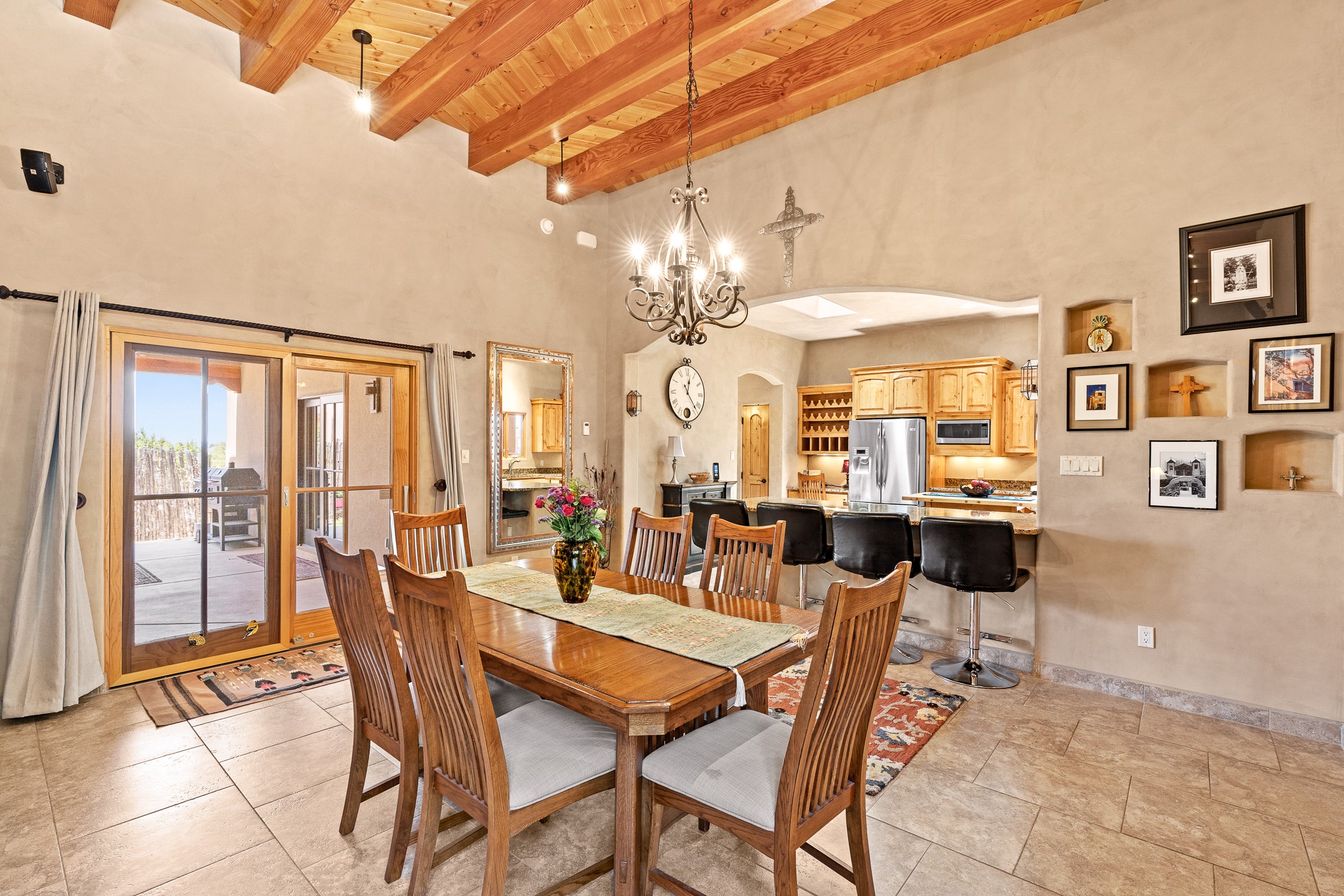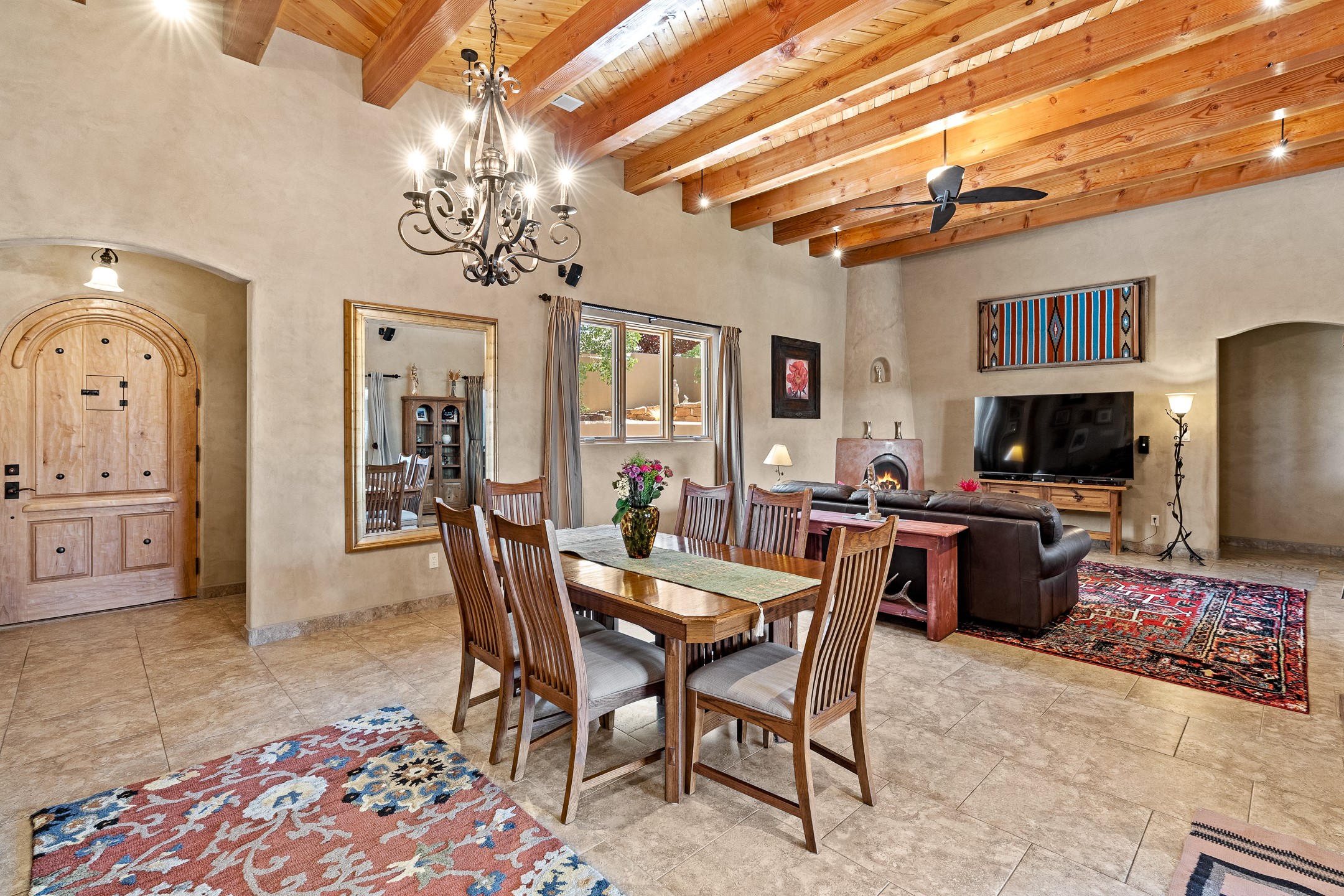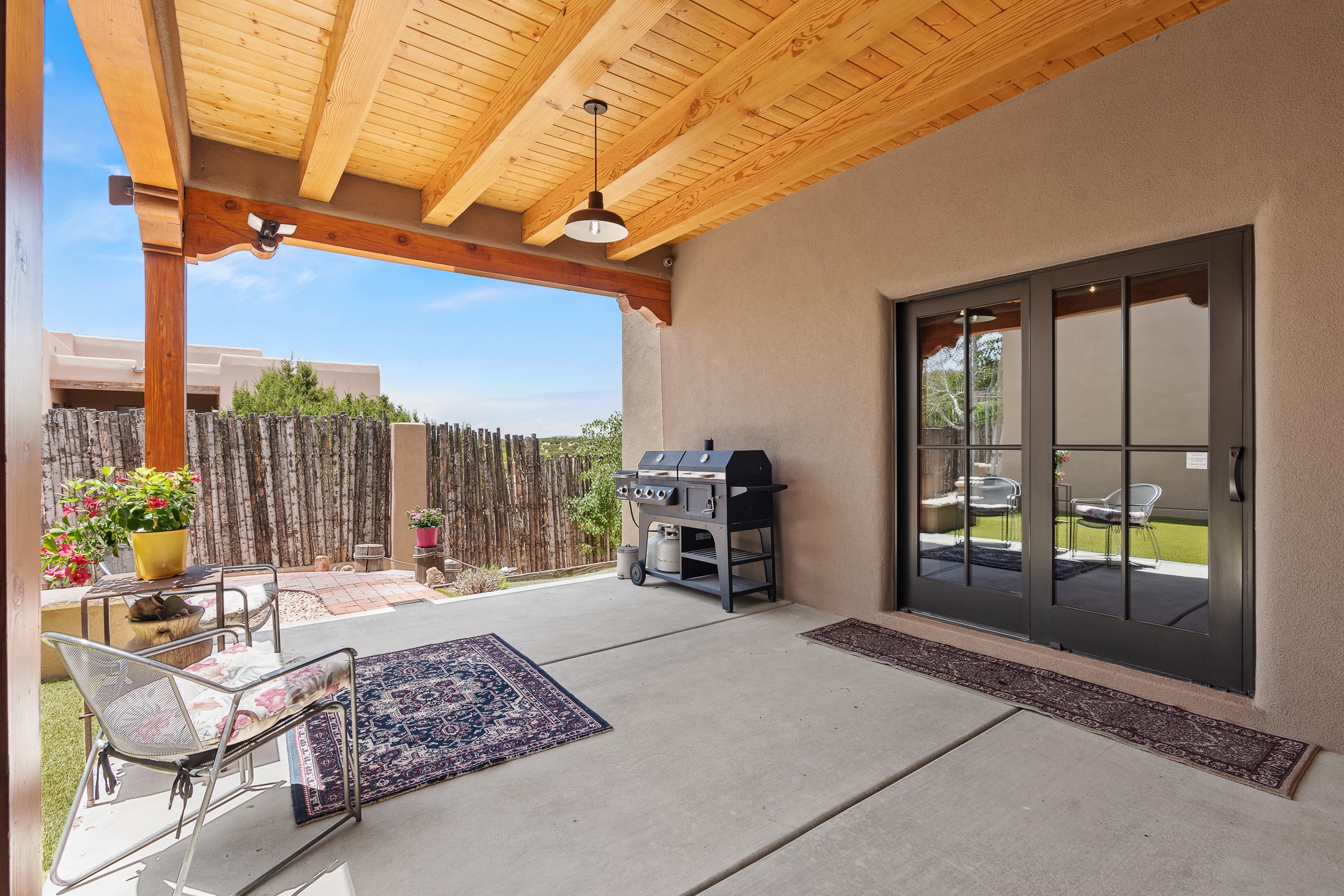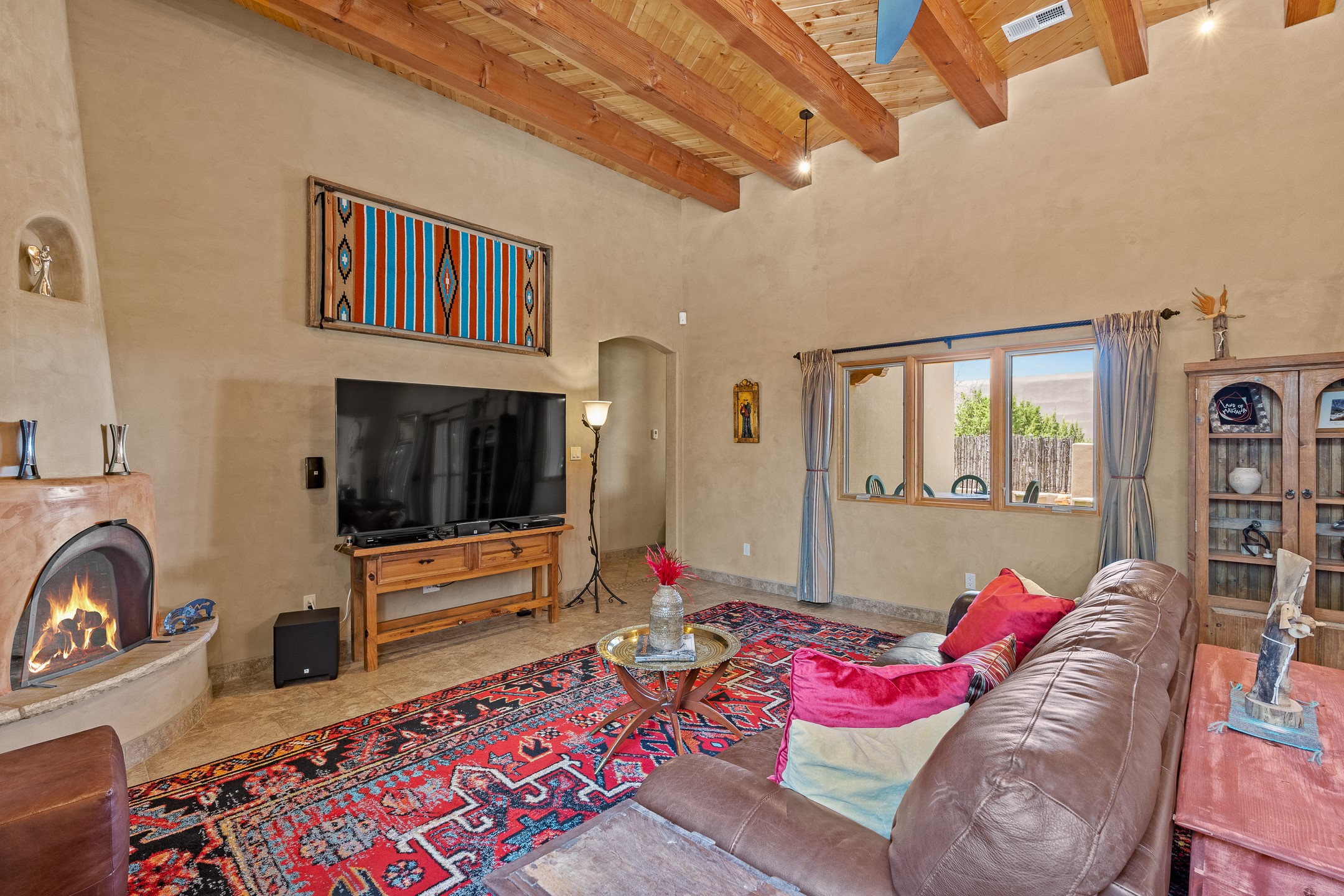 Southwest Elegance at 21 Camino BarrancaDiscover timeless Santa Fe style in this custom-built 3-bedroom, 2-bath 2 car garage, home located in the highly sought-after Aldea de Santa Fe community. Impeccably maintained and offering 2,129 square feet of thoughtfully designed living space, this home seamlessly blends authentic Southwestern charm with modern comfort.Inside, you'll find exposed wood beams, hand-troweled plaster walls, and a mix of rich wood and tile flooring, creating a warm, inviting atmosphere. A traditional kiva fireplace anchors the living room, perfect for cozy evenings, while large windows bathe the home in natural light and frame views of the lush, landscaped surroundings.The open-concept kitchen and living areas are ideal for both everyday living and entertaining. Outdoors, enjoy the tranquility of mature landscaping, raised garden beds, and peaceful patio areas--perfect for al fresco dining or quiet reflection. The yard is completely fenced or walled for your furry friends. New stucco in 2023, water heater replaced in 2018, microwave in 2021. New Gaco roof with 10-yr warranty. There is radiant in floor heat (No Kitec :)forced air and AC. the driveway is finished nicely with pavers. Set in a quiet, well-established neighborhood with access to walking trails and community amenities. Aldea is an active new-urbanist community that offers 13 miles of walking trails, Numerous parks and shared open spaces, basketball, tennis and pickleball courts and a playground and community center for special events.This home offers the best of Santa Fe living--comfort, character, and connection to nature. A truly special home, ready to welcome you.