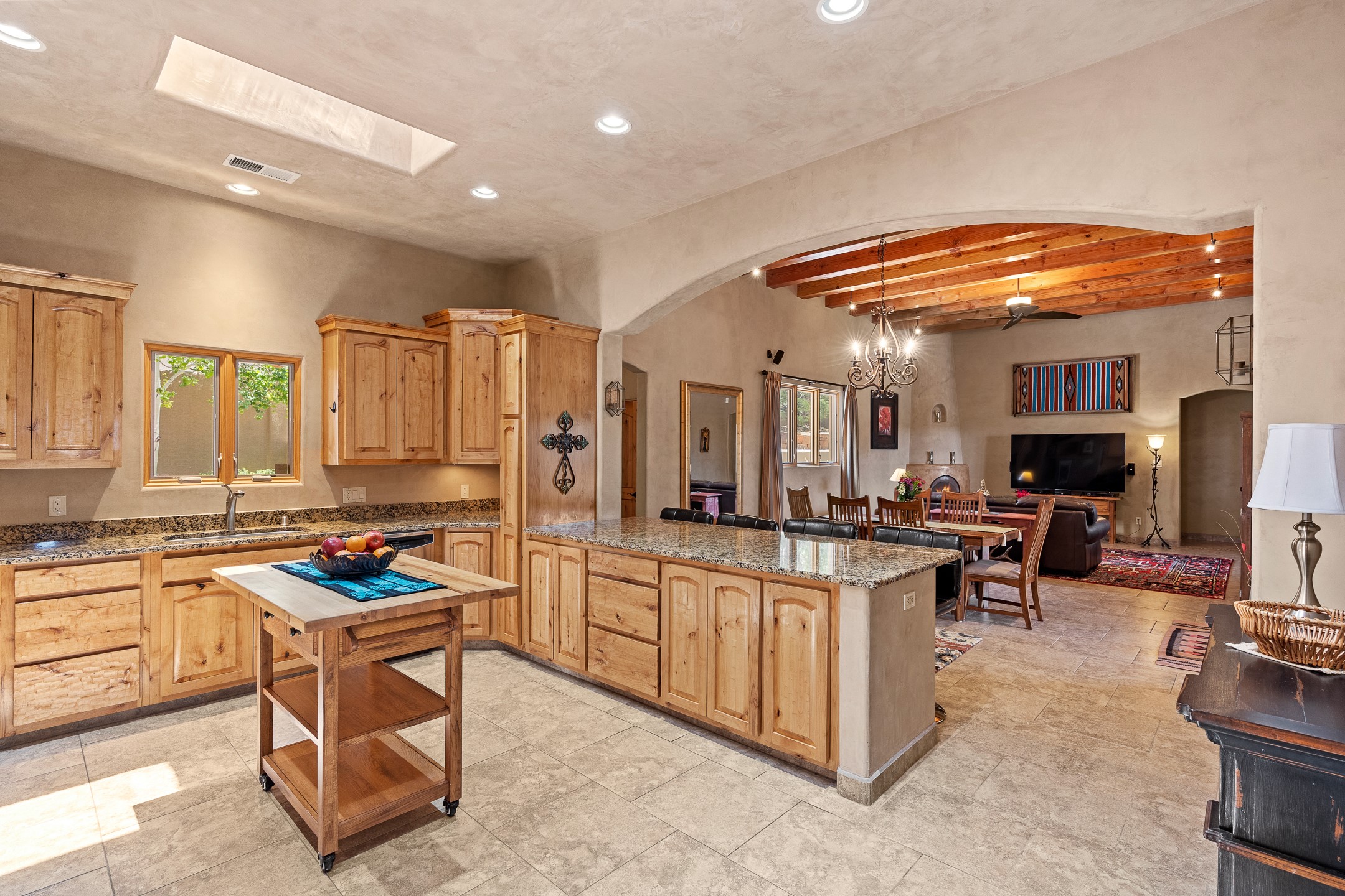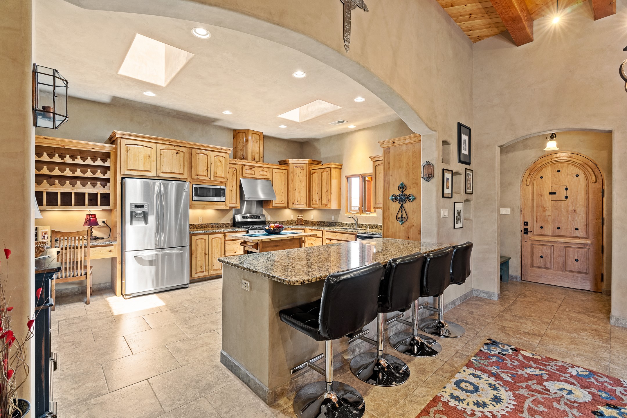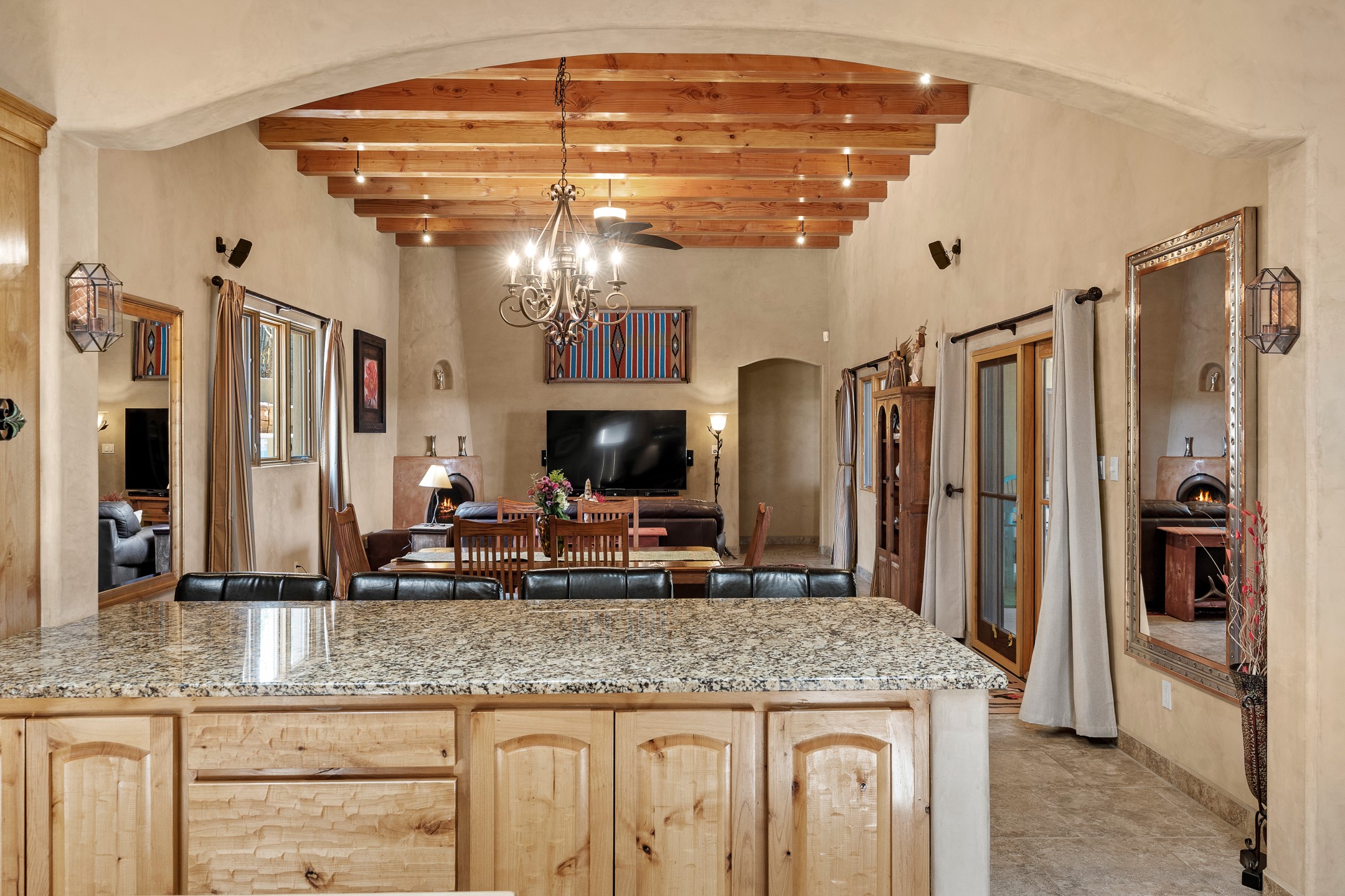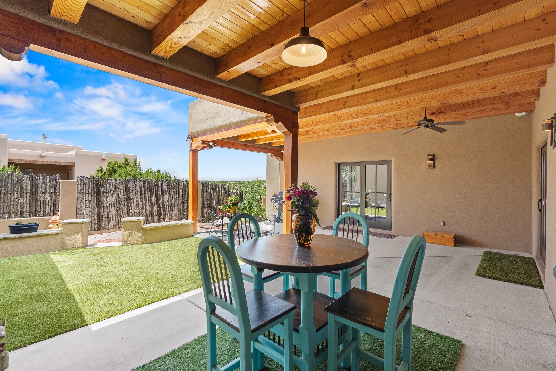 Southwest Elegance at 21 Camino BarrancaDiscover timeless Santa Fe style in this custom-built 3-bedroom, 2-bath 2 car garage, home located in the highly sought-after Aldea de Santa Fe community. Impeccably maintained and offering 2,129 square feet of thoughtfully designed living space, this home seamlessly blends authentic Southwestern charm with modern comfort.Inside, you'll find exposed wood beams, hand-troweled plaster walls, and a mix of rich wood and tile flooring, creating a warm, inviting atmosphere. A traditional kiva fireplace anchors the living room, perfect for cozy evenings, while large windows bathe the home in natural light and frame views of the lush, landscaped surroundings.The open-concept kitchen and living areas are ideal for both everyday living and entertaining. Outdoors, enjoy the tranquility of mature landscaping, raised garden beds, and peaceful patio areas--perfect for al fresco dining or quiet reflection. The yard is completely fenced or walled for your furry friends. New stucco in 2023, water heater replaced in 2018, microwave in 2021. New Gaco roof with 10-yr warranty. There is radiant in floor heat (No Kitec :)forced air and AC. the driveway is finished nicely with pavers. Set in a quiet, well-established neighborhood with access to walking trails and community amenities. Aldea is an active new-urbanist community that offers 13 miles of walking trails, Numerous parks and shared open spaces, basketball, tennis and pickleball courts and a playground and community center for special events.This home offers the best of Santa Fe living--comfort, character, and connection to nature. A truly special home, ready to welcome you.