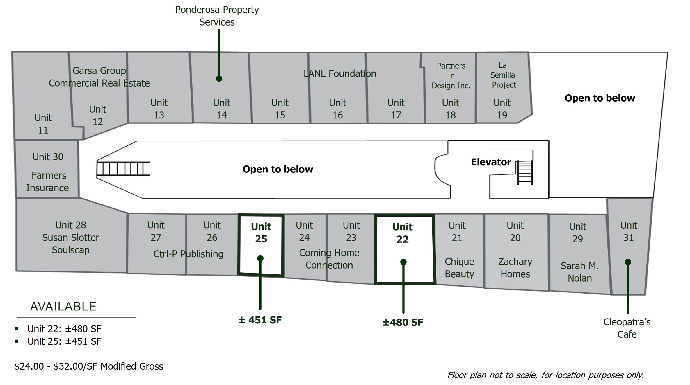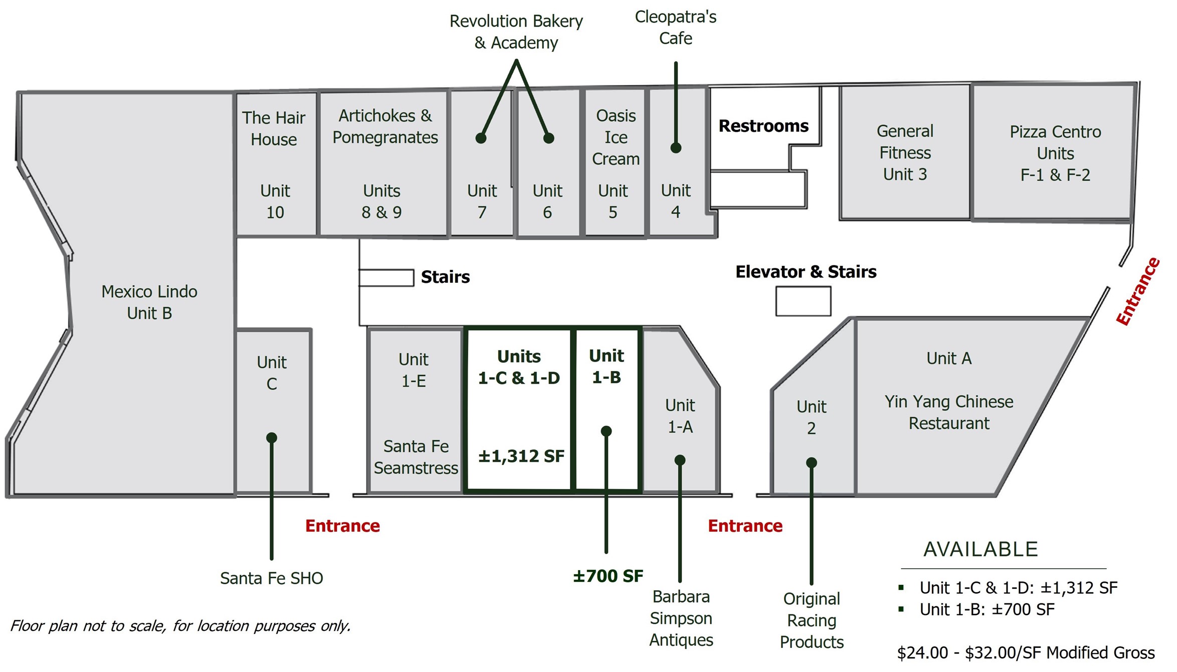 AVAILABLE: Lower Level (Retail): Unit 1-C & 1-D: 1,312 SF, Unit 1-B: 700 SF, Upper Level (office/studio): Unit 22: 480 SF, Unit 25: 451 SF | ZONING: BCD, Business Capital District | HIGHLIGHTS: Open and airy mall design, Just steps away from the District Court House, Close to the Railyard District, Downtown Santa Fe and state buildings, Co tenants include: Mexico Lindo, Pizza Centro, Yin Yang Restaurant, Paleteria Oasis, Revolution Bakery, Antique Shops, Professional Offices