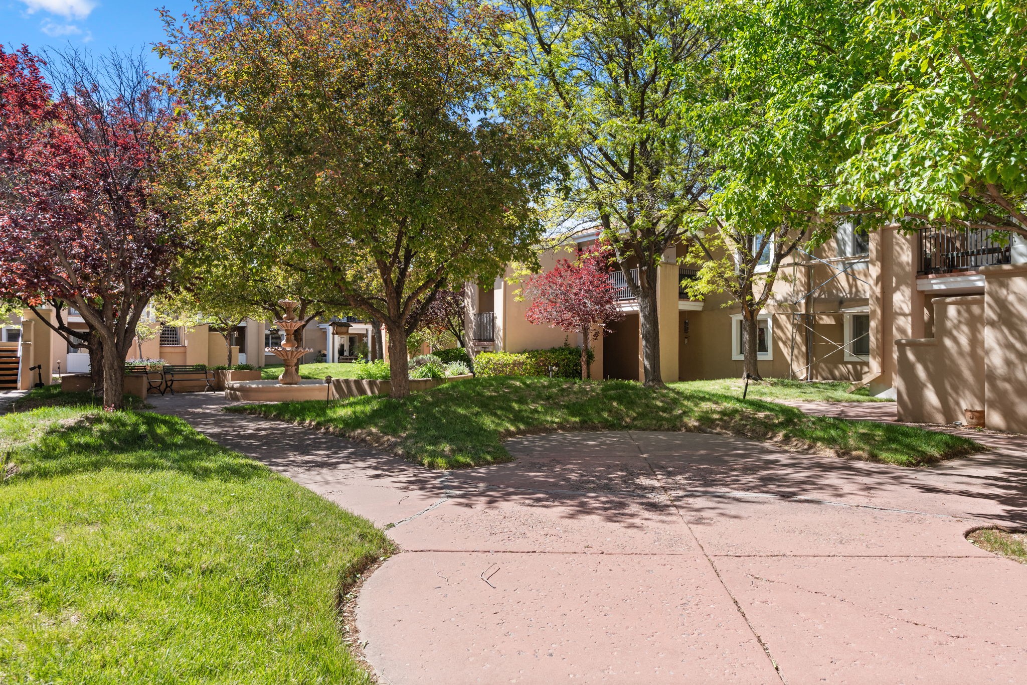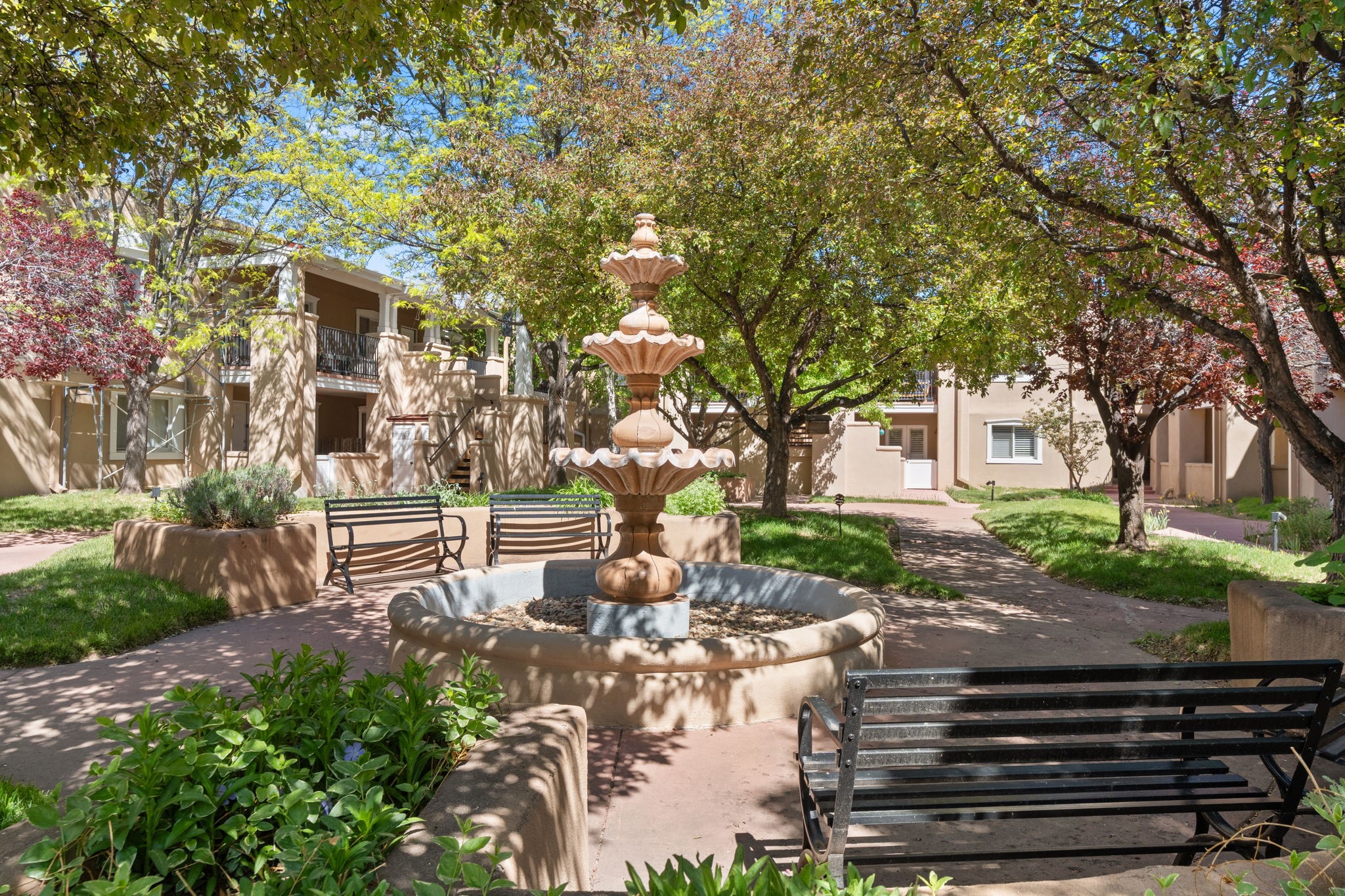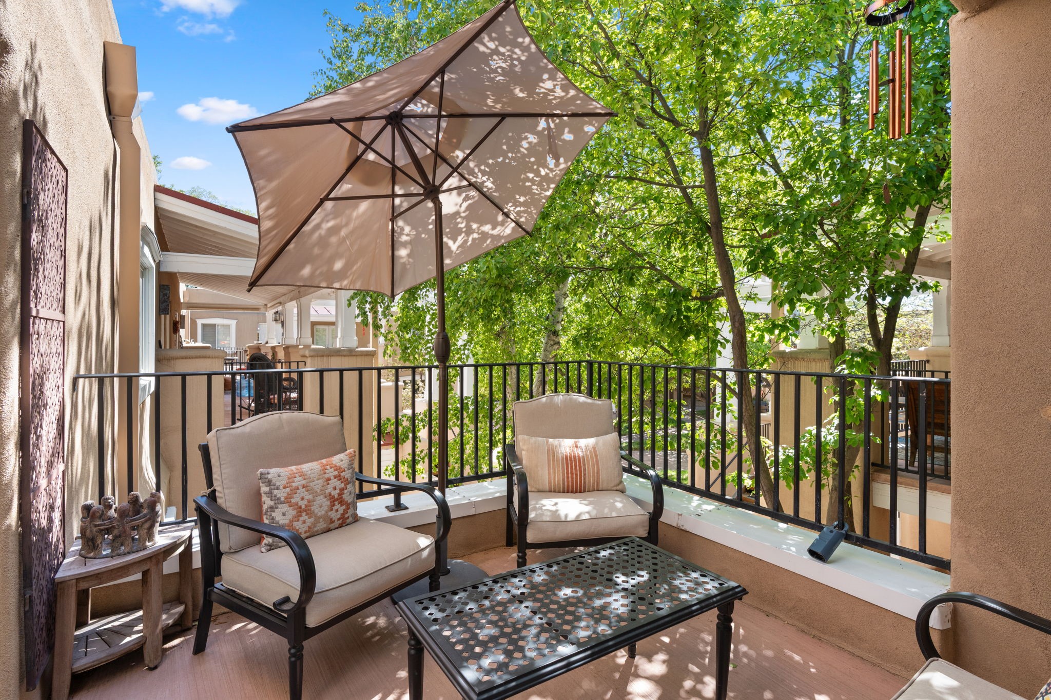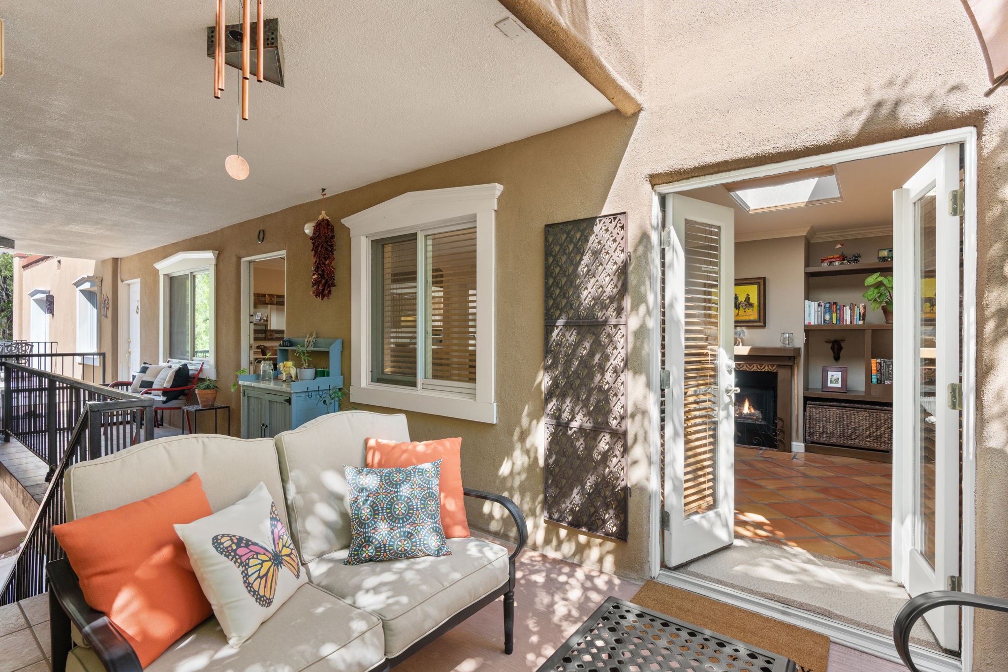 Step into the charm of Santa Fe living just 15 minutes on foot from the Historic Plaza. This beautifully refreshed upstairs condo offers a quiet retreat in a secure gated community, tucked away in a serene northeast corner overlooking the courtyard. Inside, high ceilings, skylights with custom sun blinds, and territorial-style windows bathe the open floor plan in natural light. The 2-bedroom, 1-bath home blends comfort and style with crown molding throughout, earthy two-tone colors, and a touch of New Orleans flair from the primary suite's French doors. Both bedrooms include generous walk-in closets, while the updated kitchen features stainless steel appliances and a newer sink -- ready for your culinary touch. Stay comfortable year-round with refrigerated air, and enjoy the convenience of an in-home stacked washer/dryer. The home is freshly painted, professionally cleaned, and move-in ready -- a blank canvas for your Santa Fe vision. Relax on your private outdoor space, or take advantage of the community's well-appointed amenities. Parking includes one covered, assigned space plus an additional unassigned spot. Whether you're looking for a full-time residence or a lock-and-leave pied--terre, this condo is the perfect balance of privacy, security, and downtown access. Call me Today to schedule your private showing -- discover how this home can fit your lifestyle in the heart of Santa Fe.