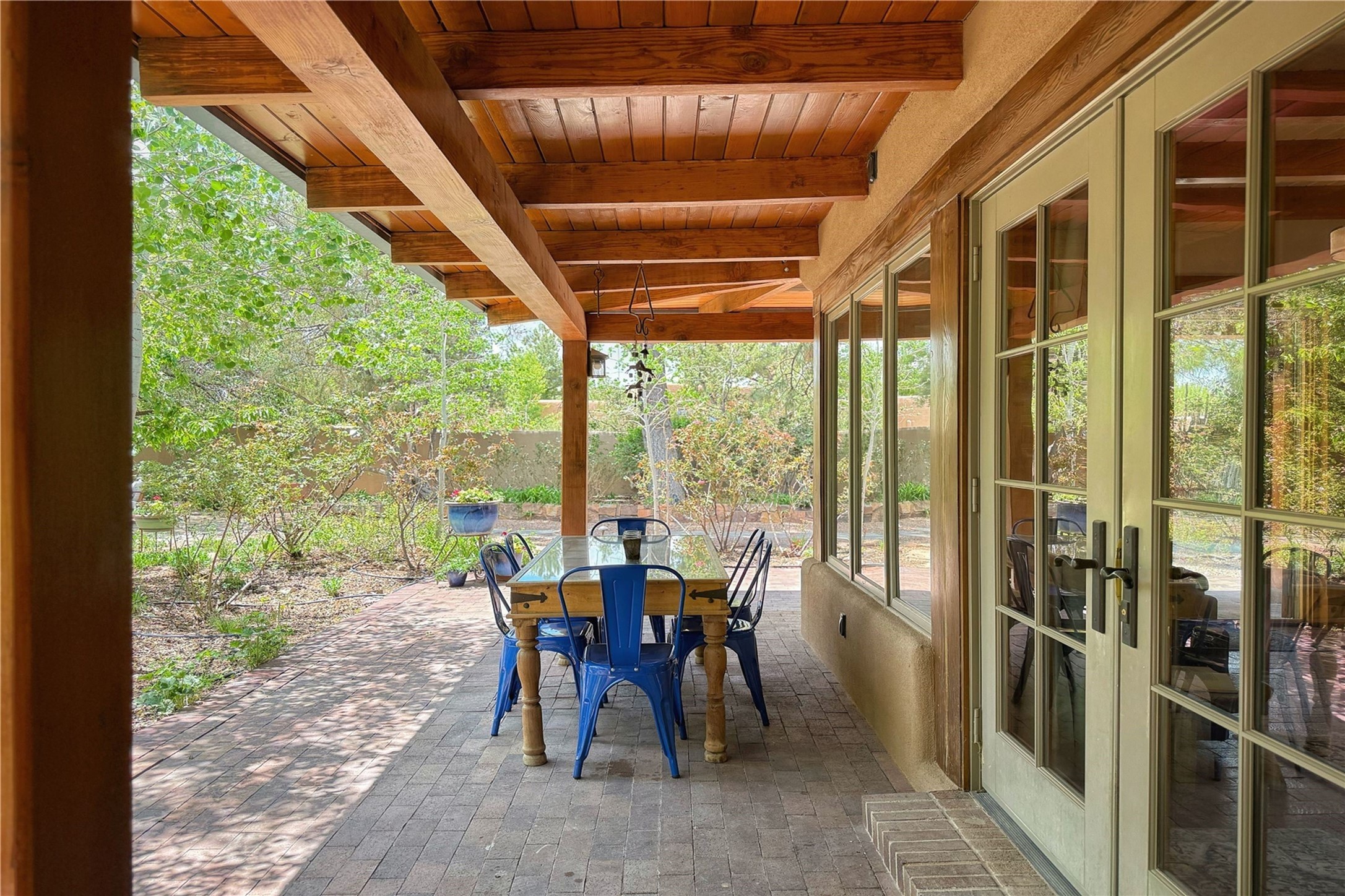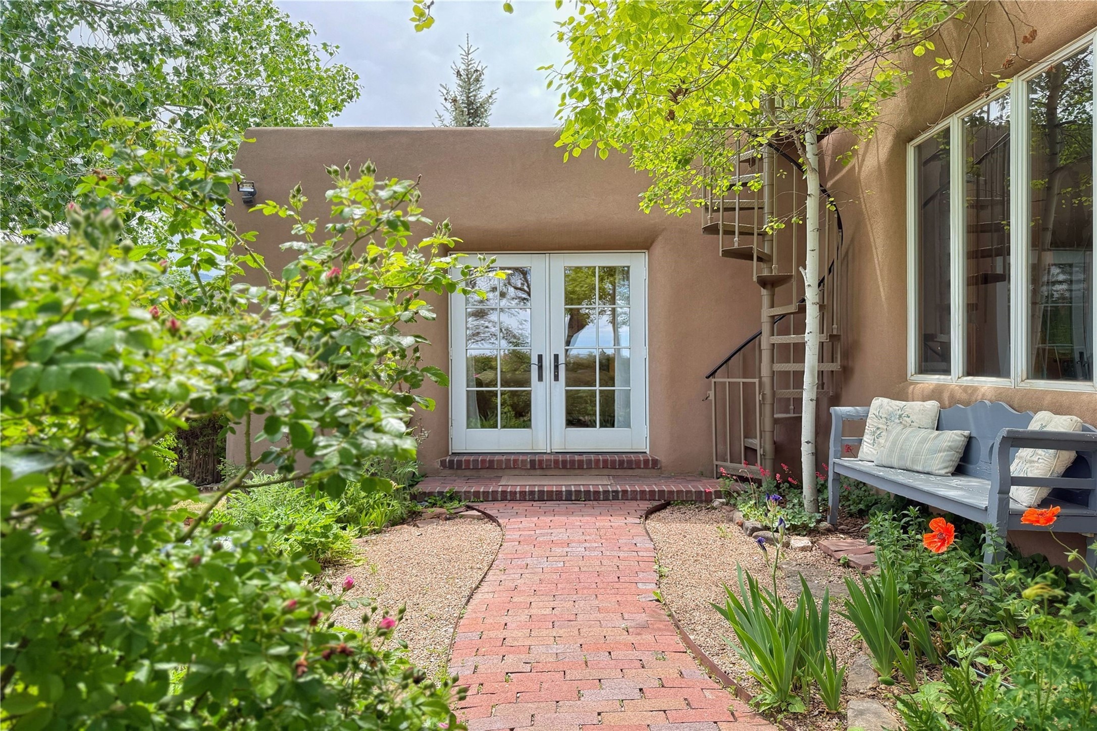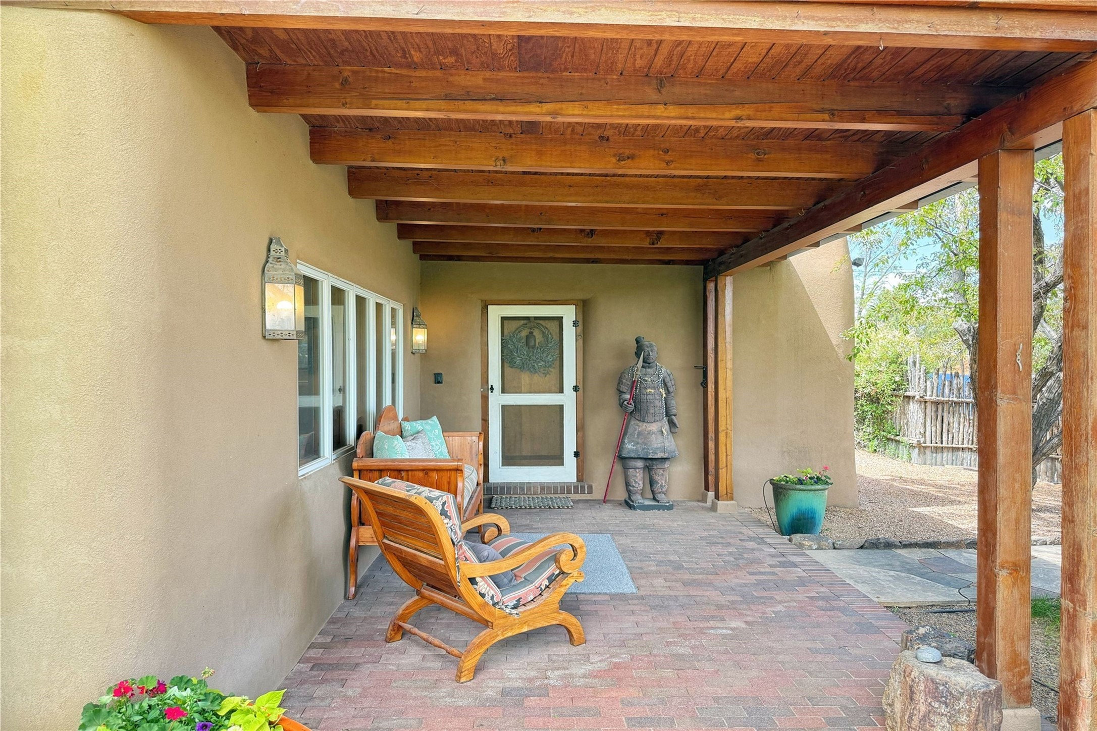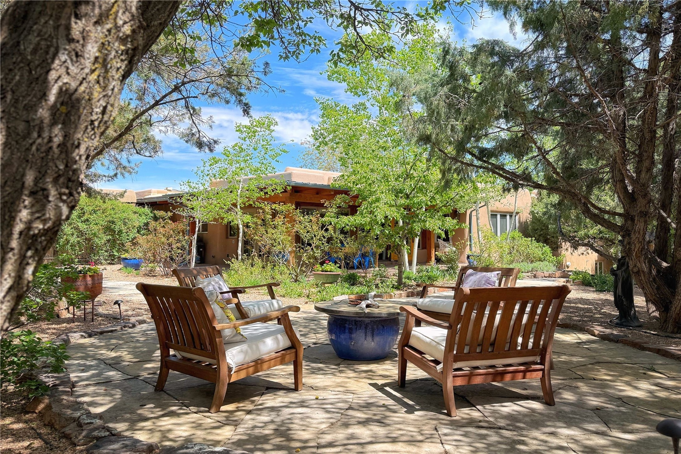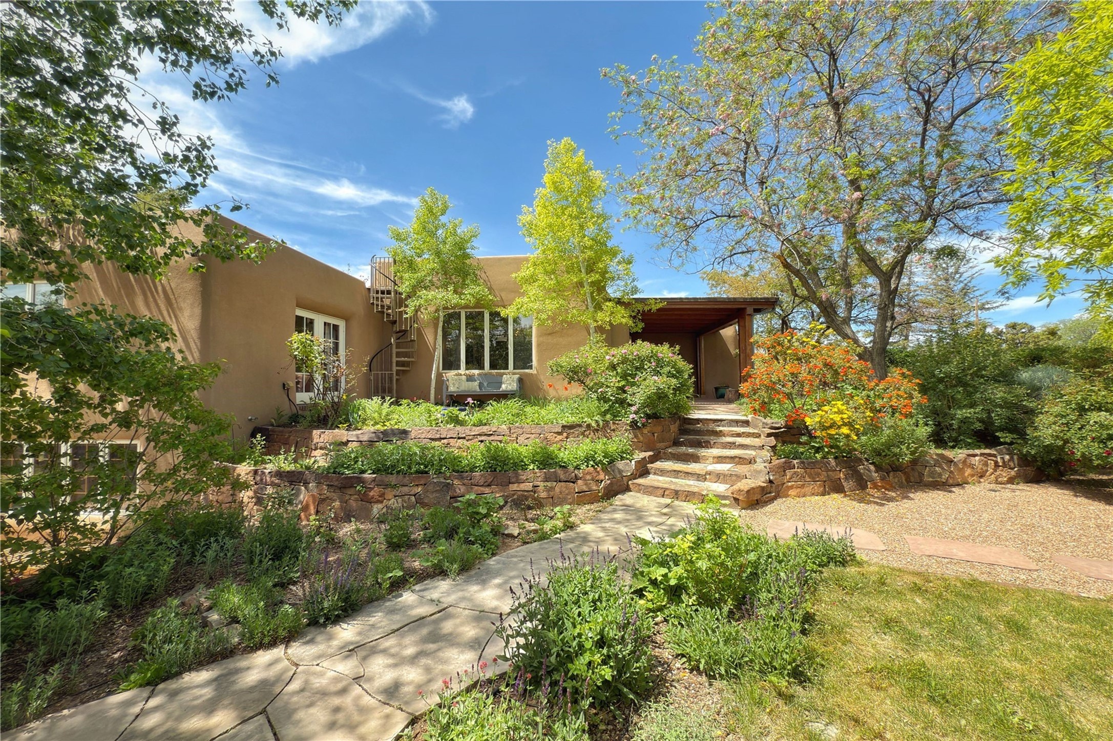Located in the heart of the Eastside, this refined adobe sanctuary in the historic"Henderson Compound" was designed by architect Louise Walker and is sited on agenerous 0.56-acre lot, providing both privacy and panoramic views of the Sangre deCristo and Jemez Mountains. The artistic, Pueblo Revival style harmoniously blendstraditional character and modern appointments, with primary living, all on a single level.The design features a stunning great room with 10.7" ceiling and a magnificentfireplace; three spacious bedroom suites; an office, den, and sunroom in the 3,738square feet. Interiors feature wood beamed ceilings throughout, restored brick andwood floors, Italian lighting, custom wood cabinets, and large windows with exquisitetreatments that fill the home with light. The gourmet kitchen is appointed with granitecountertops, a new Sub-Zero refrigerator and W/D in the chef's pantry, while all threebathrooms have been fully renovated with marble finishes. The lower level has beencompletely reimagined with luxury finishes, including a den/living area with a bar thatopens to one of the private patios, a bedroom or second study, elegant bathroom,second W/D, and a private entrance that opens to a large patio and the orchard, forguests or personal privacy. The home is encircled by patios and walking paths, lushlandscaping with flowering beds and grasses, magnificent cedars, aspens, peach,apricot, apple and cherry trees, all are serviced by a well and a drip system. Additionalamenities include energy-efficient mini-splits, an in-wall safe, two serene outdoorfountains, outdoor shed and spiral staircase that takes you to the upgraded roof offering360 views of Santa Fe and your glorious estate. A well-lit, two-car carport and extraparking complete the home. Located just minutes from Canyon Road, this homeembodies the appeal of Santa Fe with the comfort and ease of modern living.