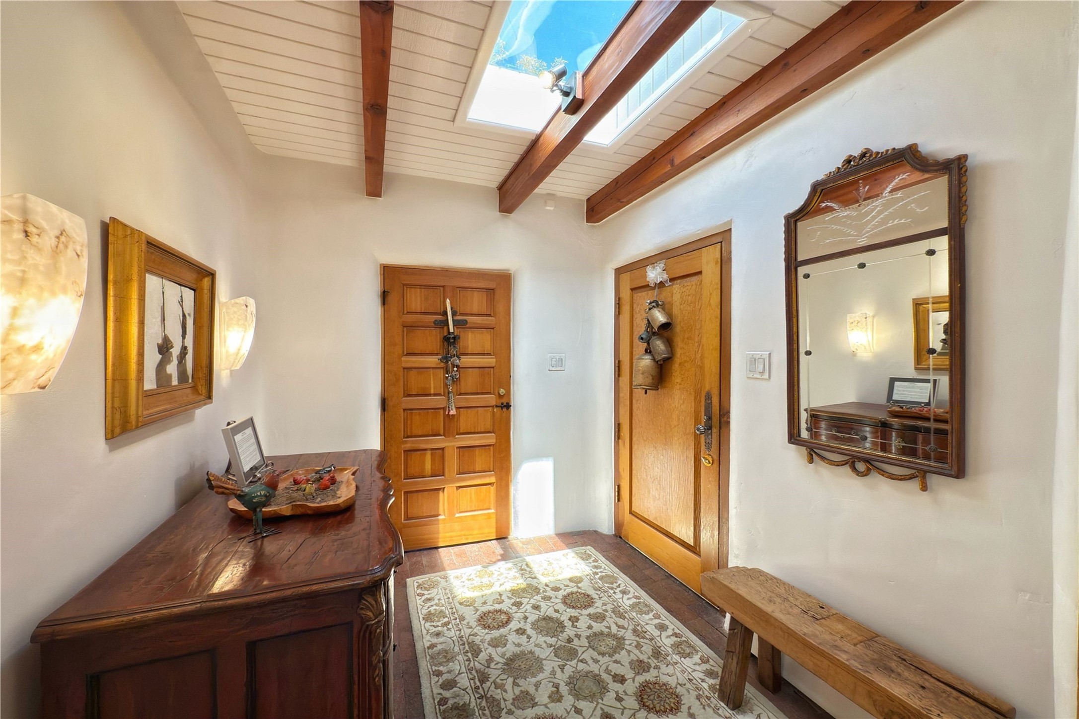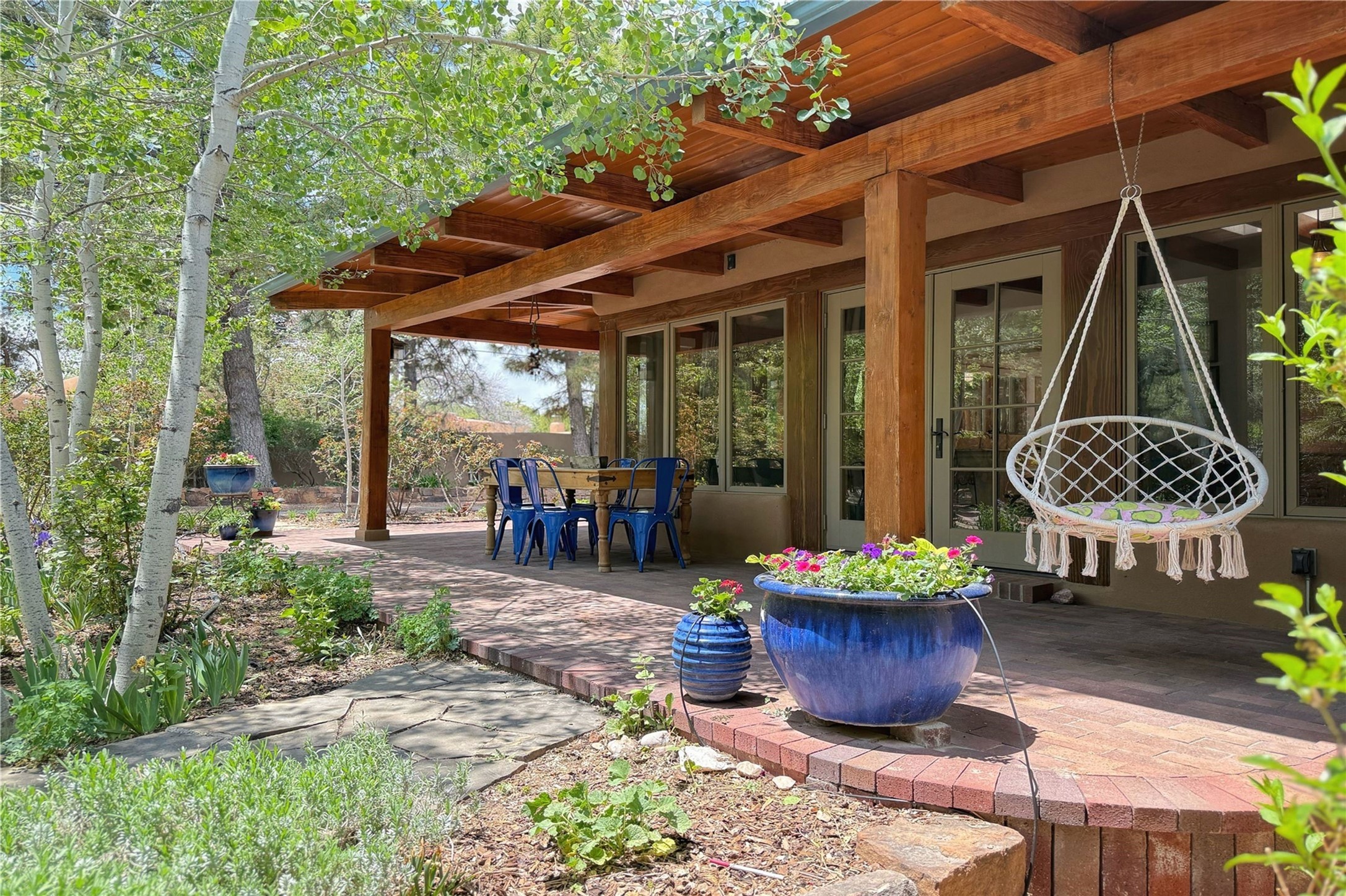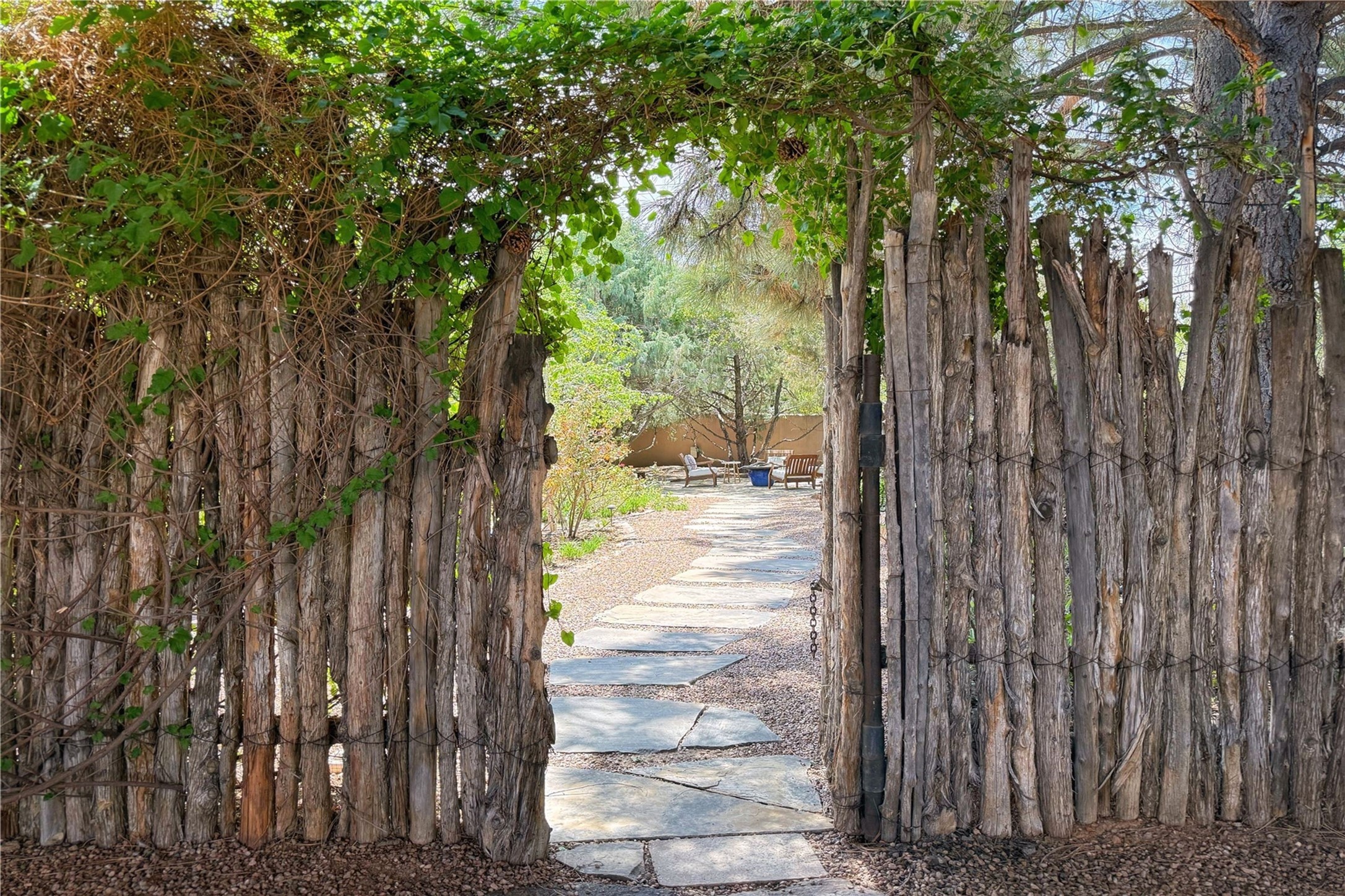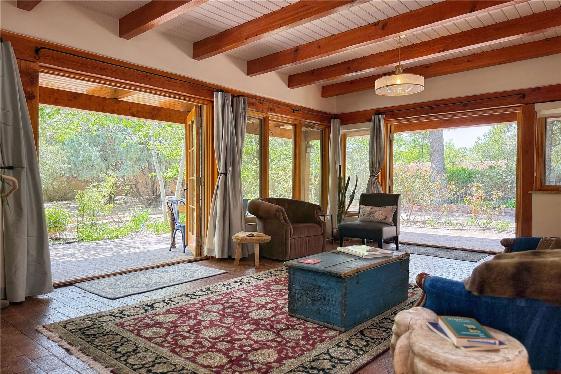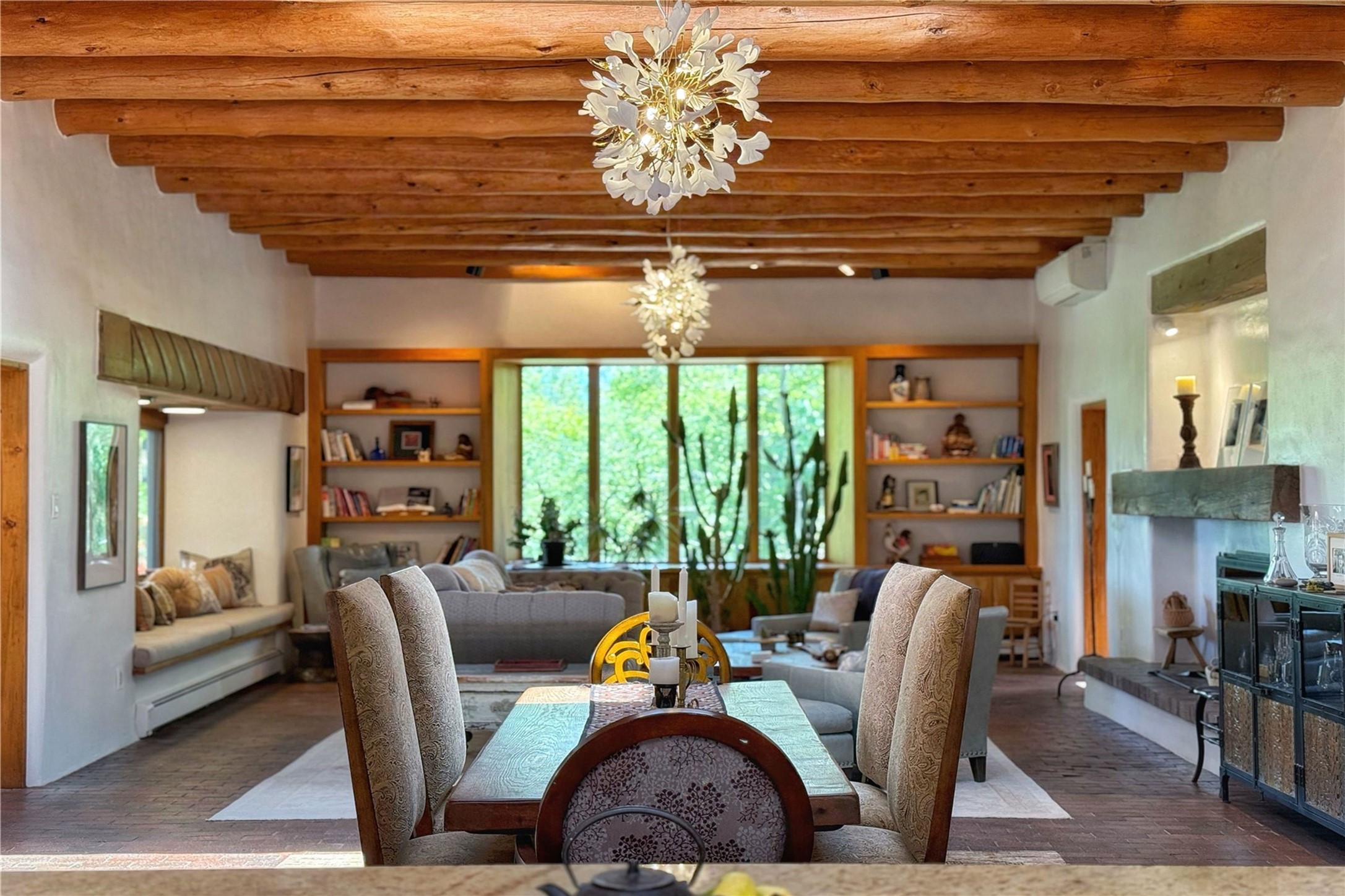 Located in the heart of the Eastside, this refined adobe sanctuary in the historic"Henderson Compound" was designed by architect Louise Walker and is sited on agenerous 0.56-acre lot, providing both privacy and panoramic views of the Sangre deCristo and Jemez Mountains. The artistic, Pueblo Revival style harmoniously blendstraditional character and modern appointments, with primary living, all on a single level.The design features a stunning great room with 10.7" ceiling and a magnificentfireplace; three spacious bedroom suites; an office, den, and sunroom in the 3,738square feet. Interiors feature wood beamed ceilings throughout, restored brick andwood floors, Italian lighting, custom wood cabinets, and large windows with exquisitetreatments that fill the home with light. The gourmet kitchen is appointed with granitecountertops, a new Sub-Zero refrigerator and W/D in the chef's pantry, while all threebathrooms have been fully renovated with marble finishes. The lower level has beencompletely reimagined with luxury finishes, including a den/living area with a bar thatopens to one of the private patios, a bedroom or second study, elegant bathroom,second W/D, and a private entrance that opens to a large patio and the orchard, forguests or personal privacy. The home is encircled by patios and walking paths, lushlandscaping with flowering beds and grasses, magnificent cedars, aspens, peach,apricot, apple and cherry trees, all are serviced by a well and a drip system. Additionalamenities include energy-efficient mini-splits, an in-wall safe, two serene outdoorfountains, outdoor shed and spiral staircase that takes you to the upgraded roof offering360 views of Santa Fe and your glorious estate. A well-lit, two-car carport and extraparking complete the home. Located just minutes from Canyon Road, this homeembodies the appeal of Santa Fe with the comfort and ease of modern living.