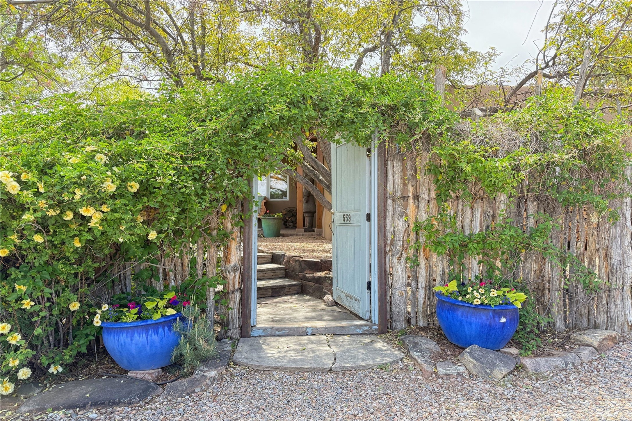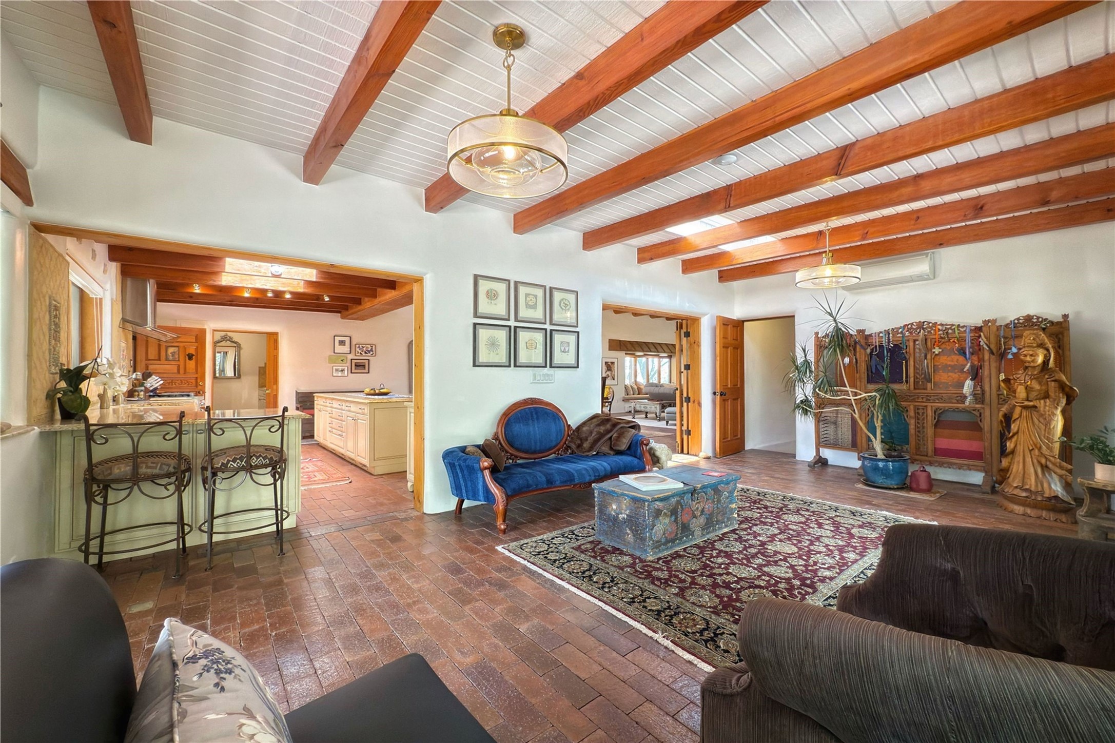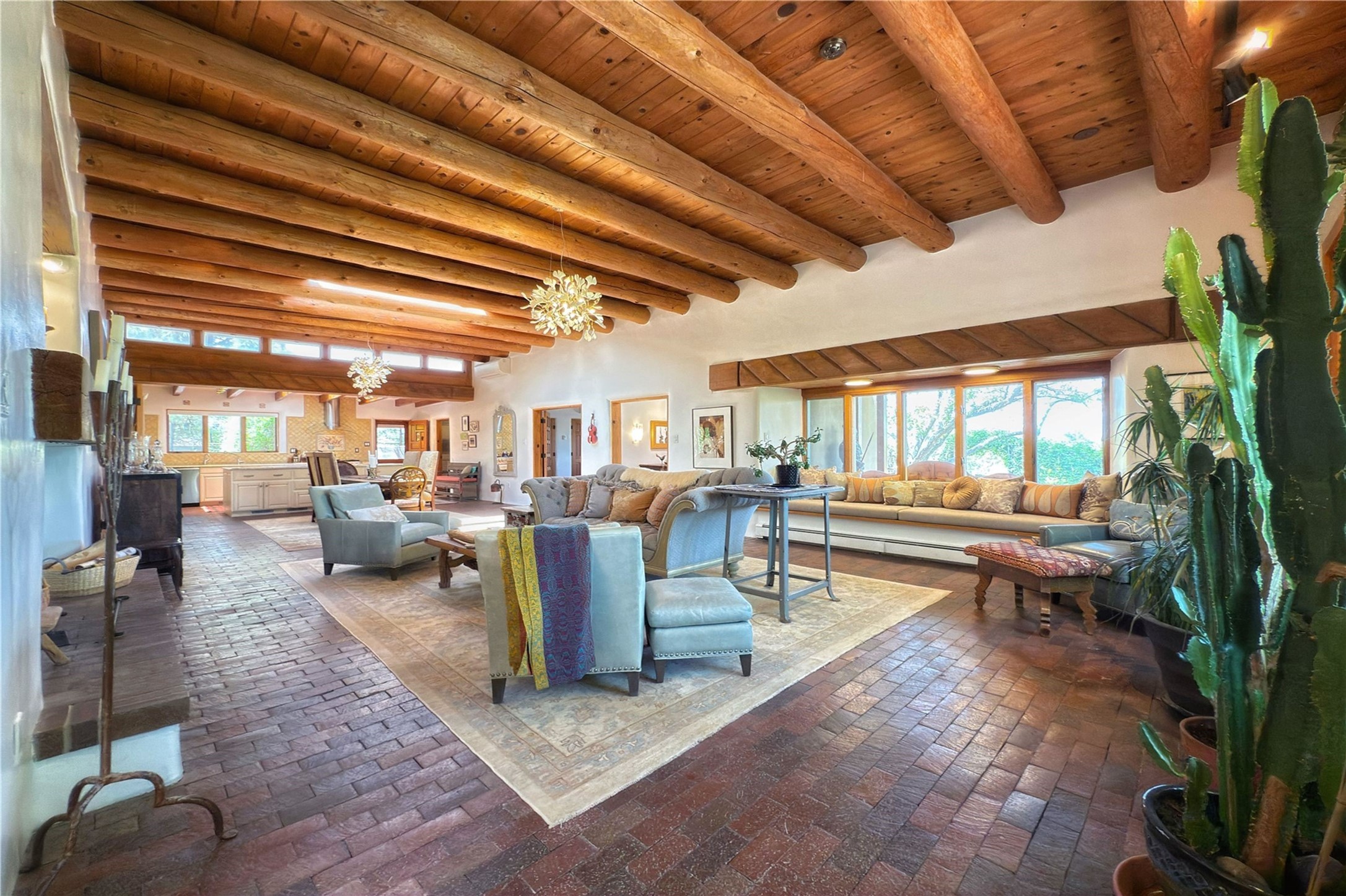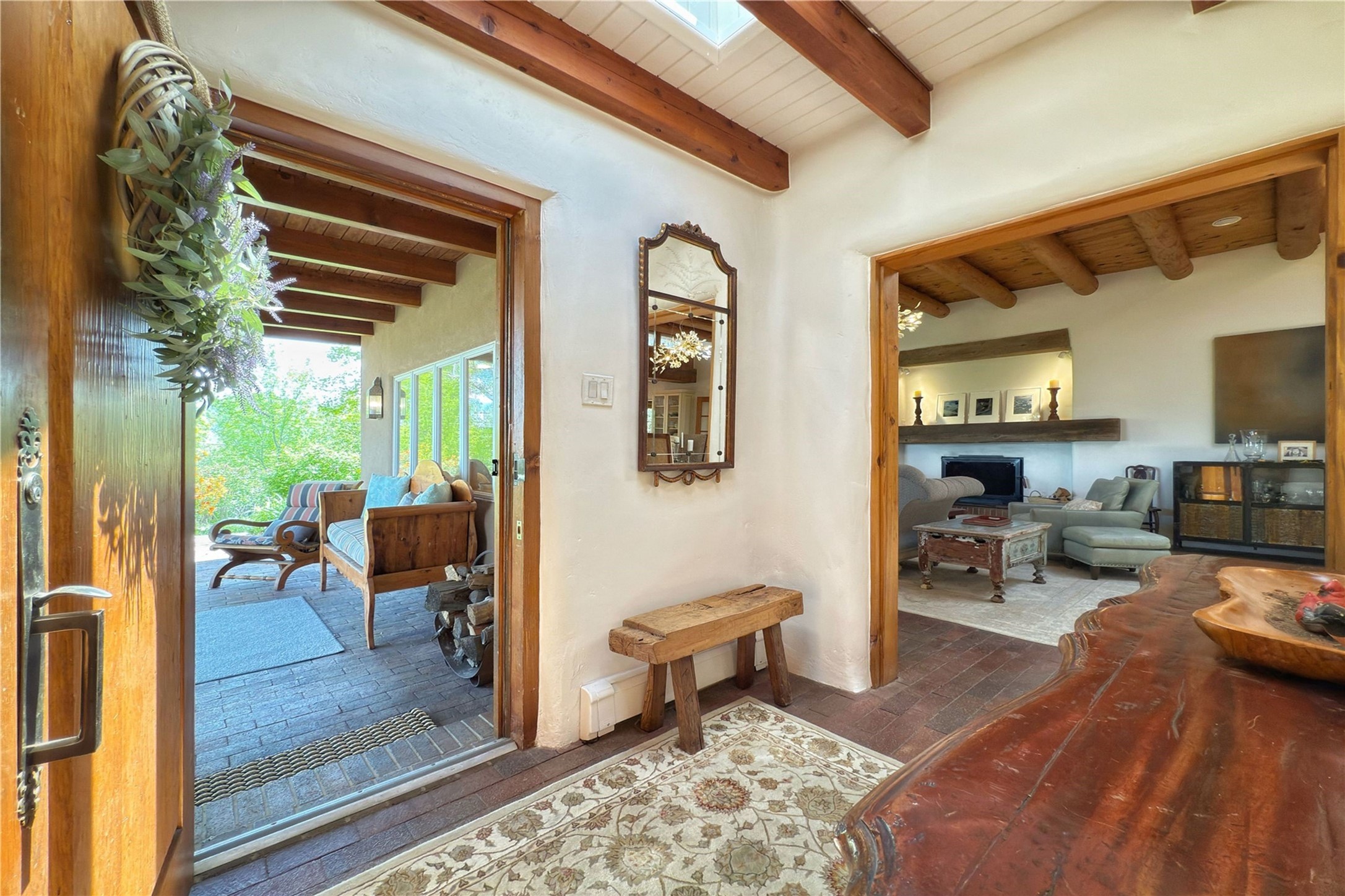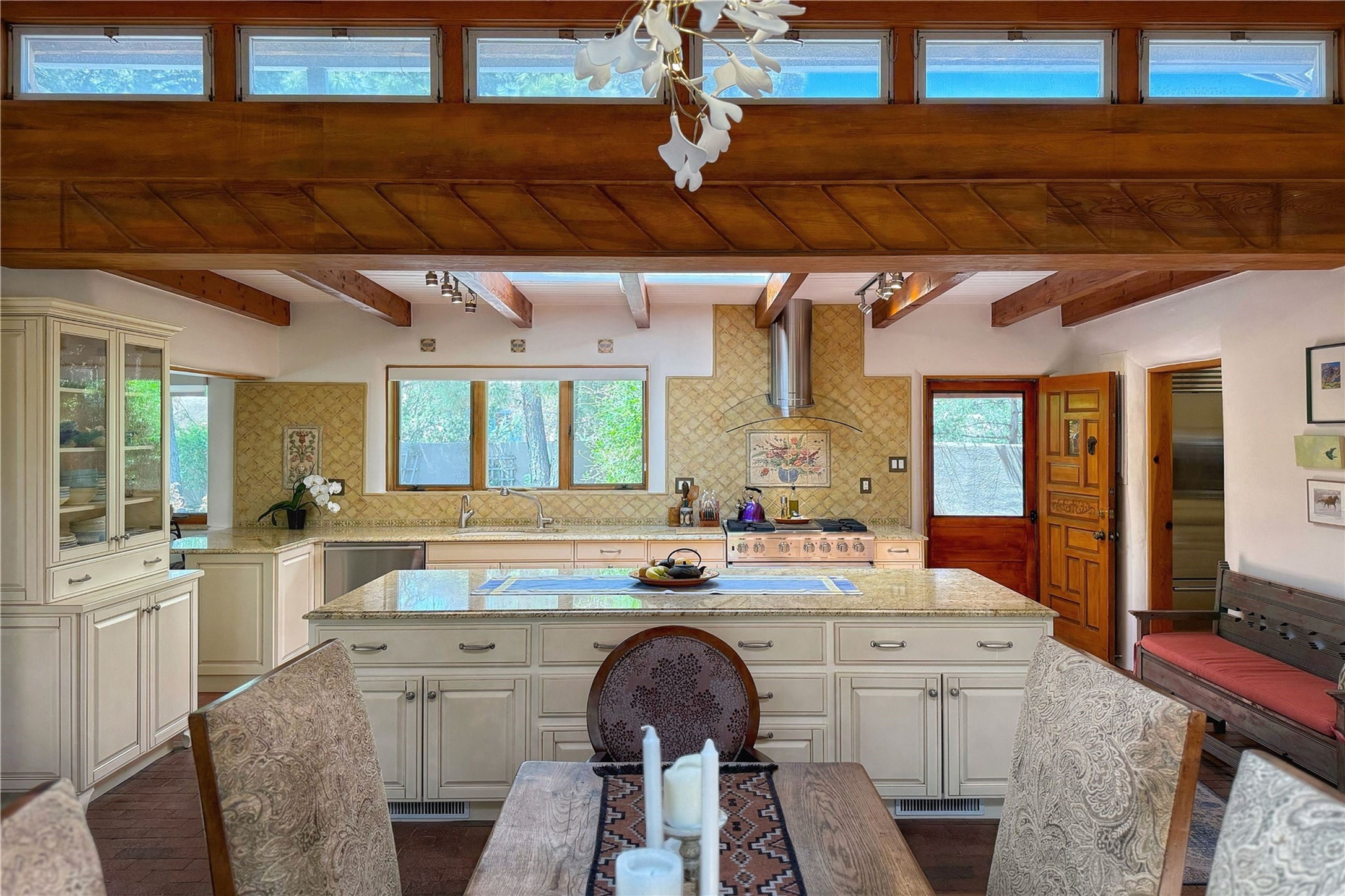 Located in the heart of the Eastside, this refined adobe sanctuary in the historic"Henderson Compound" was designed by architect Louise Walker and is sited on agenerous 0.56-acre lot, providing both privacy and panoramic views of the Sangre deCristo and Jemez Mountains. The artistic, Pueblo Revival style harmoniously blendstraditional character and modern appointments, with primary living, all on a single level.The design features a stunning great room with 10.7" ceiling and a magnificentfireplace; three spacious bedroom suites; an office, den, and sunroom in the 3,738square feet. Interiors feature wood beamed ceilings throughout, restored brick andwood floors, Italian lighting, custom wood cabinets, and large windows with exquisitetreatments that fill the home with light. The gourmet kitchen is appointed with granitecountertops, a new Sub-Zero refrigerator and W/D in the chef's pantry, while all threebathrooms have been fully renovated with marble finishes. The lower level has beencompletely reimagined with luxury finishes, including a den/living area with a bar thatopens to one of the private patios, a bedroom or second study, elegant bathroom,second W/D, and a private entrance that opens to a large patio and the orchard, forguests or personal privacy. The home is encircled by patios and walking paths, lushlandscaping with flowering beds and grasses, magnificent cedars, aspens, peach,apricot, apple and cherry trees, all are serviced by a well and a drip system. Additionalamenities include energy-efficient mini-splits, an in-wall safe, two serene outdoorfountains, outdoor shed and spiral staircase that takes you to the upgraded roof offering360 views of Santa Fe and your glorious estate. A well-lit, two-car carport and extraparking complete the home. Located just minutes from Canyon Road, this homeembodies the appeal of Santa Fe with the comfort and ease of modern living.