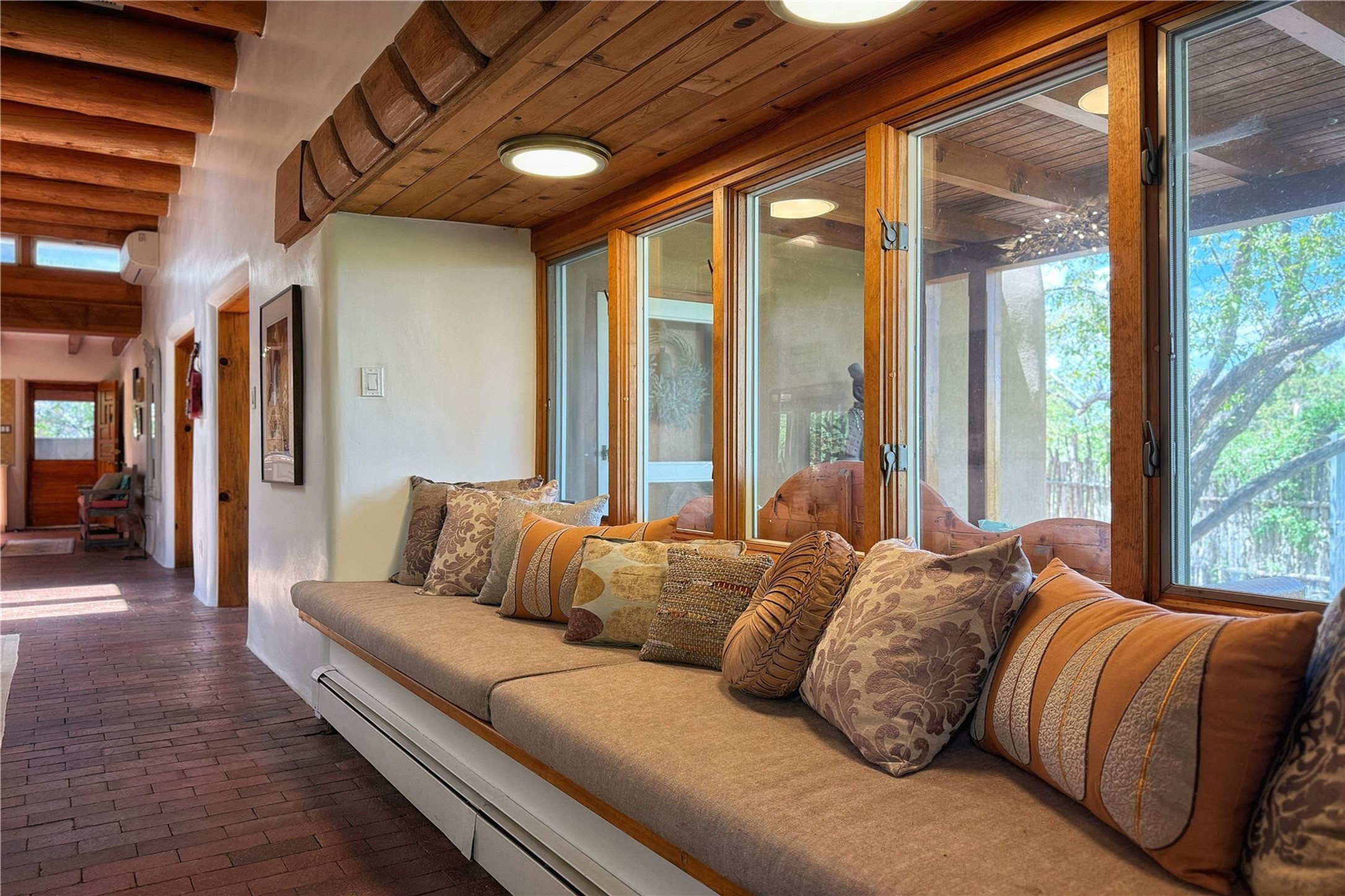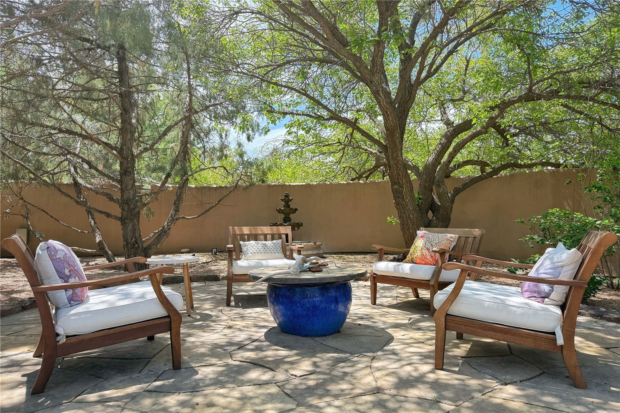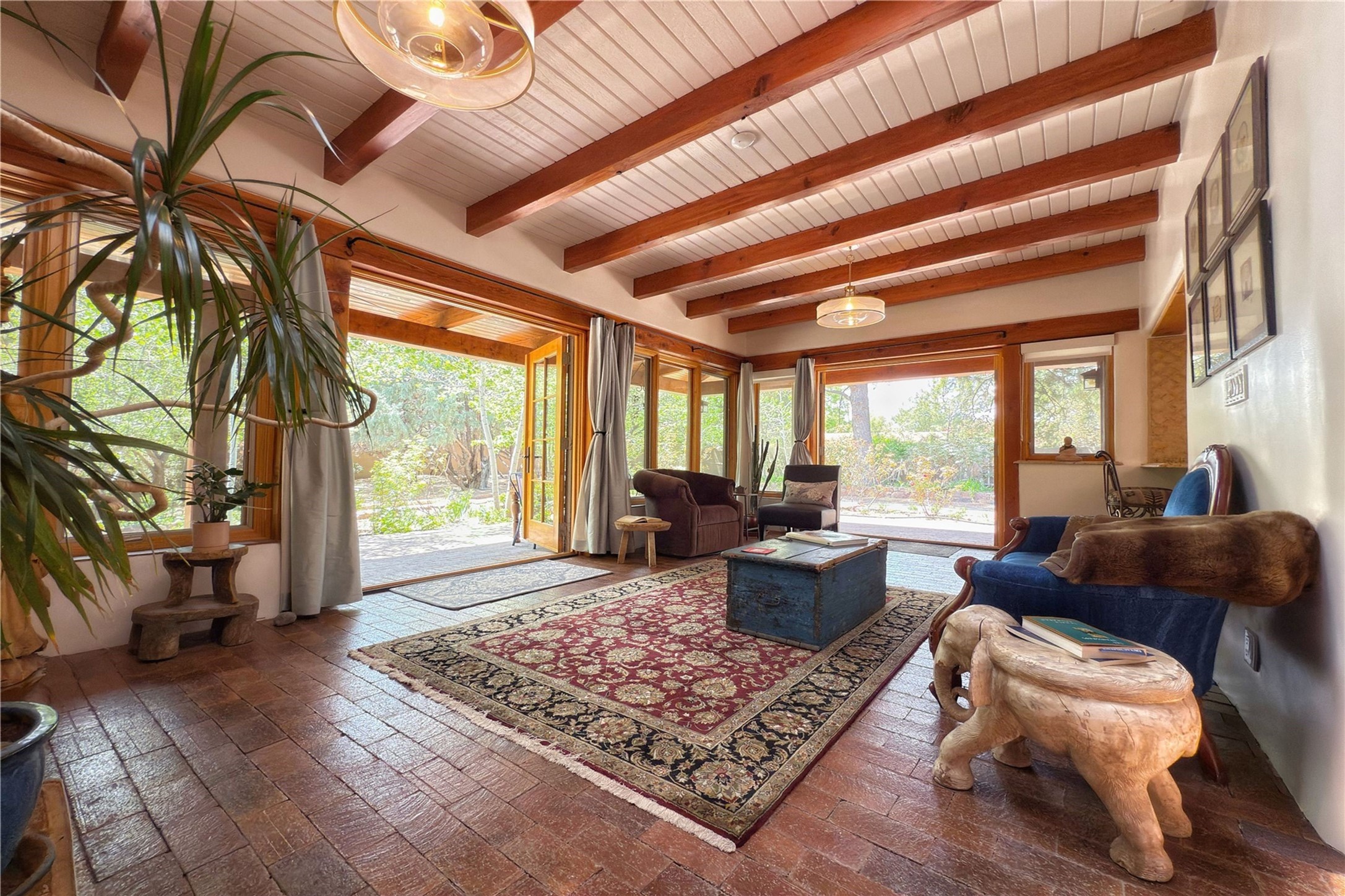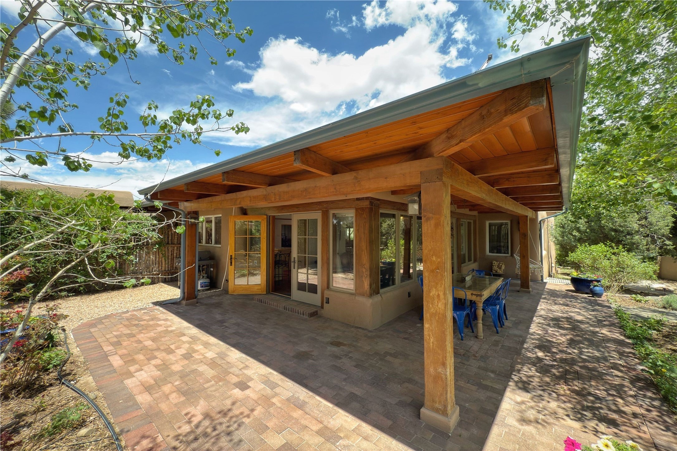 Located in the heart of the Eastside, this refined adobe sanctuary in the historic"Henderson Compound" was designed by architect Louise Walker and is sited on agenerous 0.56-acre lot, providing both privacy and panoramic views of the Sangre deCristo and Jemez Mountains. The artistic, Pueblo Revival style harmoniously blendstraditional character and modern appointments, with primary living, all on a single level.The design features a stunning great room with 10.7" ceiling and a magnificentfireplace; three spacious bedroom suites; an office, den, and sunroom in the 3,738square feet. Interiors feature wood beamed ceilings throughout, restored brick andwood floors, Italian lighting, custom wood cabinets, and large windows with exquisitetreatments that fill the home with light. The gourmet kitchen is appointed with granitecountertops, a new Sub-Zero refrigerator and W/D in the chef's pantry, while all threebathrooms have been fully renovated with marble finishes. The lower level has beencompletely reimagined with luxury finishes, including a den/living area with a bar thatopens to one of the private patios, a bedroom or second study, elegant bathroom,second W/D, and a private entrance that opens to a large patio and the orchard, forguests or personal privacy. The home is encircled by patios and walking paths, lushlandscaping with flowering beds and grasses, magnificent cedars, aspens, peach,apricot, apple and cherry trees, all are serviced by a well and a drip system. Additionalamenities include energy-efficient mini-splits, an in-wall safe, two serene outdoorfountains, outdoor shed and spiral staircase that takes you to the upgraded roof offering360 views of Santa Fe and your glorious estate. A well-lit, two-car carport and extraparking complete the home. Located just minutes from Canyon Road, this homeembodies the appeal of Santa Fe with the comfort and ease of modern living.