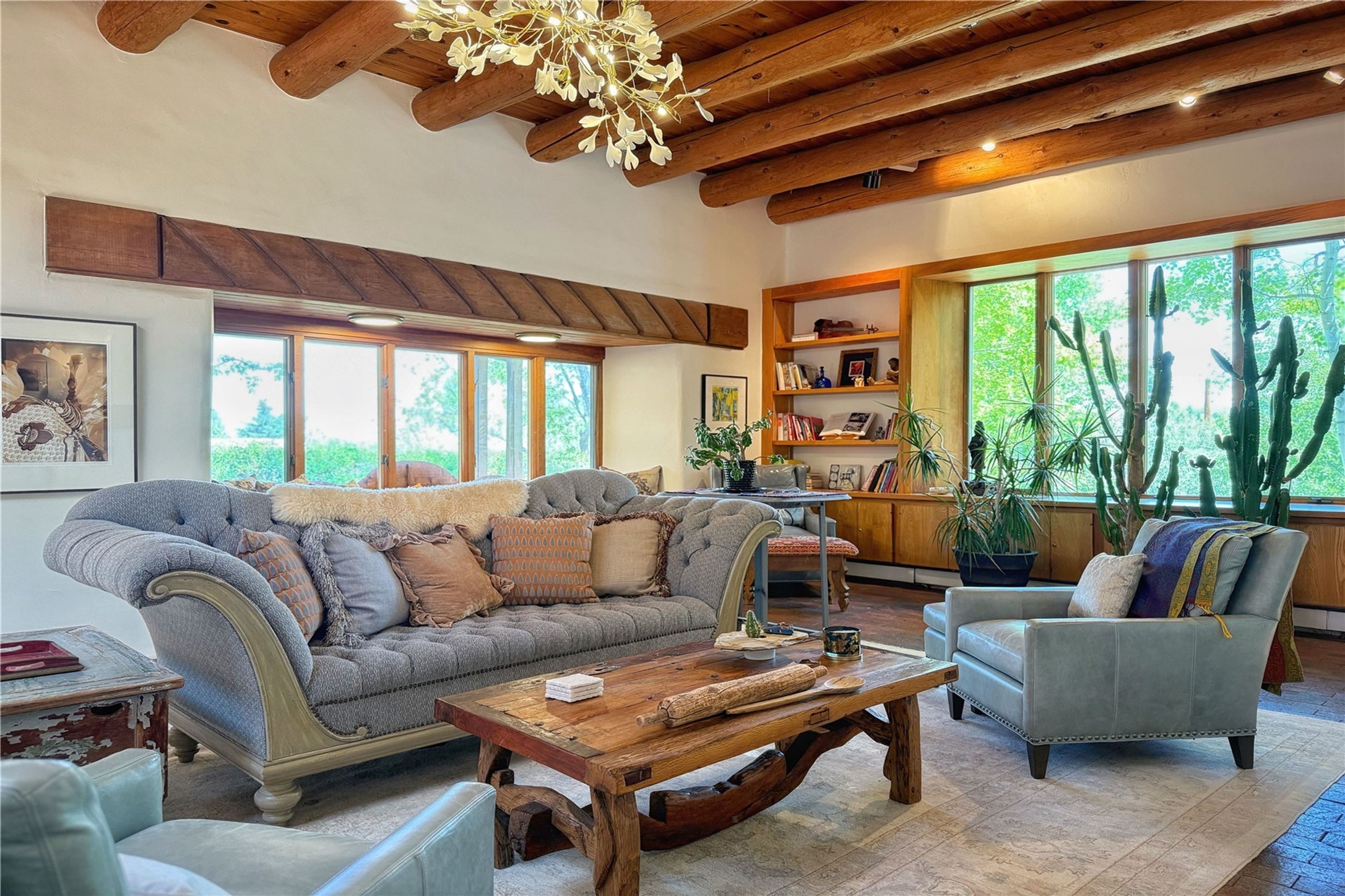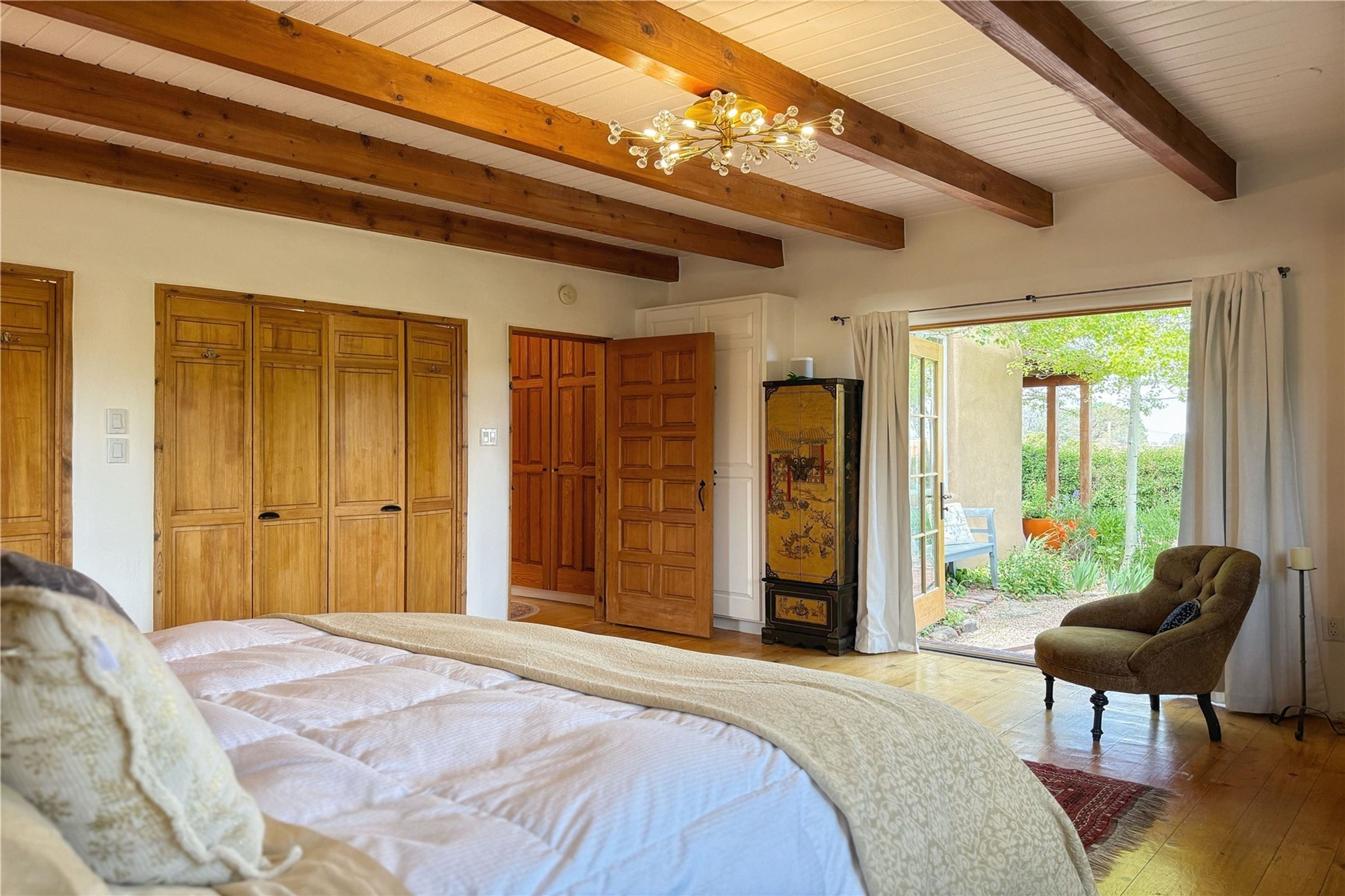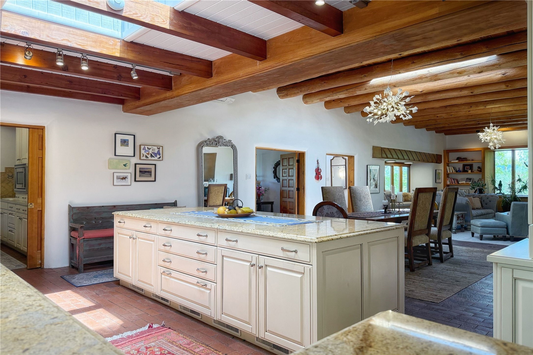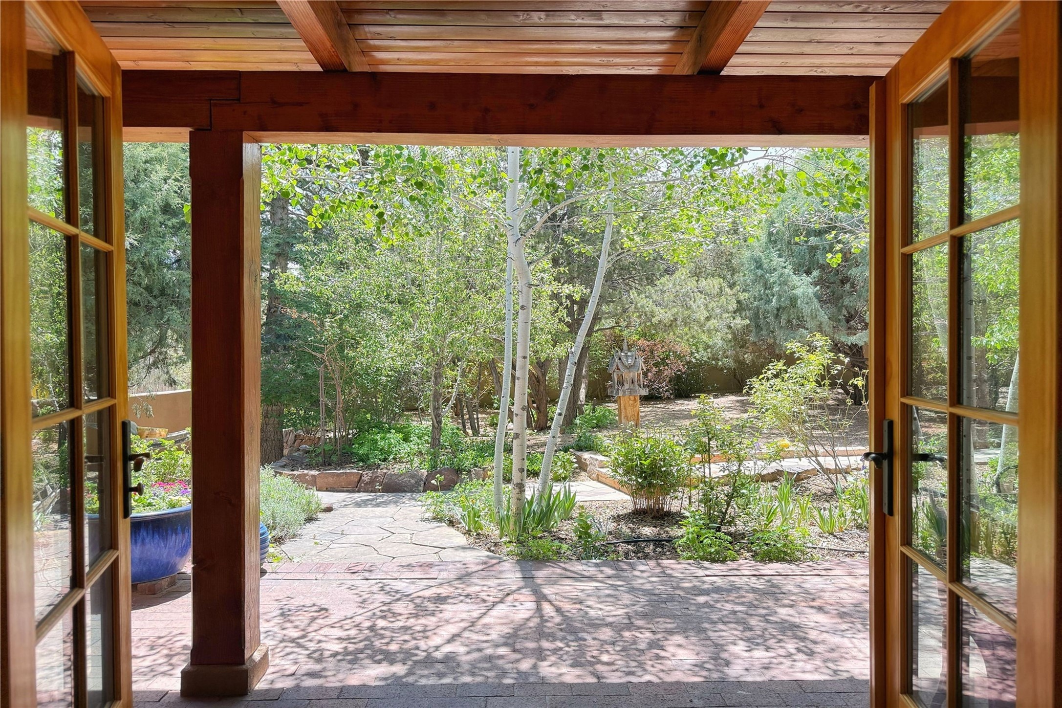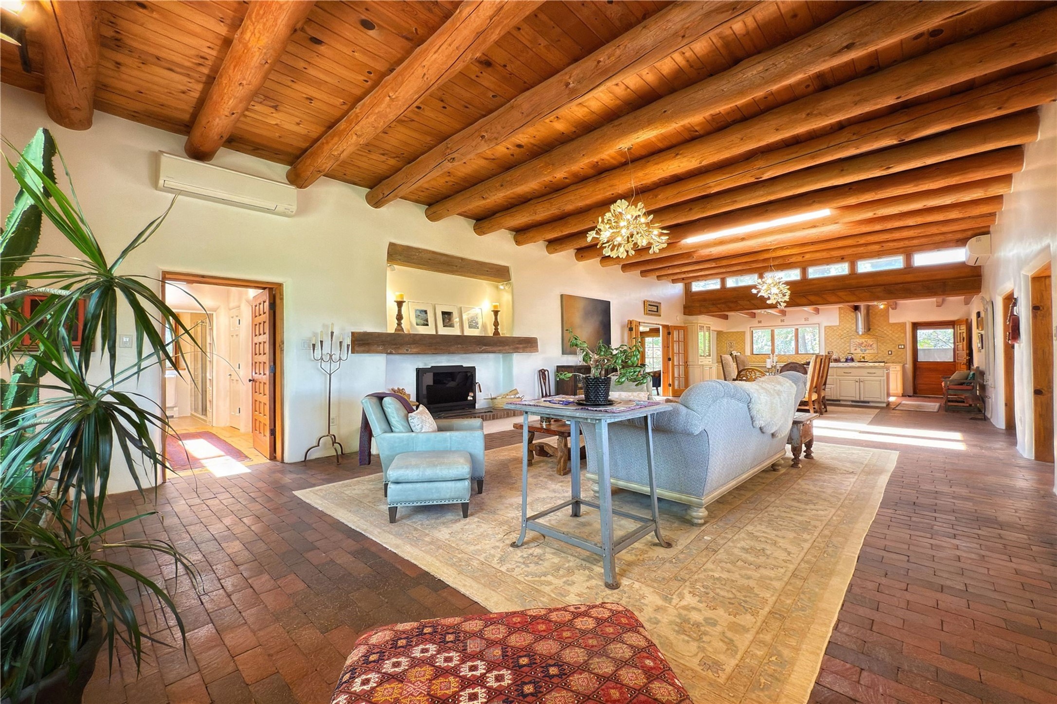 Located in the heart of the Eastside, this refined adobe sanctuary in the historic"Henderson Compound" was designed by architect Louise Walker and is sited on agenerous 0.56-acre lot, providing both privacy and panoramic views of the Sangre deCristo and Jemez Mountains. The artistic, Pueblo Revival style harmoniously blendstraditional character and modern appointments, with primary living, all on a single level.The design features a stunning great room with 10.7" ceiling and a magnificentfireplace; three spacious bedroom suites; an office, den, and sunroom in the 3,738square feet. Interiors feature wood beamed ceilings throughout, restored brick andwood floors, Italian lighting, custom wood cabinets, and large windows with exquisitetreatments that fill the home with light. The gourmet kitchen is appointed with granitecountertops, a new Sub-Zero refrigerator and W/D in the chef's pantry, while all threebathrooms have been fully renovated with marble finishes. The lower level has beencompletely reimagined with luxury finishes, including a den/living area with a bar thatopens to one of the private patios, a bedroom or second study, elegant bathroom,second W/D, and a private entrance that opens to a large patio and the orchard, forguests or personal privacy. The home is encircled by patios and walking paths, lushlandscaping with flowering beds and grasses, magnificent cedars, aspens, peach,apricot, apple and cherry trees, all are serviced by a well and a drip system. Additionalamenities include energy-efficient mini-splits, an in-wall safe, two serene outdoorfountains, outdoor shed and spiral staircase that takes you to the upgraded roof offering360 views of Santa Fe and your glorious estate. A well-lit, two-car carport and extraparking complete the home. Located just minutes from Canyon Road, this homeembodies the appeal of Santa Fe with the comfort and ease of modern living.