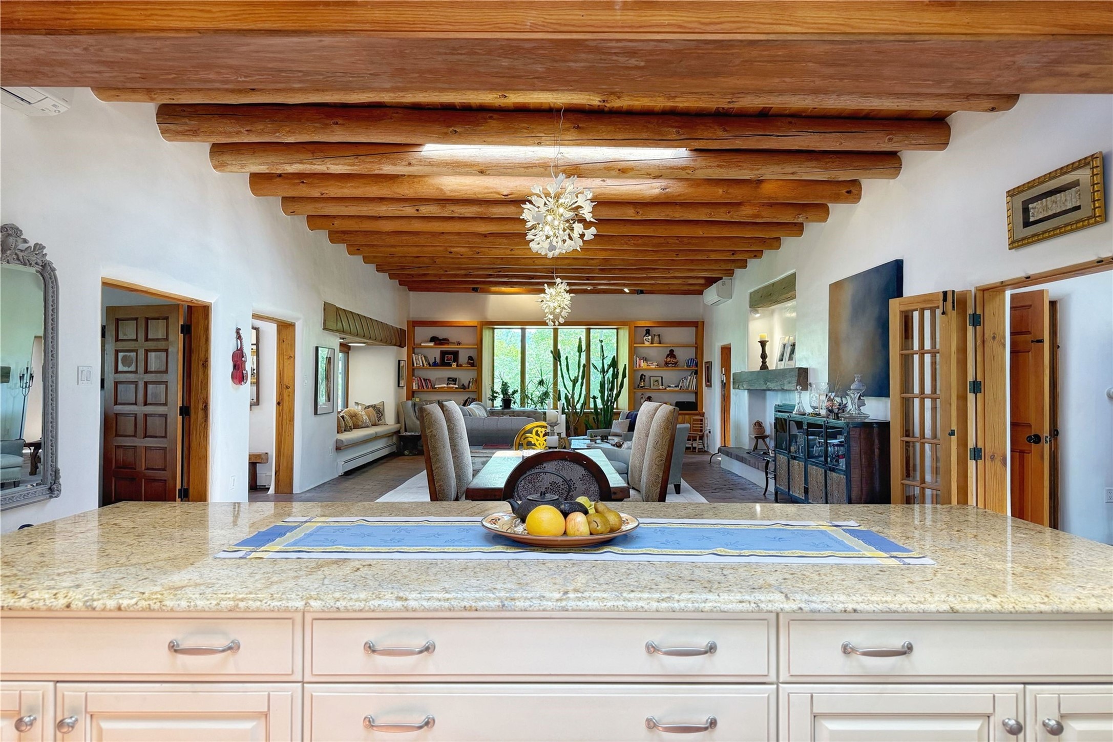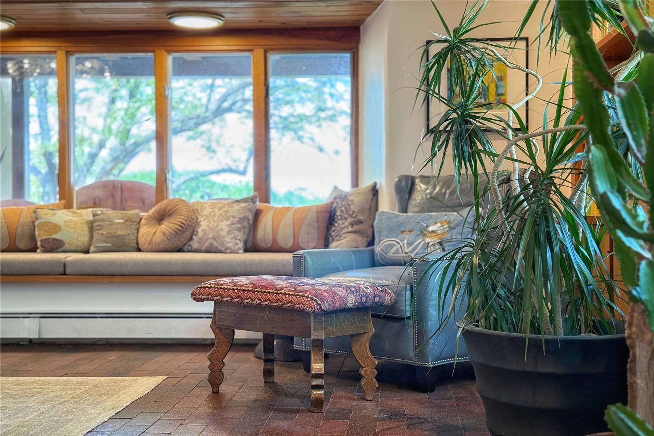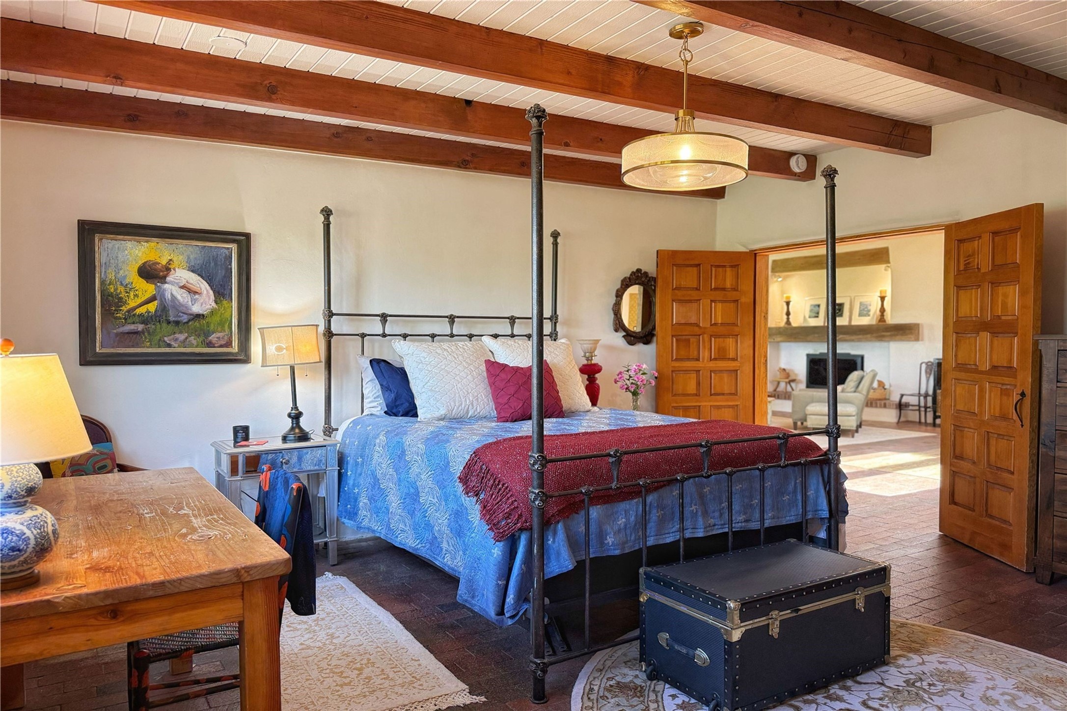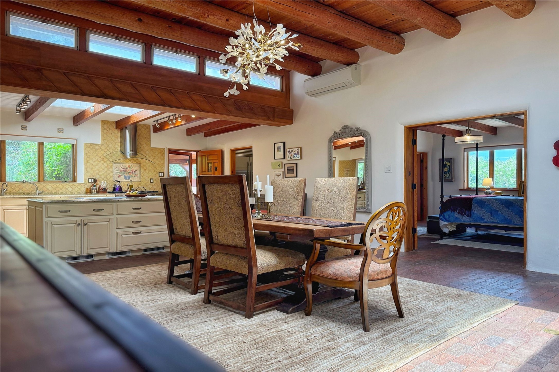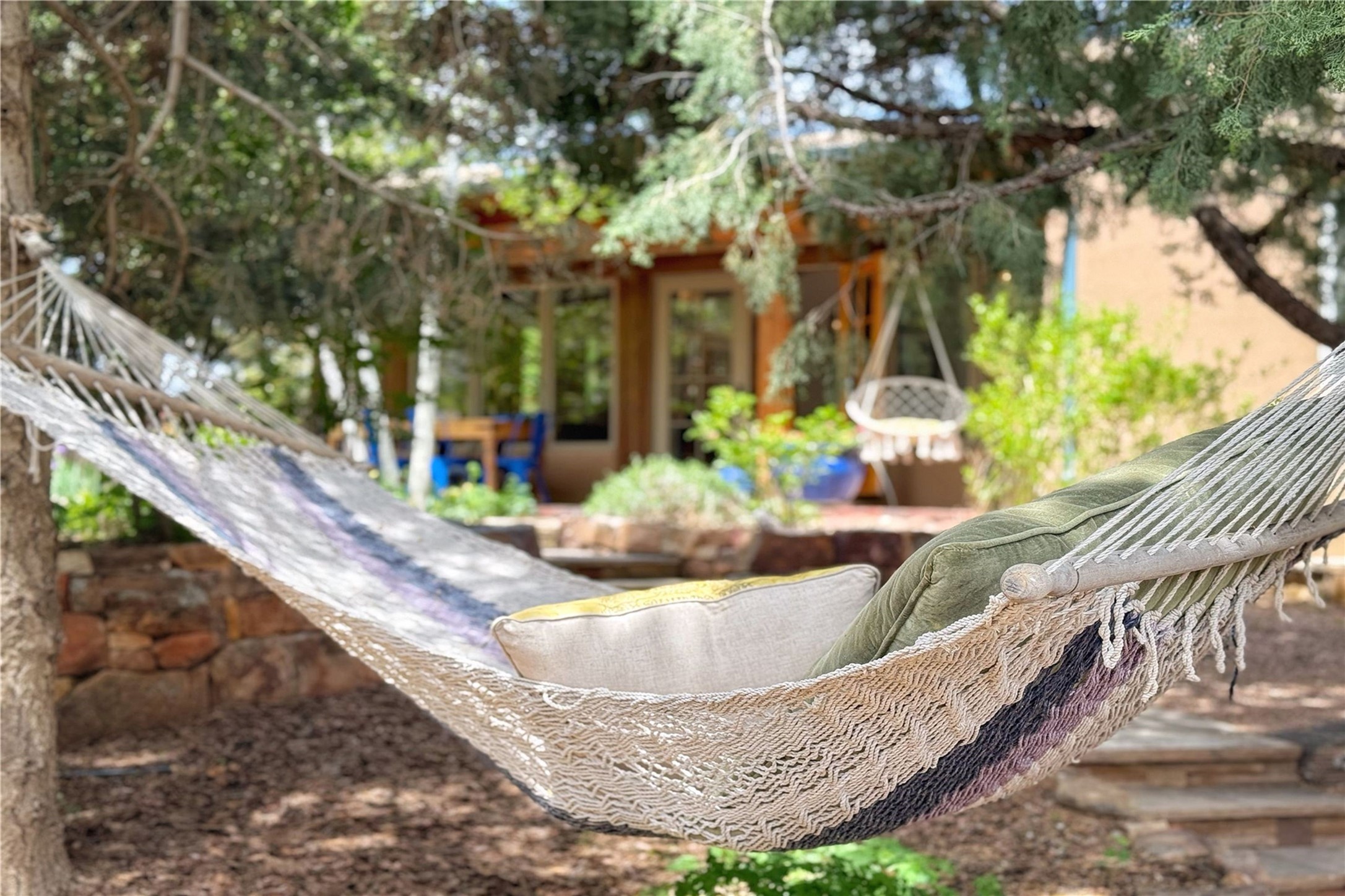 Located in the heart of the Eastside, this refined adobe sanctuary in the historic"Henderson Compound" was designed by architect Louise Walker and is sited on agenerous 0.56-acre lot, providing both privacy and panoramic views of the Sangre deCristo and Jemez Mountains. The artistic, Pueblo Revival style harmoniously blendstraditional character and modern appointments, with primary living, all on a single level.The design features a stunning great room with 10.7" ceiling and a magnificentfireplace; three spacious bedroom suites; an office, den, and sunroom in the 3,738square feet. Interiors feature wood beamed ceilings throughout, restored brick andwood floors, Italian lighting, custom wood cabinets, and large windows with exquisitetreatments that fill the home with light. The gourmet kitchen is appointed with granitecountertops, a new Sub-Zero refrigerator and W/D in the chef's pantry, while all threebathrooms have been fully renovated with marble finishes. The lower level has beencompletely reimagined with luxury finishes, including a den/living area with a bar thatopens to one of the private patios, a bedroom or second study, elegant bathroom,second W/D, and a private entrance that opens to a large patio and the orchard, forguests or personal privacy. The home is encircled by patios and walking paths, lushlandscaping with flowering beds and grasses, magnificent cedars, aspens, peach,apricot, apple and cherry trees, all are serviced by a well and a drip system. Additionalamenities include energy-efficient mini-splits, an in-wall safe, two serene outdoorfountains, outdoor shed and spiral staircase that takes you to the upgraded roof offering360 views of Santa Fe and your glorious estate. A well-lit, two-car carport and extraparking complete the home. Located just minutes from Canyon Road, this homeembodies the appeal of Santa Fe with the comfort and ease of modern living.