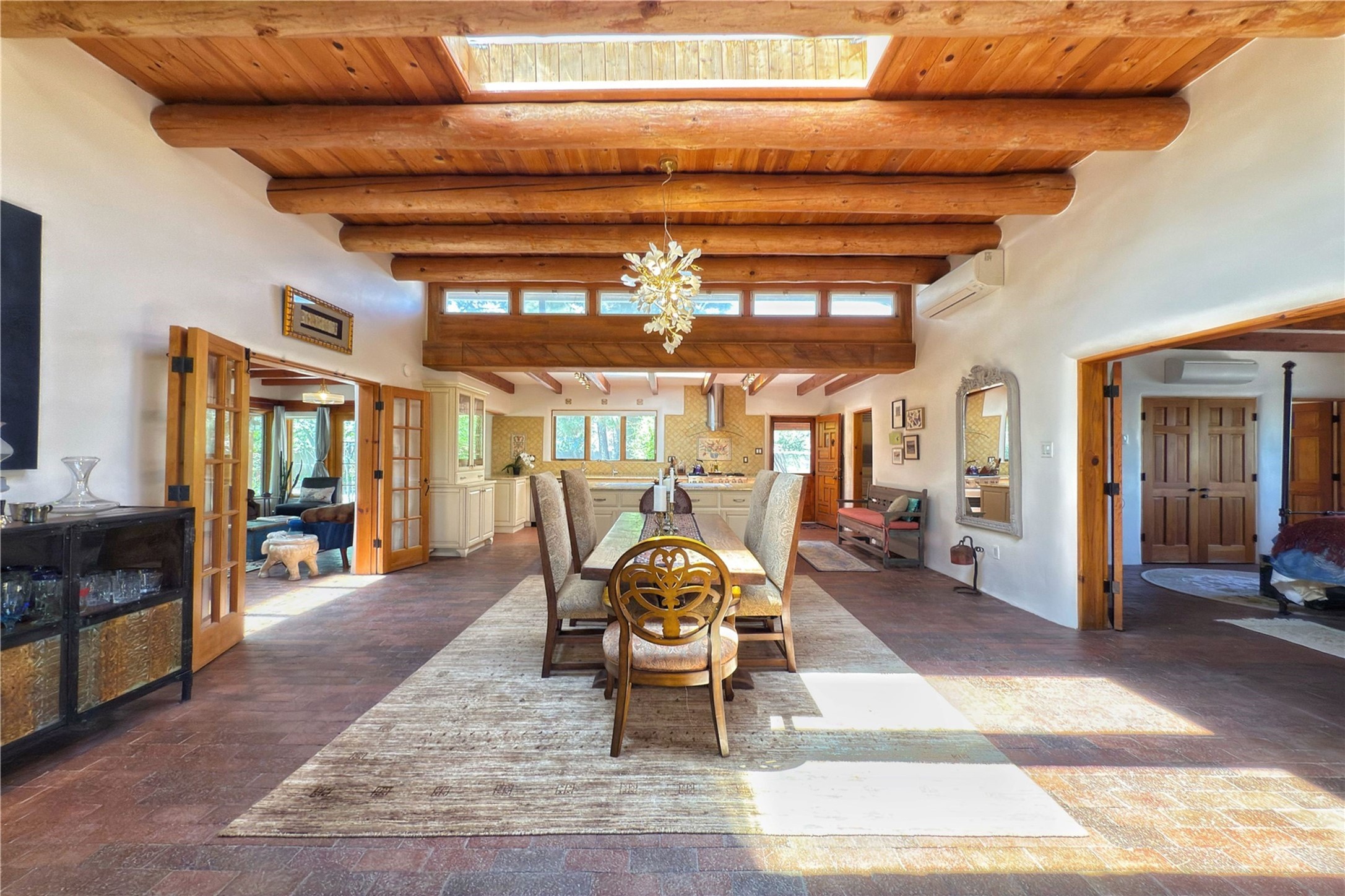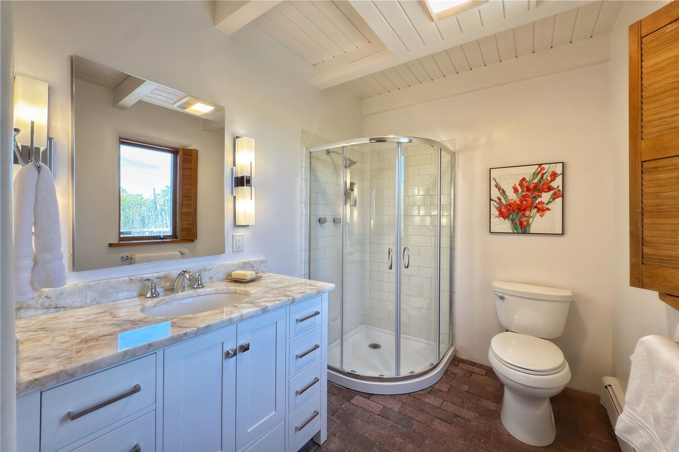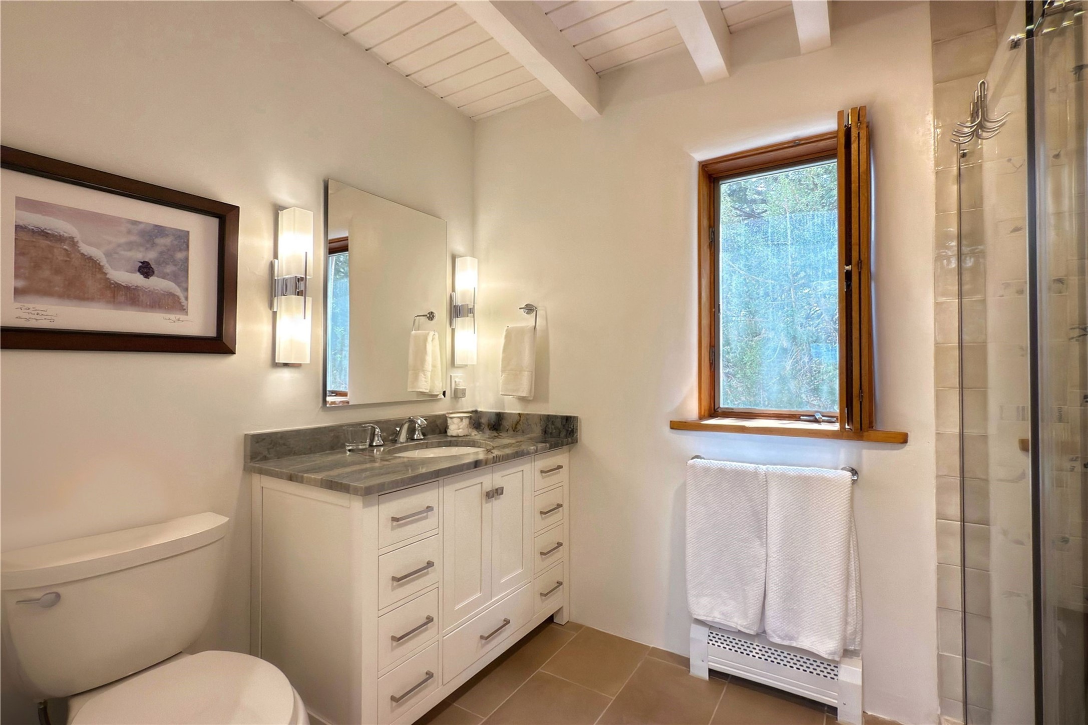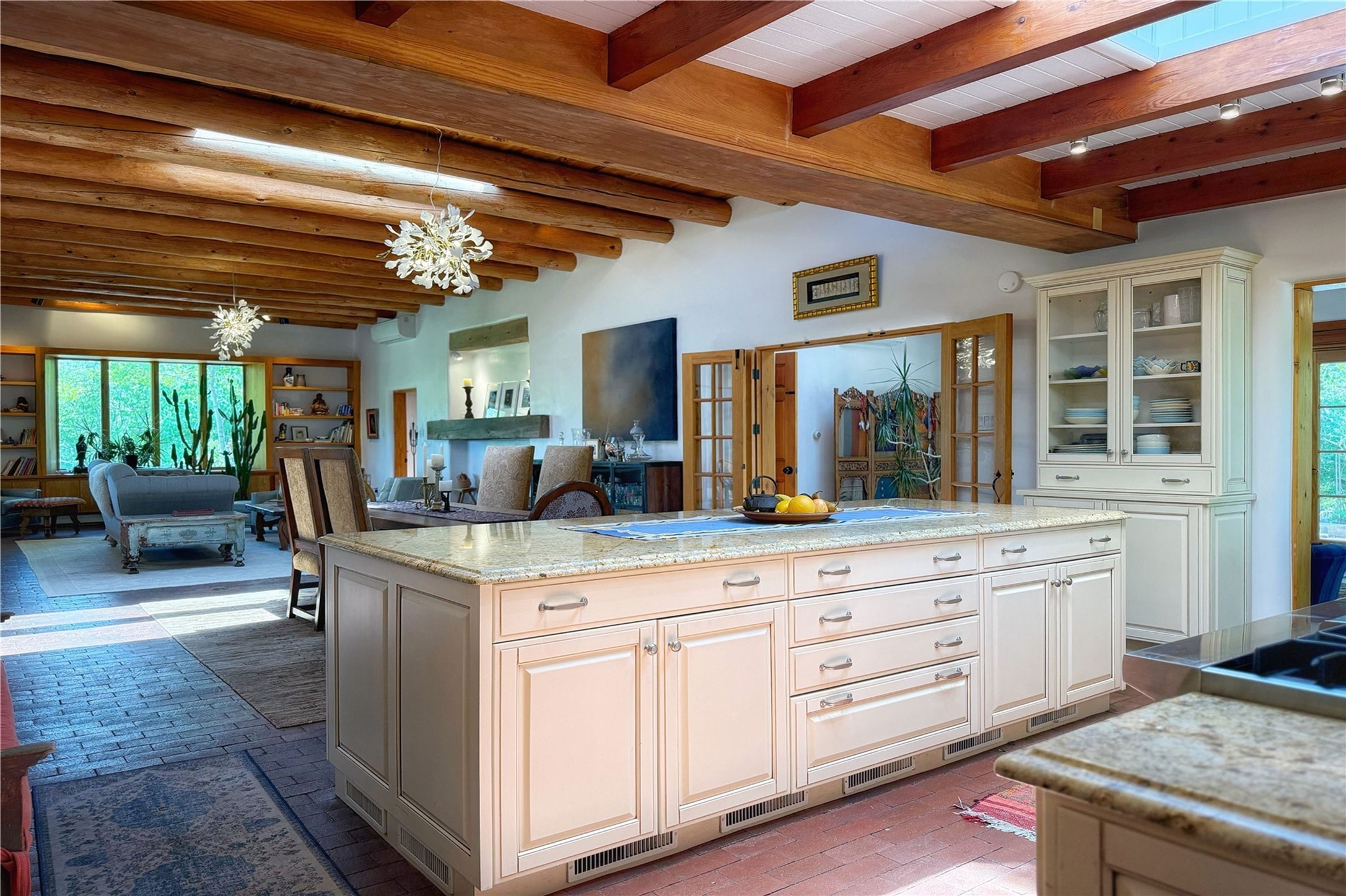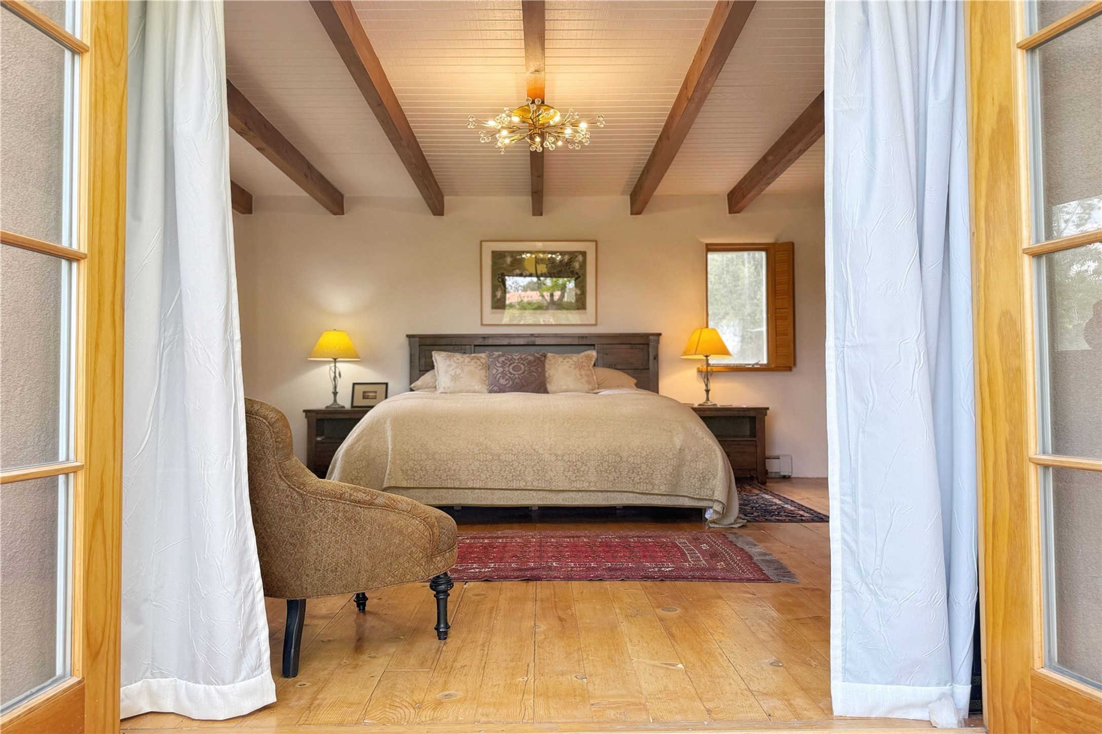 Located in the heart of the Eastside, this refined adobe sanctuary in the historic"Henderson Compound" was designed by architect Louise Walker and is sited on agenerous 0.56-acre lot, providing both privacy and panoramic views of the Sangre deCristo and Jemez Mountains. The artistic, Pueblo Revival style harmoniously blendstraditional character and modern appointments, with primary living, all on a single level.The design features a stunning great room with 10.7" ceiling and a magnificentfireplace; three spacious bedroom suites; an office, den, and sunroom in the 3,738square feet. Interiors feature wood beamed ceilings throughout, restored brick andwood floors, Italian lighting, custom wood cabinets, and large windows with exquisitetreatments that fill the home with light. The gourmet kitchen is appointed with granitecountertops, a new Sub-Zero refrigerator and W/D in the chef's pantry, while all threebathrooms have been fully renovated with marble finishes. The lower level has beencompletely reimagined with luxury finishes, including a den/living area with a bar thatopens to one of the private patios, a bedroom or second study, elegant bathroom,second W/D, and a private entrance that opens to a large patio and the orchard, forguests or personal privacy. The home is encircled by patios and walking paths, lushlandscaping with flowering beds and grasses, magnificent cedars, aspens, peach,apricot, apple and cherry trees, all are serviced by a well and a drip system. Additionalamenities include energy-efficient mini-splits, an in-wall safe, two serene outdoorfountains, outdoor shed and spiral staircase that takes you to the upgraded roof offering360 views of Santa Fe and your glorious estate. A well-lit, two-car carport and extraparking complete the home. Located just minutes from Canyon Road, this homeembodies the appeal of Santa Fe with the comfort and ease of modern living.