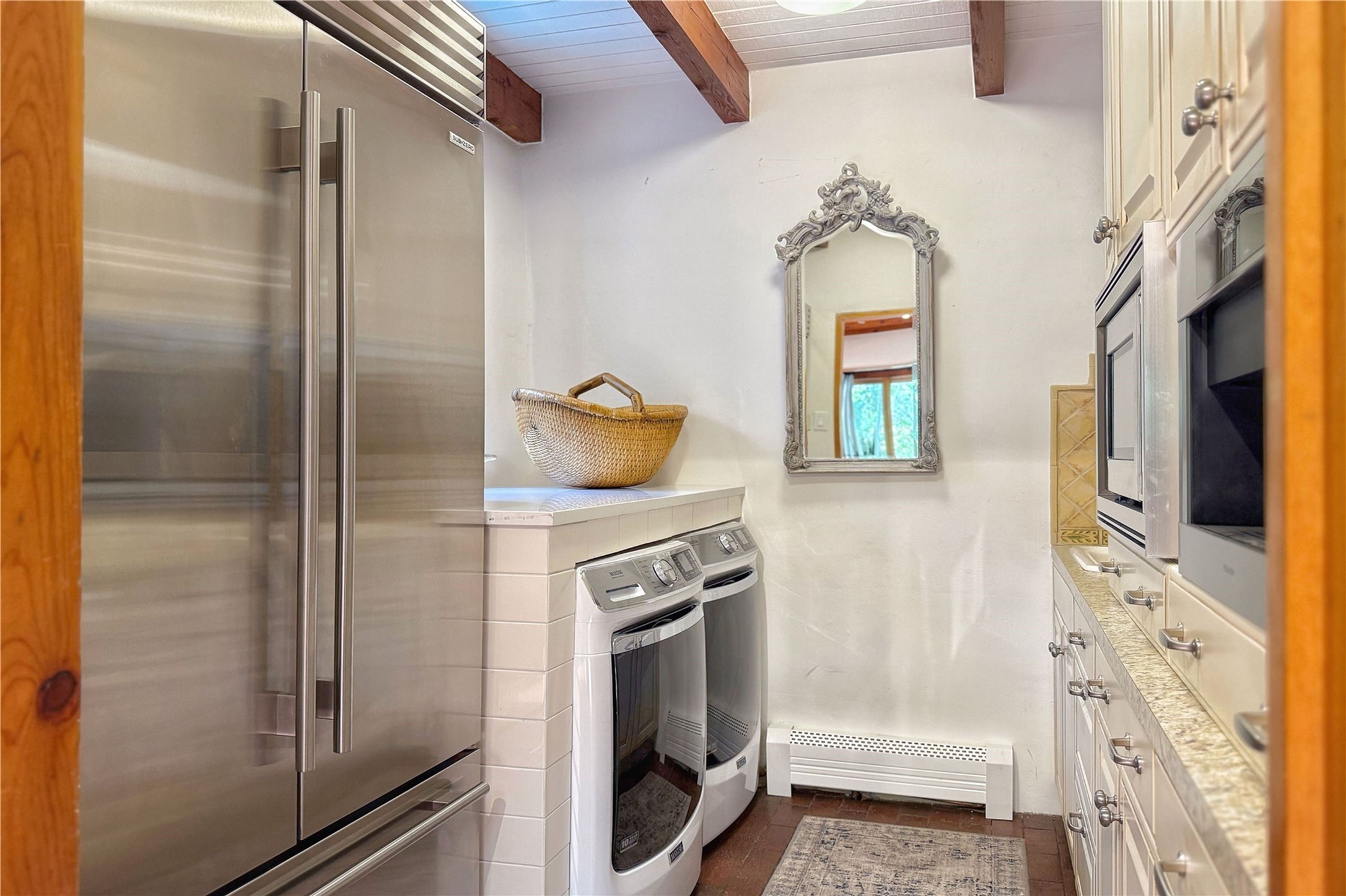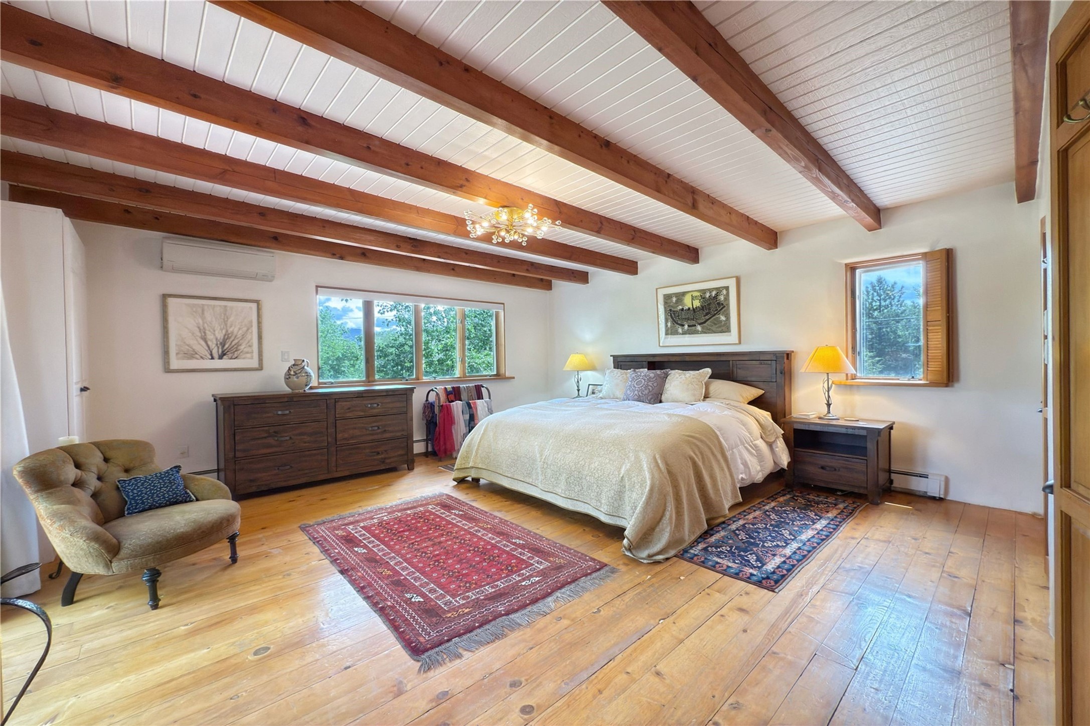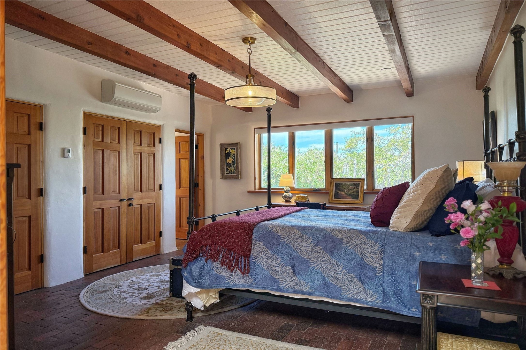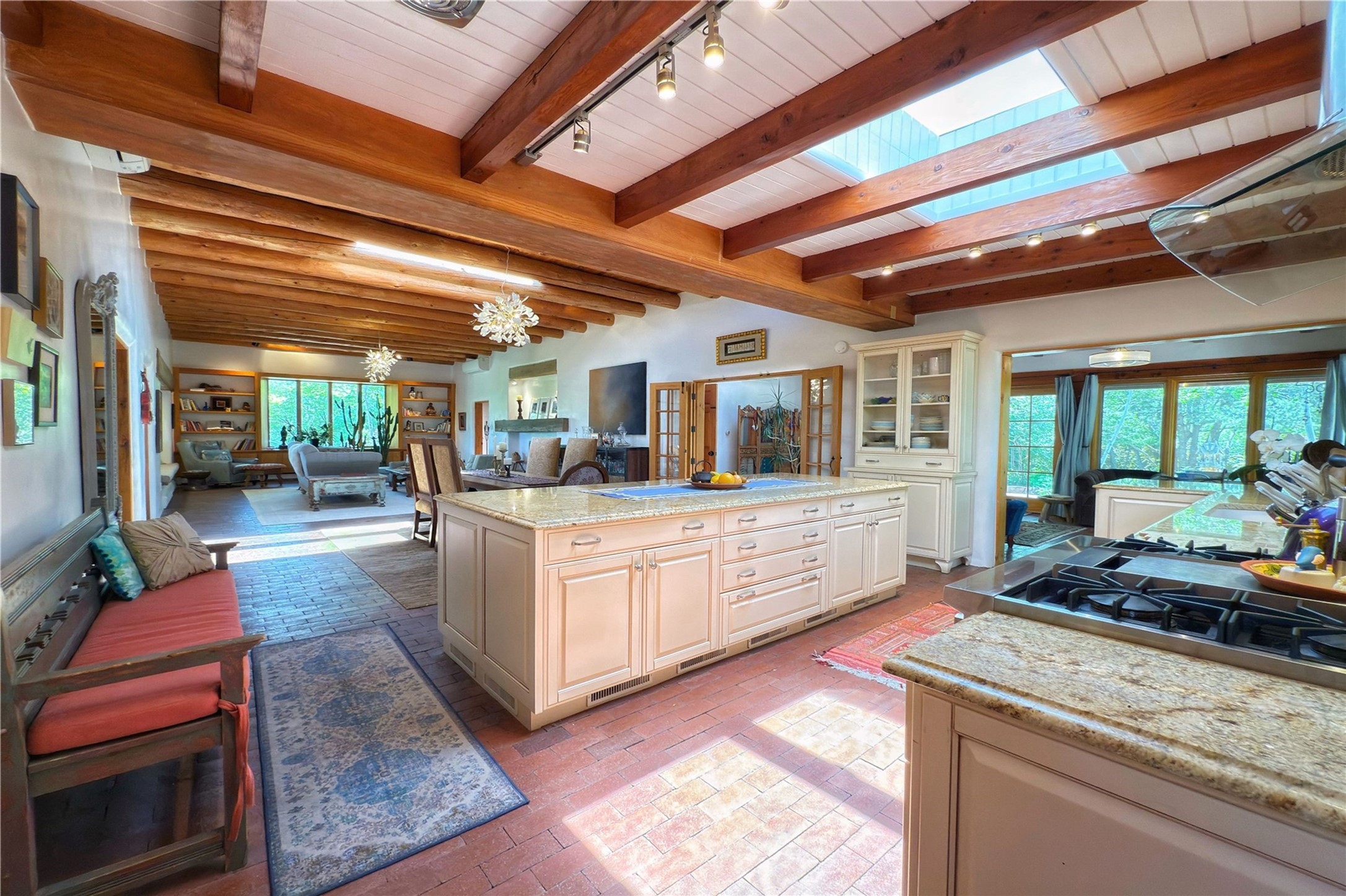 Located in the heart of the Eastside, this refined adobe sanctuary in the historic"Henderson Compound" was designed by architect Louise Walker and is sited on agenerous 0.56-acre lot, providing both privacy and panoramic views of the Sangre deCristo and Jemez Mountains. The artistic, Pueblo Revival style harmoniously blendstraditional character and modern appointments, with primary living, all on a single level.The design features a stunning great room with 10.7" ceiling and a magnificentfireplace; three spacious bedroom suites; an office, den, and sunroom in the 3,738square feet. Interiors feature wood beamed ceilings throughout, restored brick andwood floors, Italian lighting, custom wood cabinets, and large windows with exquisitetreatments that fill the home with light. The gourmet kitchen is appointed with granitecountertops, a new Sub-Zero refrigerator and W/D in the chef's pantry, while all threebathrooms have been fully renovated with marble finishes. The lower level has beencompletely reimagined with luxury finishes, including a den/living area with a bar thatopens to one of the private patios, a bedroom or second study, elegant bathroom,second W/D, and a private entrance that opens to a large patio and the orchard, forguests or personal privacy. The home is encircled by patios and walking paths, lushlandscaping with flowering beds and grasses, magnificent cedars, aspens, peach,apricot, apple and cherry trees, all are serviced by a well and a drip system. Additionalamenities include energy-efficient mini-splits, an in-wall safe, two serene outdoorfountains, outdoor shed and spiral staircase that takes you to the upgraded roof offering360 views of Santa Fe and your glorious estate. A well-lit, two-car carport and extraparking complete the home. Located just minutes from Canyon Road, this homeembodies the appeal of Santa Fe with the comfort and ease of modern living.