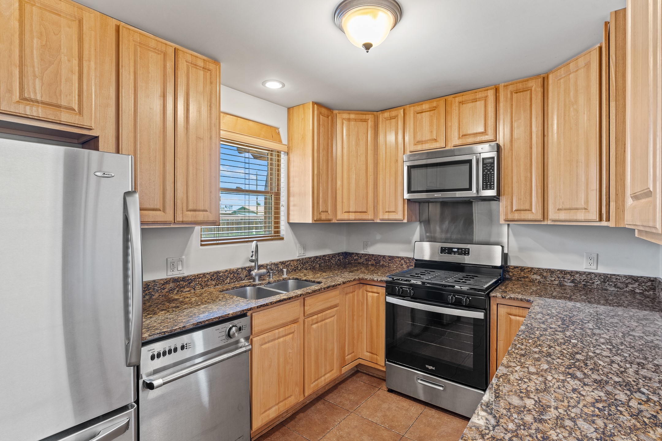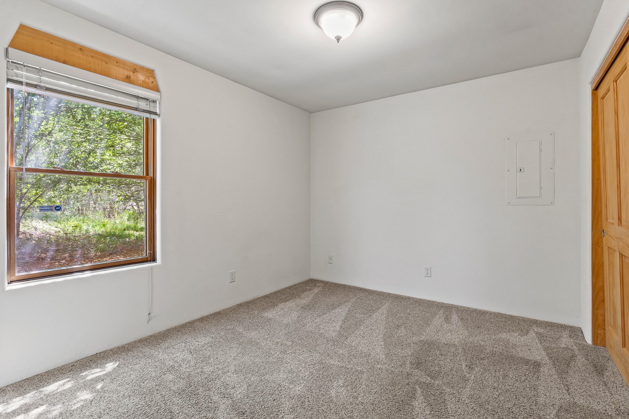 A versatile and charming property featuring a 3-bedroom, 2-bath main house plus a separate 1-bedroom, 1-bath guest house; ideal for rental income, extended family, or a home studio. The main house offers a spacious living area with tile floors, wood-beamed ceilings, and a traditional kiva fireplace, opening into the dining and kitchen area and a lovely covered patio area in a fully fenced yard. The primary suite includes a private bath and walk-in closet. A two-car garage adds to the flexible usage of the property. The guest house has its own entrance and includes a living area, kitchenette, bedroom, and full bath. There is also a washer / dryer hook-up, and it is separately metered. Centrally located, less than a 10-minute walk to restaurants such as Escondido and Tumbleroot Brewery, and a 10-minute drive to the Plaza.