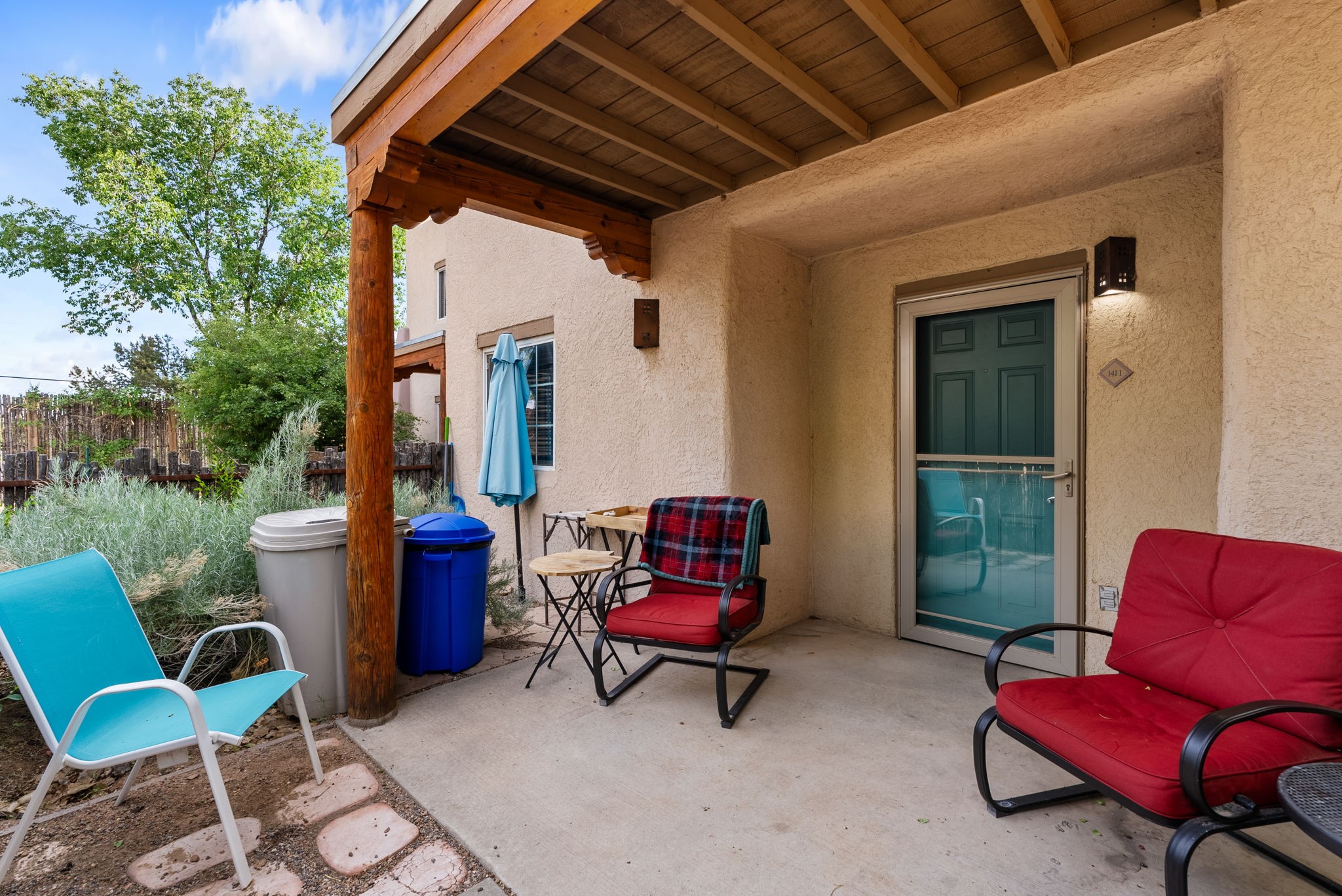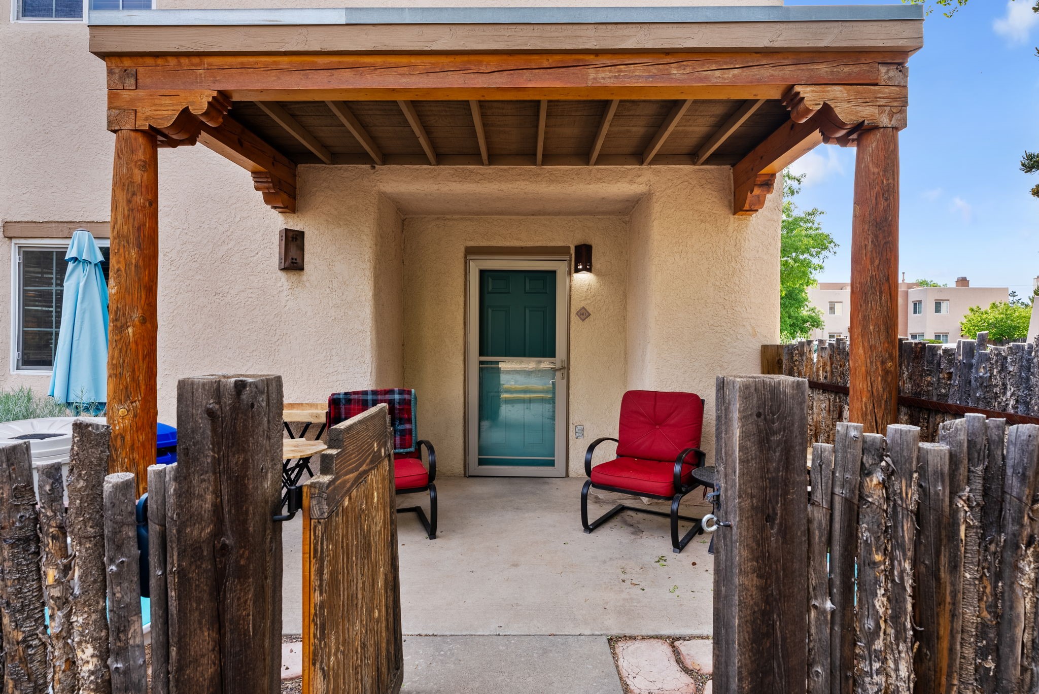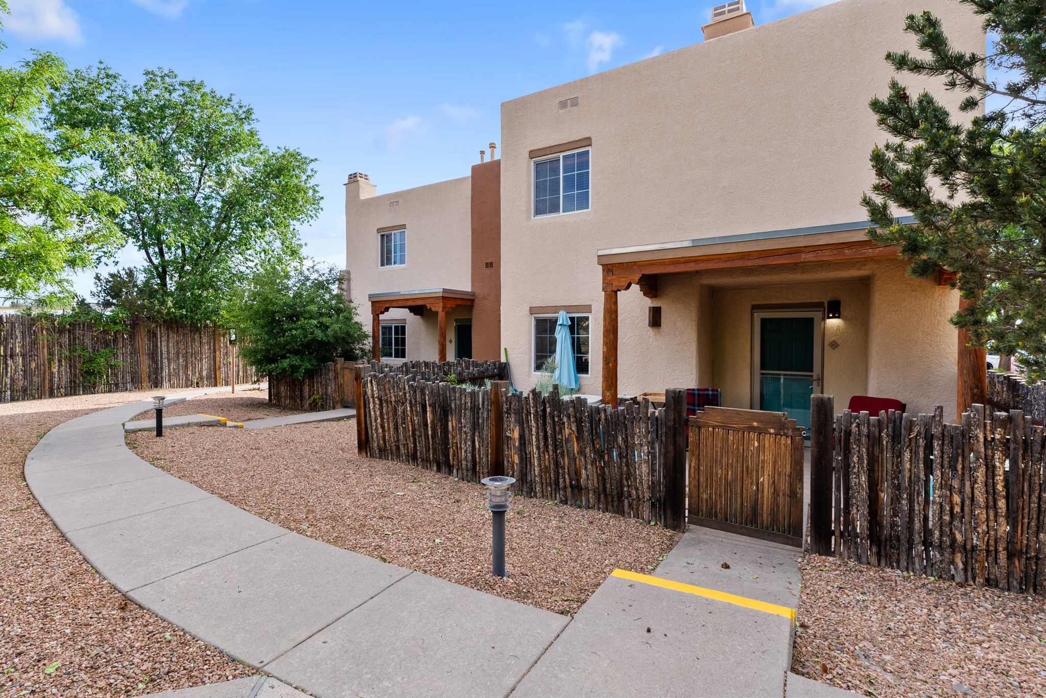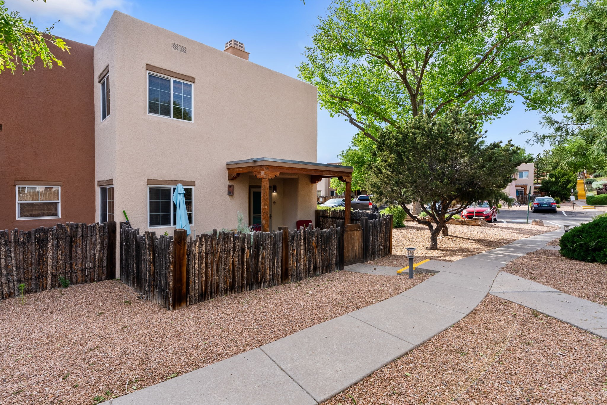 Welcome to your serene retreat in the coveted, gated community of Dos Santos. This charming two-story condo offers the perfect blend of comfort, style, and convenience. Step inside to find a warm, inviting living space with elegant tile floors and a cozy wood-burning fireplace--ideal for relaxing evenings or entertaining guests. The kitchen is well-appointed with newer appliances, making meal prep a delight.Upstairs, you'll find two spacious bedrooms. The Primary bedroom has an ensuite full bathroom and the second bath is at the top of the stairs. There are lovely views from every window. Generous closet space provides plenty of room for storage, and the upstairs laundry closet with washer and dryer adds everyday convenience.Enjoy your own enclosed courtyard for morning coffee or a quiet evening under the stars.As a resident of Dos Santos, you'll have access to outstanding amenities including a heated saltwater pool, hot tub, community center, modern fitness facilities, outdoor entertainment pavilions with grills, peaceful walking paths, and even a dedicated off-leash dog run. All this, just minutes from Santa Fe's vibrant shopping, dining, and cultural attractions.Don't miss your opportunity to own a piece of Santa Fe living at its finest!