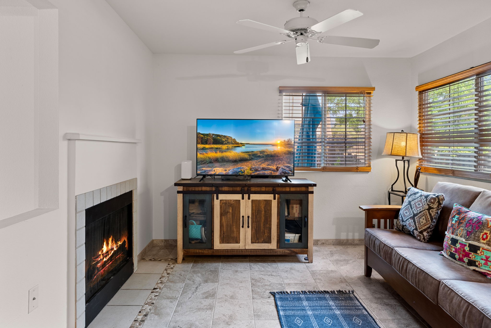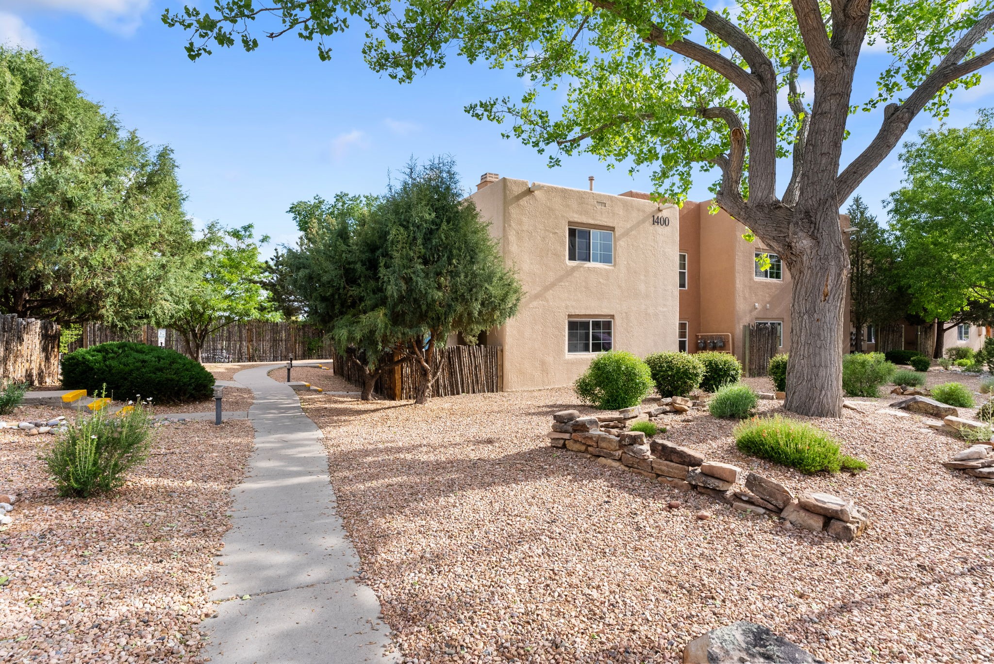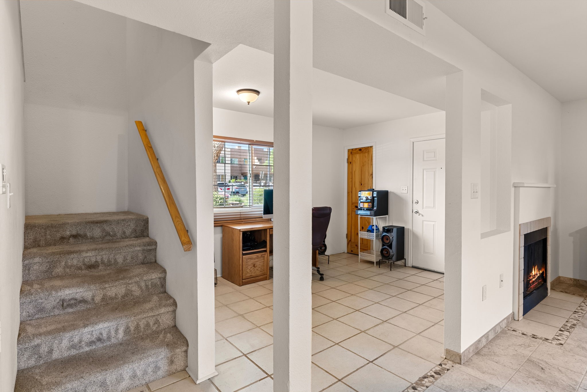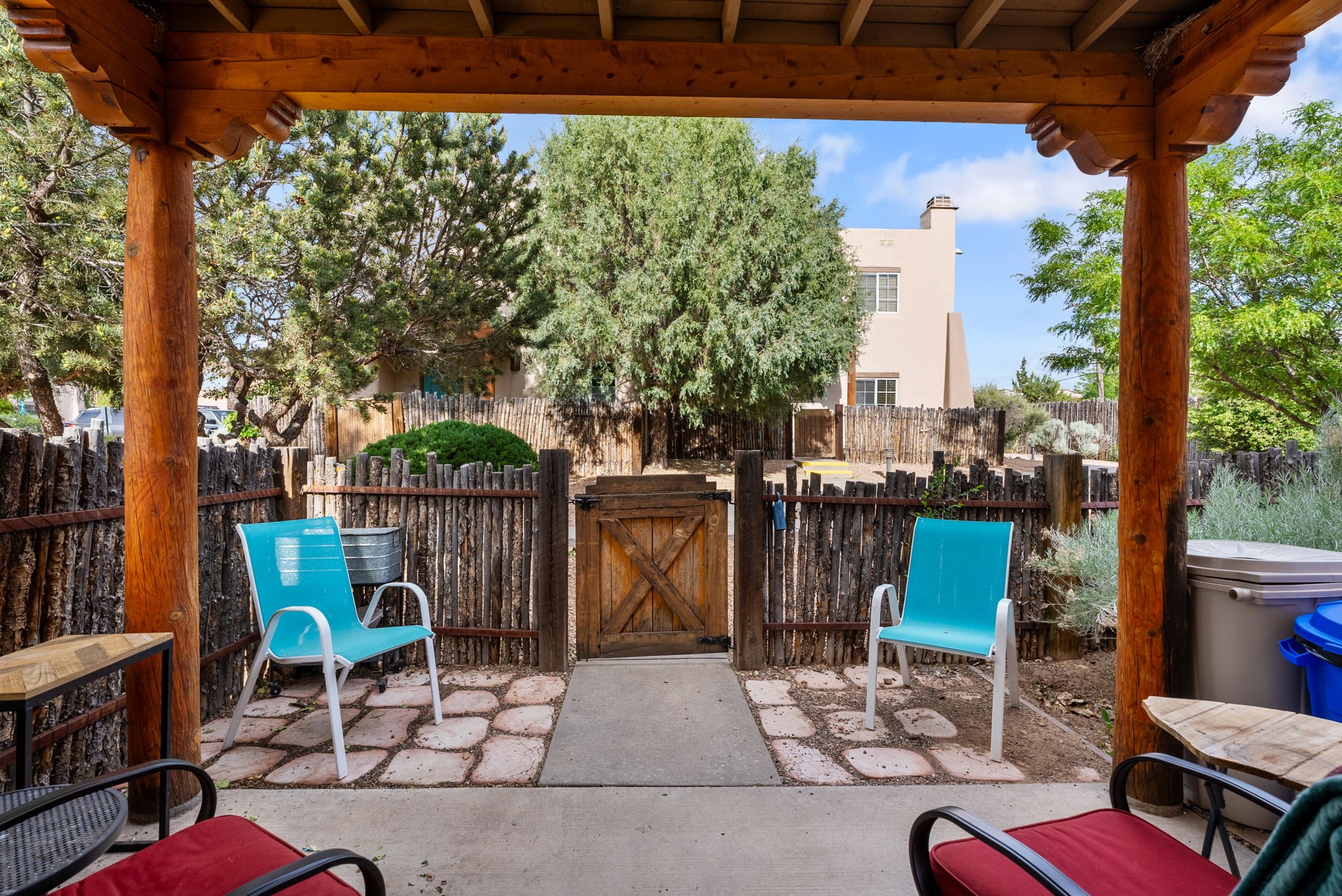 Welcome to your serene retreat in the coveted, gated community of Dos Santos. This charming two-story condo offers the perfect blend of comfort, style, and convenience. Step inside to find a warm, inviting living space with elegant tile floors and a cozy wood-burning fireplace--ideal for relaxing evenings or entertaining guests. The kitchen is well-appointed with newer appliances, making meal prep a delight.Upstairs, you'll find two spacious bedrooms. The Primary bedroom has an ensuite full bathroom and the second bath is at the top of the stairs. There are lovely views from every window. Generous closet space provides plenty of room for storage, and the upstairs laundry closet with washer and dryer adds everyday convenience.Enjoy your own enclosed courtyard for morning coffee or a quiet evening under the stars.As a resident of Dos Santos, you'll have access to outstanding amenities including a heated saltwater pool, hot tub, community center, modern fitness facilities, outdoor entertainment pavilions with grills, peaceful walking paths, and even a dedicated off-leash dog run. All this, just minutes from Santa Fe's vibrant shopping, dining, and cultural attractions.Don't miss your opportunity to own a piece of Santa Fe living at its finest!
