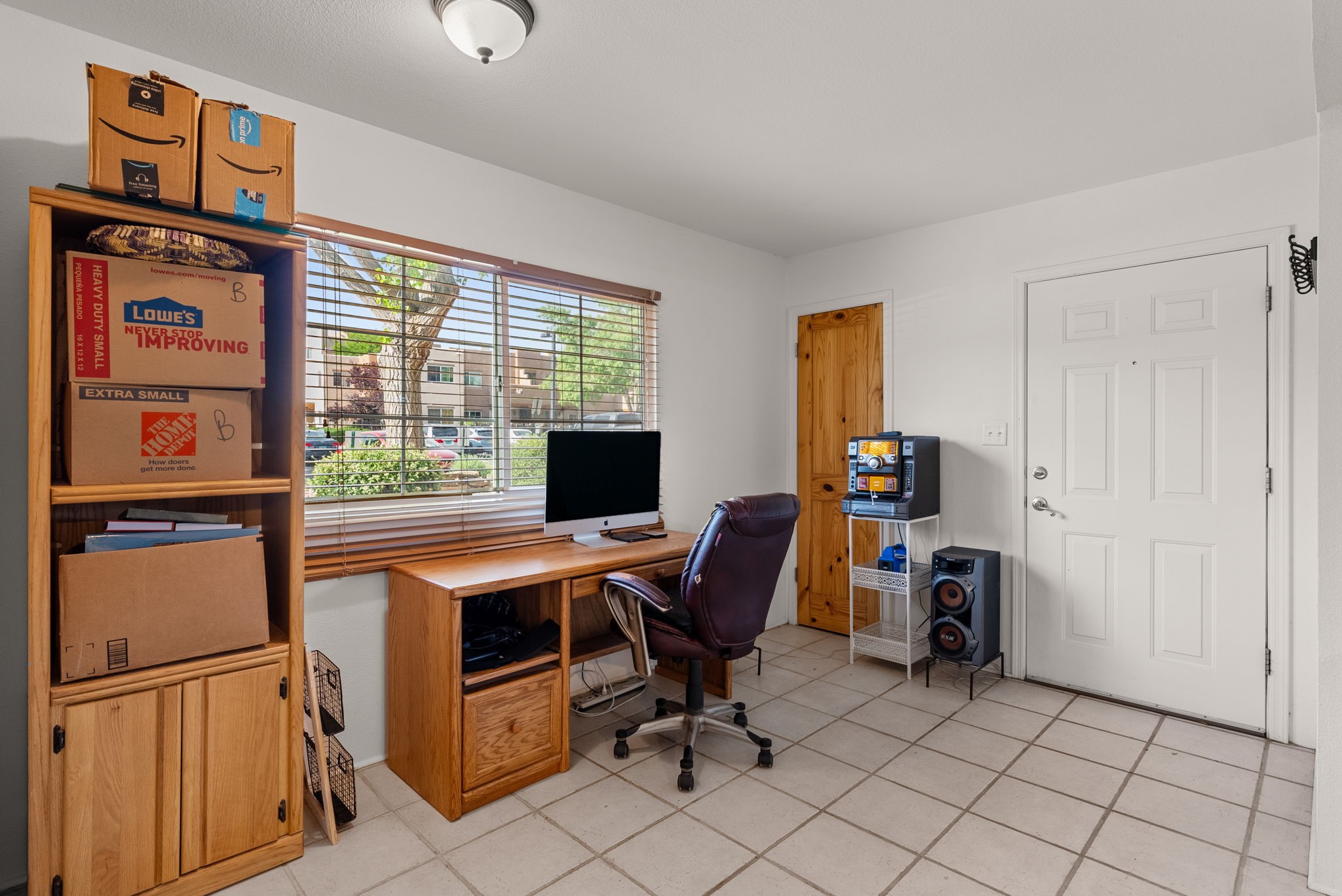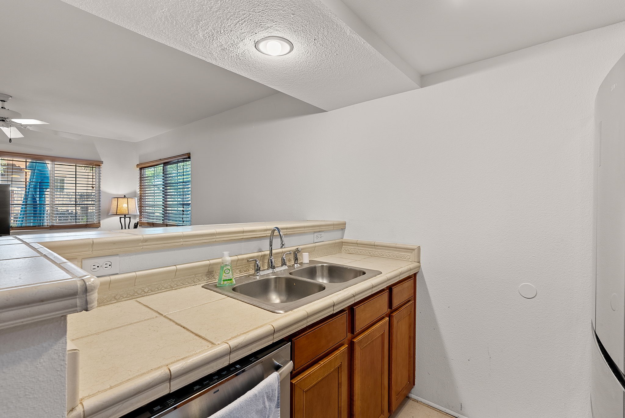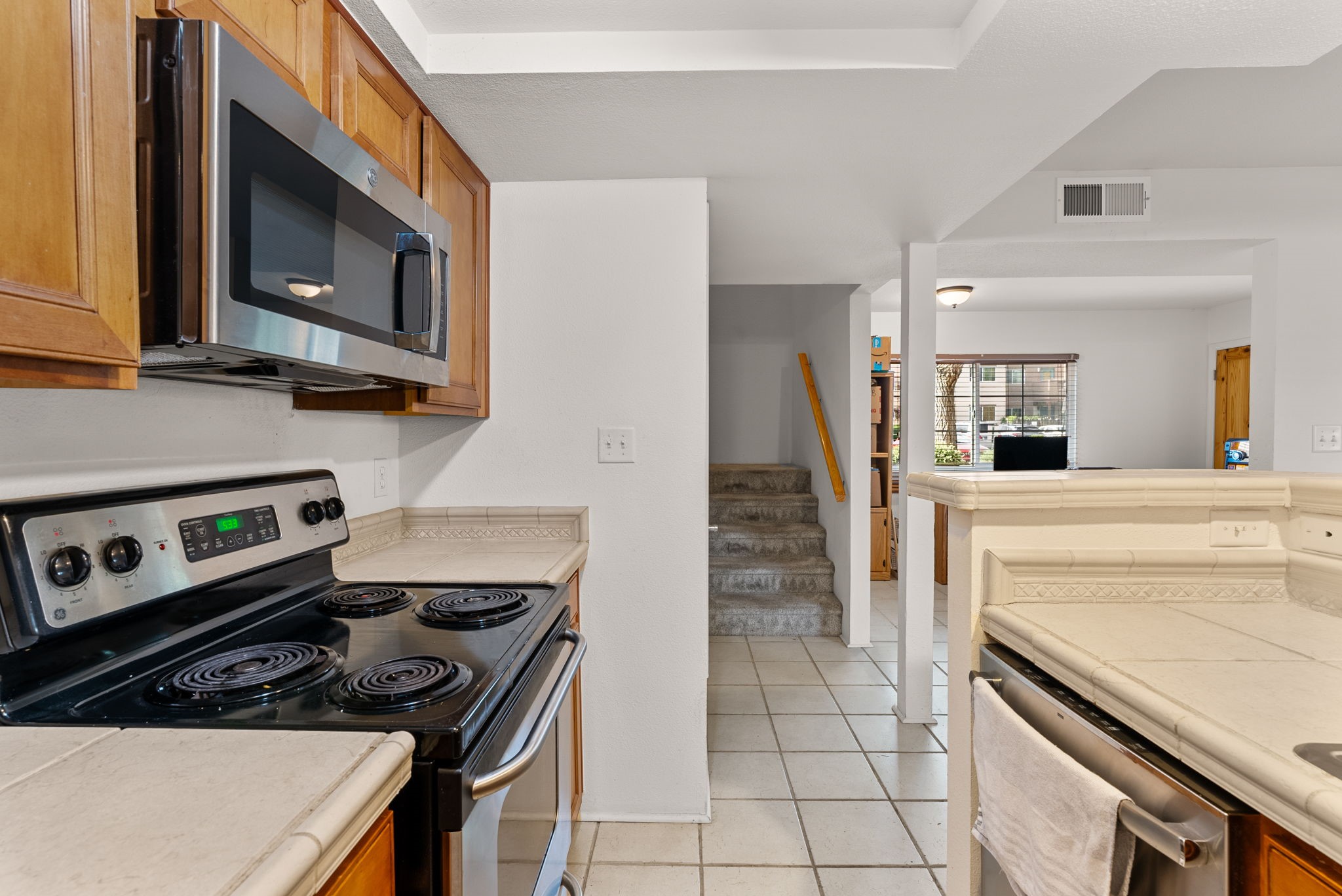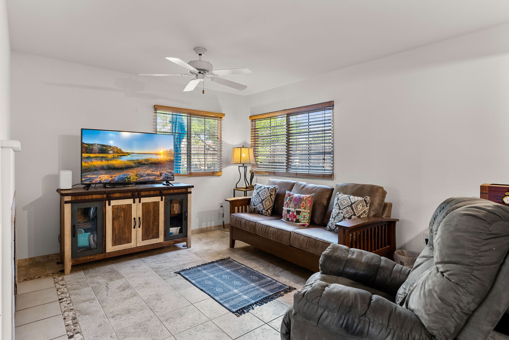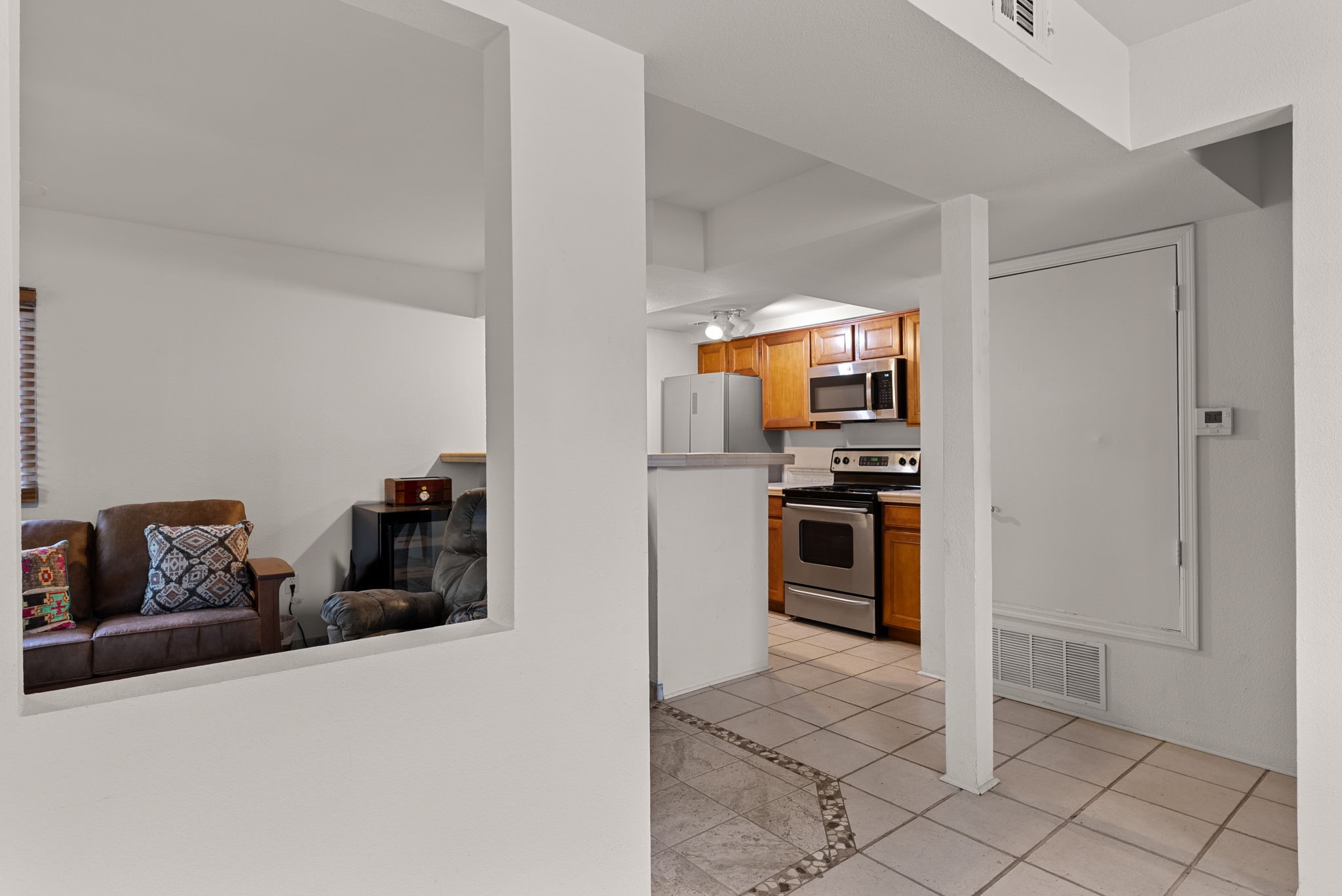 Welcome to your serene retreat in the coveted, gated community of Dos Santos. This charming two-story condo offers the perfect blend of comfort, style, and convenience. Step inside to find a warm, inviting living space with elegant tile floors and a cozy wood-burning fireplace--ideal for relaxing evenings or entertaining guests. The kitchen is well-appointed with newer appliances, making meal prep a delight.Upstairs, you'll find two spacious bedrooms. The Primary bedroom has an ensuite full bathroom and the second bath is at the top of the stairs. There are lovely views from every window. Generous closet space provides plenty of room for storage, and the upstairs laundry closet with washer and dryer adds everyday convenience.Enjoy your own enclosed courtyard for morning coffee or a quiet evening under the stars.As a resident of Dos Santos, you'll have access to outstanding amenities including a heated saltwater pool, hot tub, community center, modern fitness facilities, outdoor entertainment pavilions with grills, peaceful walking paths, and even a dedicated off-leash dog run. All this, just minutes from Santa Fe's vibrant shopping, dining, and cultural attractions.Don't miss your opportunity to own a piece of Santa Fe living at its finest!