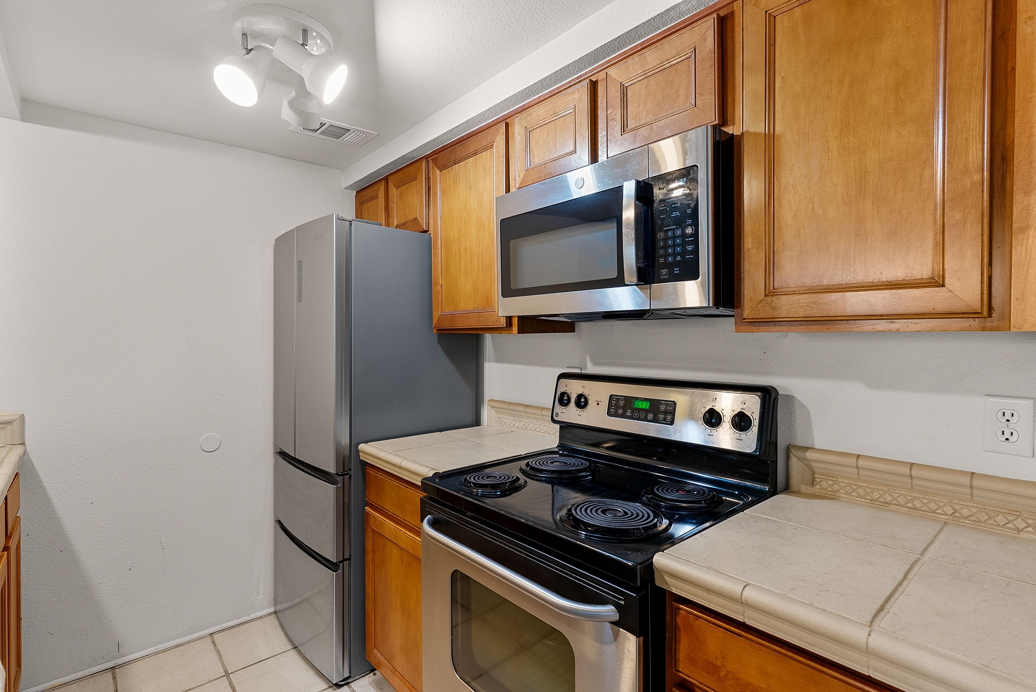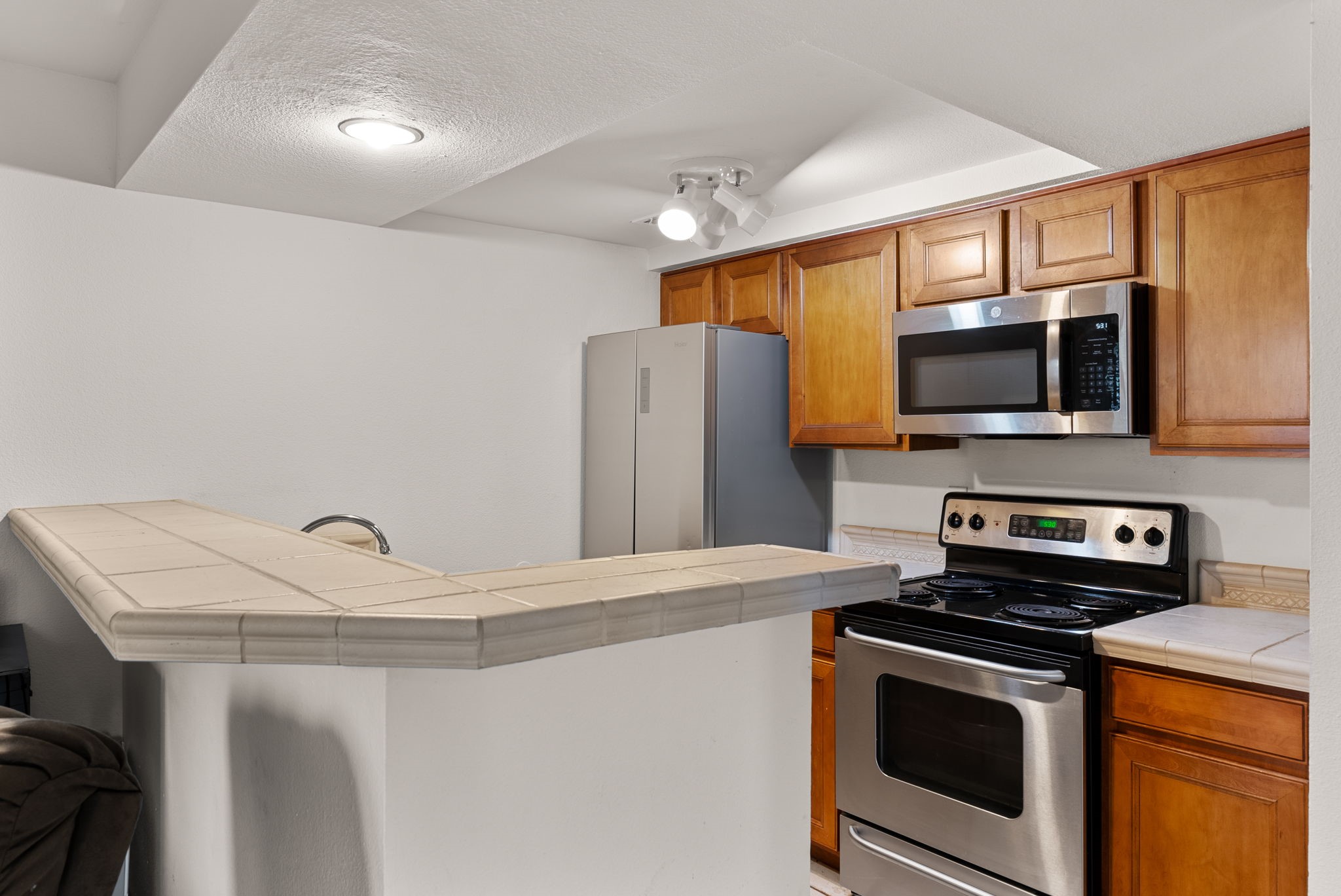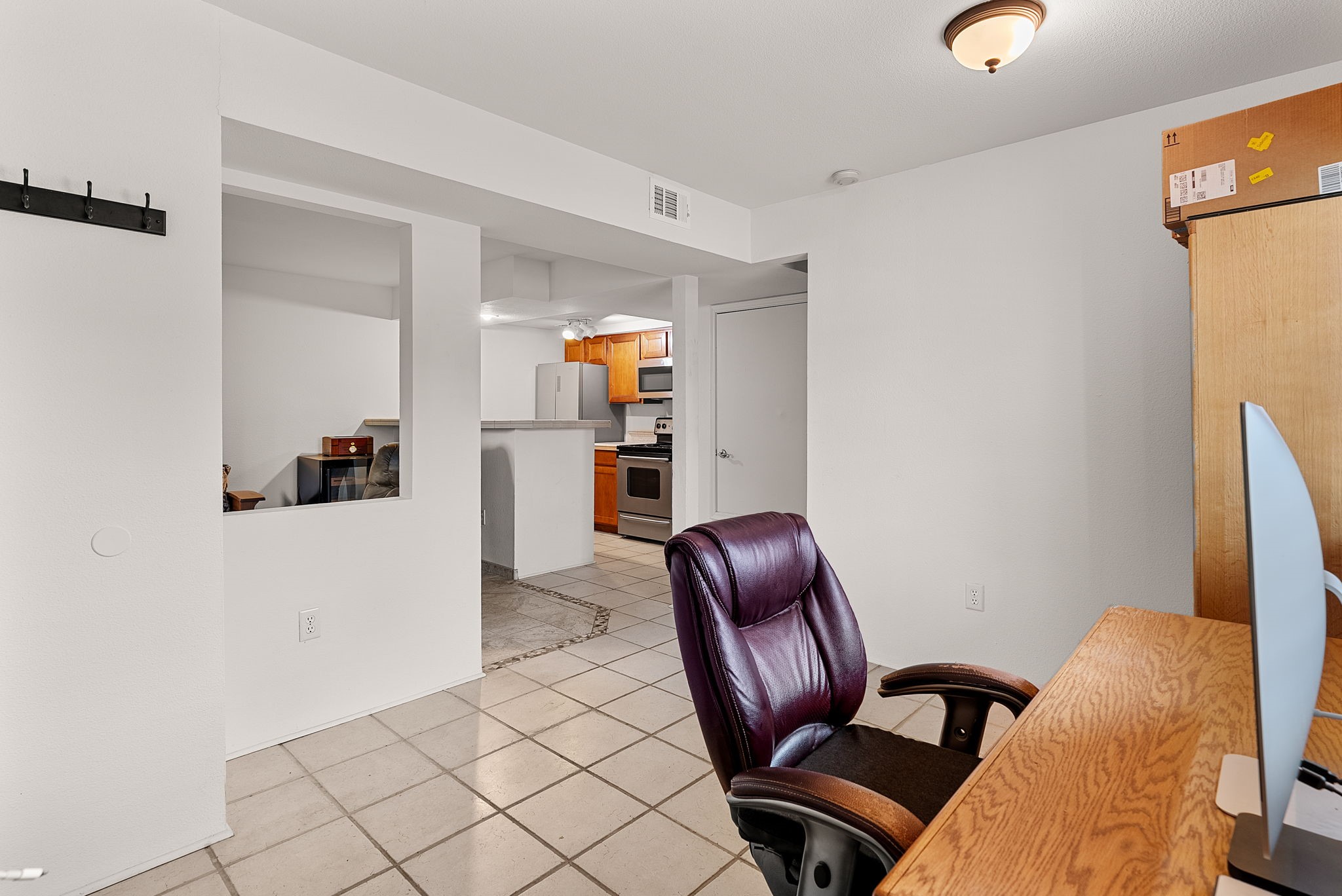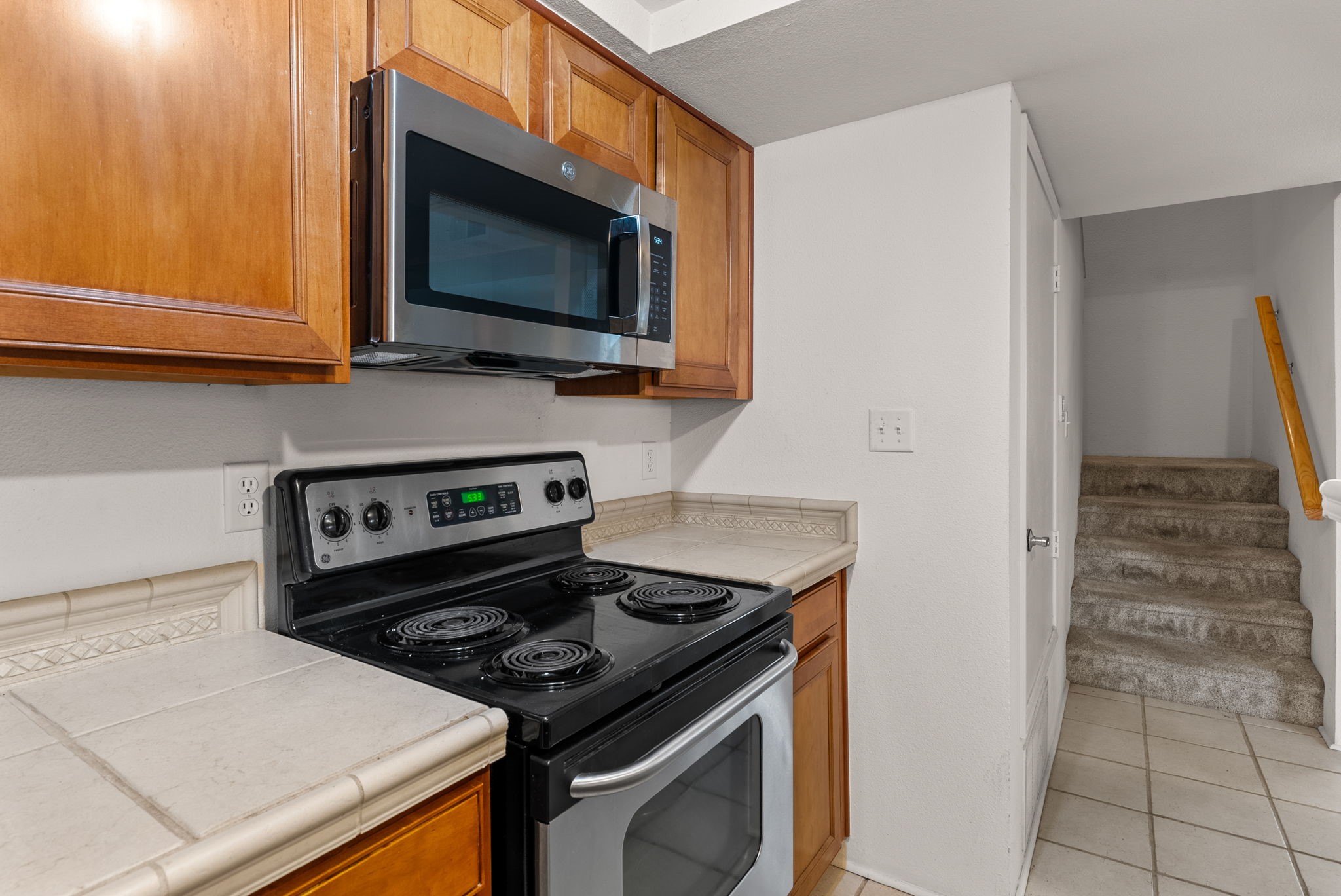 Welcome to your serene retreat in the coveted, gated community of Dos Santos. This charming two-story condo offers the perfect blend of comfort, style, and convenience. Step inside to find a warm, inviting living space with elegant tile floors and a cozy wood-burning fireplace--ideal for relaxing evenings or entertaining guests. The kitchen is well-appointed with newer appliances, making meal prep a delight.Upstairs, you'll find two spacious bedrooms. The Primary bedroom has an ensuite full bathroom and the second bath is at the top of the stairs. There are lovely views from every window. Generous closet space provides plenty of room for storage, and the upstairs laundry closet with washer and dryer adds everyday convenience.Enjoy your own enclosed courtyard for morning coffee or a quiet evening under the stars.As a resident of Dos Santos, you'll have access to outstanding amenities including a heated saltwater pool, hot tub, community center, modern fitness facilities, outdoor entertainment pavilions with grills, peaceful walking paths, and even a dedicated off-leash dog run. All this, just minutes from Santa Fe's vibrant shopping, dining, and cultural attractions.Don't miss your opportunity to own a piece of Santa Fe living at its finest!