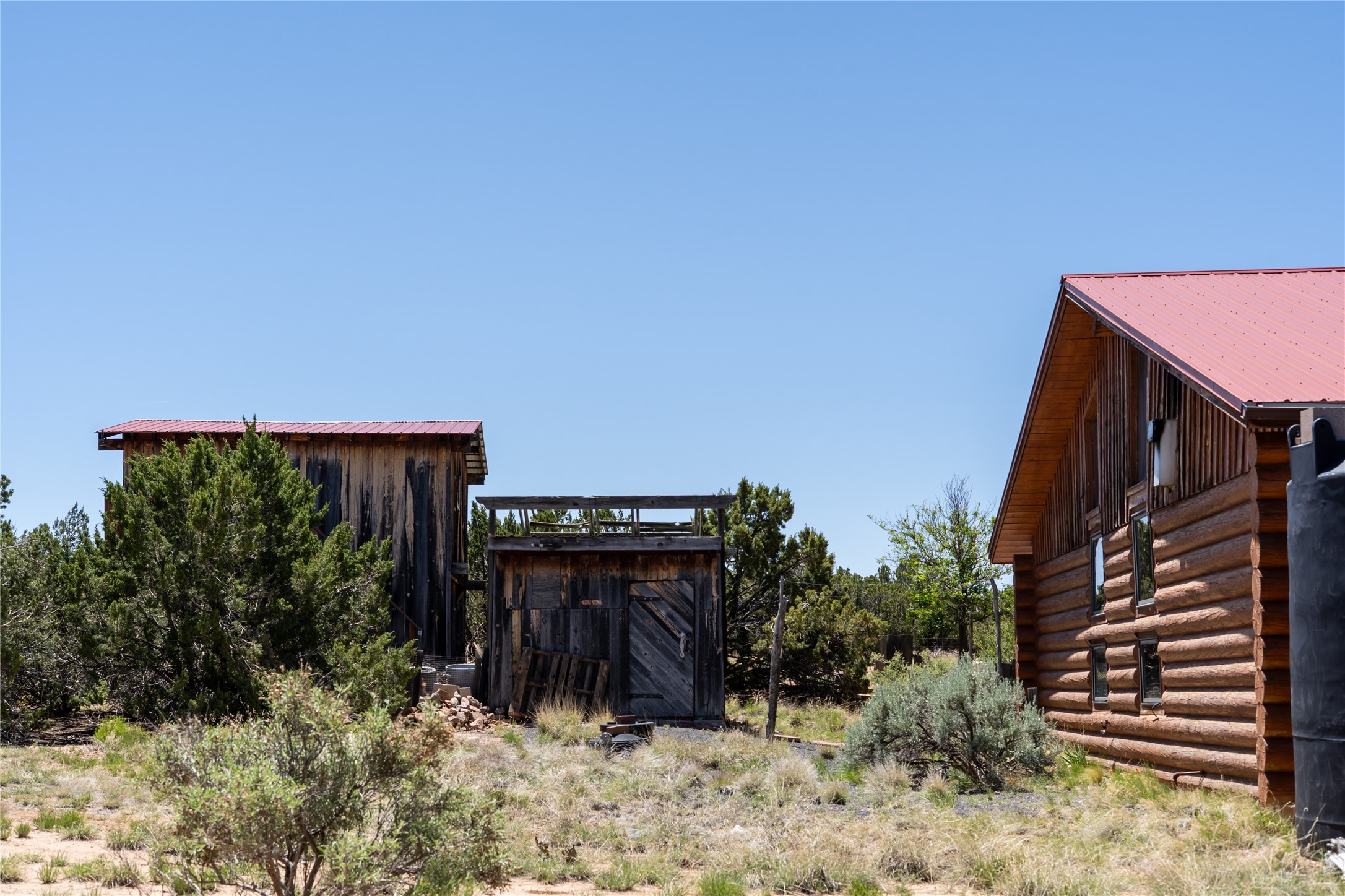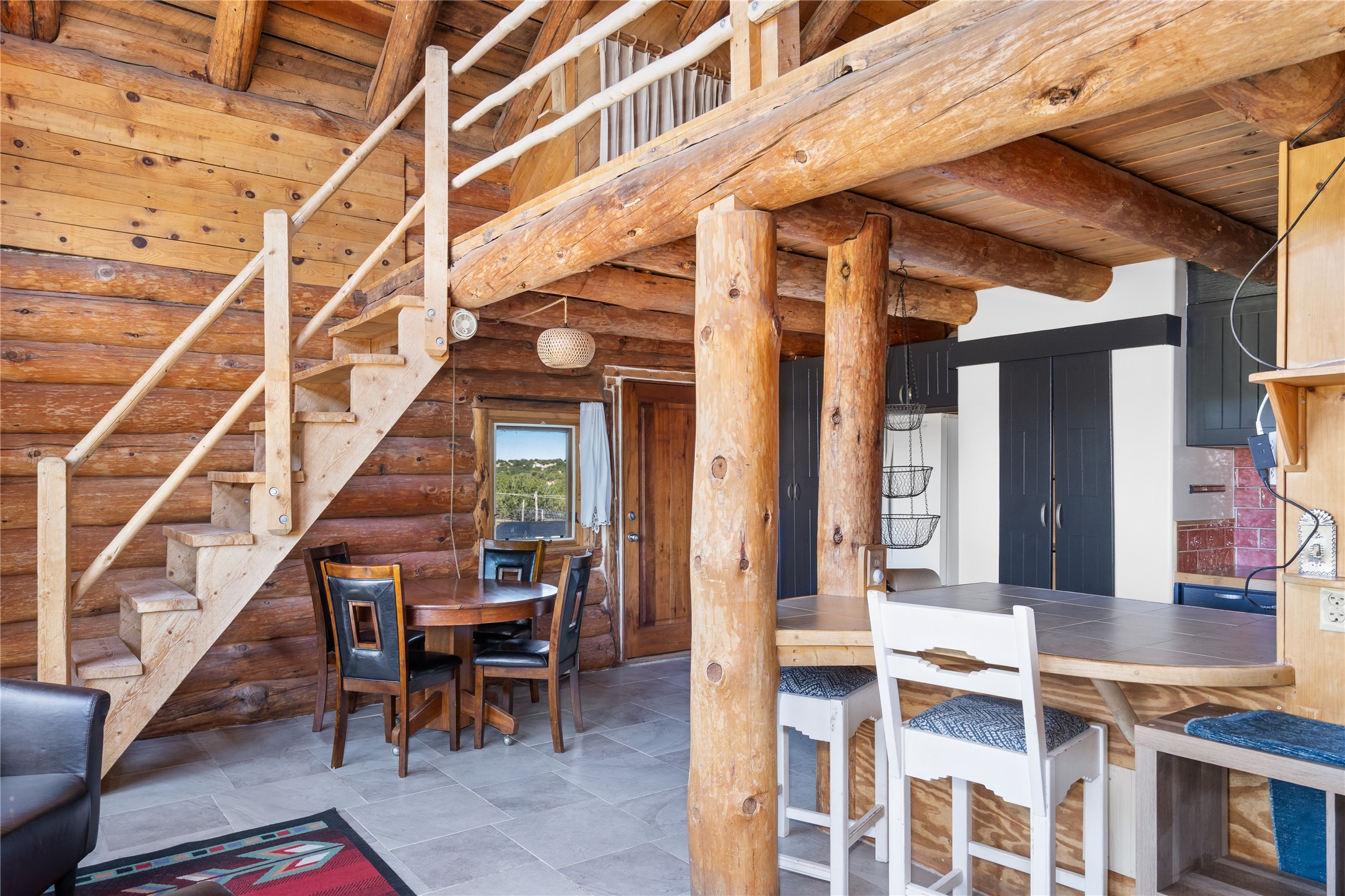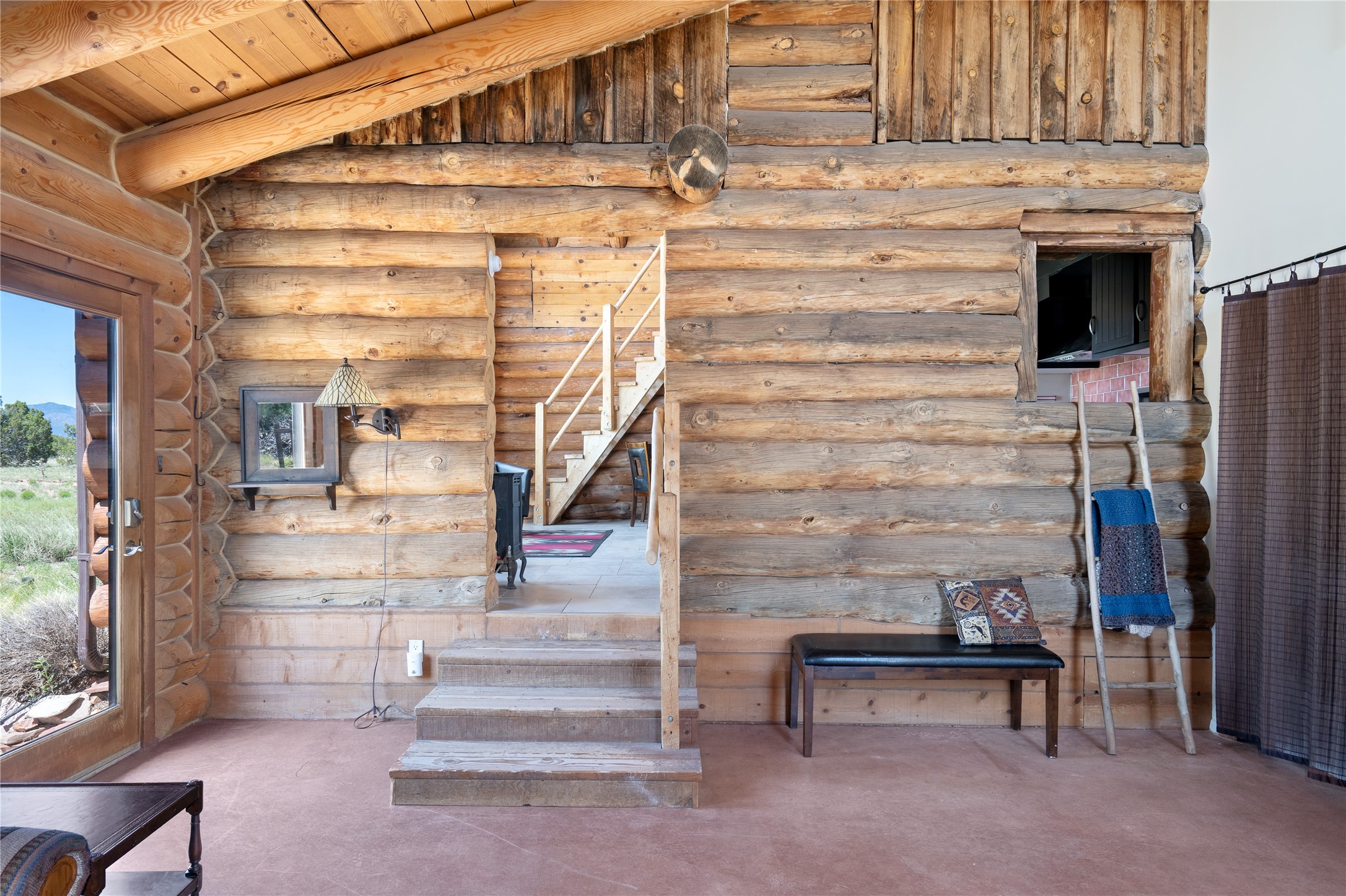 Escape to your private slice of the Wild West with this stunning 2-story, 2-bedroom, 2-bathroom true log cabin. Nestled on over 10 sprawling acres with an enviable address on the historic Camino Los Abuelos, this home is surrounded by wide open skies and rolling desert terrain, and enjoys paved road the whole way to the driveway.Step inside and enjoy the warmth of handcrafted log walls, soaring ceilings, and a cozy wood-burning stove. Downstairs, a well-appointed kitchen flows into 2 living spaces, the primary suite, and an unfinished sunroom. Upstairs, a spacious loft-style bedroom with its own 3/4 bath is perched, awaiting your southwestern accents.Whether you're sipping coffee on the porch, stargazing in the clear New Mexico skies, or exploring your very own high desert acreage, this home is a true retreat. Ideal for artists, adventurers, homesteaders, or anyone craving solitude and inspiration. Located within minutes of the San Marcos Feed Store and Beer Creek Brewery, and close enough to Santa Fe's rich culture, galleries, and cuisine--but far enough to enjoy peace, privacy, and panoramic views.