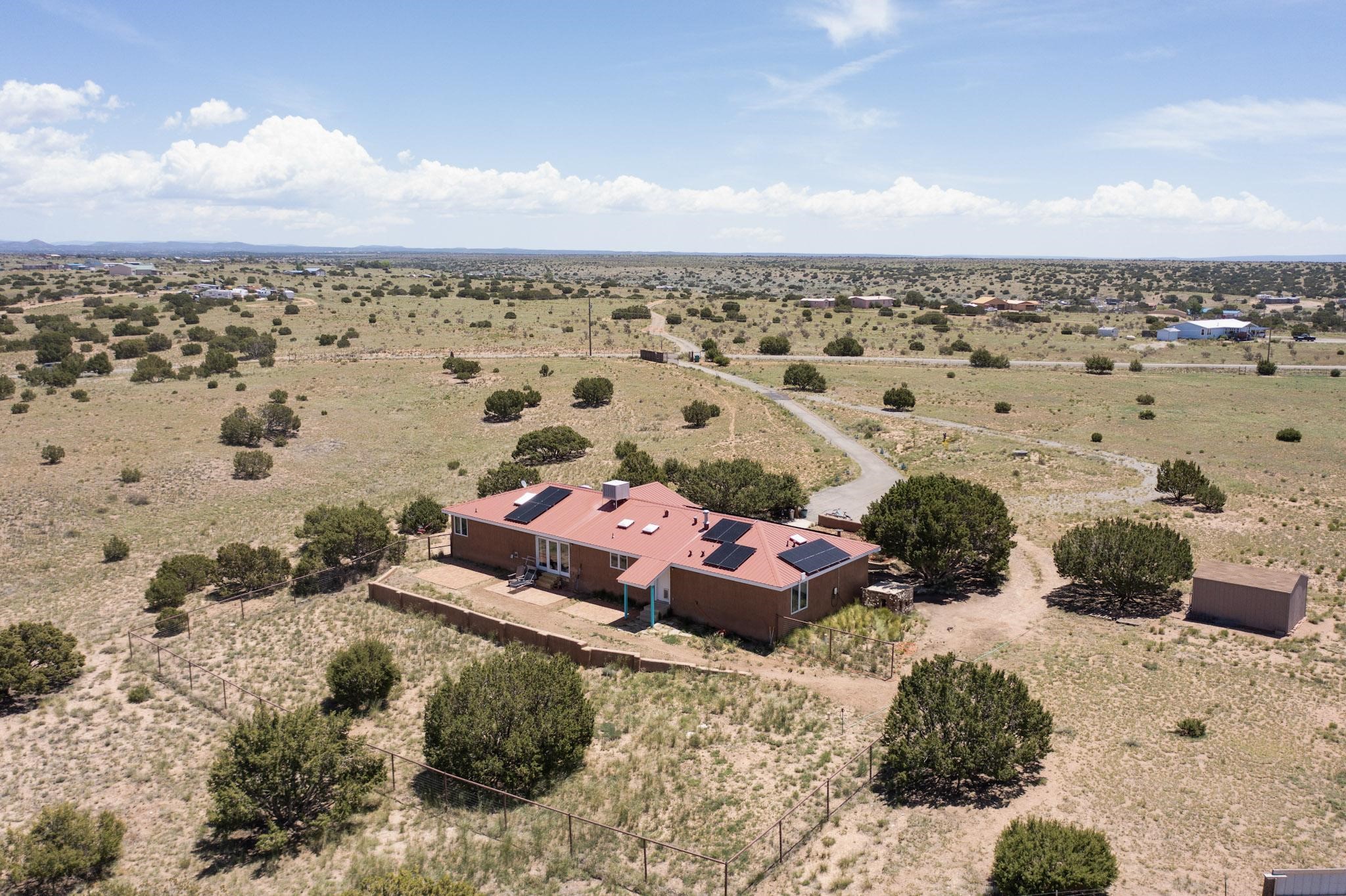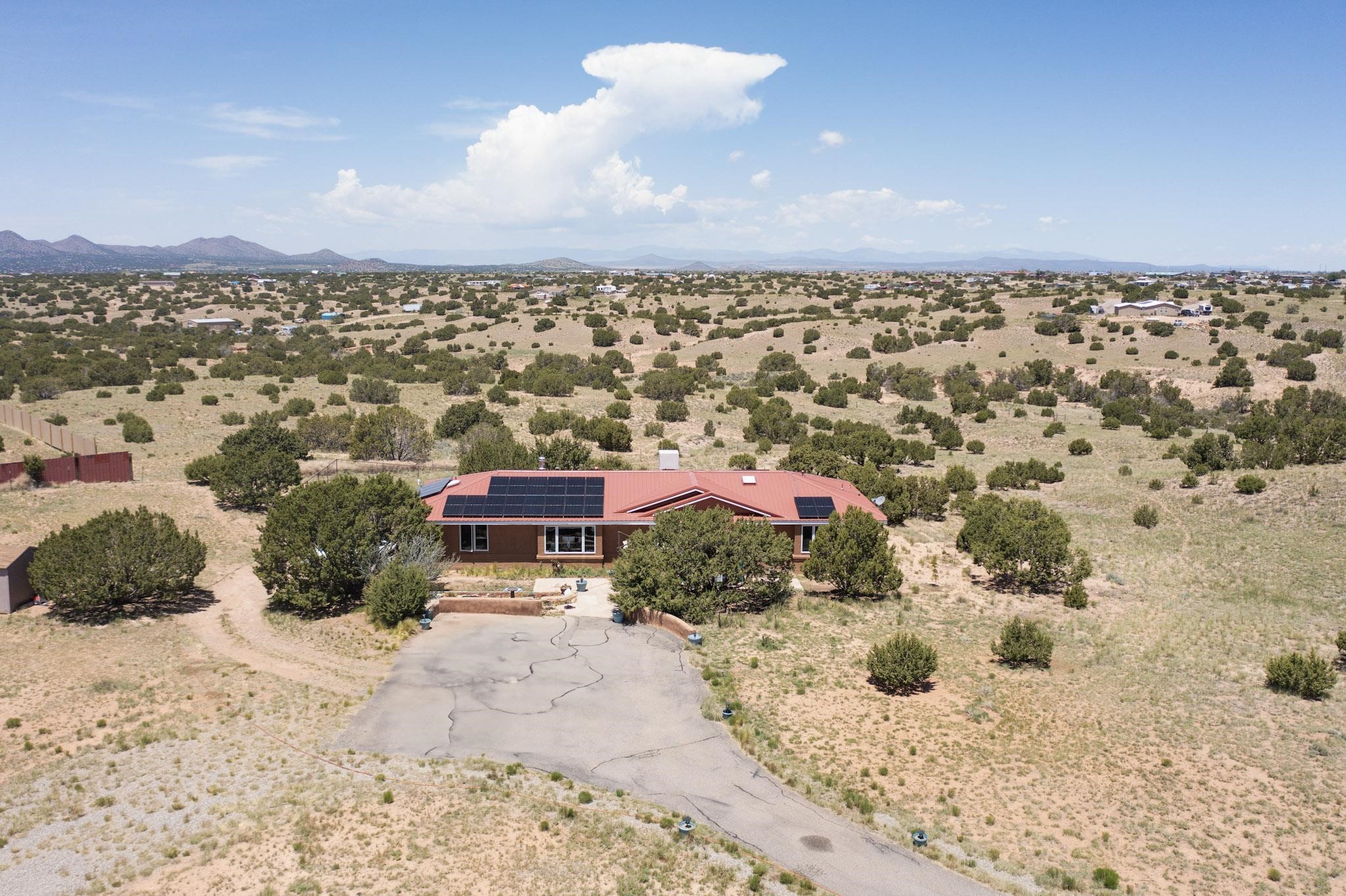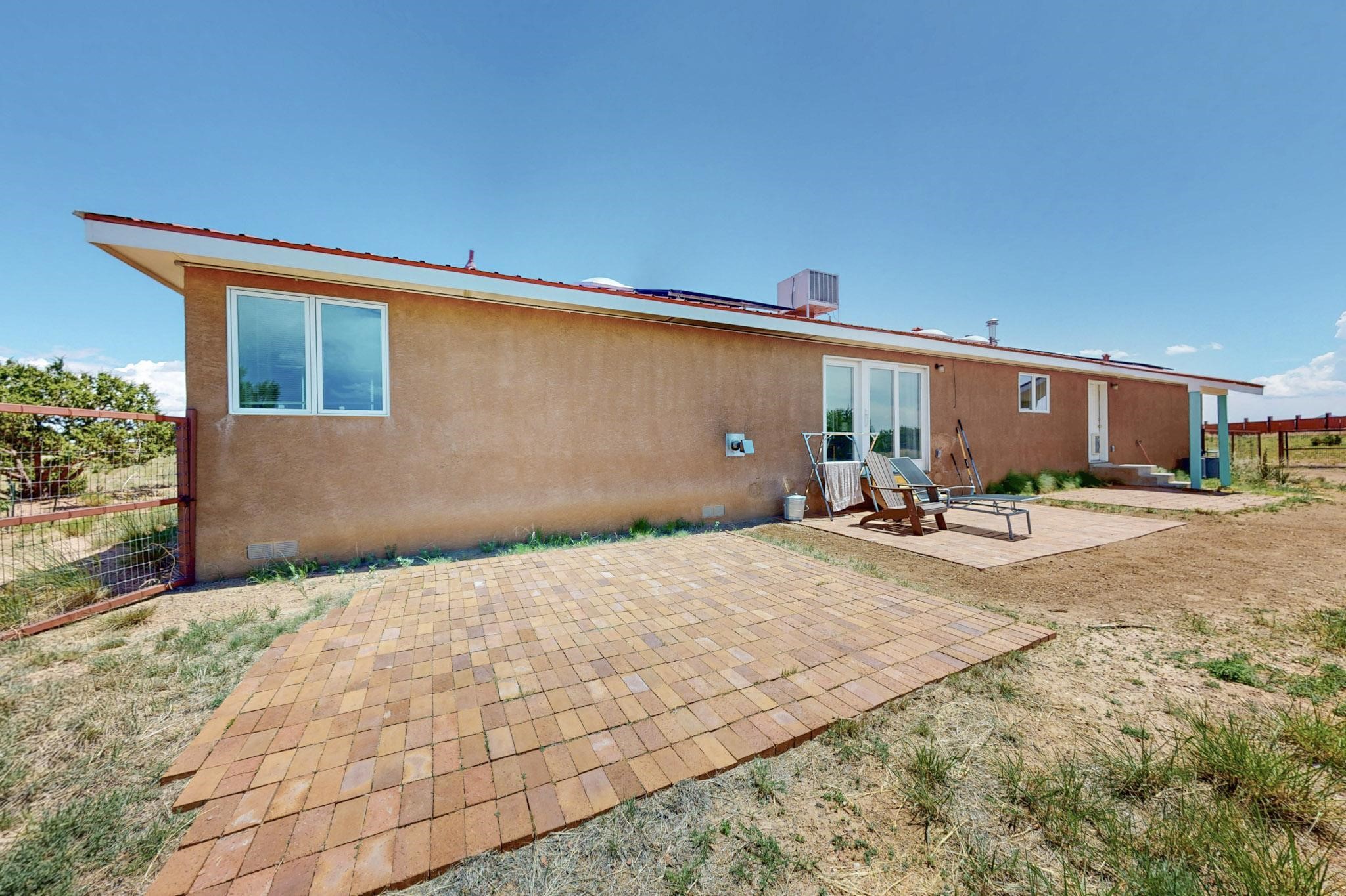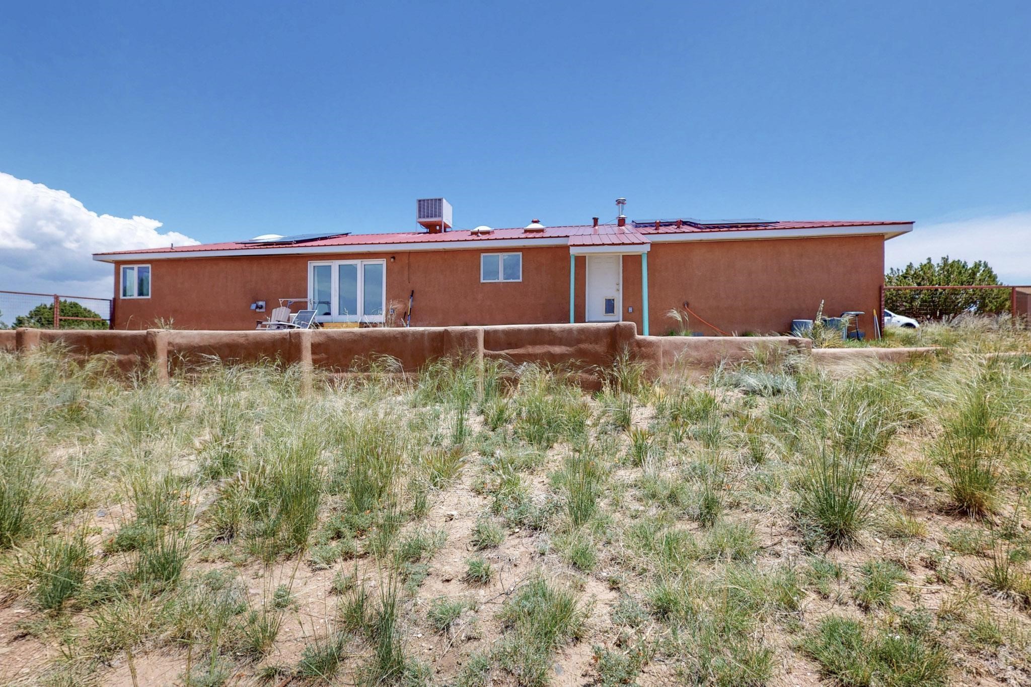 Enjoy sunrises and sunsets on both patios at the Bluebird Ranch! This 2,270 sqft. home has 3 bedrooms, 2 bathrooms and 2 living areas. Larger windows and many skylights and tall ceilings that make it very bright and airy. The property is situated on 12.3 fully fenced acres on a paved road with unobstructed 360 views, fenced for dogs and/or horses. or? Spacious and luxurious main BR with ensuite bathroom and huge walk in closet, completely energy efficient; newer, owned solar; NM Surf terrestrial internet service. Private, sweet water well that produces 18 gpm; metal hay barn with attached 7ft. hay corral; storage shed plus wide and tall RV storage barn; close to Bonanza horse Hospital. Many Junipers and no cactus. Make this rural ranch style electric gated property yours! 4 goats resident on the property that maintain the landscaping!!