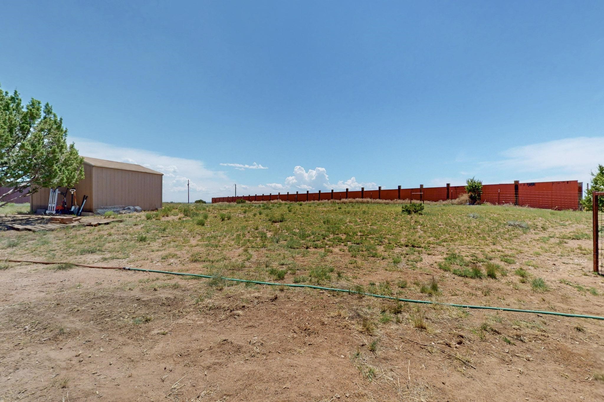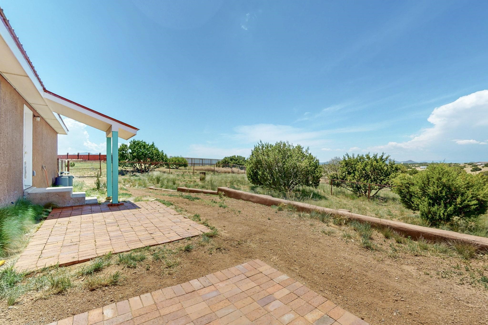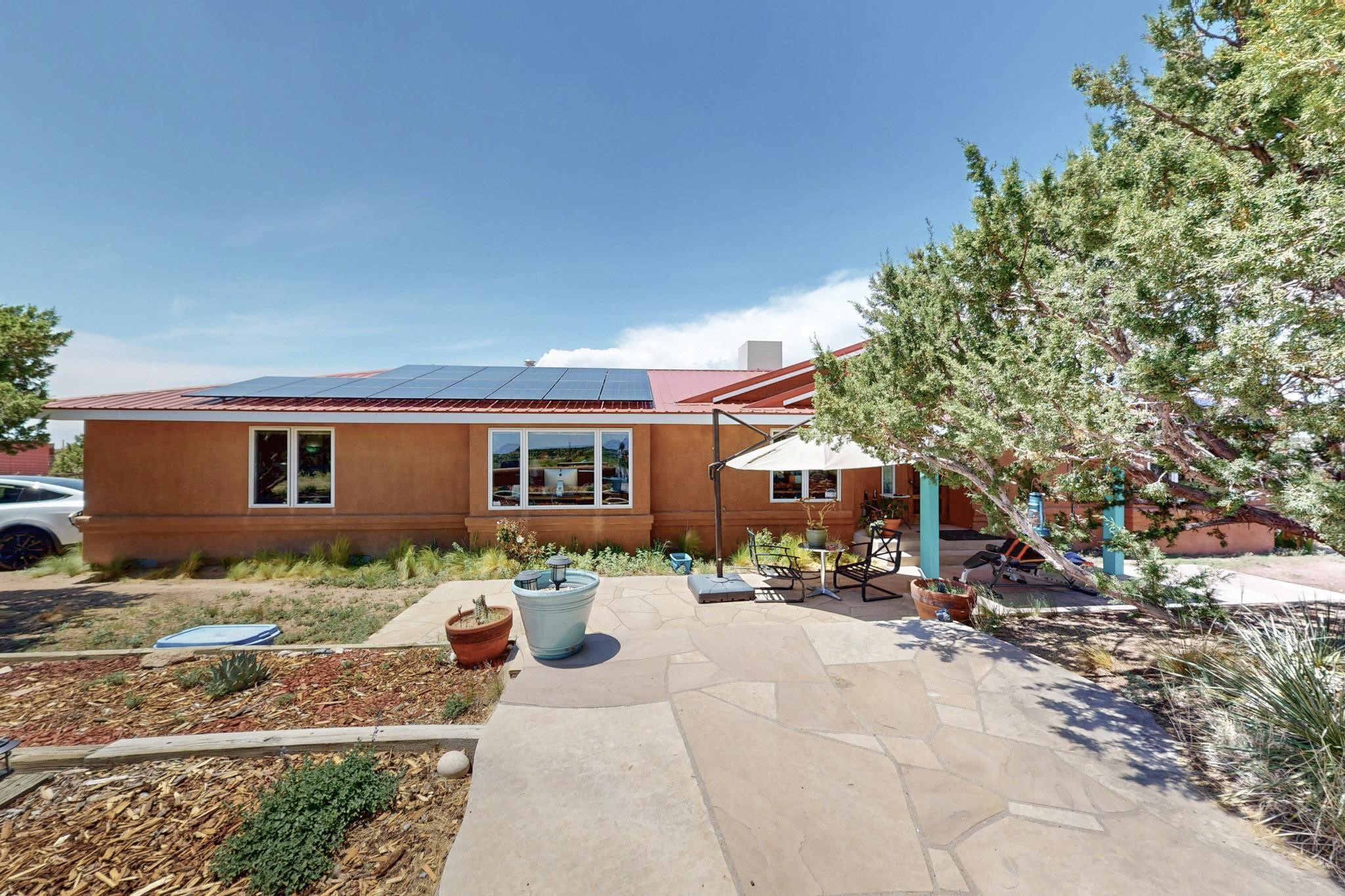 Enjoy sunrises and sunsets on both patios at the Bluebird Ranch! This 2,270 sqft. home has 3 bedrooms, 2 bathrooms and 2 living areas. Larger windows and many skylights and tall ceilings that make it very bright and airy. The property is situated on 12.3 fully fenced acres on a paved road with unobstructed 360 views, fenced for dogs and/or horses. or? Spacious and luxurious main BR with ensuite bathroom and huge walk in closet, completely energy efficient; newer, owned solar; NM Surf terrestrial internet service. Private, sweet water well that produces 18 gpm; metal hay barn with attached 7ft. hay corral; storage shed plus wide and tall RV storage barn; close to Bonanza horse Hospital. Many Junipers and no cactus. Make this rural ranch style electric gated property yours! 4 goats resident on the property that maintain the landscaping!!