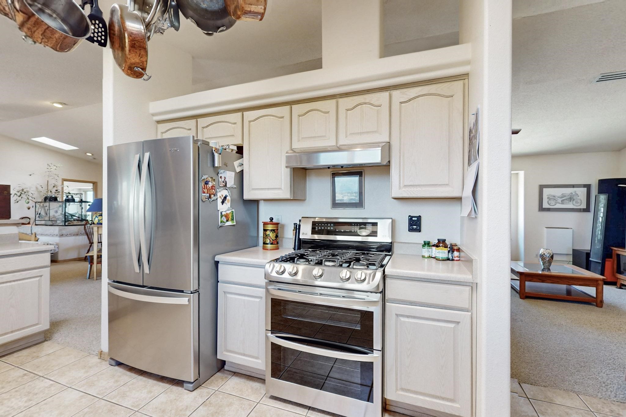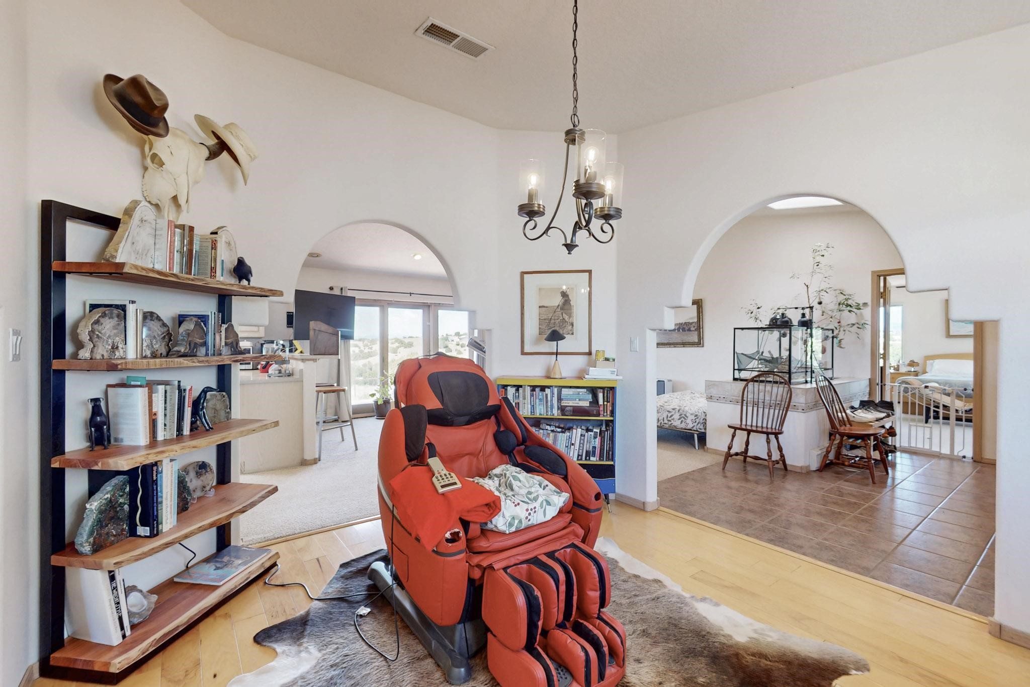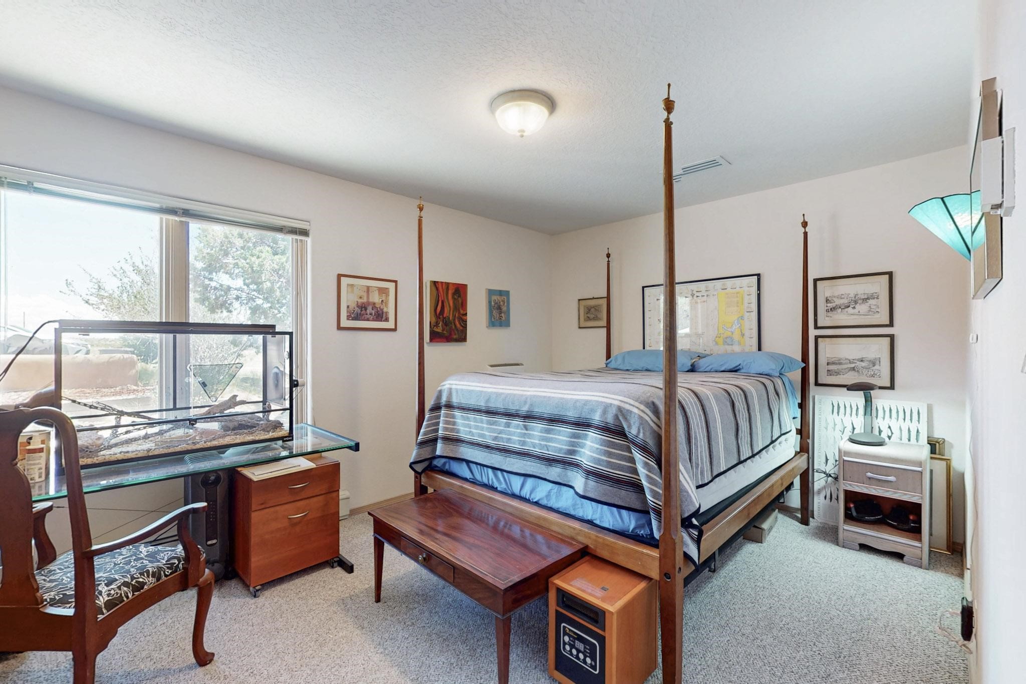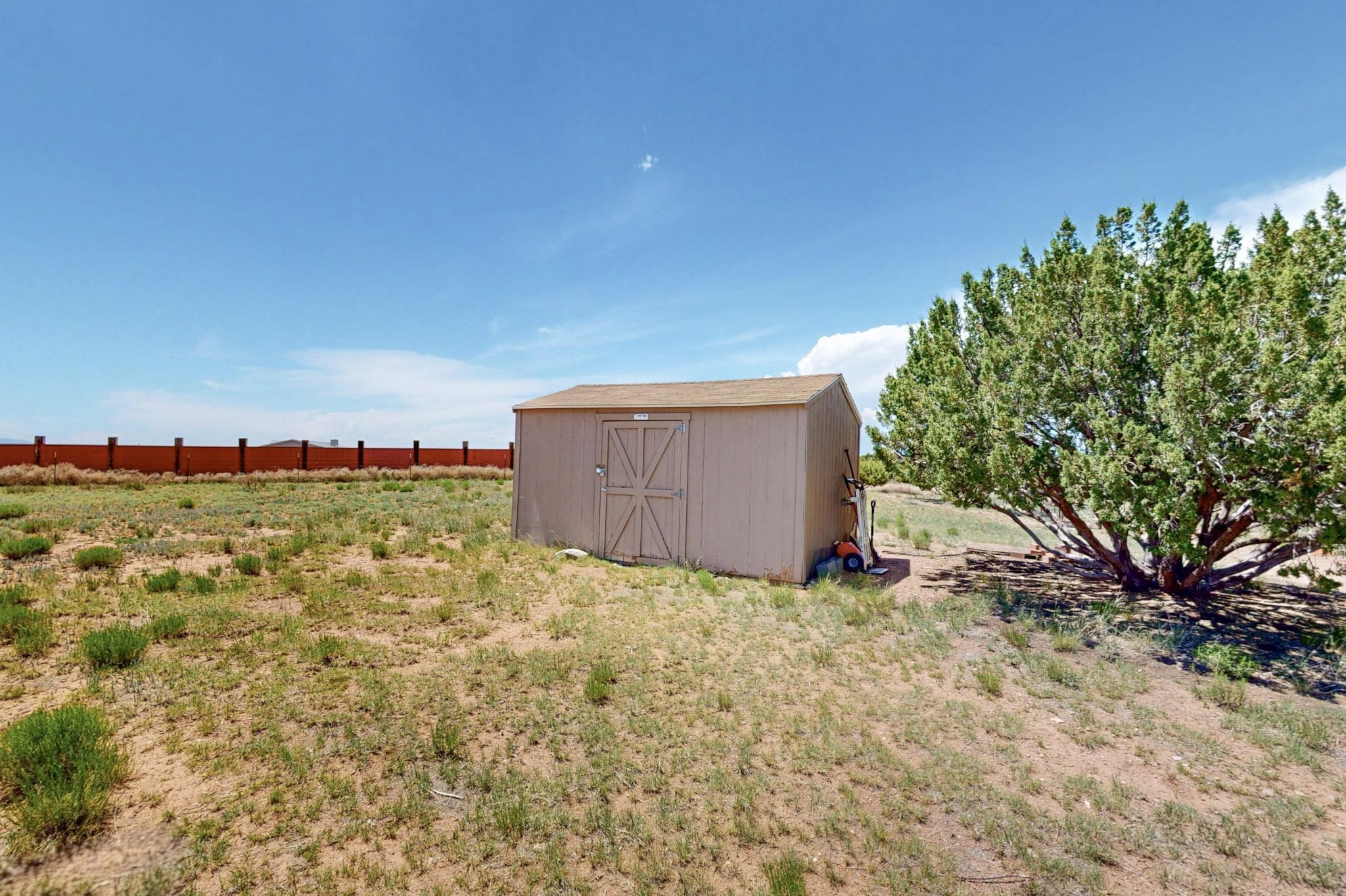 Enjoy sunrises and sunsets on both patios at the Bluebird Ranch! This 2,270 sqft. home has 3 bedrooms, 2 bathrooms and 2 living areas. Larger windows and many skylights and tall ceilings that make it very bright and airy. The property is situated on 12.3 fully fenced acres on a paved road with unobstructed 360 views, fenced for dogs and/or horses. or? Spacious and luxurious main BR with ensuite bathroom and huge walk in closet, completely energy efficient; newer, owned solar; NM Surf terrestrial internet service. Private, sweet water well that produces 18 gpm; metal hay barn with attached 7ft. hay corral; storage shed plus wide and tall RV storage barn; close to Bonanza horse Hospital. Many Junipers and no cactus. Make this rural ranch style electric gated property yours! 4 goats resident on the property that maintain the landscaping!!
