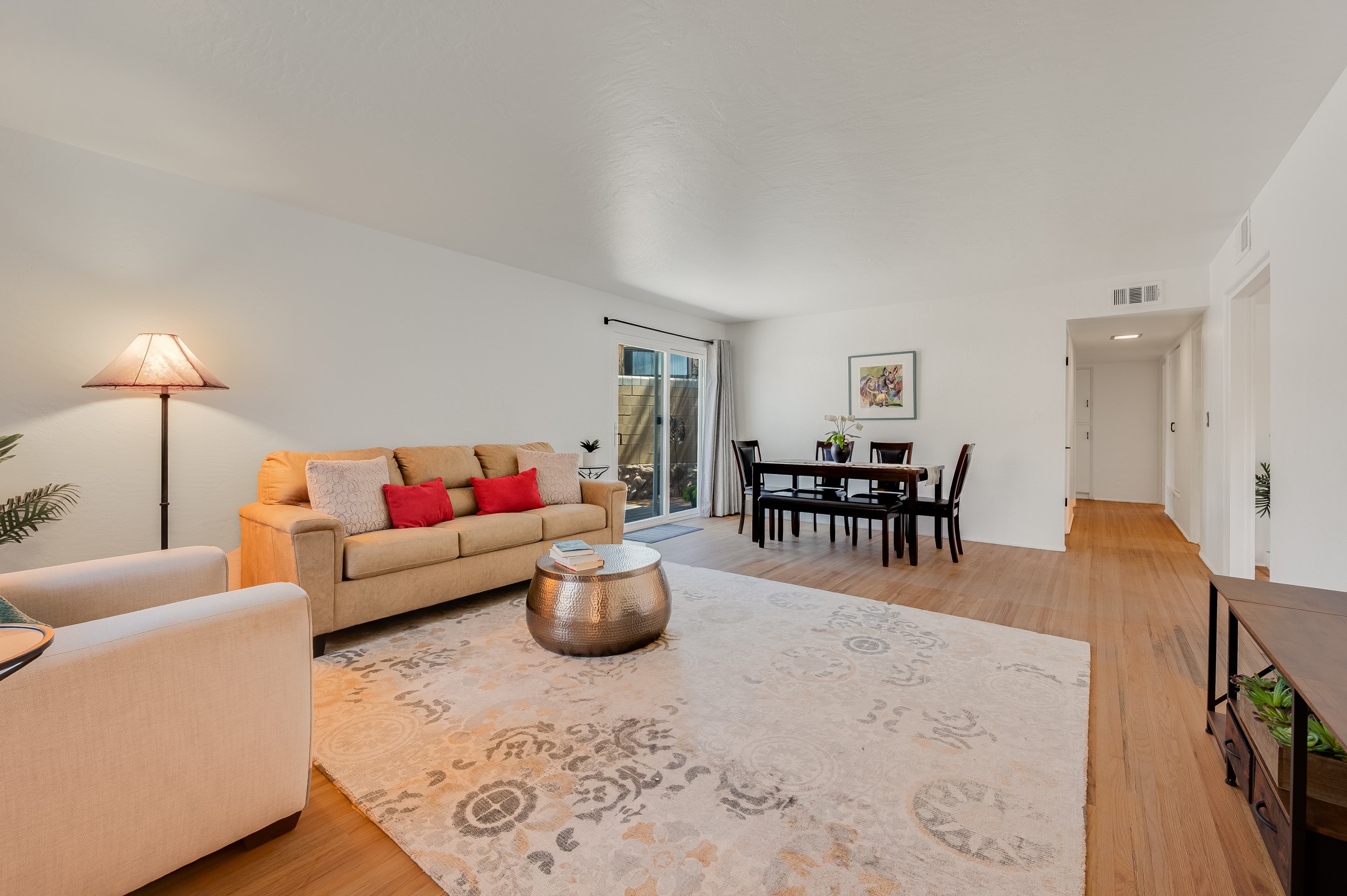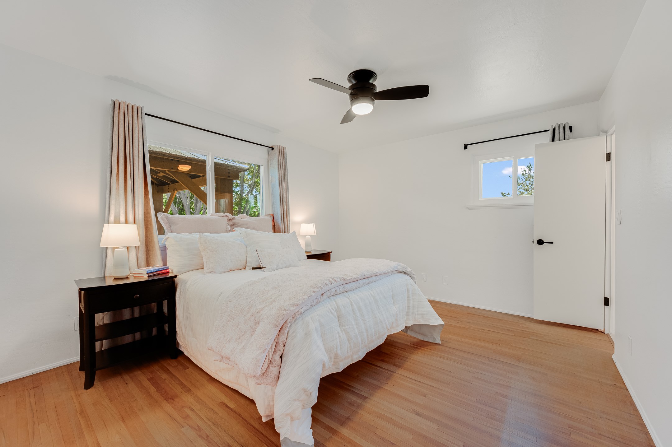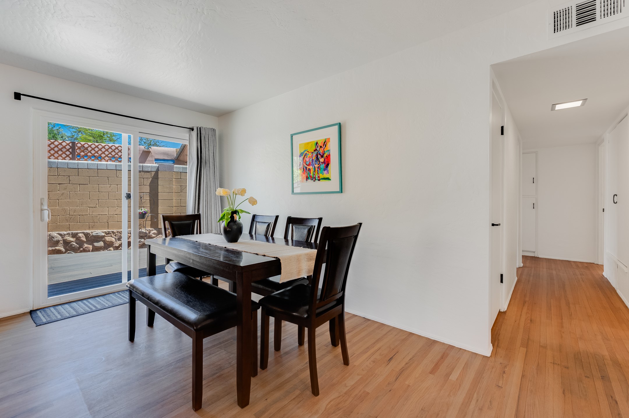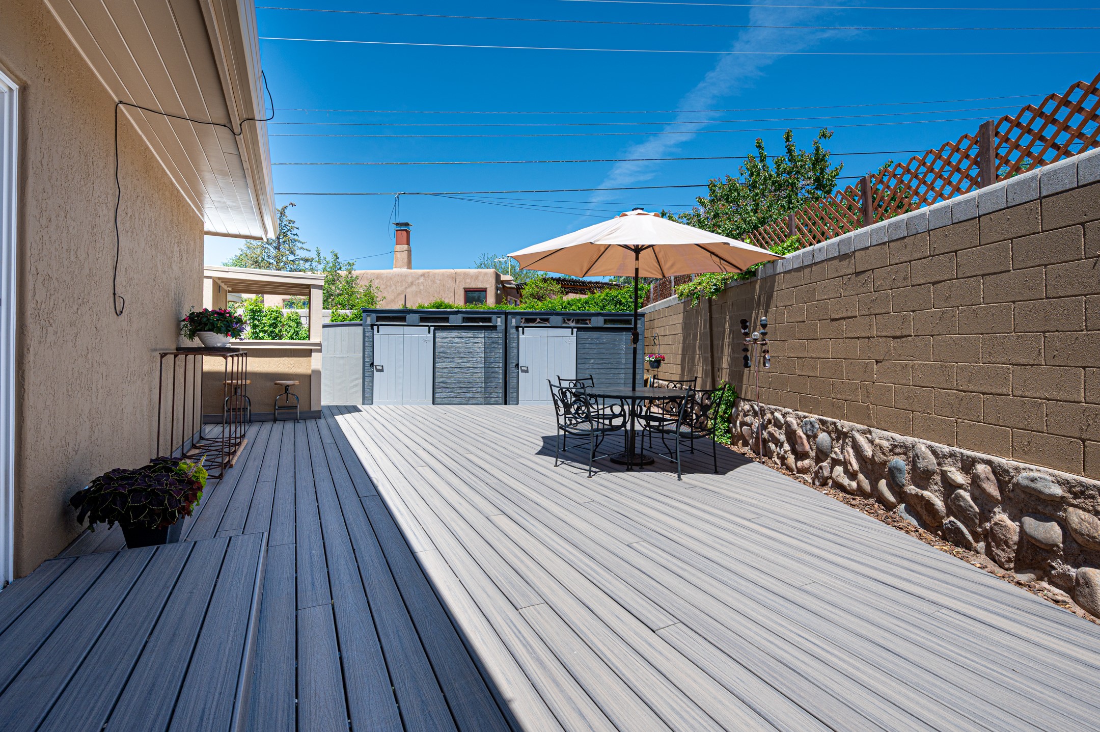 **OWNER FINANCING AVAILABLE** This single-level home in the desirable Casa Solana neighborhood blends comfort and thoughtful design across approximately 2,000 square feet. With three bedrooms and three bathrooms, including a spacious primary bedroom with an en suite, and an attached studio, this property is well-suited for generational living and/or rental income. Inside, you'll find warm wood floors and recessed lighting. The total kitchen renovation features new electrical and plumbing, quartz countertops and sleek stainless steel appliances, and a breakfast nook with wood burning fireplace to make both everyday meals and entertaining a joy. Step outside to over 1,000 square feet of deck space equipped with a bar and sauna, gazebo shaded by mature trees, and a fully fenced yard for privacy and comfort. Relax in the side gazebo or utilize it as a peaceful yoga or meditation platform. This home includes a new roof coating and solar panels, rebuilt soffits and triple glazed windows, blending energy efficiency with durability. The property sits on a corner lot, is located just minutes from downtown Santa Fe, and has easy access to popular shopping, dining, and cultural attractions. Move-in ready and with over $300k in upgrades, this home offers both tranquility, reliability, and connection to everything Santa Fe has to offer.