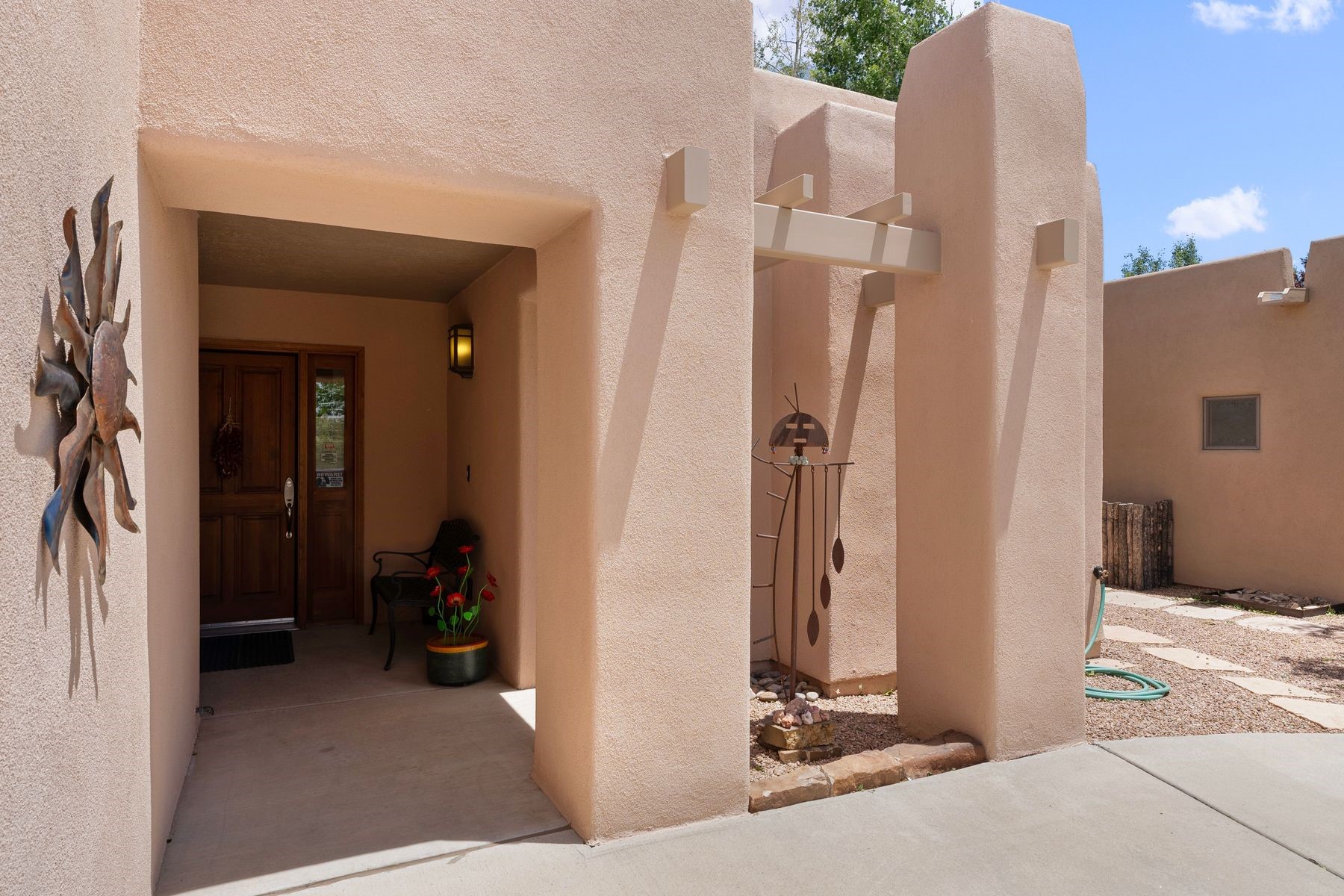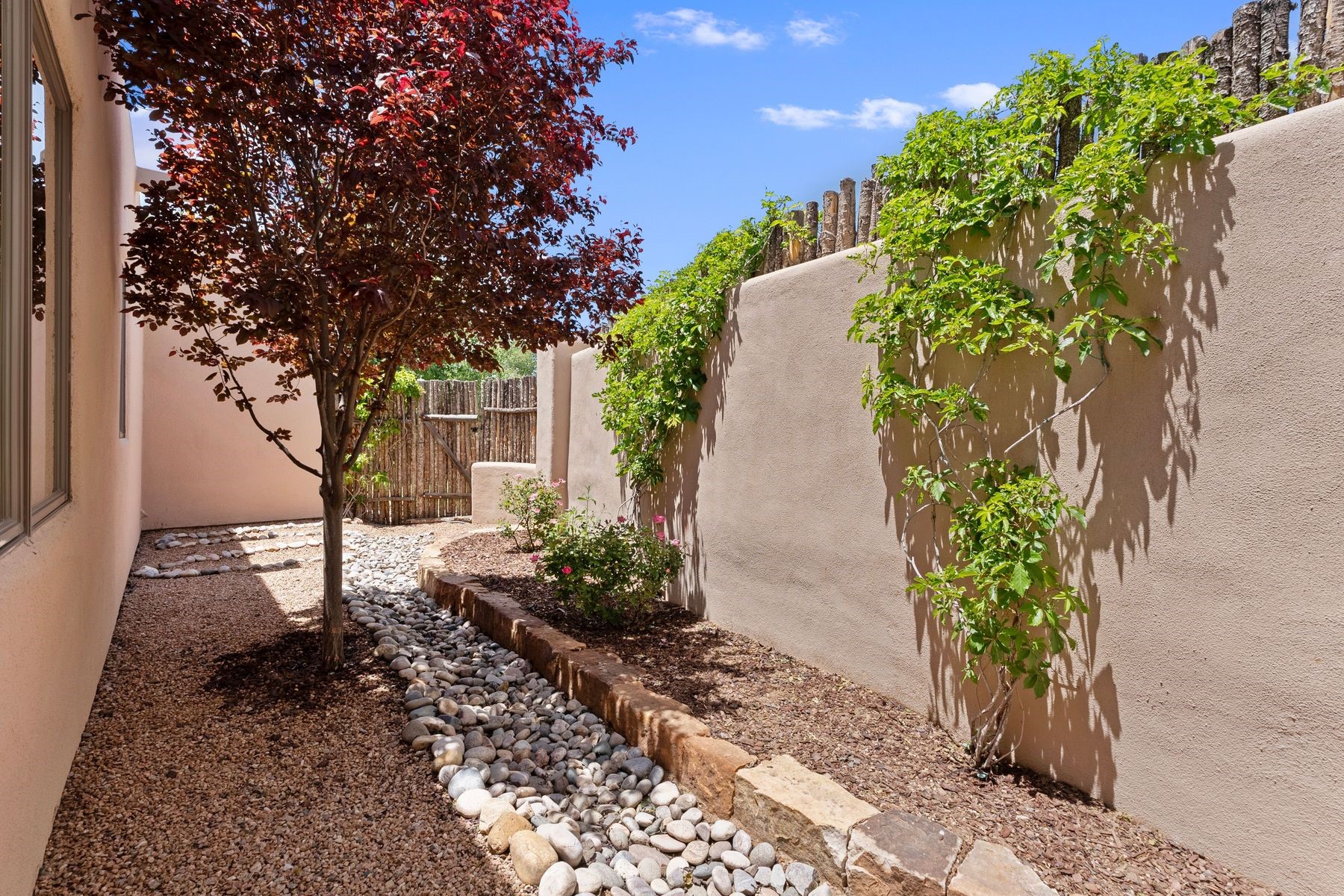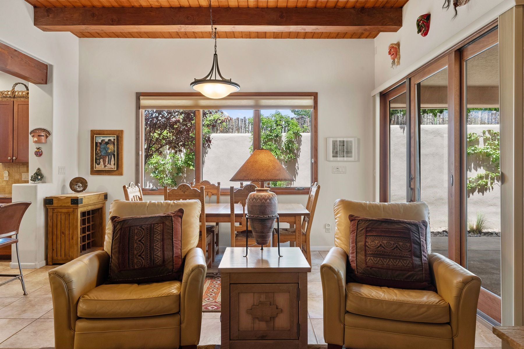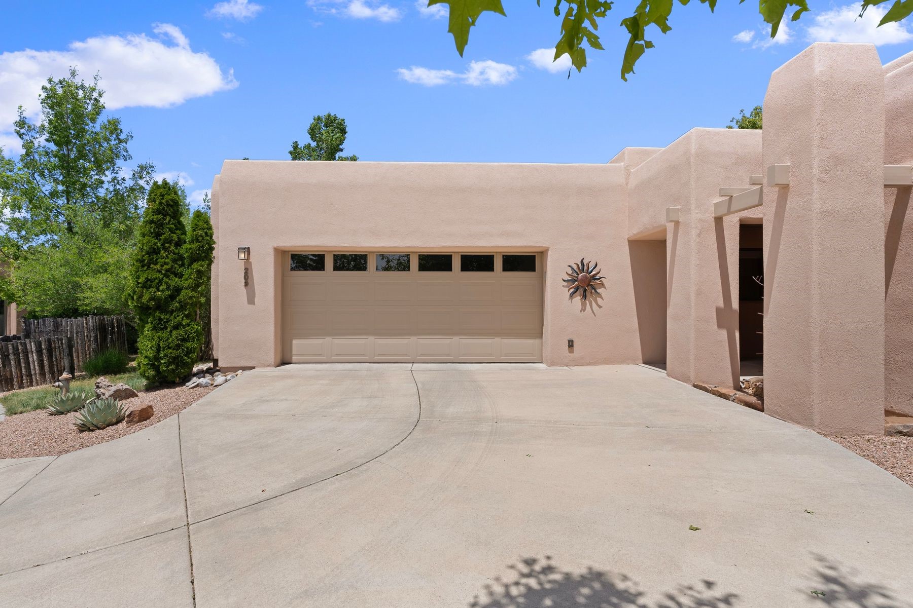 Located in the desirable Plazas at Old Pecos Trail community, this beautifully maintained 2-bedroom, 2-bath home offers a perfect blend of comfort, style, and convenience. Just a 10-minute drive to downtown Santa Fe and close to hiking trails, shopping, restaurants, and medical facilities, this home is ideally situated for both relaxation and accessibility.Inside, you'll find an open-concept layout with tall ceilings and abundant natural light. The living room features a cozy gas fireplace, built-in shelves, and seamless flow into the dining and kitchen areas. The updated kitchen boasts granite countertops, a large center island, and newer appliances, making it a functional and inviting space for cooking and entertaining.The spacious primary suite includes patio access through sliding doors, a covered portal, a walk-in shower, and a separate soaking tub. Step outside to enjoy the beautifully landscaped, low-maintenance yard complete with a water feature, a covered portal off the dining room, and an enclosed backyard with a raised privacy wall--ideal for outdoor dining or quiet retreat. An oversized two-car garage adds extra storage and convenience. Additional highlights include forced air cooling, a tankless water heater, and a washer and dryer that stay with the home.This bright and welcoming home is move-in ready and perfect for those seeking comfort and charm in a prime Santa Fe location.