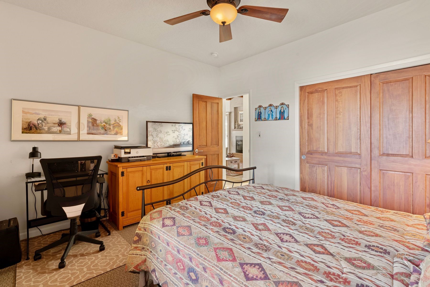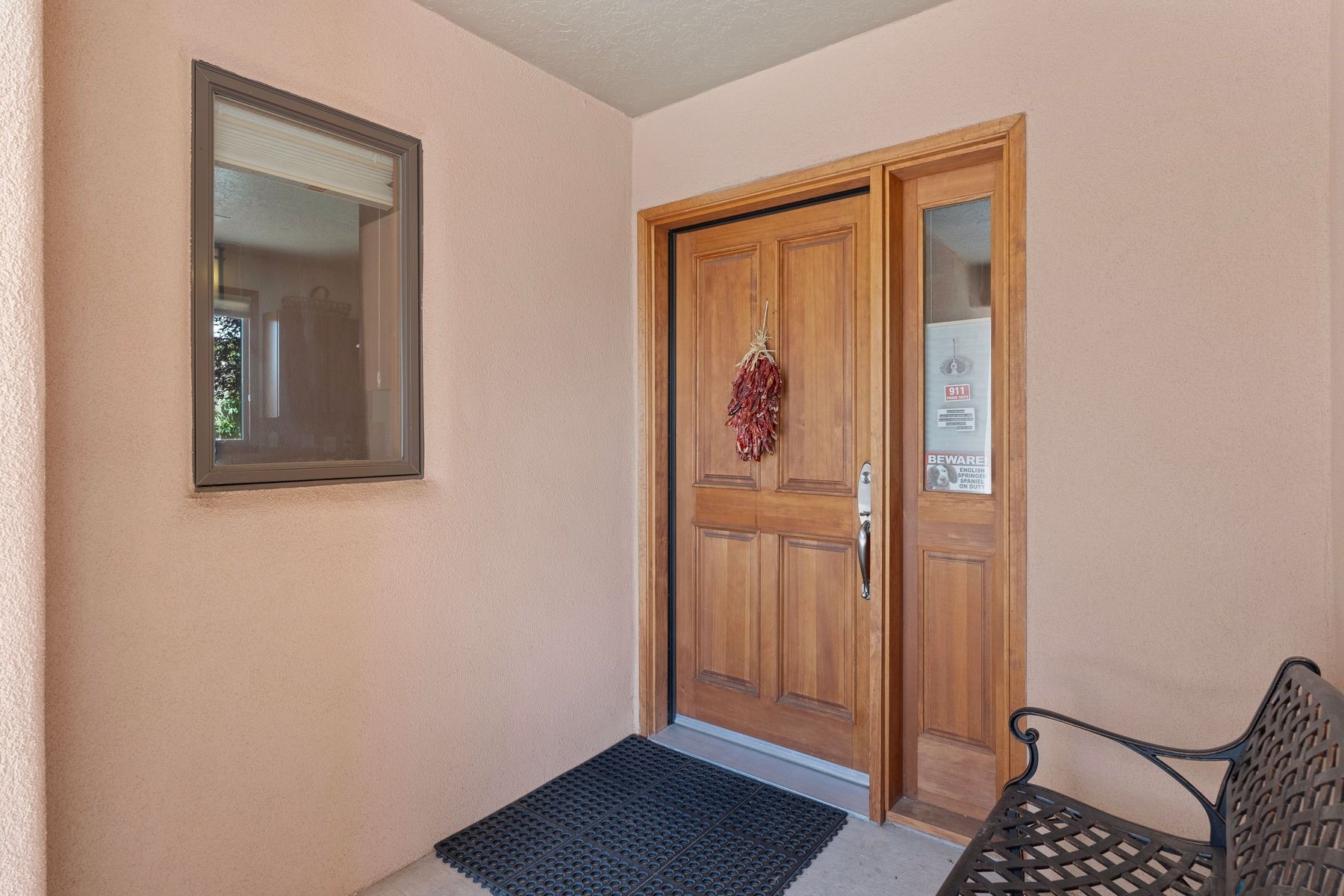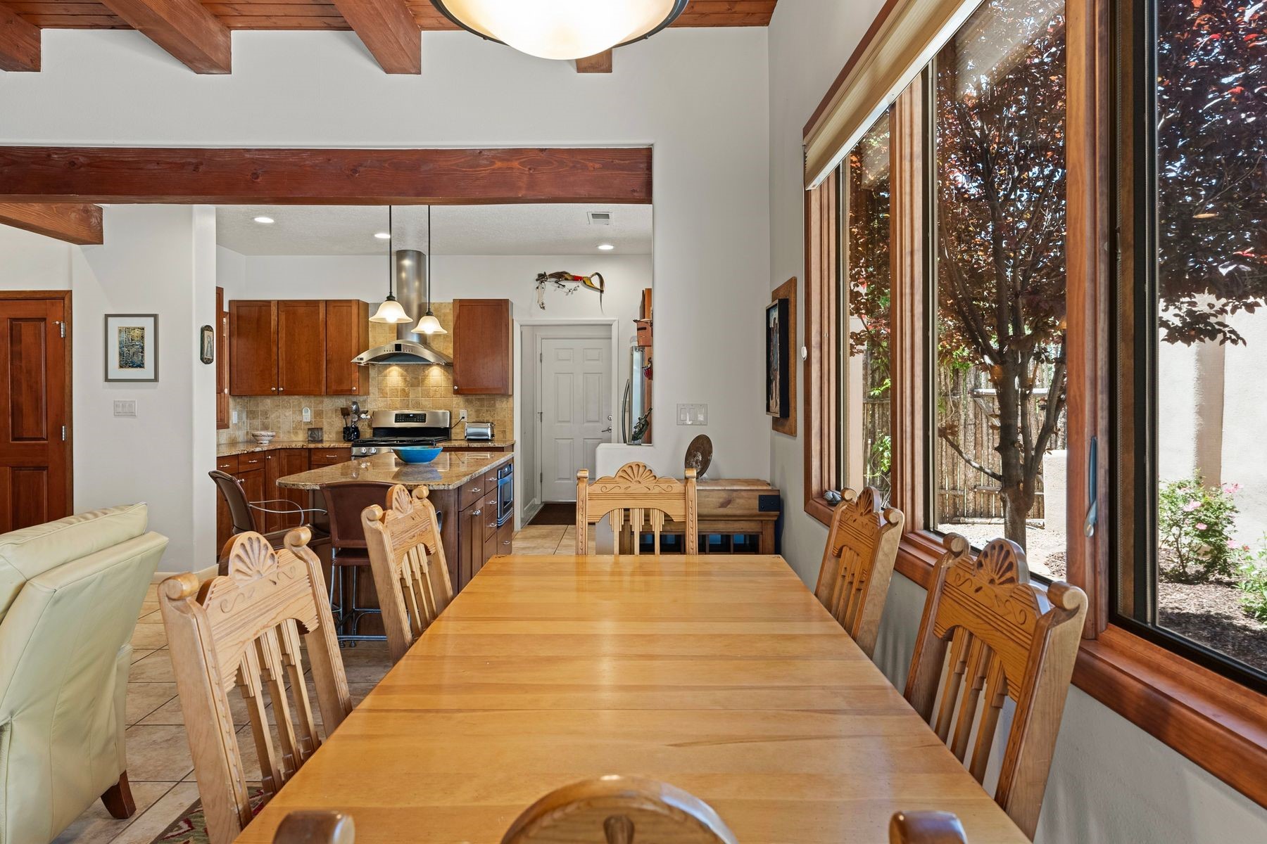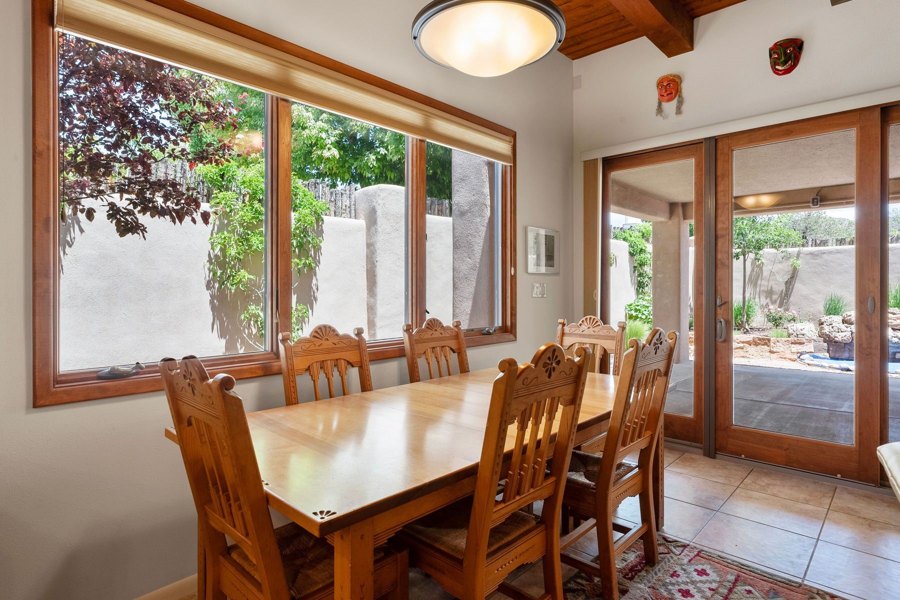 Located in the desirable Plazas at Old Pecos Trail community, this beautifully maintained 2-bedroom, 2-bath home offers a perfect blend of comfort, style, and convenience. Just a 10-minute drive to downtown Santa Fe and close to hiking trails, shopping, restaurants, and medical facilities, this home is ideally situated for both relaxation and accessibility.Inside, you'll find an open-concept layout with tall ceilings and abundant natural light. The living room features a cozy gas fireplace, built-in shelves, and seamless flow into the dining and kitchen areas. The updated kitchen boasts granite countertops, a large center island, and newer appliances, making it a functional and inviting space for cooking and entertaining.The spacious primary suite includes patio access through sliding doors, a covered portal, a walk-in shower, and a separate soaking tub. Step outside to enjoy the beautifully landscaped, low-maintenance yard complete with a water feature, a covered portal off the dining room, and an enclosed backyard with a raised privacy wall--ideal for outdoor dining or quiet retreat. An oversized two-car garage adds extra storage and convenience. Additional highlights include forced air cooling, a tankless water heater, and a washer and dryer that stay with the home.This bright and welcoming home is move-in ready and perfect for those seeking comfort and charm in a prime Santa Fe location.