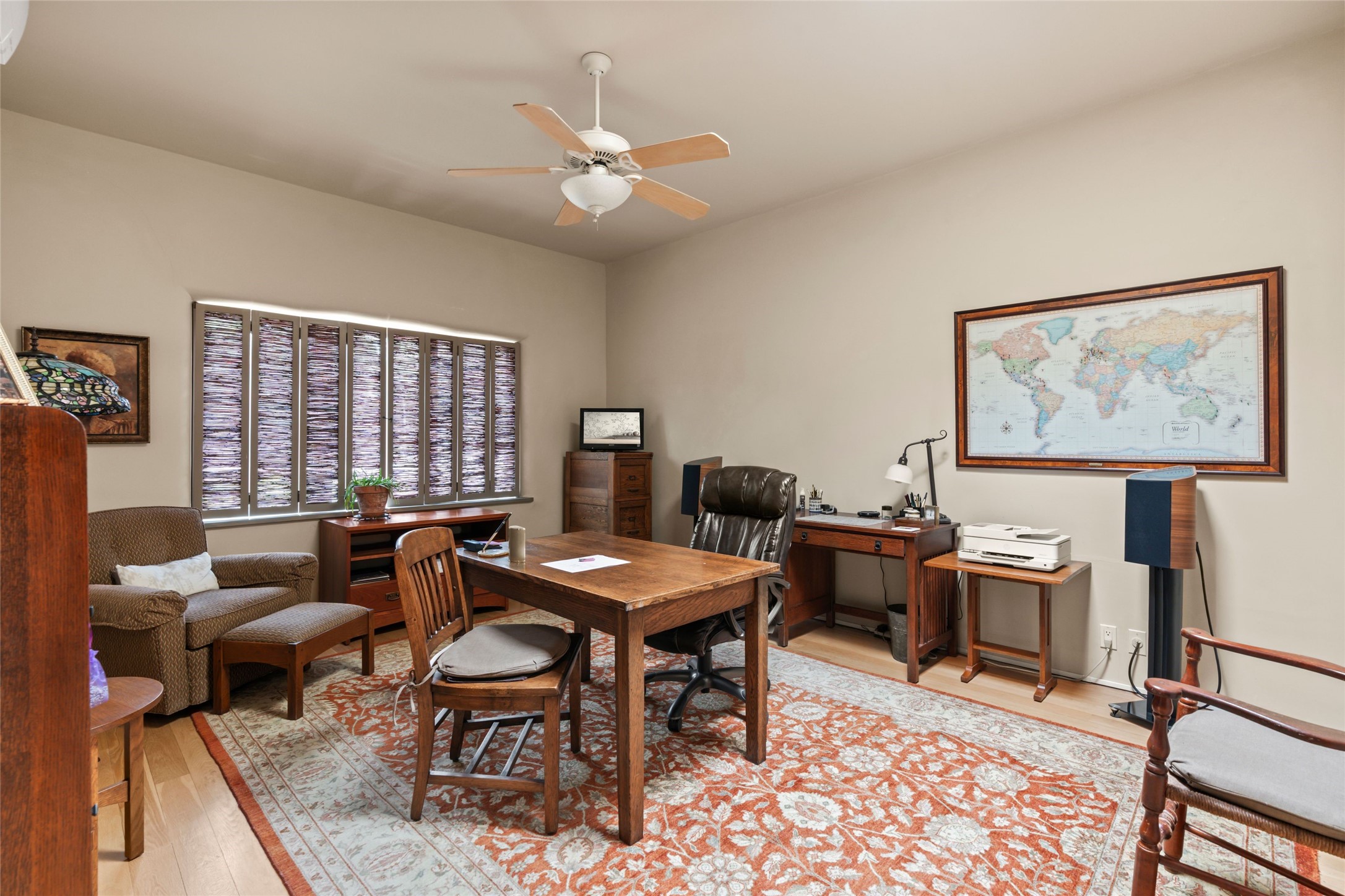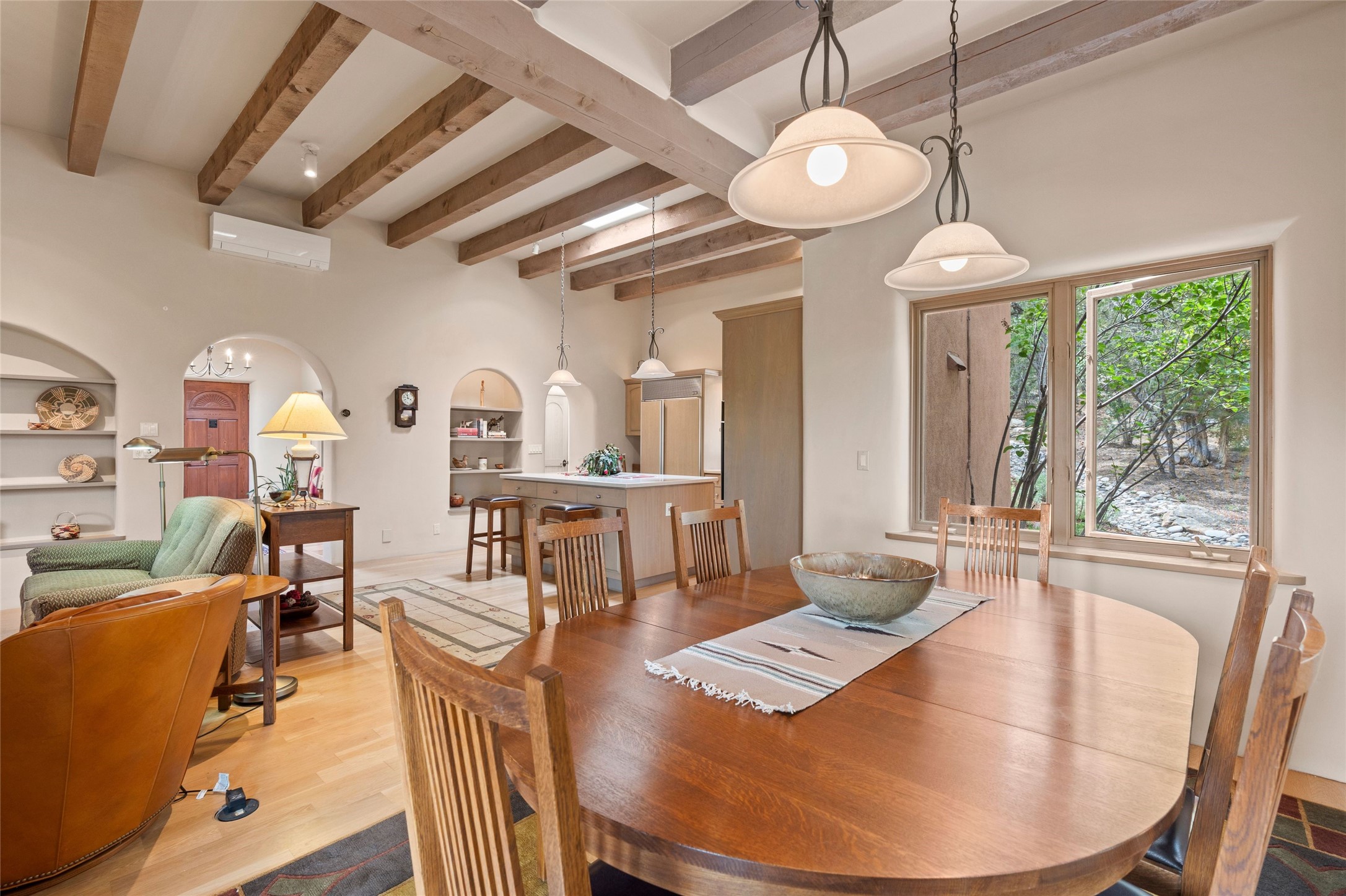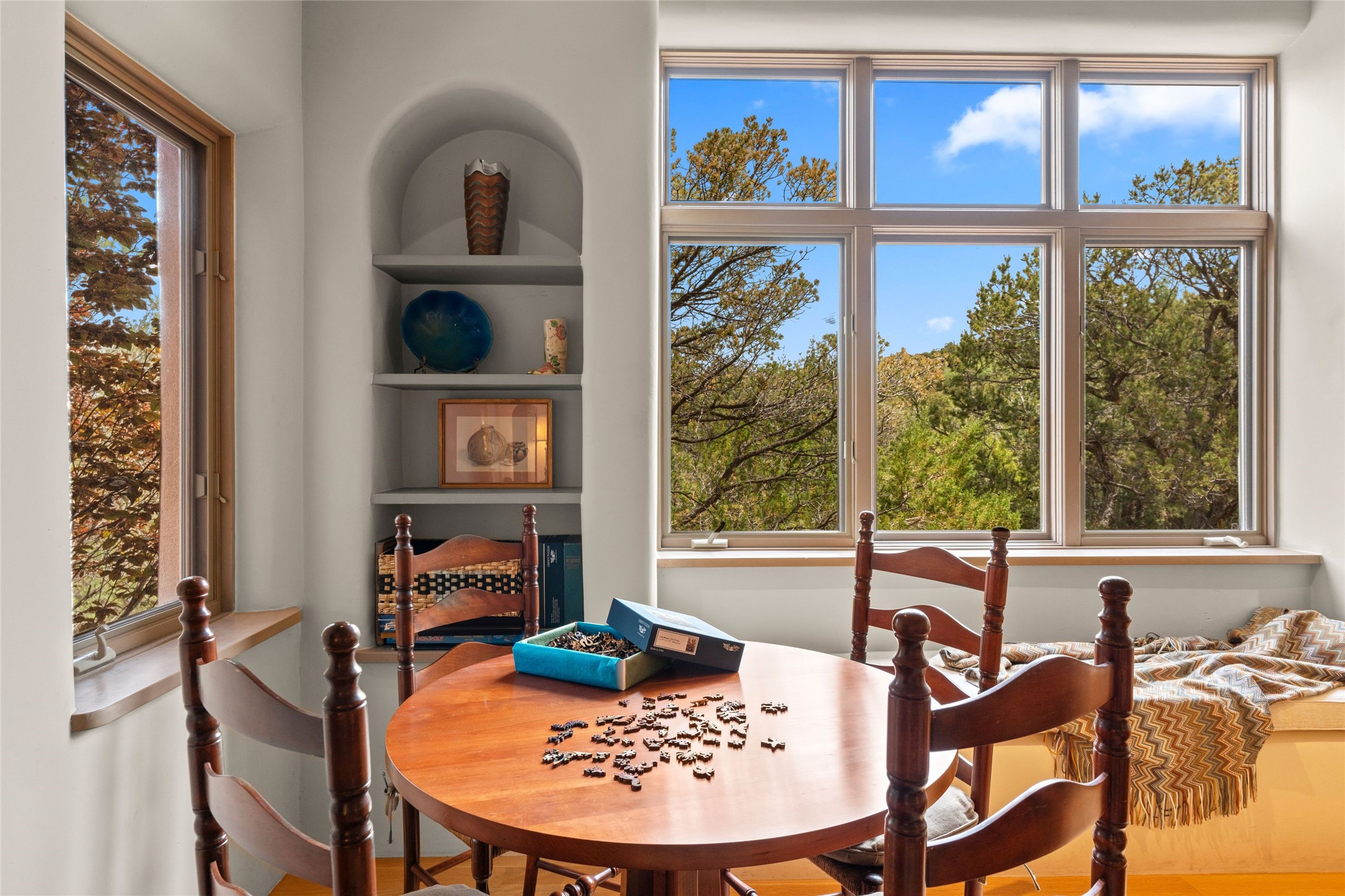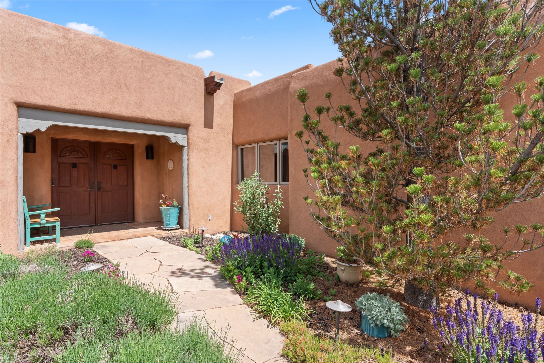 Tucked into the serene hills just above the historic Santa Fe Plaza, this timeless adobe-style residence offers the quintessential blend of Southwestern charm and refined privacy. With over 3,000 square feet of elegant living space, this three-bedroom sanctuary also includes a versatile den or office--perfect for quiet workdays or creative pursuits.Classic vigas, kiva fireplaces, and thick plaster walls showcase the rich architectural heritage of Northern New Mexico, while expansive windows frame peek-a-boo views of the surrounding mountains and distant sunsets. Thoughtfully positioned for tranquility, the property feels worlds away yet remains just minutes from the heart of Santa Fe's galleries, shops, and world-class dining.The open floor plan includes amazing access to multiple outdoor portals. Located on the main level, the primary suite features wood floors, his / hers closets and a sitting room just off the bath. On lower level you will find 2 guest bedrooms and a full bathroom. Whether hosting under the stars on a peaceful patio or retreating into a cozy reading nook, this home embodies the spirit of Santa Fe living--where authenticity meets effortless comfort.