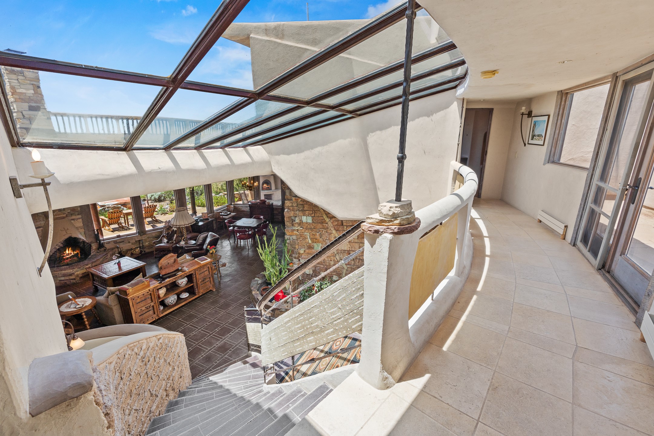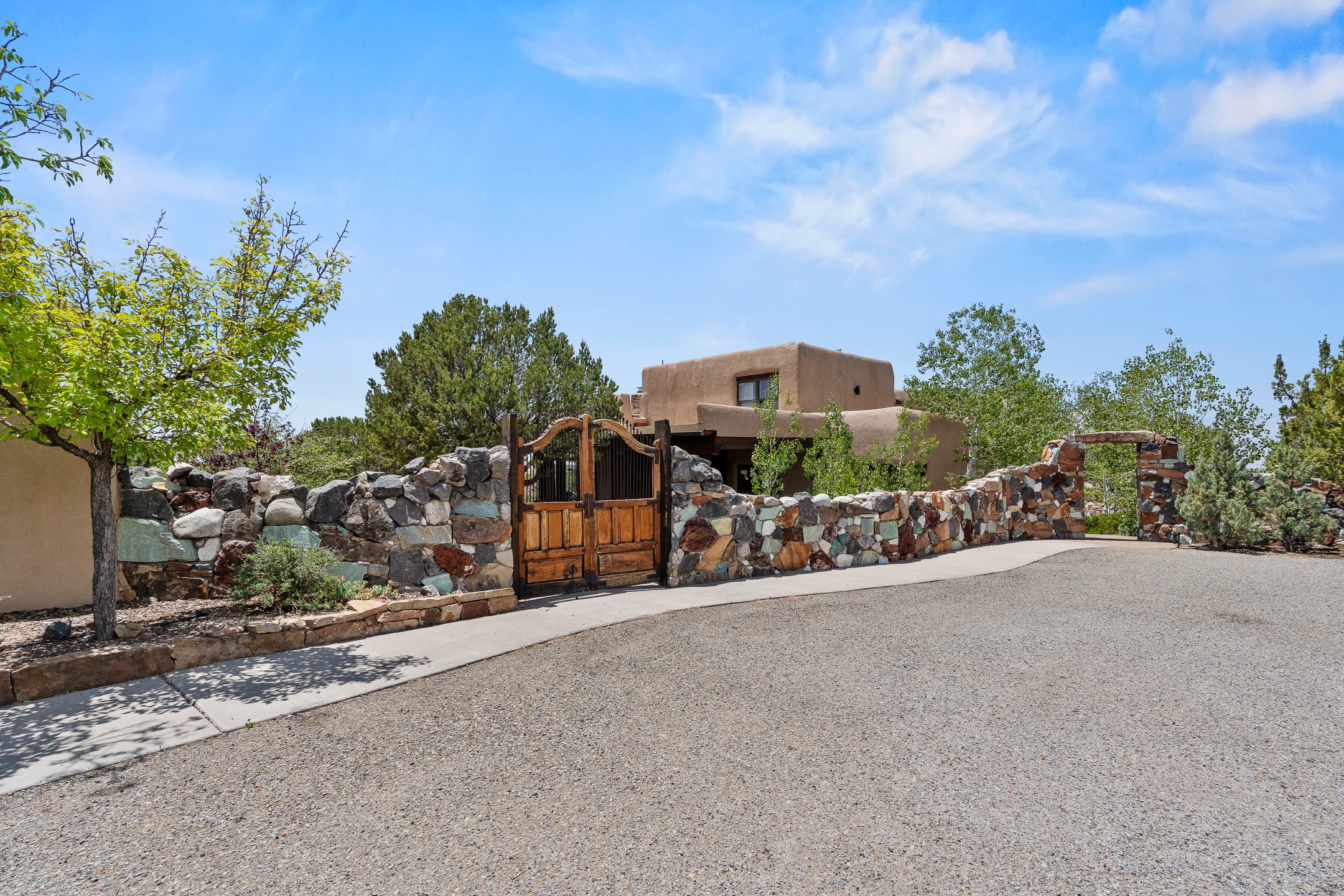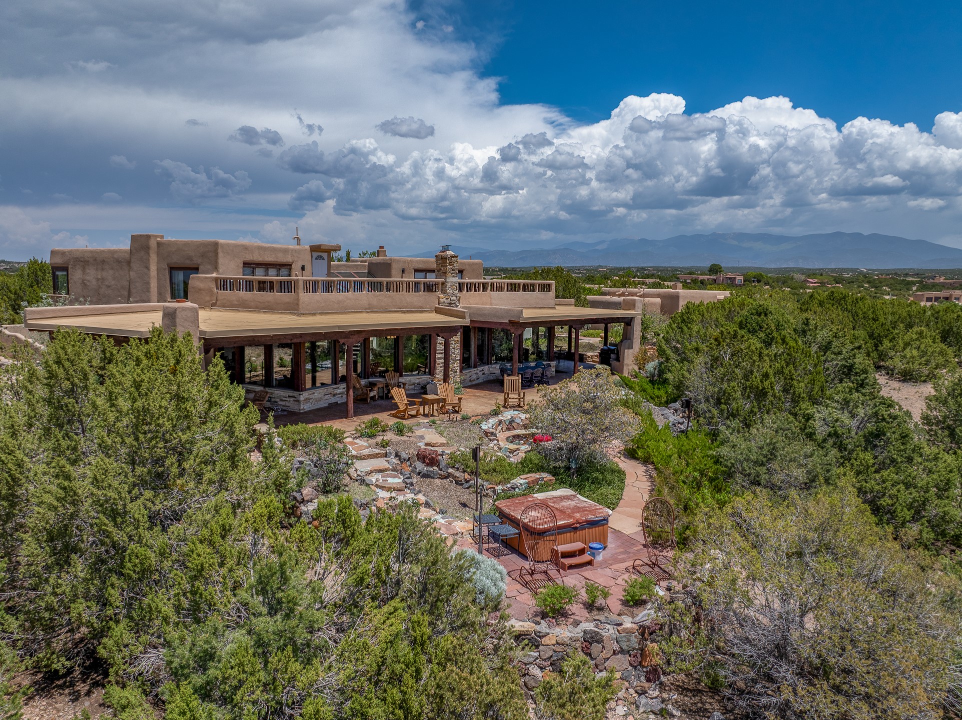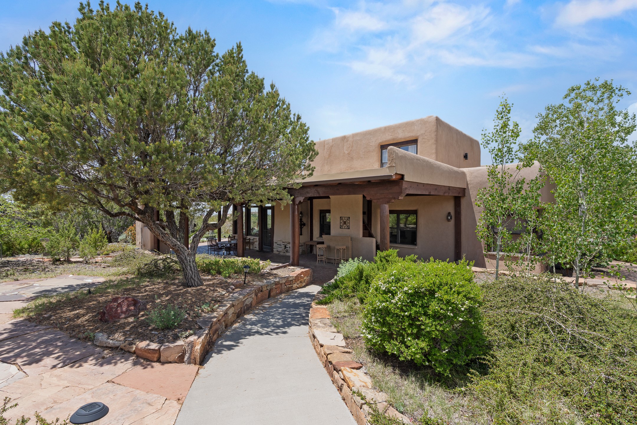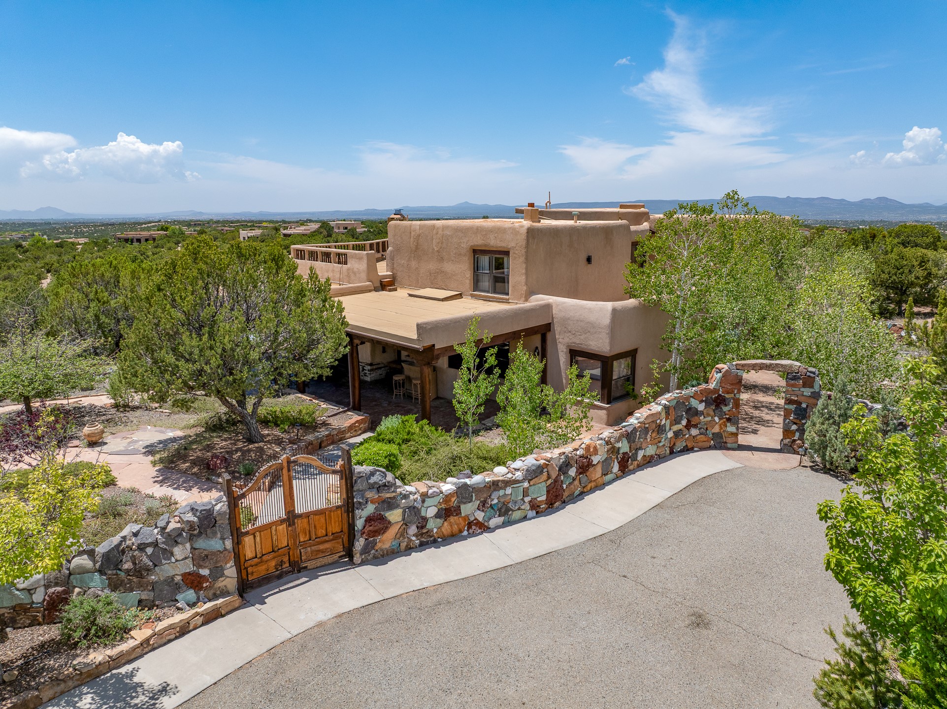 Las Campanas Gem: Timeless Character Meets Exceptional livingNestled in the prestigious Las Campanas community, this distinctive residence offers a rare opportunity to own a property brimming with authentic Santa Fe charm and unparalleled architectural character. Set on a generous 1.71-acre lot, the main home boasts approximately 4,195 sq ft of living space, complemented by a detached, pull-through two-car garage and a separate 2-bedroom guest house of about 1,031 sq ft--providing exceptional flexibility and privacy.Designed for seamless indoor/outdoor living, the expansive covered patio invites year-round entertaining with a classic kiva fireplace and built-in grill, perfect for al fresco gatherings amid breathtaking natural surroundings. An exquisite exposed adobe wall inside adds warmth and authenticity, complementing the traditional vigas and coved ceilings throughout.The property is graced by a serene Aspen grove, creating a tranquil natural setting and enhancing privacy. Panoramic 180-degree views stretch from the Sandia and Ortiz Mountains to the Sangre de Cristo range, offering an ever-changing backdrop of dramatic New Mexico landscapes.Inside, stunning rock wall accents and a light-filled indoor atrium create a unique ambiance, while large skylights flood the space with natural light. The built-in kitchen nook offers a cozy space for casual dining, and generous living areas provide a thoughtful floor plan that invites personalization and renovation.While the home offers solid bones and timeless elements, it presents an exceptional canvas for a tasteful renovation or enhancement to meet modern luxury standards.Experience the charm and promise of this captivating Las Campanas retreat--an exclusive opportunity to craft your dream home in one of Santa Fe's most coveted neighborhoods. Unlock the full potential of this one-of-a-kind residence where tradition meets possibility.
