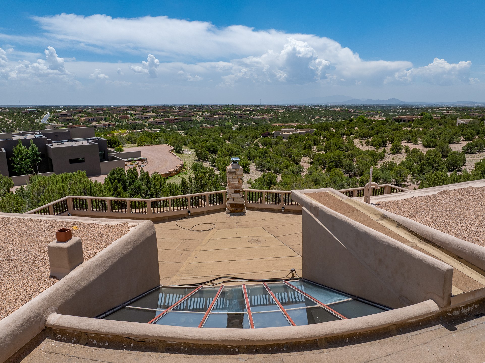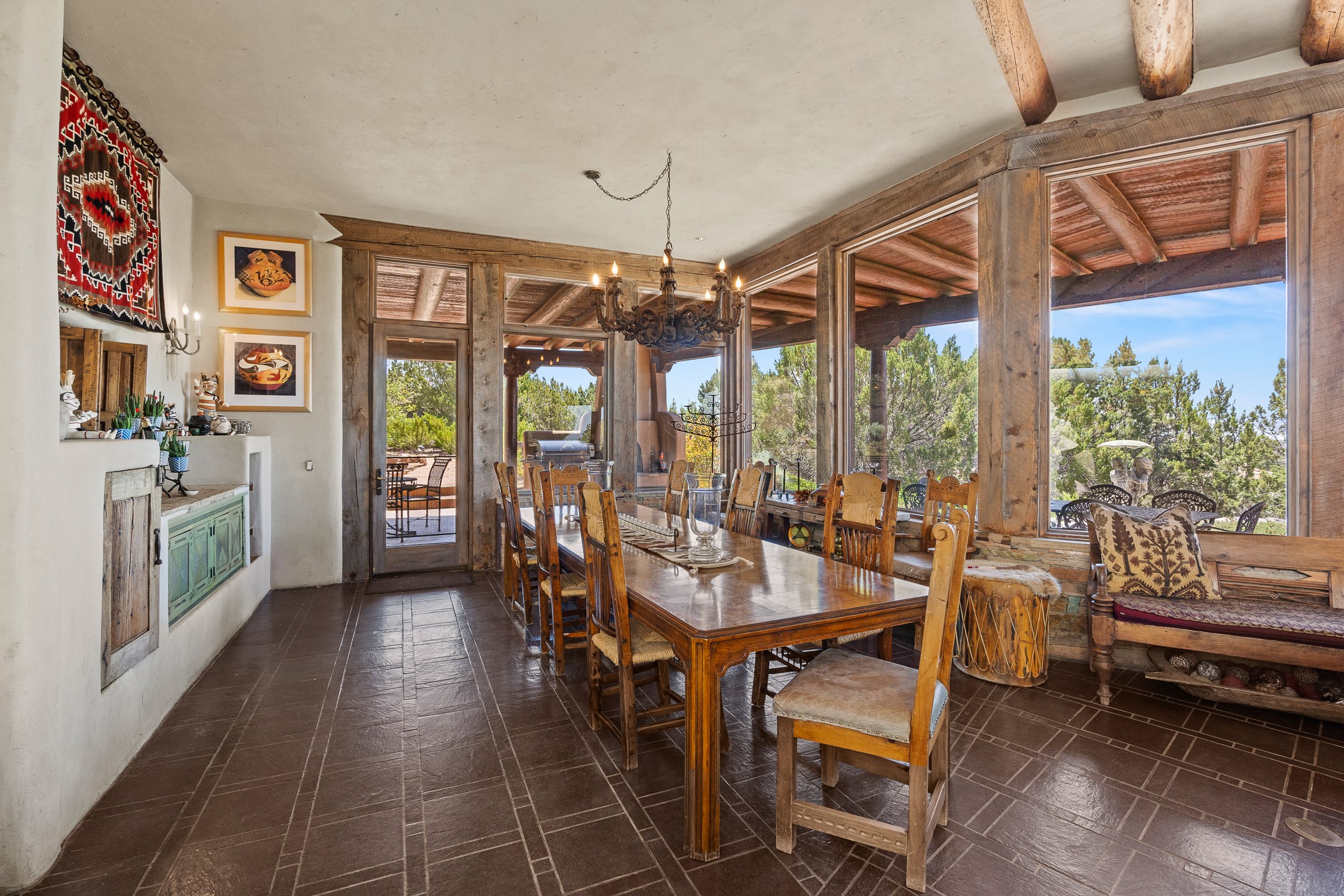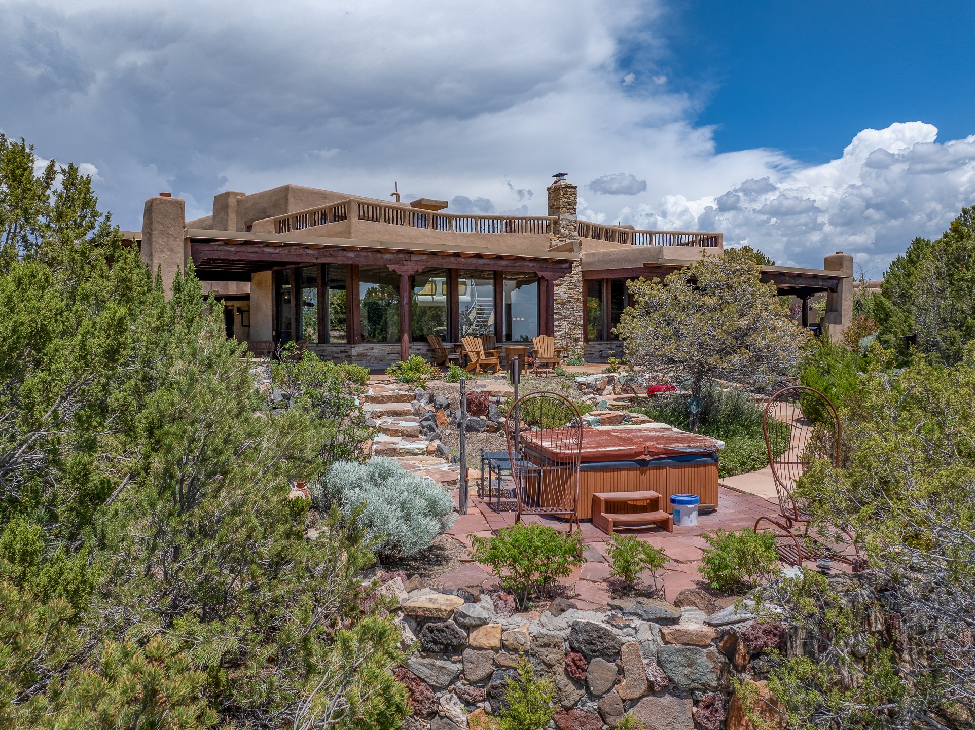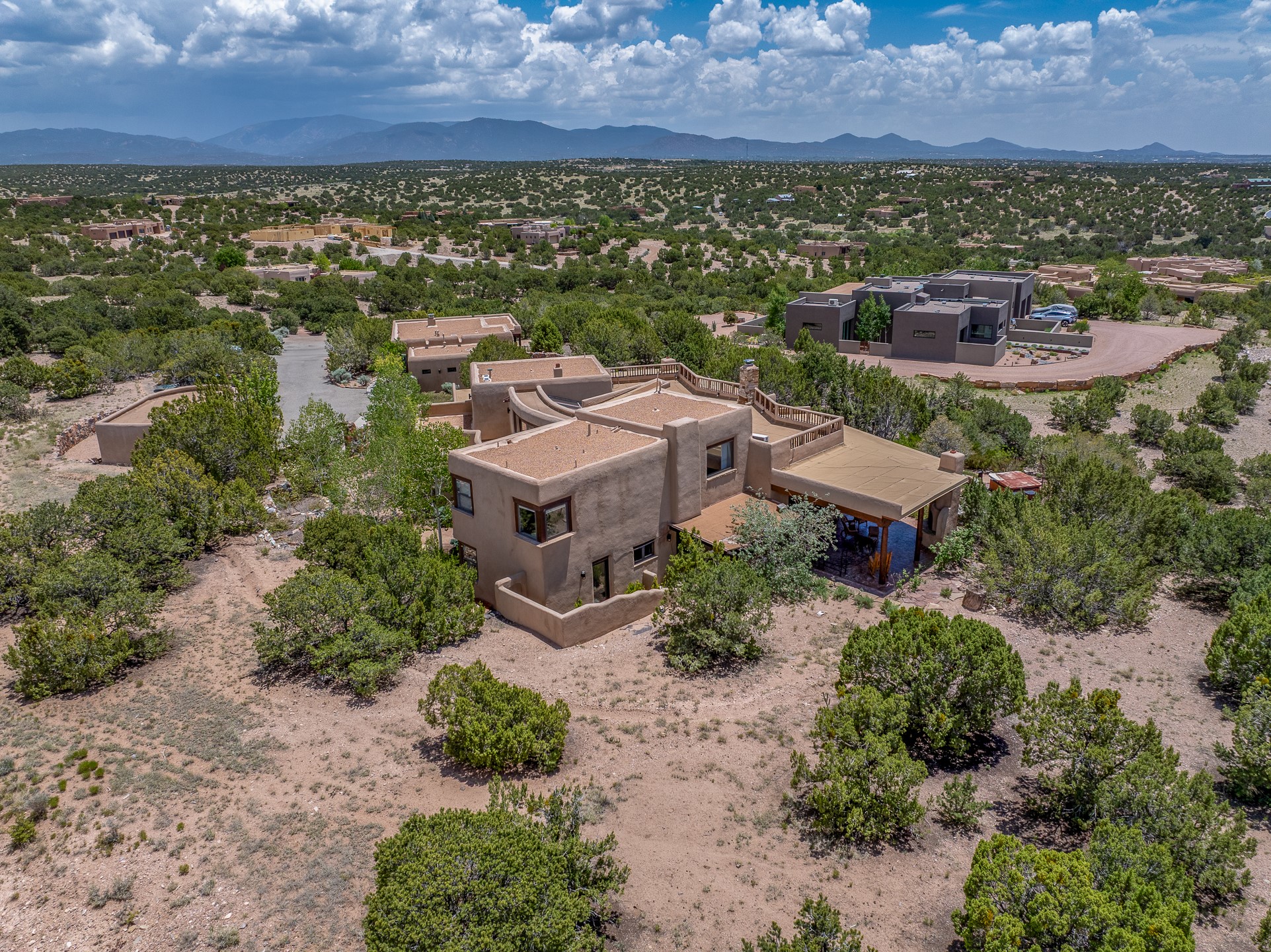 Las Campanas Gem: Timeless Character Meets Exceptional livingNestled in the prestigious Las Campanas community, this distinctive residence offers a rare opportunity to own a property brimming with authentic Santa Fe charm and unparalleled architectural character. Set on a generous 1.71-acre lot, the main home boasts approximately 4,195 sq ft of living space, complemented by a detached, pull-through two-car garage and a separate 2-bedroom guest house of about 1,031 sq ft--providing exceptional flexibility and privacy.Designed for seamless indoor/outdoor living, the expansive covered patio invites year-round entertaining with a classic kiva fireplace and built-in grill, perfect for al fresco gatherings amid breathtaking natural surroundings. An exquisite exposed adobe wall inside adds warmth and authenticity, complementing the traditional vigas and coved ceilings throughout.The property is graced by a serene Aspen grove, creating a tranquil natural setting and enhancing privacy. Panoramic 180-degree views stretch from the Sandia and Ortiz Mountains to the Sangre de Cristo range, offering an ever-changing backdrop of dramatic New Mexico landscapes.Inside, stunning rock wall accents and a light-filled indoor atrium create a unique ambiance, while large skylights flood the space with natural light. The built-in kitchen nook offers a cozy space for casual dining, and generous living areas provide a thoughtful floor plan that invites personalization and renovation.While the home offers solid bones and timeless elements, it presents an exceptional canvas for a tasteful renovation or enhancement to meet modern luxury standards.Experience the charm and promise of this captivating Las Campanas retreat--an exclusive opportunity to craft your dream home in one of Santa Fe's most coveted neighborhoods. Unlock the full potential of this one-of-a-kind residence where tradition meets possibility.