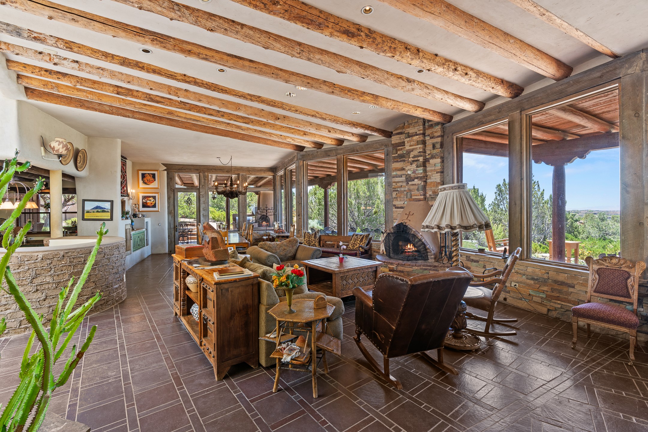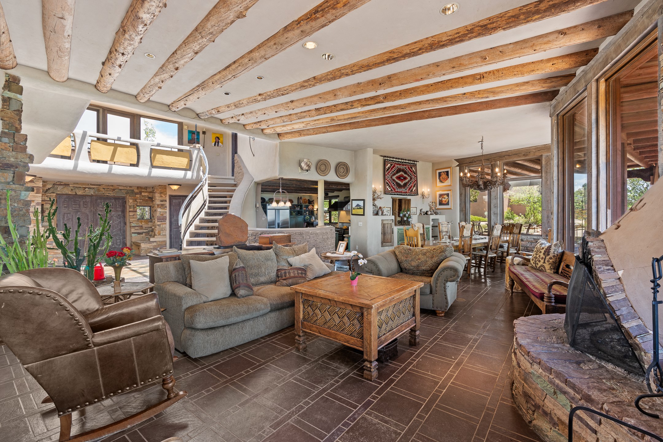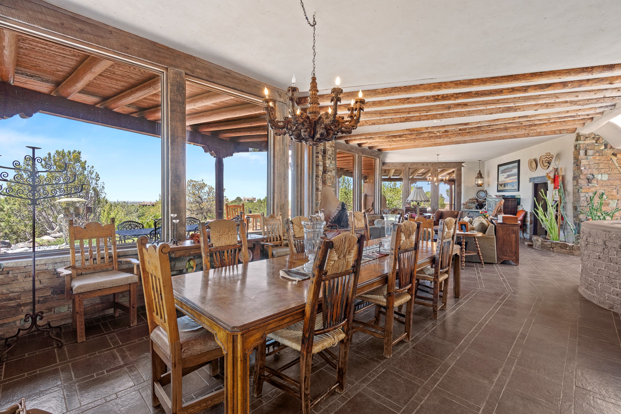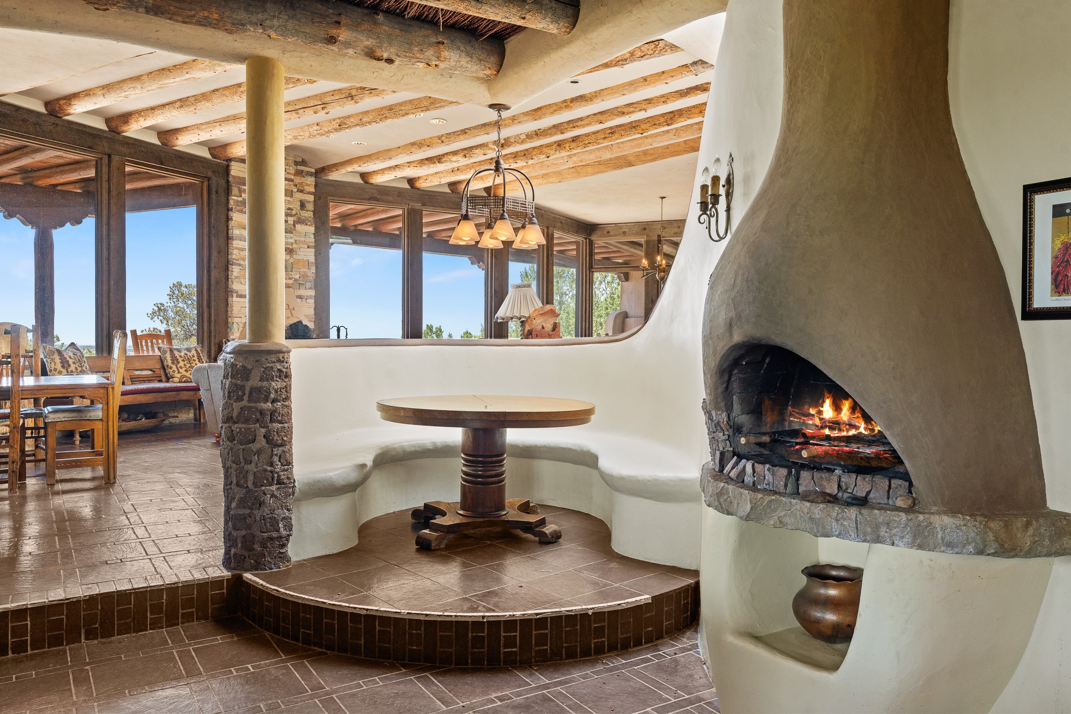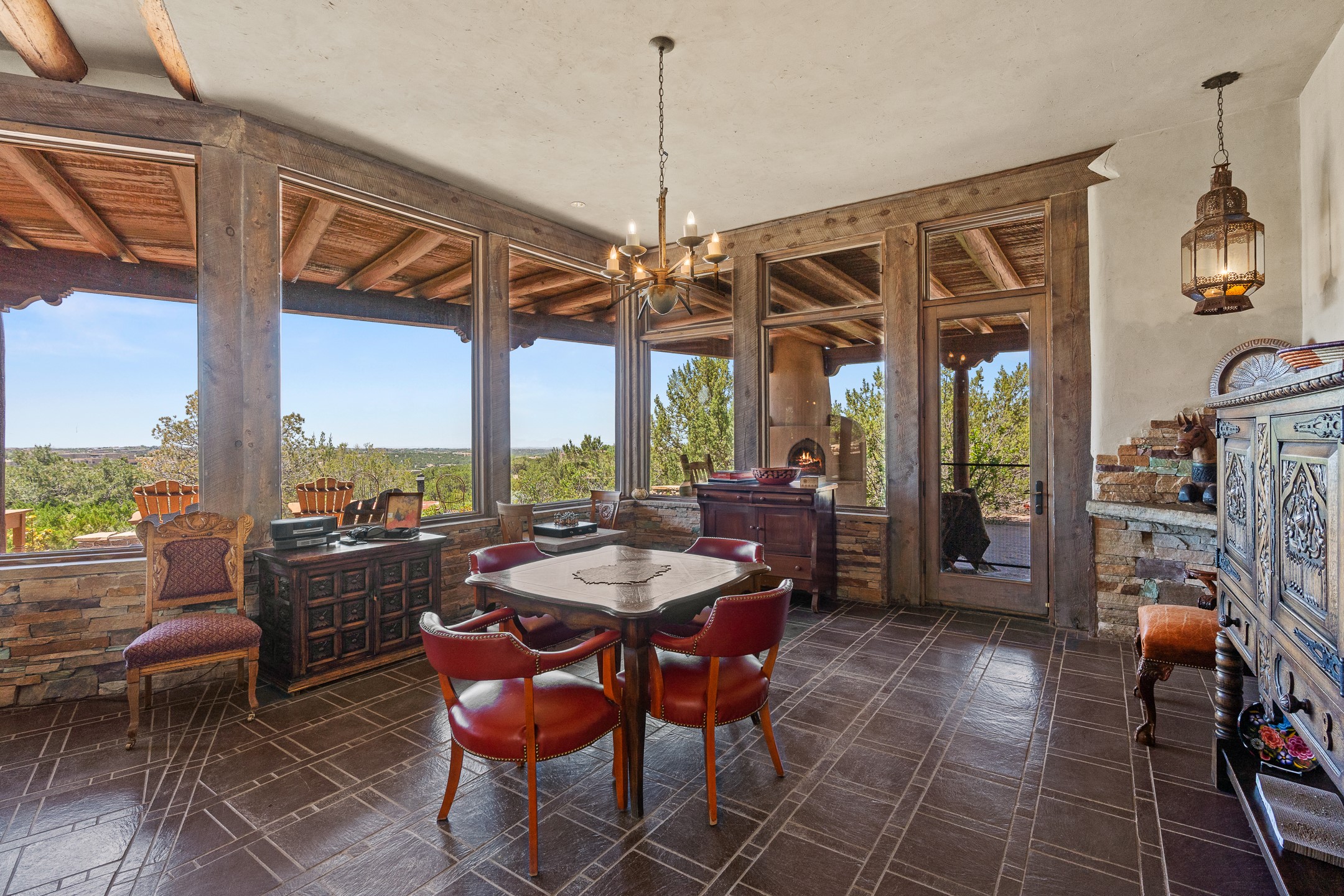 Las Campanas Gem: Timeless Character Meets Exceptional livingNestled in the prestigious Las Campanas community, this distinctive residence offers a rare opportunity to own a property brimming with authentic Santa Fe charm and unparalleled architectural character. Set on a generous 1.71-acre lot, the main home boasts approximately 4,195 sq ft of living space, complemented by a detached, pull-through two-car garage and a separate 2-bedroom guest house of about 1,031 sq ft--providing exceptional flexibility and privacy.Designed for seamless indoor/outdoor living, the expansive covered patio invites year-round entertaining with a classic kiva fireplace and built-in grill, perfect for al fresco gatherings amid breathtaking natural surroundings. An exquisite exposed adobe wall inside adds warmth and authenticity, complementing the traditional vigas and coved ceilings throughout.The property is graced by a serene Aspen grove, creating a tranquil natural setting and enhancing privacy. Panoramic 180-degree views stretch from the Sandia and Ortiz Mountains to the Sangre de Cristo range, offering an ever-changing backdrop of dramatic New Mexico landscapes.Inside, stunning rock wall accents and a light-filled indoor atrium create a unique ambiance, while large skylights flood the space with natural light. The built-in kitchen nook offers a cozy space for casual dining, and generous living areas provide a thoughtful floor plan that invites personalization and renovation.While the home offers solid bones and timeless elements, it presents an exceptional canvas for a tasteful renovation or enhancement to meet modern luxury standards.Experience the charm and promise of this captivating Las Campanas retreat--an exclusive opportunity to craft your dream home in one of Santa Fe's most coveted neighborhoods. Unlock the full potential of this one-of-a-kind residence where tradition meets possibility.