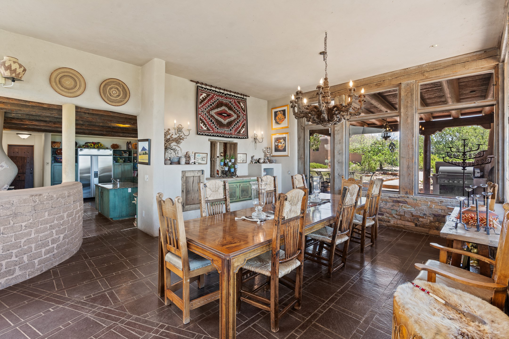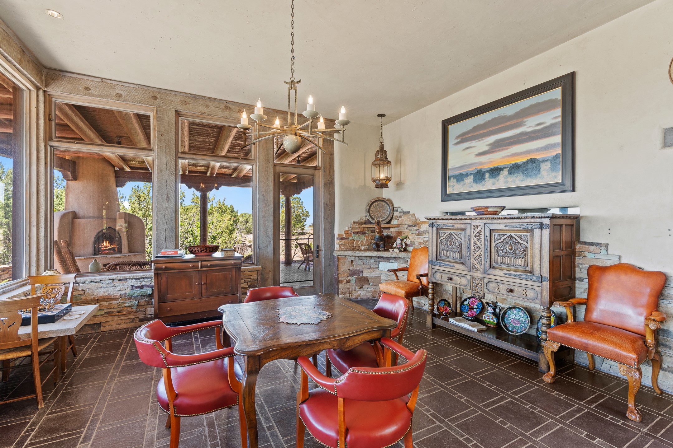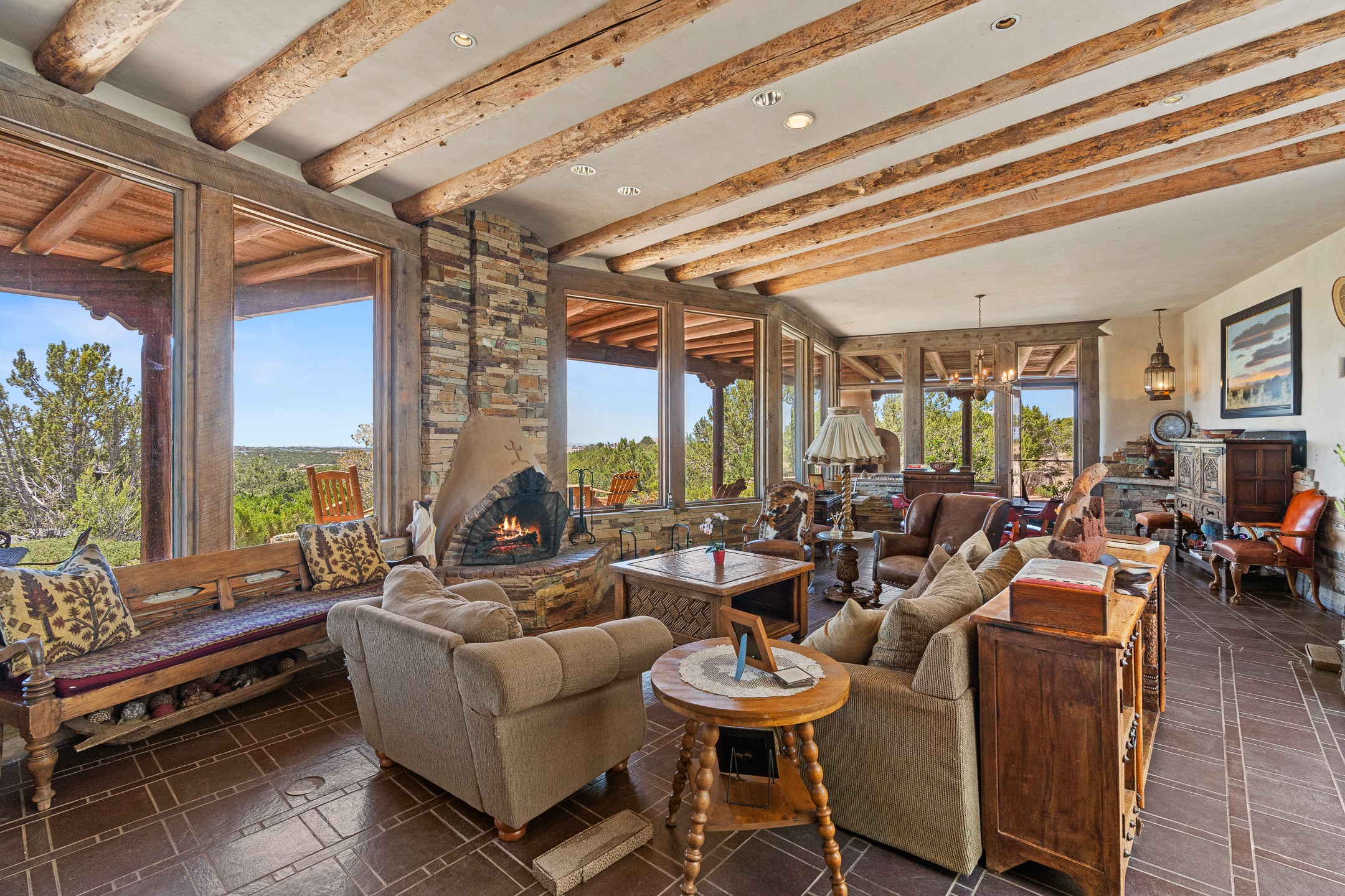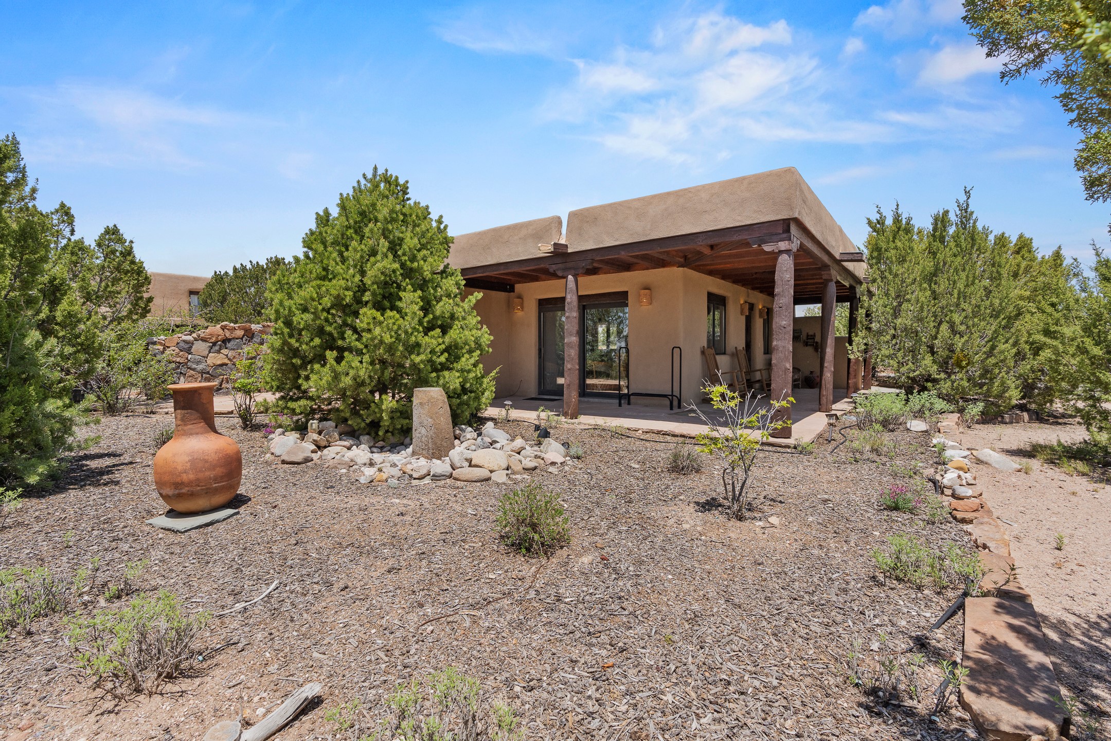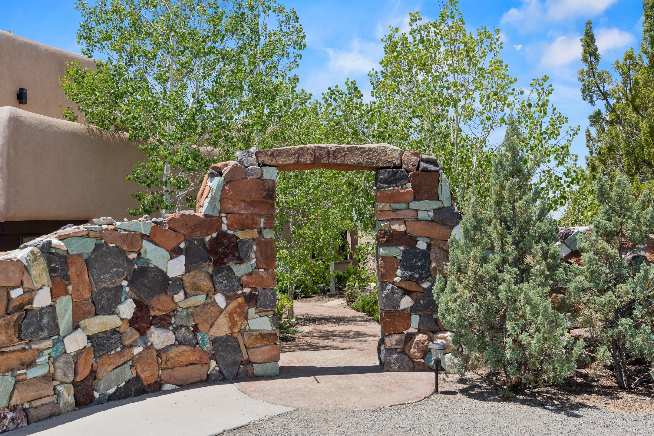 Las Campanas Gem: Timeless Character Meets Exceptional livingNestled in the prestigious Las Campanas community, this distinctive residence offers a rare opportunity to own a property brimming with authentic Santa Fe charm and unparalleled architectural character. Set on a generous 1.71-acre lot, the main home boasts approximately 4,195 sq ft of living space, complemented by a detached, pull-through two-car garage and a separate 2-bedroom guest house of about 1,031 sq ft--providing exceptional flexibility and privacy.Designed for seamless indoor/outdoor living, the expansive covered patio invites year-round entertaining with a classic kiva fireplace and built-in grill, perfect for al fresco gatherings amid breathtaking natural surroundings. An exquisite exposed adobe wall inside adds warmth and authenticity, complementing the traditional vigas and coved ceilings throughout.The property is graced by a serene Aspen grove, creating a tranquil natural setting and enhancing privacy. Panoramic 180-degree views stretch from the Sandia and Ortiz Mountains to the Sangre de Cristo range, offering an ever-changing backdrop of dramatic New Mexico landscapes.Inside, stunning rock wall accents and a light-filled indoor atrium create a unique ambiance, while large skylights flood the space with natural light. The built-in kitchen nook offers a cozy space for casual dining, and generous living areas provide a thoughtful floor plan that invites personalization and renovation.While the home offers solid bones and timeless elements, it presents an exceptional canvas for a tasteful renovation or enhancement to meet modern luxury standards.Experience the charm and promise of this captivating Las Campanas retreat--an exclusive opportunity to craft your dream home in one of Santa Fe's most coveted neighborhoods. Unlock the full potential of this one-of-a-kind residence where tradition meets possibility.