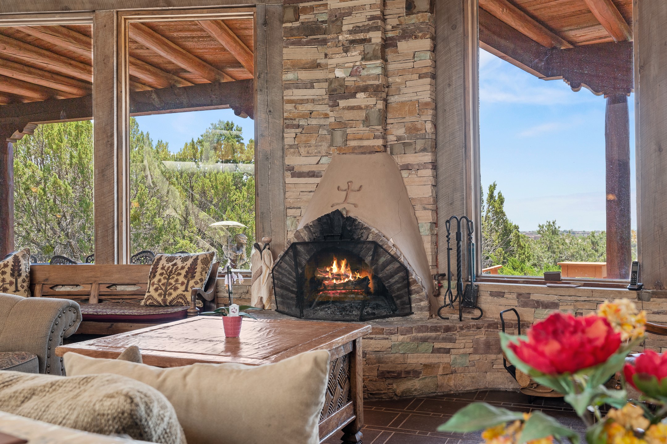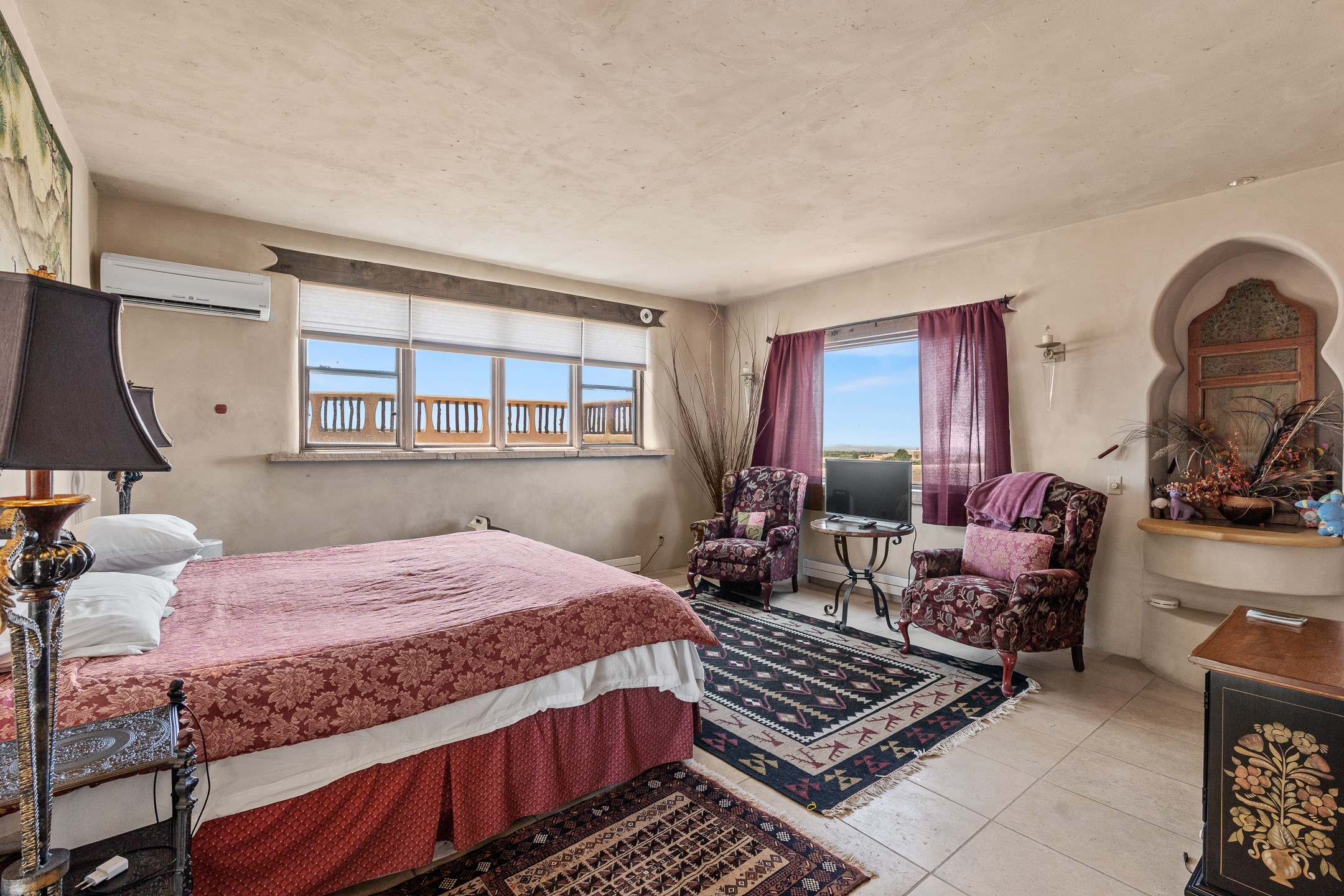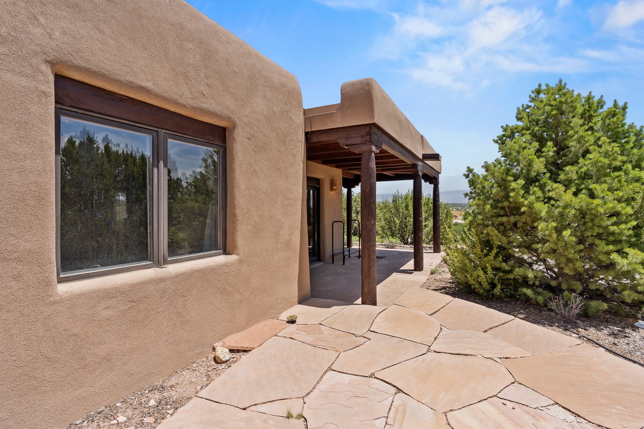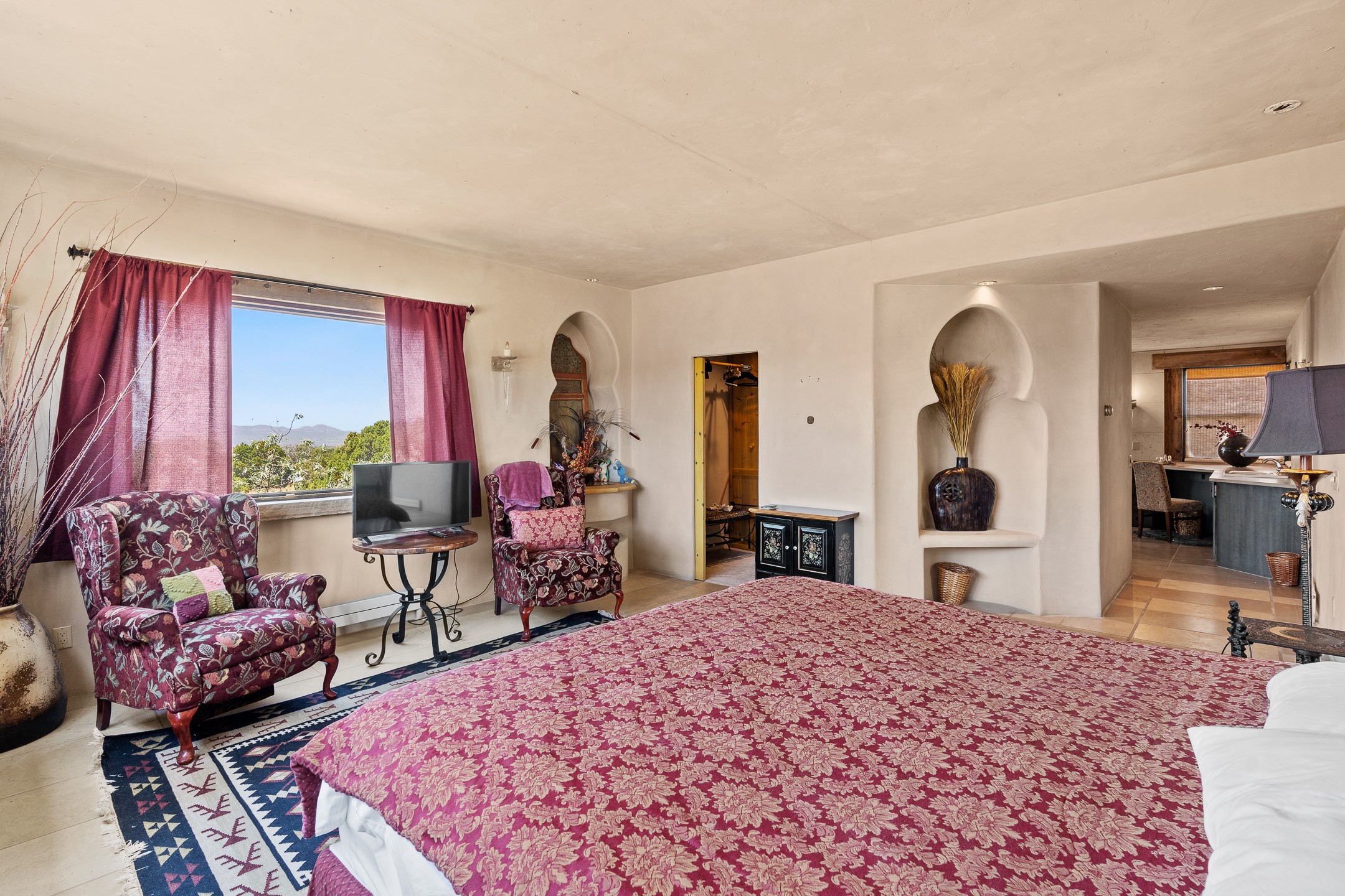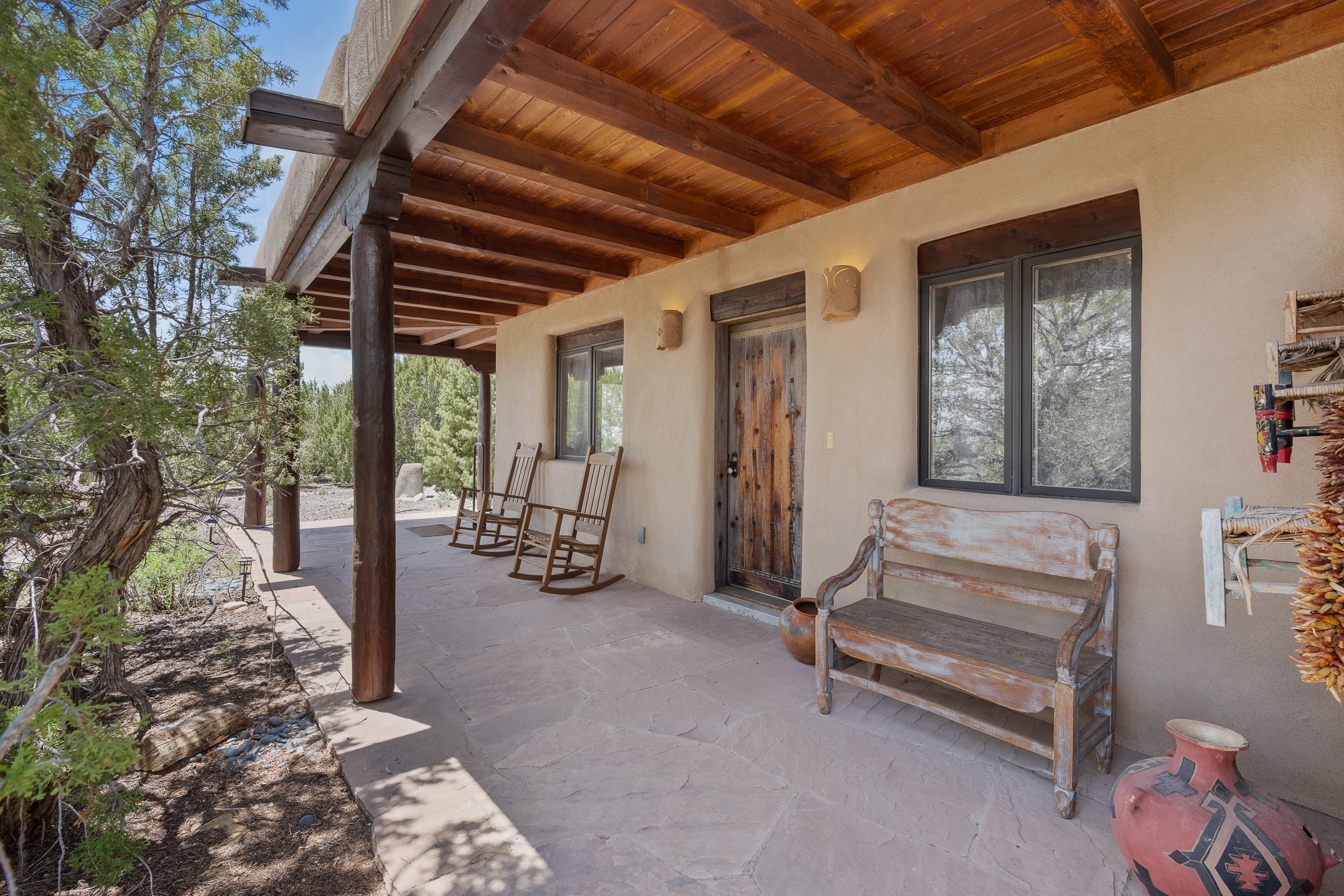 Las Campanas Gem: Timeless Character Meets Exceptional livingNestled in the prestigious Las Campanas community, this distinctive residence offers a rare opportunity to own a property brimming with authentic Santa Fe charm and unparalleled architectural character. Set on a generous 1.71-acre lot, the main home boasts approximately 4,195 sq ft of living space, complemented by a detached, pull-through two-car garage and a separate 2-bedroom guest house of about 1,031 sq ft--providing exceptional flexibility and privacy.Designed for seamless indoor/outdoor living, the expansive covered patio invites year-round entertaining with a classic kiva fireplace and built-in grill, perfect for al fresco gatherings amid breathtaking natural surroundings. An exquisite exposed adobe wall inside adds warmth and authenticity, complementing the traditional vigas and coved ceilings throughout.The property is graced by a serene Aspen grove, creating a tranquil natural setting and enhancing privacy. Panoramic 180-degree views stretch from the Sandia and Ortiz Mountains to the Sangre de Cristo range, offering an ever-changing backdrop of dramatic New Mexico landscapes.Inside, stunning rock wall accents and a light-filled indoor atrium create a unique ambiance, while large skylights flood the space with natural light. The built-in kitchen nook offers a cozy space for casual dining, and generous living areas provide a thoughtful floor plan that invites personalization and renovation.While the home offers solid bones and timeless elements, it presents an exceptional canvas for a tasteful renovation or enhancement to meet modern luxury standards.Experience the charm and promise of this captivating Las Campanas retreat--an exclusive opportunity to craft your dream home in one of Santa Fe's most coveted neighborhoods. Unlock the full potential of this one-of-a-kind residence where tradition meets possibility.