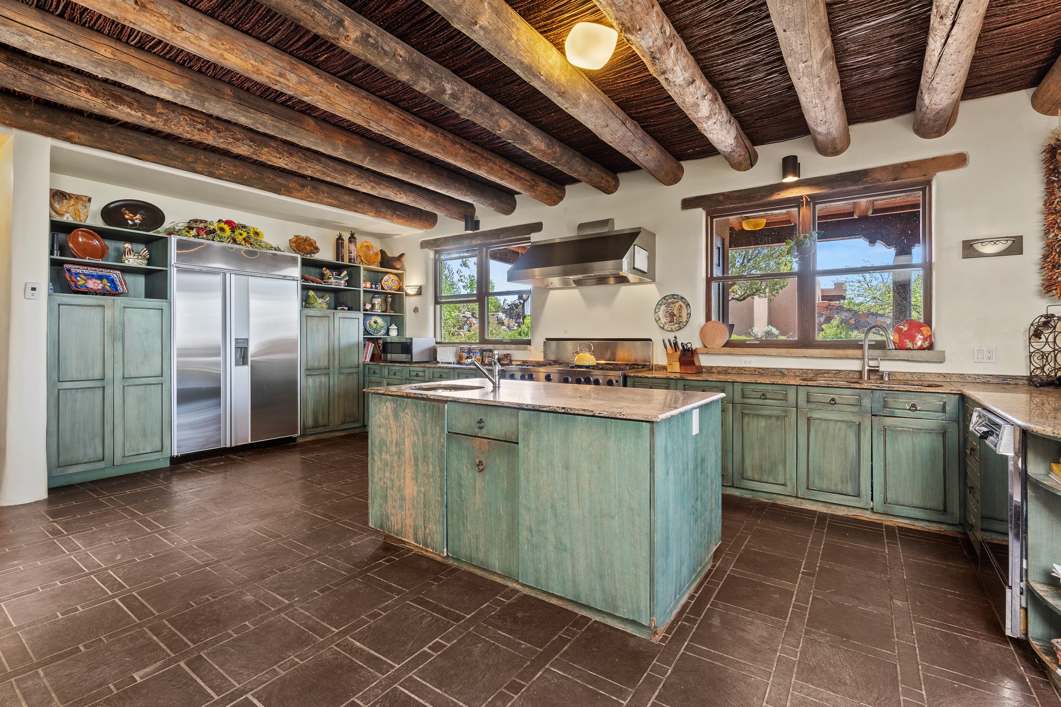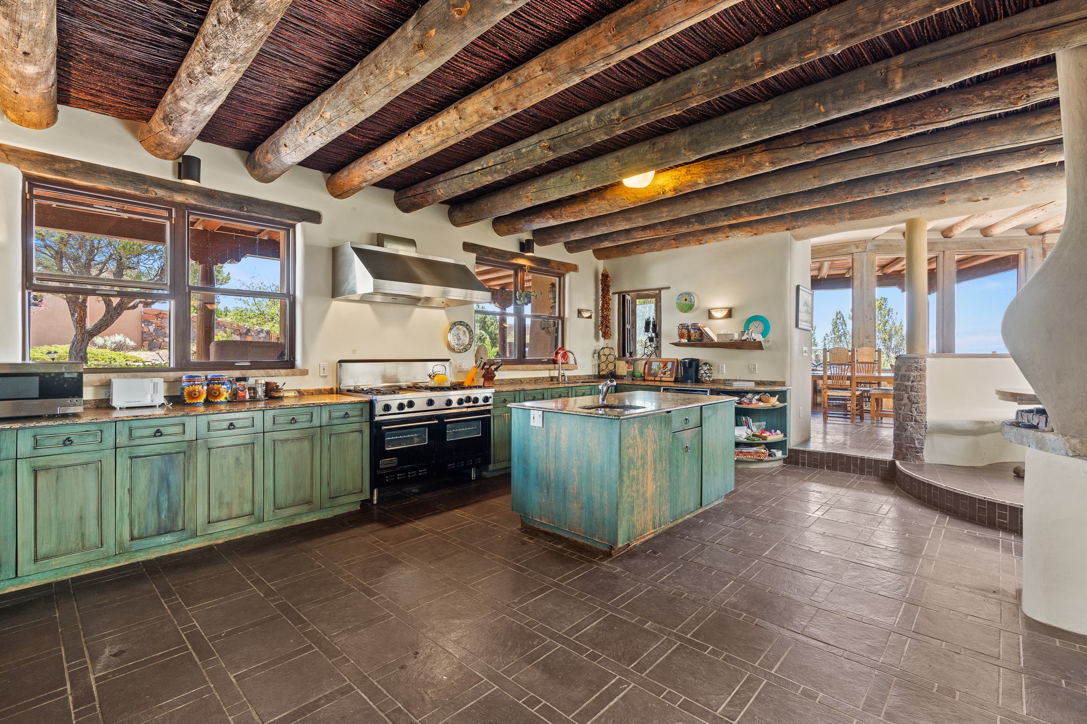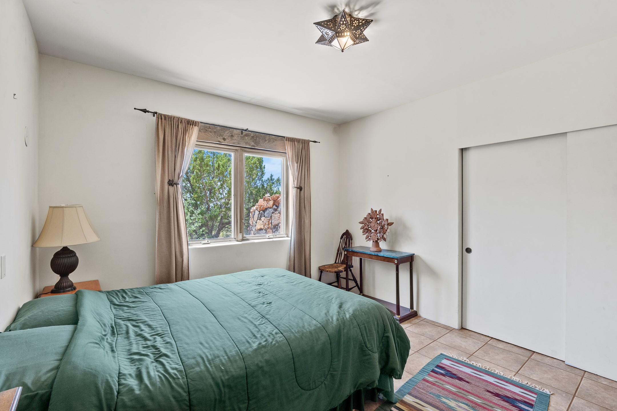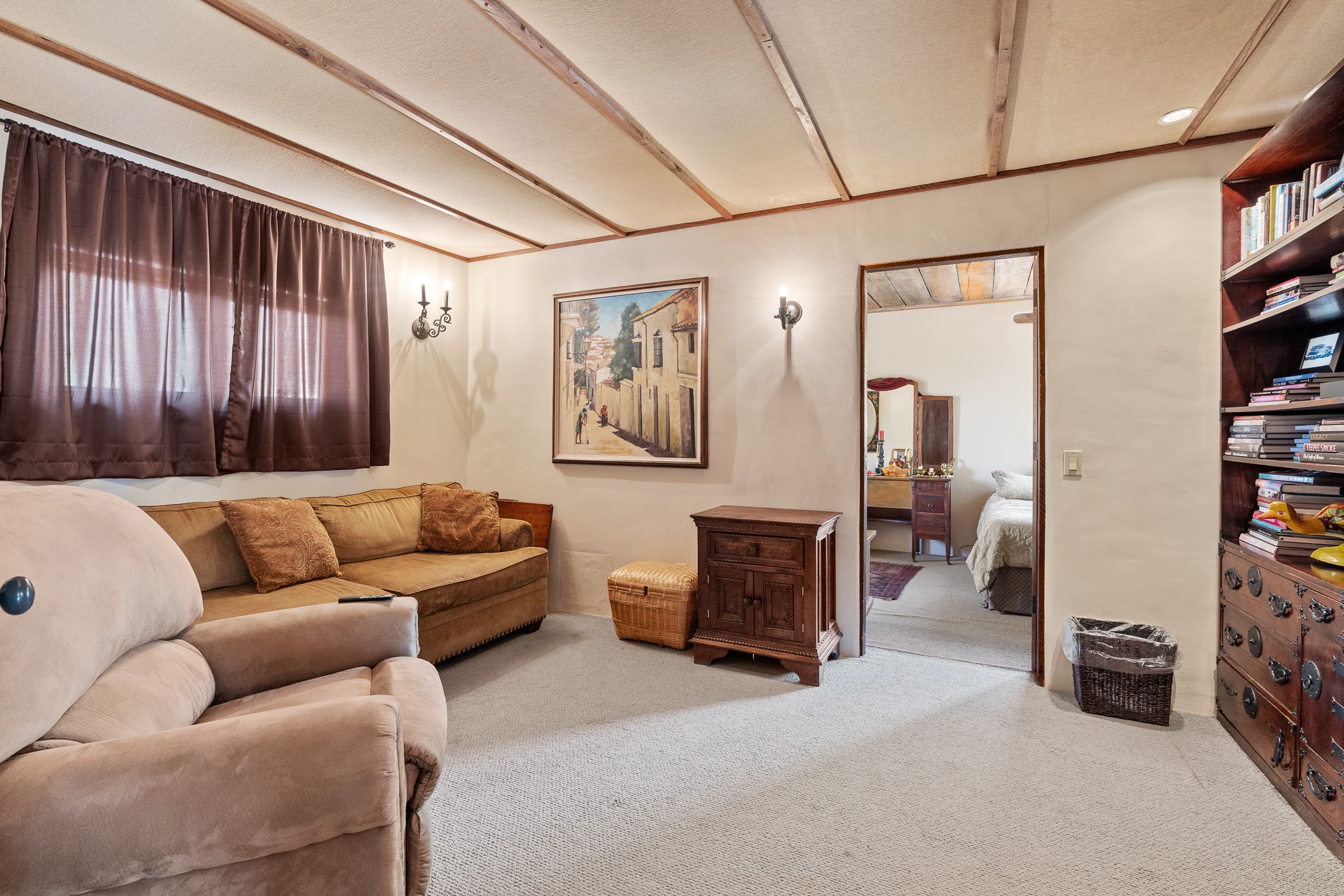 Las Campanas Gem: Timeless Character Meets Exceptional livingNestled in the prestigious Las Campanas community, this distinctive residence offers a rare opportunity to own a property brimming with authentic Santa Fe charm and unparalleled architectural character. Set on a generous 1.71-acre lot, the main home boasts approximately 4,195 sq ft of living space, complemented by a detached, pull-through two-car garage and a separate 2-bedroom guest house of about 1,031 sq ft--providing exceptional flexibility and privacy.Designed for seamless indoor/outdoor living, the expansive covered patio invites year-round entertaining with a classic kiva fireplace and built-in grill, perfect for al fresco gatherings amid breathtaking natural surroundings. An exquisite exposed adobe wall inside adds warmth and authenticity, complementing the traditional vigas and coved ceilings throughout.The property is graced by a serene Aspen grove, creating a tranquil natural setting and enhancing privacy. Panoramic 180-degree views stretch from the Sandia and Ortiz Mountains to the Sangre de Cristo range, offering an ever-changing backdrop of dramatic New Mexico landscapes.Inside, stunning rock wall accents and a light-filled indoor atrium create a unique ambiance, while large skylights flood the space with natural light. The built-in kitchen nook offers a cozy space for casual dining, and generous living areas provide a thoughtful floor plan that invites personalization and renovation.While the home offers solid bones and timeless elements, it presents an exceptional canvas for a tasteful renovation or enhancement to meet modern luxury standards.Experience the charm and promise of this captivating Las Campanas retreat--an exclusive opportunity to craft your dream home in one of Santa Fe's most coveted neighborhoods. Unlock the full potential of this one-of-a-kind residence where tradition meets possibility.
